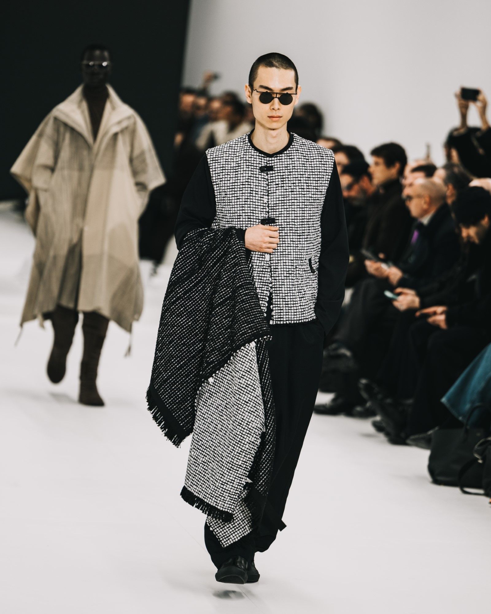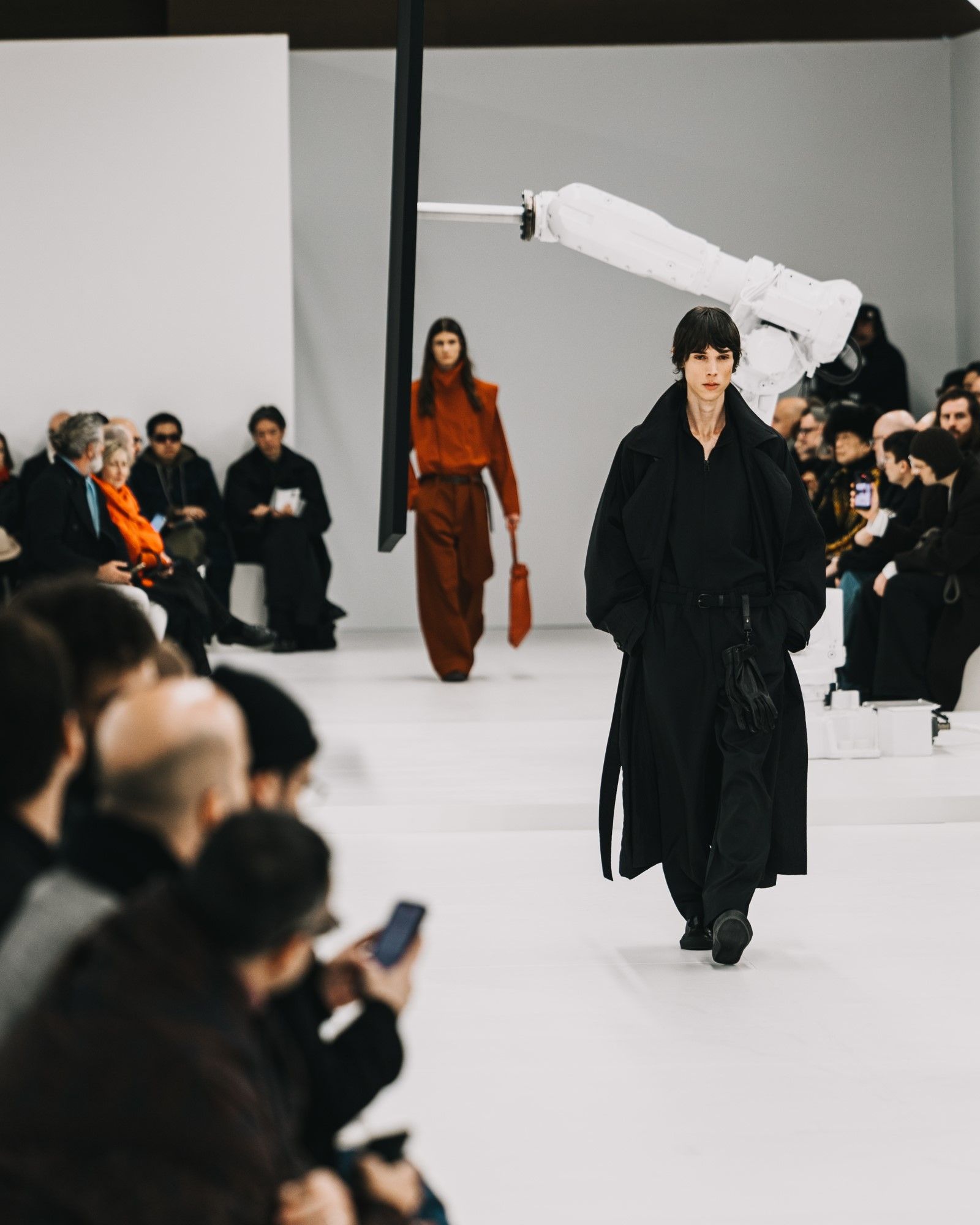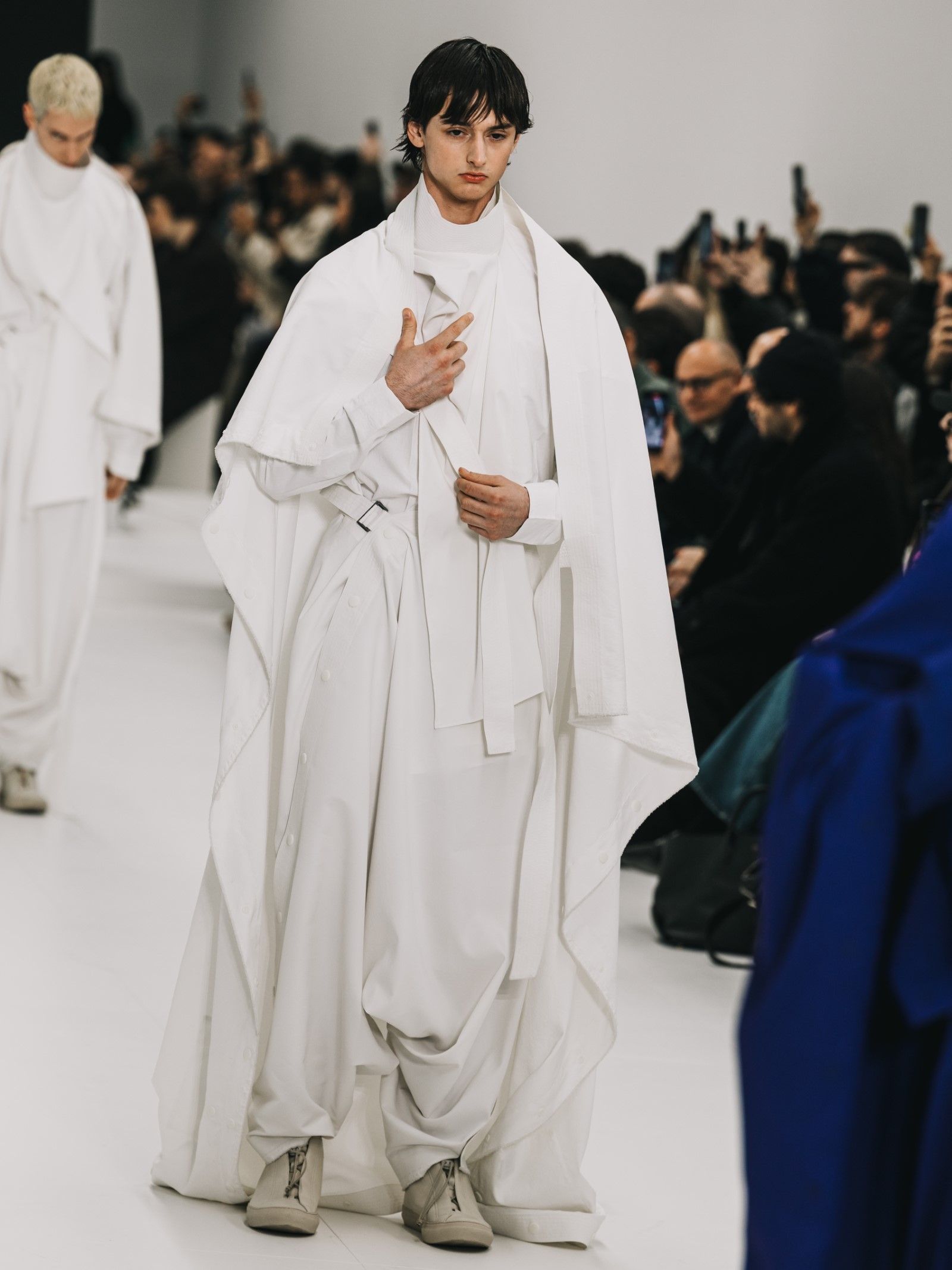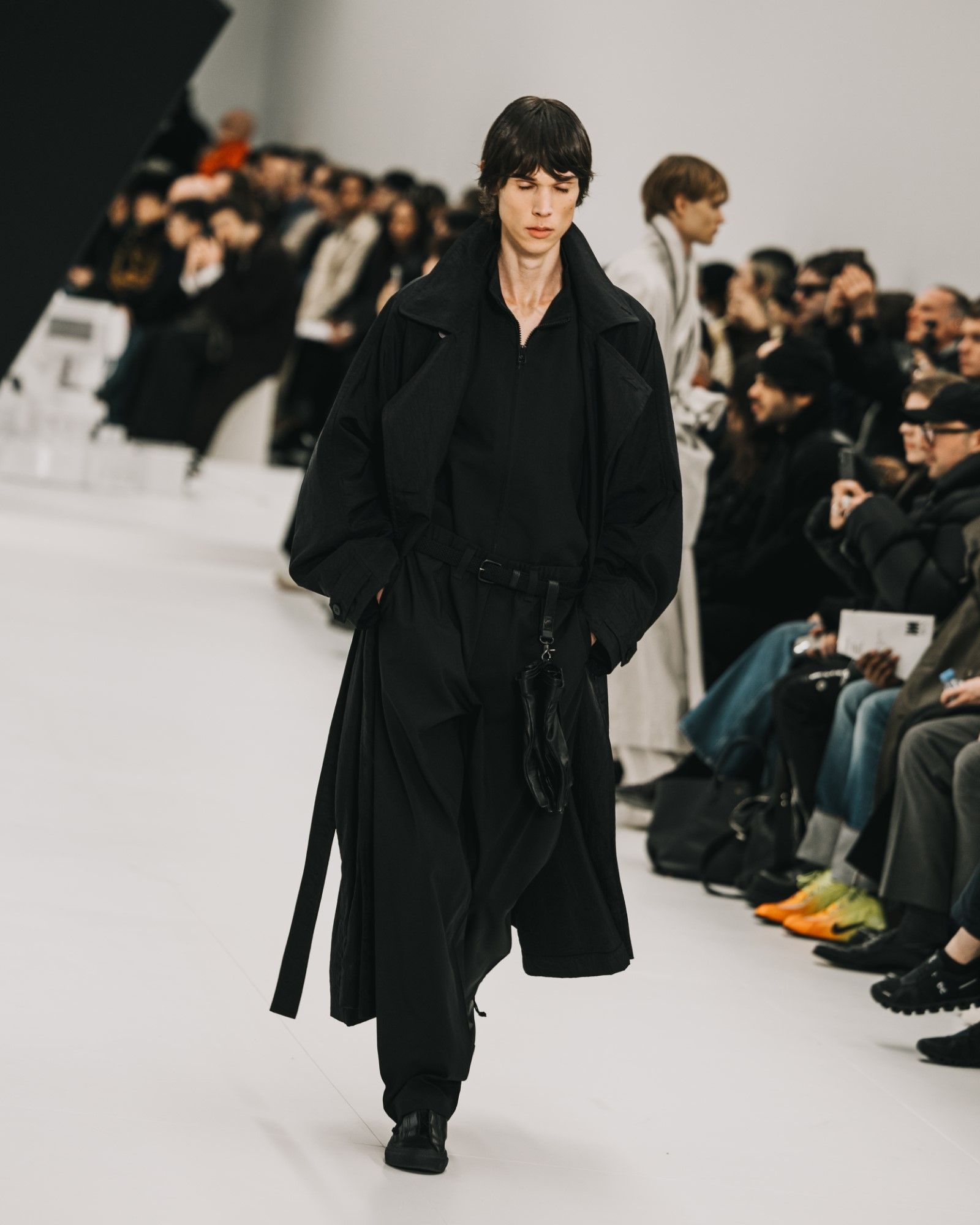 Ieri la collezione FW25 di IM MEN ha fatto il suo debutto ufficiale a Parigi, prendendo il posto che fu di Homme Plissé Issey Miyake sulle passerelle della moda – il che non significa che Homme Plissé Issey Miyake sia scomparso, semplicemente lo si troverà in presentazioni più intime mentre il posto sotto i riflettori sarà preso da questa linea dal sapore più avant-garde. Presentata nella suggestiva cornice del Réfectoire des Cordeliers, un ex monastero del XVI secolo, la sfilata ha segnato l’inizio di un nuovo capitolo per l'eredità del compianto maestro Issey Miyake che, possiamo dirlo, non potrebbe essere in mani migliori. IM MEN rappresenta l'ultima grande creazione del genio giapponese, avviata poco prima della sua scomparsa nel 2022. Il brand è nato dall’unione di tre designer: Sen Kawahara, Yuki Itakura e Nobutaka Kobayashi, che hanno collaborato con Miyake per sviluppare una nuova e più avanzata visione del menswear basata sul concetto cardine della sua filosofia: "A piece of cloth" che è la pietra angolare su cui il compianto designer, il suo vasto team e i suoi successori hanno costruito il complesso edificio di linee e proposte del brand e che spazia dalla moda fino al design d’interni. In questa collezione, il tessuto diventa il punto di partenza per una ridefinizione dell'abbigliamento, che unisce artigianalità, ingegneria e un senso di libertà creativa. Da sempre firma del brand, il libero movimento del corpo nei vestiti è stato protagonista anche della presentazione di ieri, che ha visto i modelli correre sulla passerella sciogliendo e riannodando i capi, mostrandone la leggera e ingengosa architettura. Sempre l’idea di movimento è stata esplorata dall’installazione del designer Tokujin Yoshioka, che ha decorato la venue con enormi braccia robotiche che sollevavano pannelli neri seguendo movimenti ipnotici.