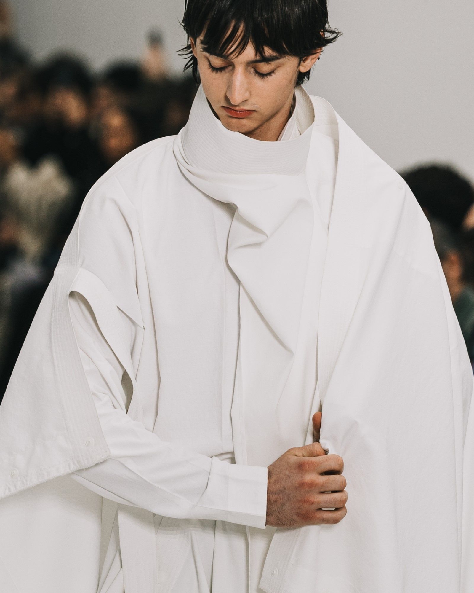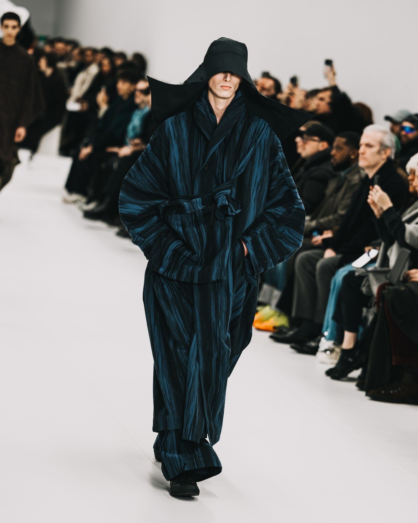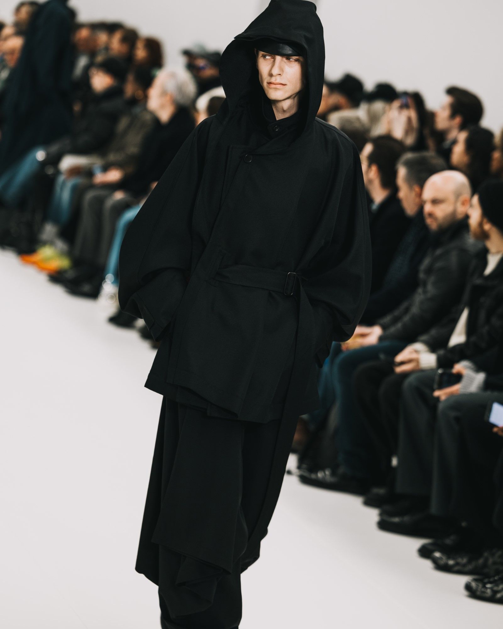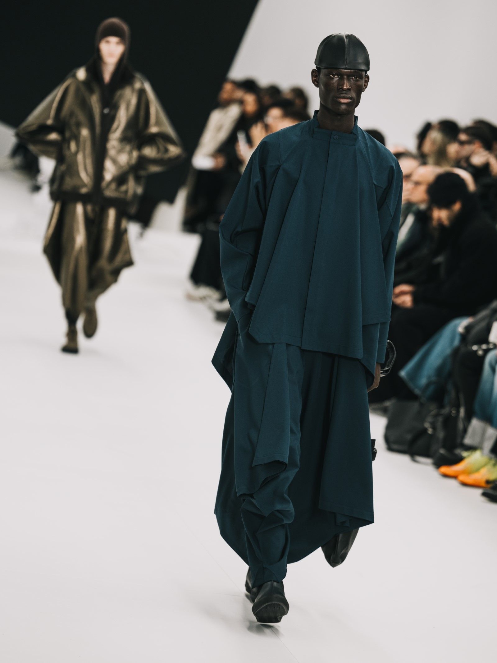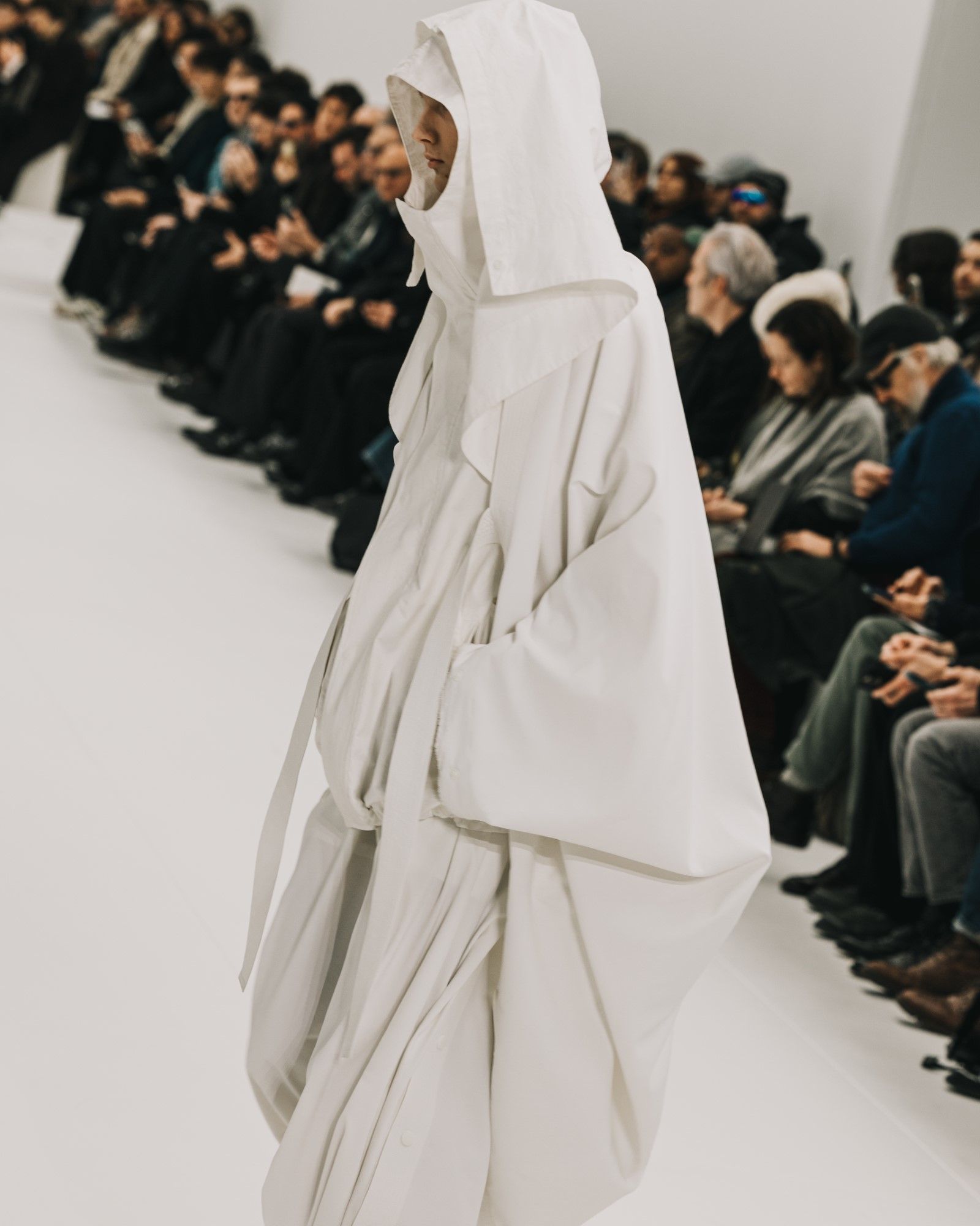 Ieri la collezione FW25 di IM MEN ha fatto il suo debutto ufficiale a Parigi, prendendo il posto che fu di Homme Plissé Issey Miyake sulle passerelle della moda – il che non significa che Homme Plissé Issey Miyake sia scomparso, semplicemente lo si troverà in presentazioni più intime mentre il posto sotto i riflettori sarà preso da questa linea dal sapore più avant-garde. Presentata nella suggestiva cornice del Réfectoire des Cordeliers, un ex monastero del XVI secolo, la sfilata ha segnato l’inizio di un nuovo capitolo per l'eredità del compianto maestro Issey Miyake che, possiamo dirlo, non potrebbe essere in mani migliori. IM MEN rappresenta l'ultima grande creazione del genio giapponese, avviata poco prima della sua scomparsa nel 2022. Il brand è nato dall’unione di tre designer: Sen Kawahara, Yuki Itakura e Nobutaka Kobayashi, che hanno collaborato con Miyake per sviluppare una nuova e più avanzata visione del menswear basata sul concetto cardine della sua filosofia: "A piece of cloth" che è la pietra angolare su cui il compianto designer, il suo vasto team e i suoi successori hanno costruito il complesso edificio di linee e proposte del brand e che spazia dalla moda fino al design d’interni. In questa collezione, il tessuto diventa il punto di partenza per una ridefinizione dell'abbigliamento, che unisce artigianalità, ingegneria e un senso di libertà creativa. Da sempre firma del brand, il libero movimento del corpo nei vestiti è stato protagonista anche della presentazione di ieri, che ha visto i modelli correre sulla passerella sciogliendo e riannodando i capi, mostrandone la leggera e ingengosa architettura. Sempre l’idea di movimento è stata esplorata dall’installazione del designer Tokujin Yoshioka, che ha decorato la venue con enormi braccia robotiche che sollevavano pannelli neri seguendo movimenti ipnotici.
