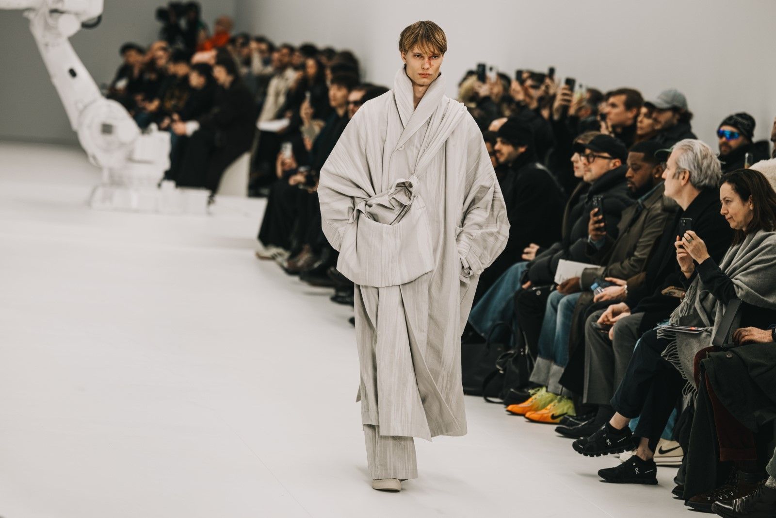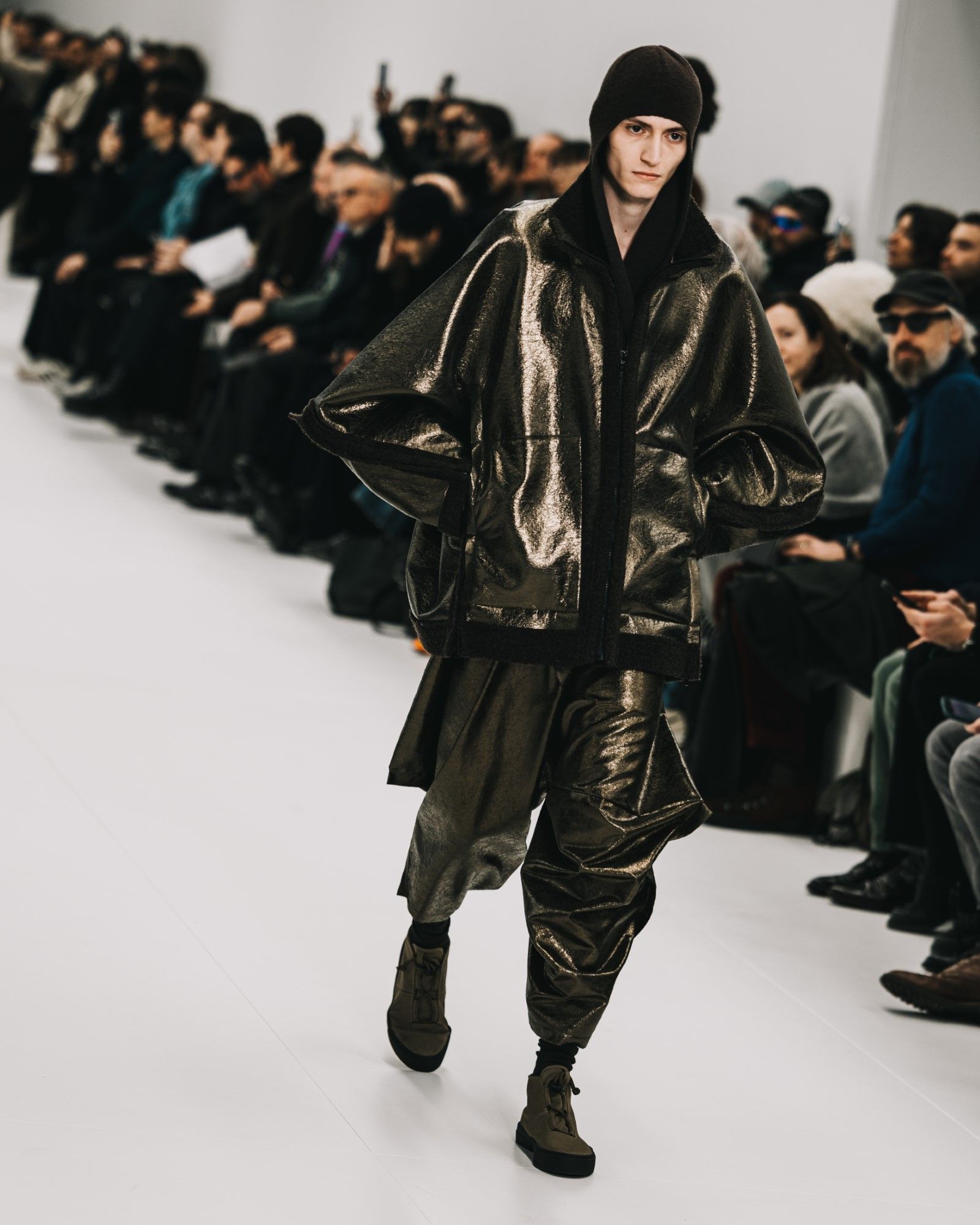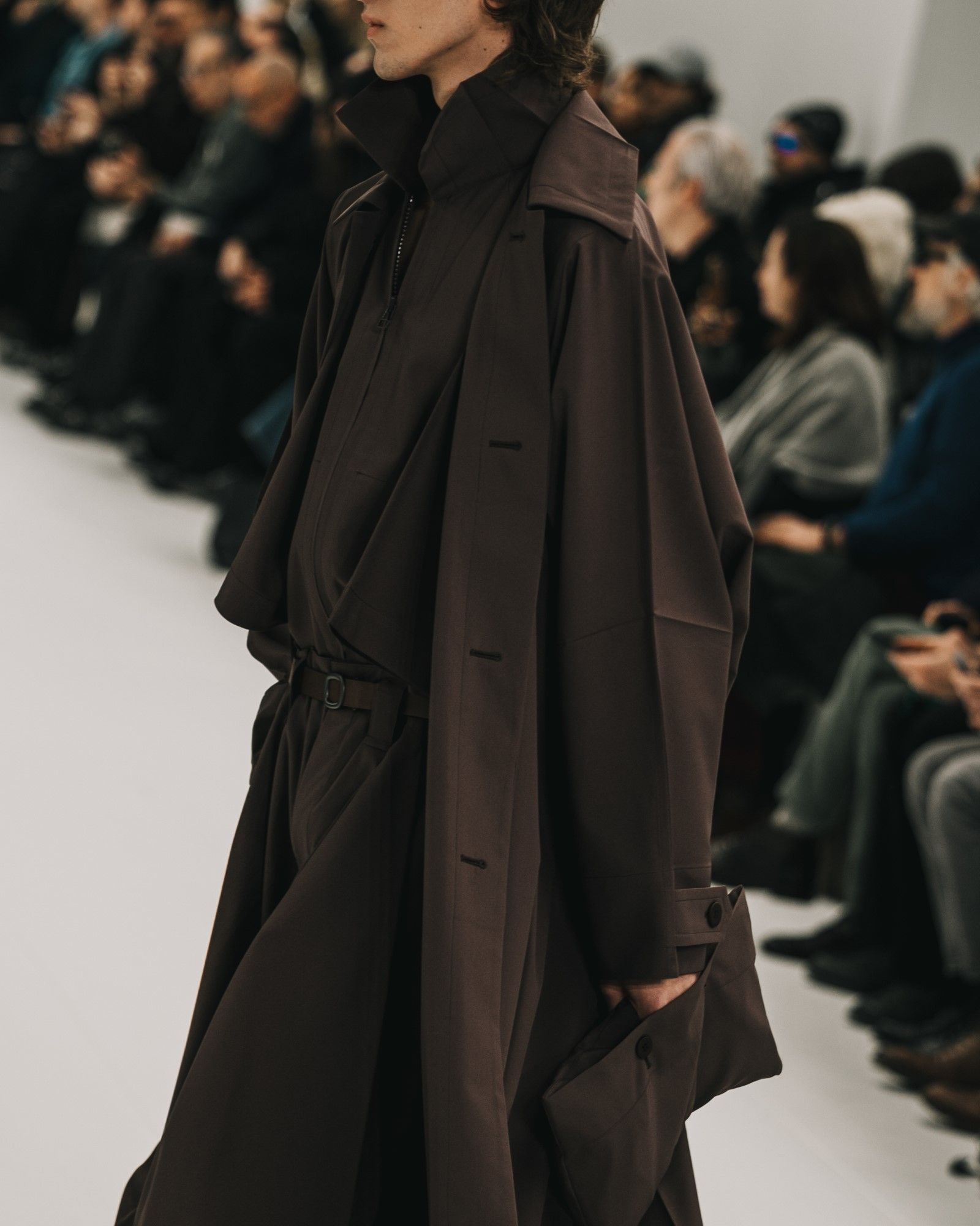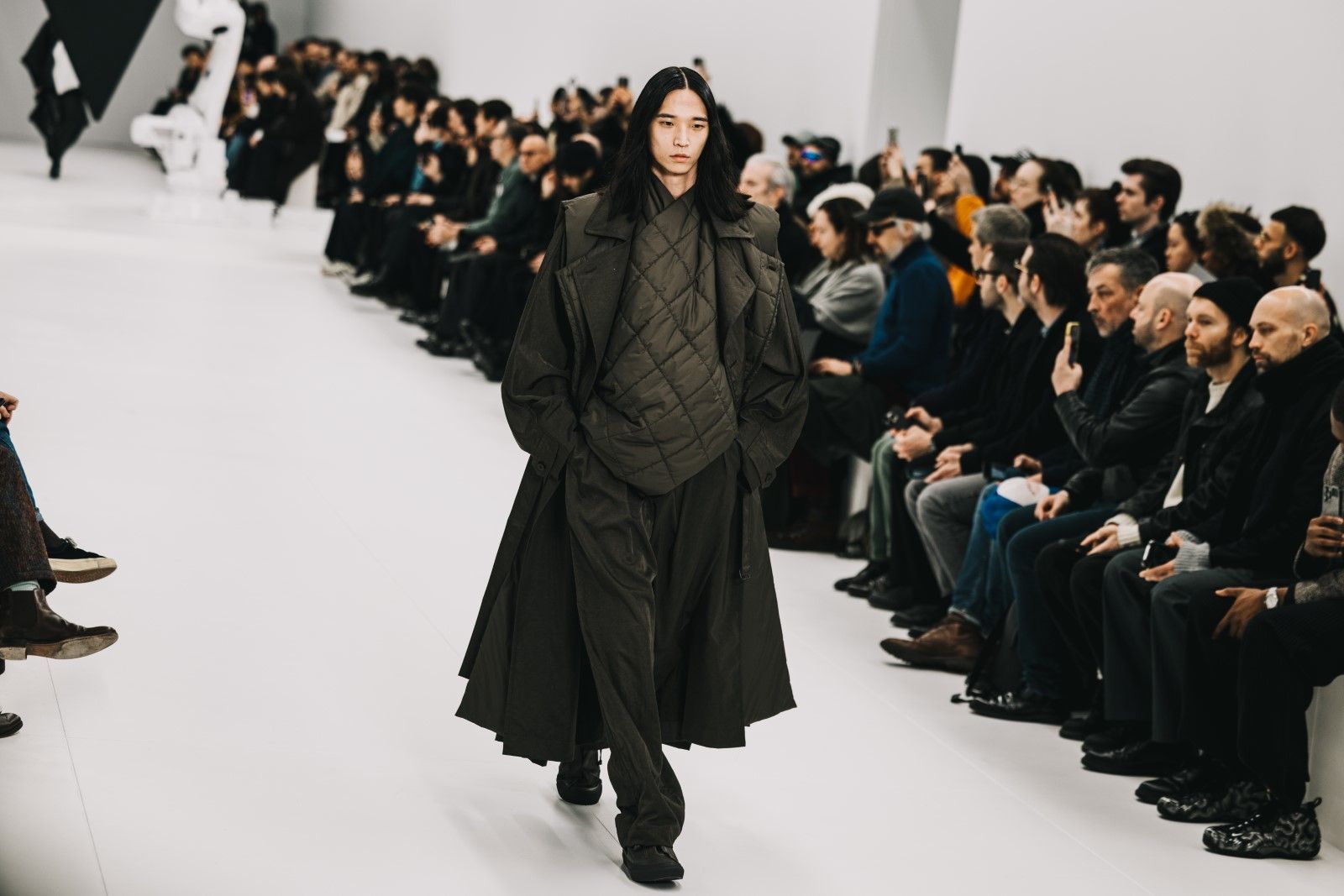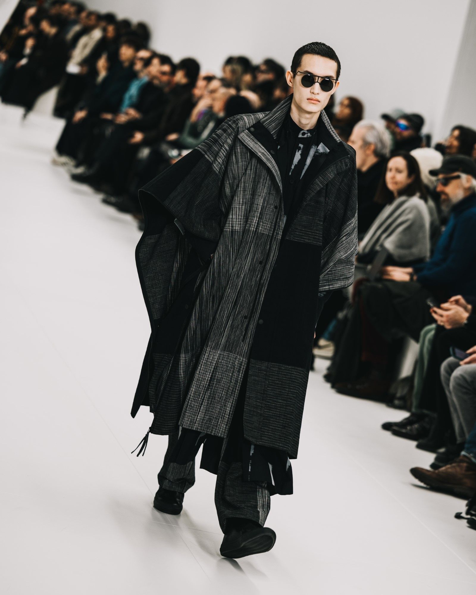 Ieri la collezione FW25 di IM MEN ha fatto il suo debutto ufficiale a Parigi, prendendo il posto che fu di Homme Plissé Issey Miyake sulle passerelle della moda – il che non significa che Homme Plissé Issey Miyake sia scomparso, semplicemente lo si troverà in presentazioni più intime mentre il posto sotto i riflettori sarà preso da questa linea dal sapore più avant-garde. Presentata nella suggestiva cornice del Réfectoire des Cordeliers, un ex monastero del XVI secolo, la sfilata ha segnato l’inizio di un nuovo capitolo per l'eredità del compianto maestro Issey Miyake che, possiamo dirlo, non potrebbe essere in mani migliori. IM MEN rappresenta l'ultima grande creazione del genio giapponese, avviata poco prima della sua scomparsa nel 2022. Il brand è nato dall’unione di tre designer: Sen Kawahara, Yuki Itakura e Nobutaka Kobayashi, che hanno collaborato con Miyake per sviluppare una nuova e più avanzata visione del menswear basata sul concetto cardine della sua filosofia: "A piece of cloth" che è la pietra angolare su cui il compianto designer, il suo vasto team e i suoi successori hanno costruito il complesso edificio di linee e proposte del brand e che spazia dalla moda fino al design d’interni. In questa collezione, il tessuto diventa il punto di partenza per una ridefinizione dell'abbigliamento, che unisce artigianalità, ingegneria e un senso di libertà creativa. Da sempre firma del brand, il libero movimento del corpo nei vestiti è stato protagonista anche della presentazione di ieri, che ha visto i modelli correre sulla passerella sciogliendo e riannodando i capi, mostrandone la leggera e ingengosa architettura. Sempre l’idea di movimento è stata esplorata dall’installazione del designer Tokujin Yoshioka, che ha decorato la venue con enormi braccia robotiche che sollevavano pannelli neri seguendo movimenti ipnotici.