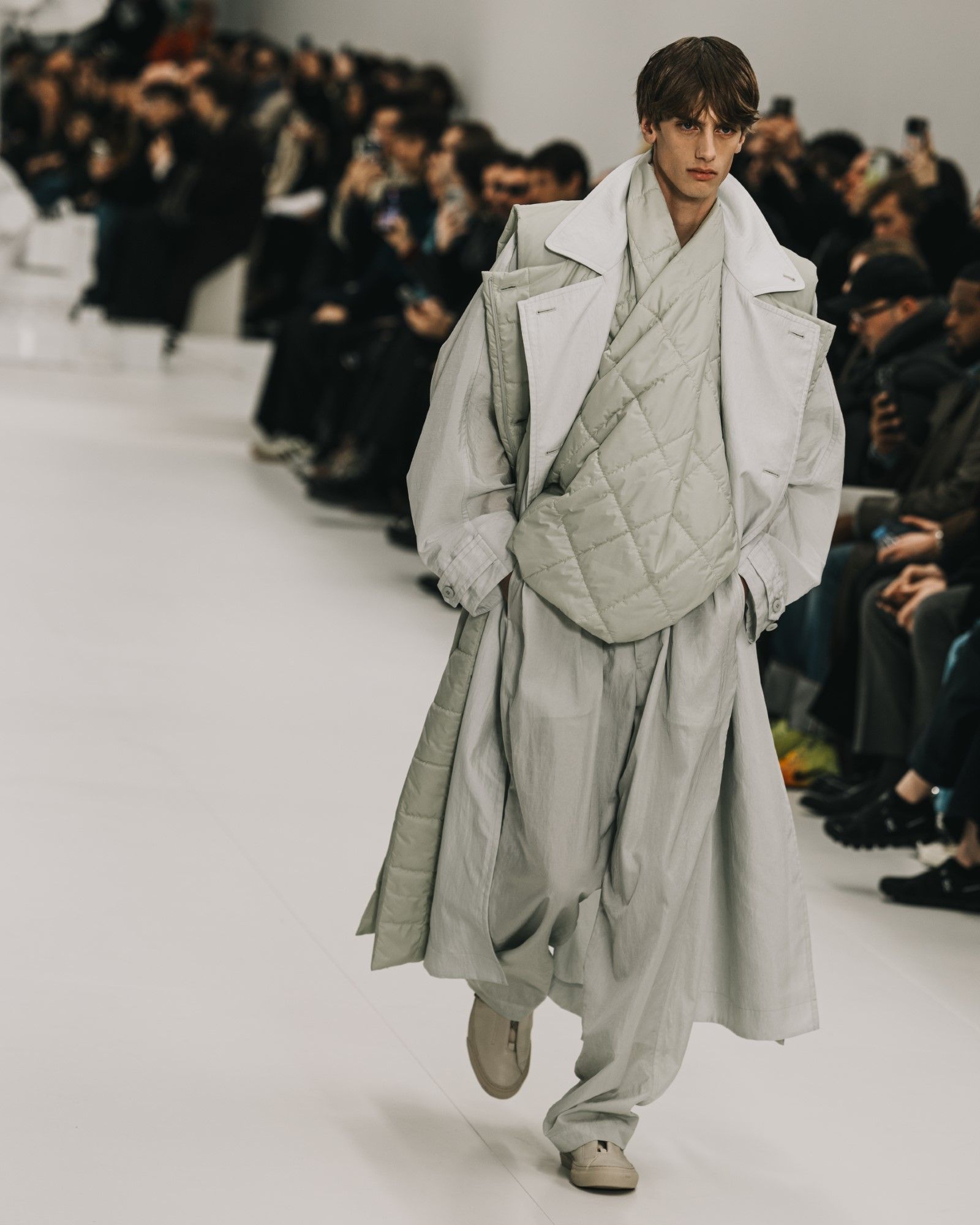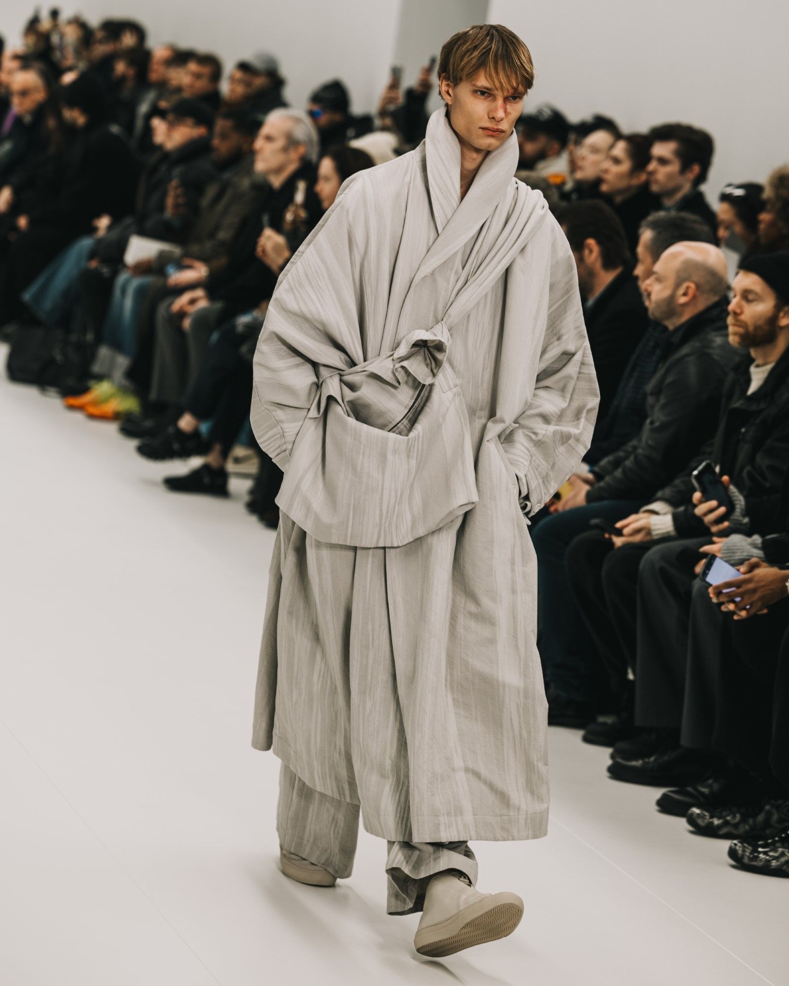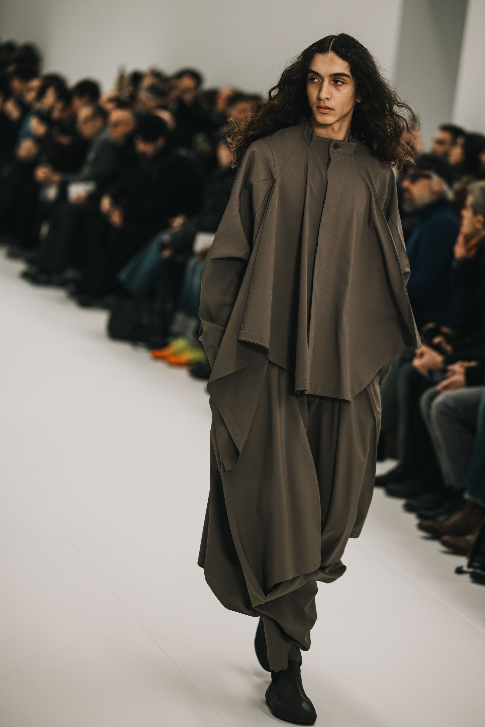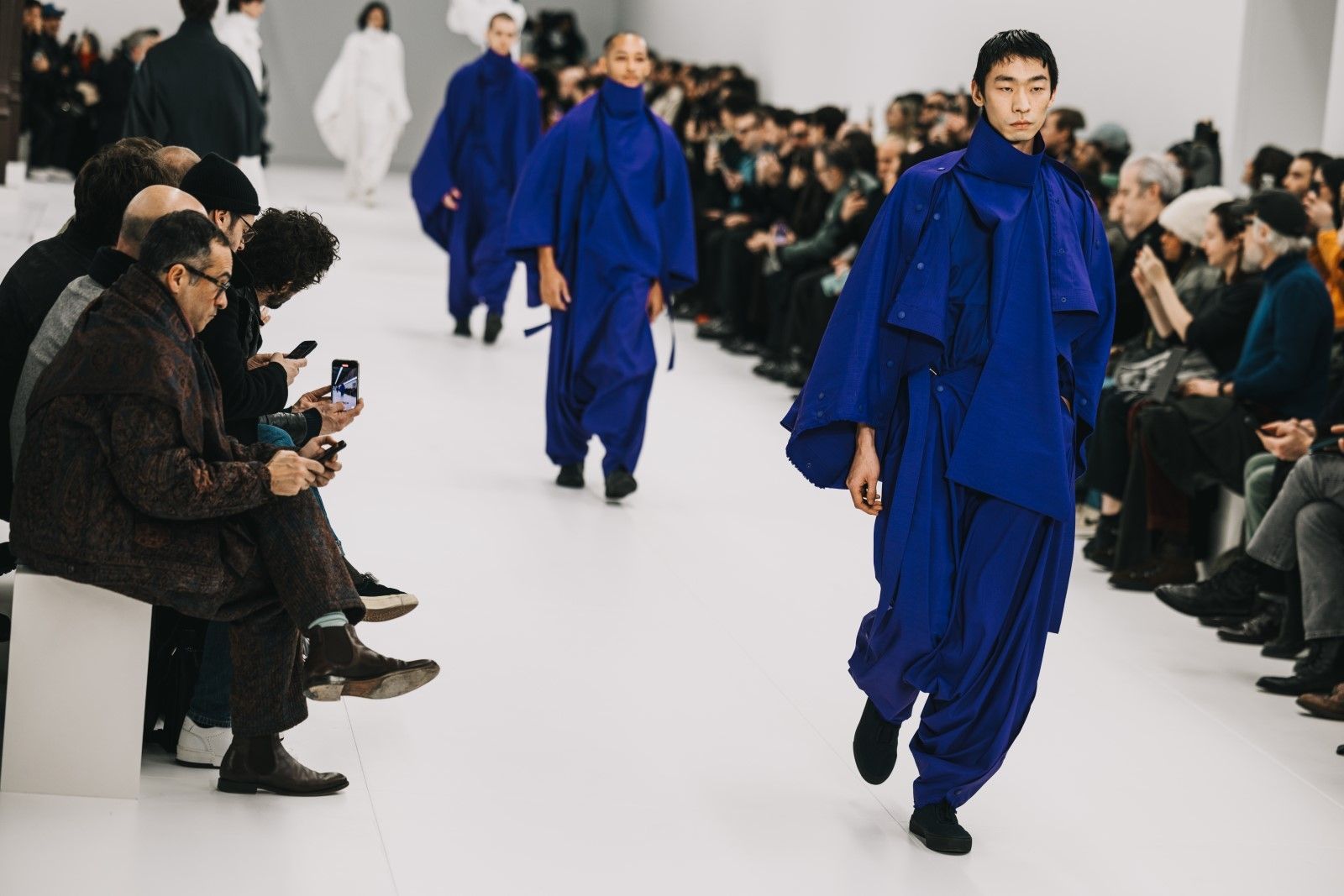 Ieri la collezione FW25 di IM MEN ha fatto il suo debutto ufficiale a Parigi, prendendo il posto che fu di Homme Plissé Issey Miyake sulle passerelle della moda – il che non significa che Homme Plissé Issey Miyake sia scomparso, semplicemente lo si troverà in presentazioni più intime mentre il posto sotto i riflettori sarà preso da questa linea dal sapore più avant-garde. Presentata nella suggestiva cornice del Réfectoire des Cordeliers, un ex monastero del XVI secolo, la sfilata ha segnato l’inizio di un nuovo capitolo per l'eredità del compianto maestro Issey Miyake che, possiamo dirlo, non potrebbe essere in mani migliori. IM MEN rappresenta l'ultima grande creazione del genio giapponese, avviata poco prima della sua scomparsa nel 2022. Il brand è nato dall’unione di tre designer: Sen Kawahara, Yuki Itakura e Nobutaka Kobayashi, che hanno collaborato con Miyake per sviluppare una nuova e più avanzata visione del menswear basata sul concetto cardine della sua filosofia: "A piece of cloth" che è la pietra angolare su cui il compianto designer, il suo vasto team e i suoi successori hanno costruito il complesso edificio di linee e proposte del brand e che spazia dalla moda fino al design d’interni. In questa collezione, il tessuto diventa il punto di partenza per una ridefinizione dell'abbigliamento, che unisce artigianalità, ingegneria e un senso di libertà creativa. Da sempre firma del brand, il libero movimento del corpo nei vestiti è stato protagonista anche della presentazione di ieri, che ha visto i modelli correre sulla passerella sciogliendo e riannodando i capi, mostrandone la leggera e ingengosa architettura. Sempre l’idea di movimento è stata esplorata dall’installazione del designer Tokujin Yoshioka, che ha decorato la venue con enormi braccia robotiche che sollevavano pannelli neri seguendo movimenti ipnotici.