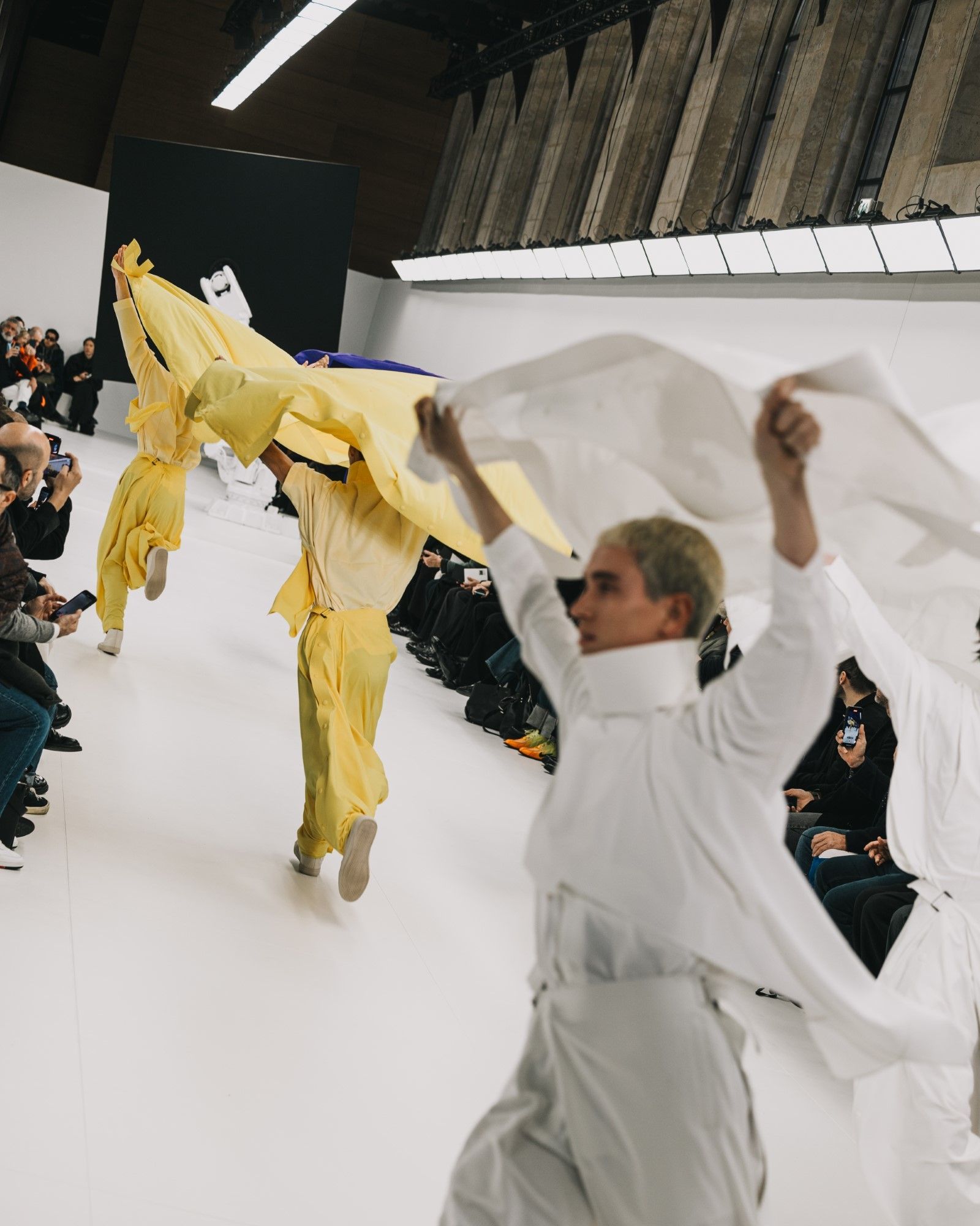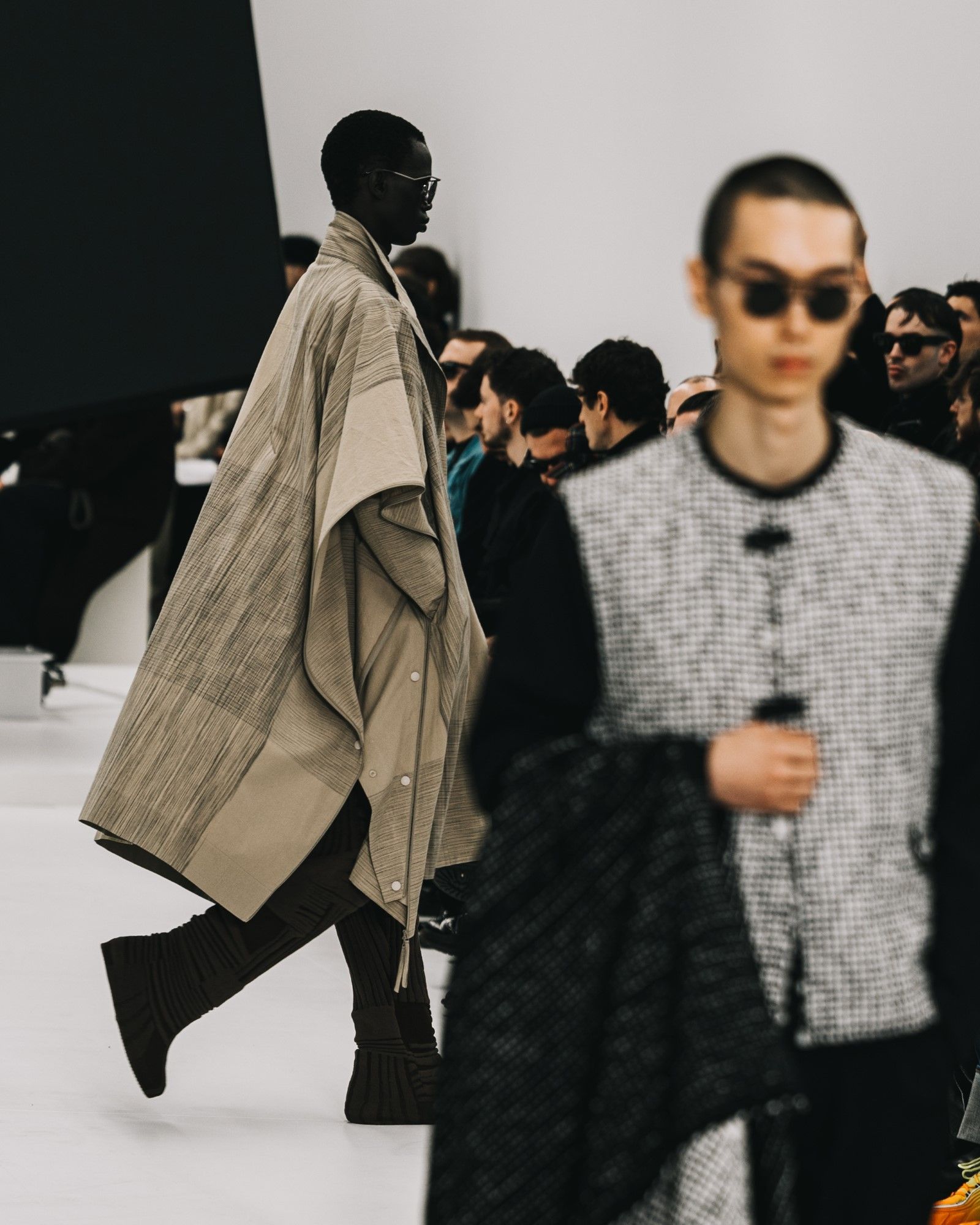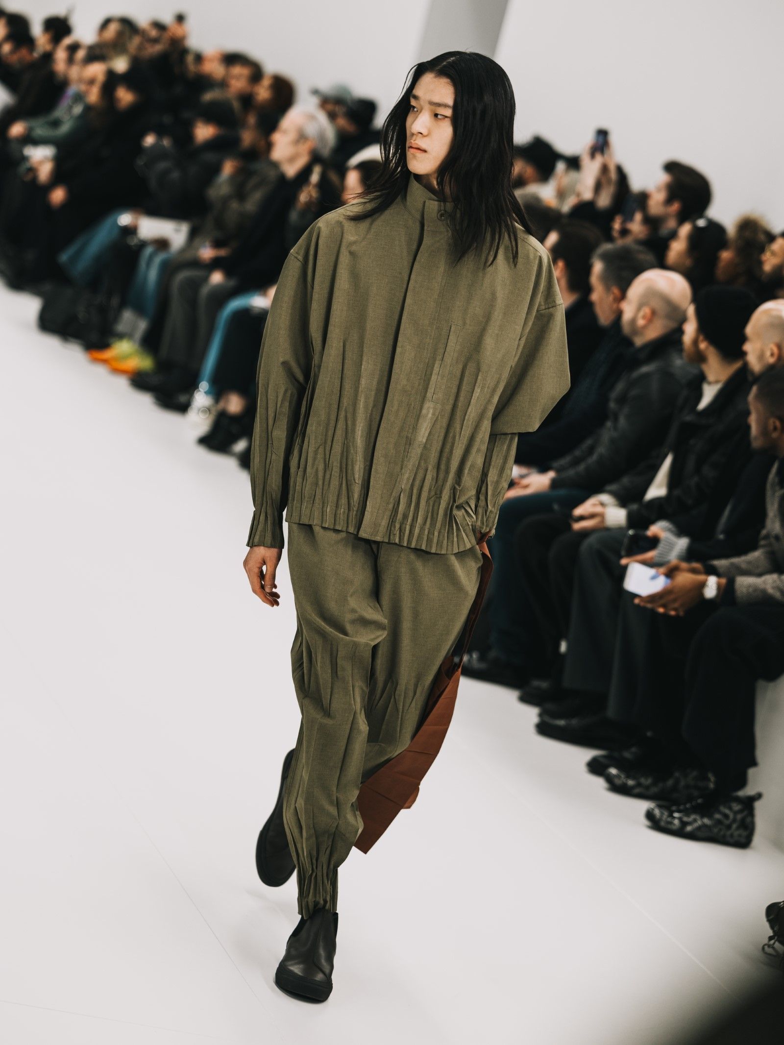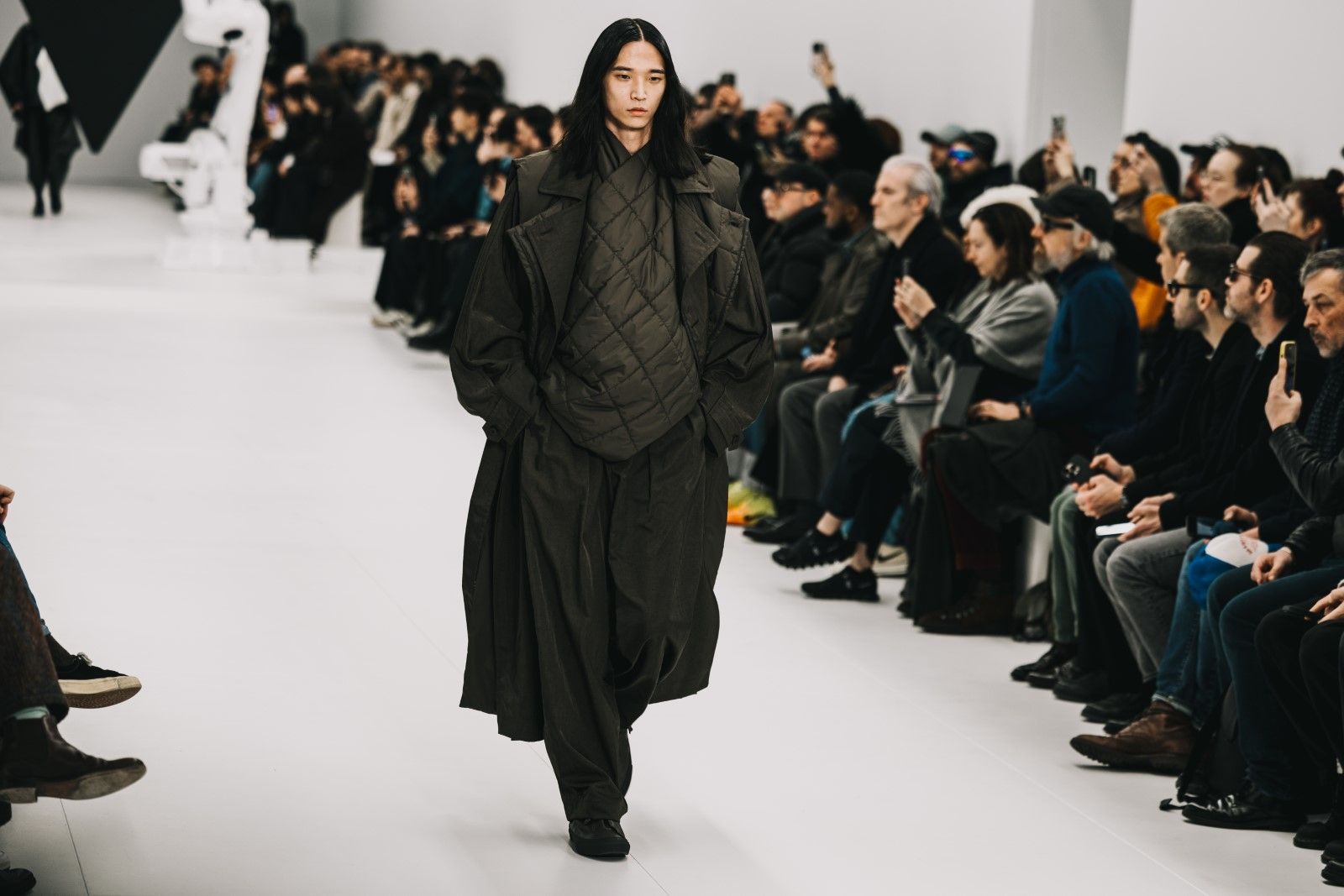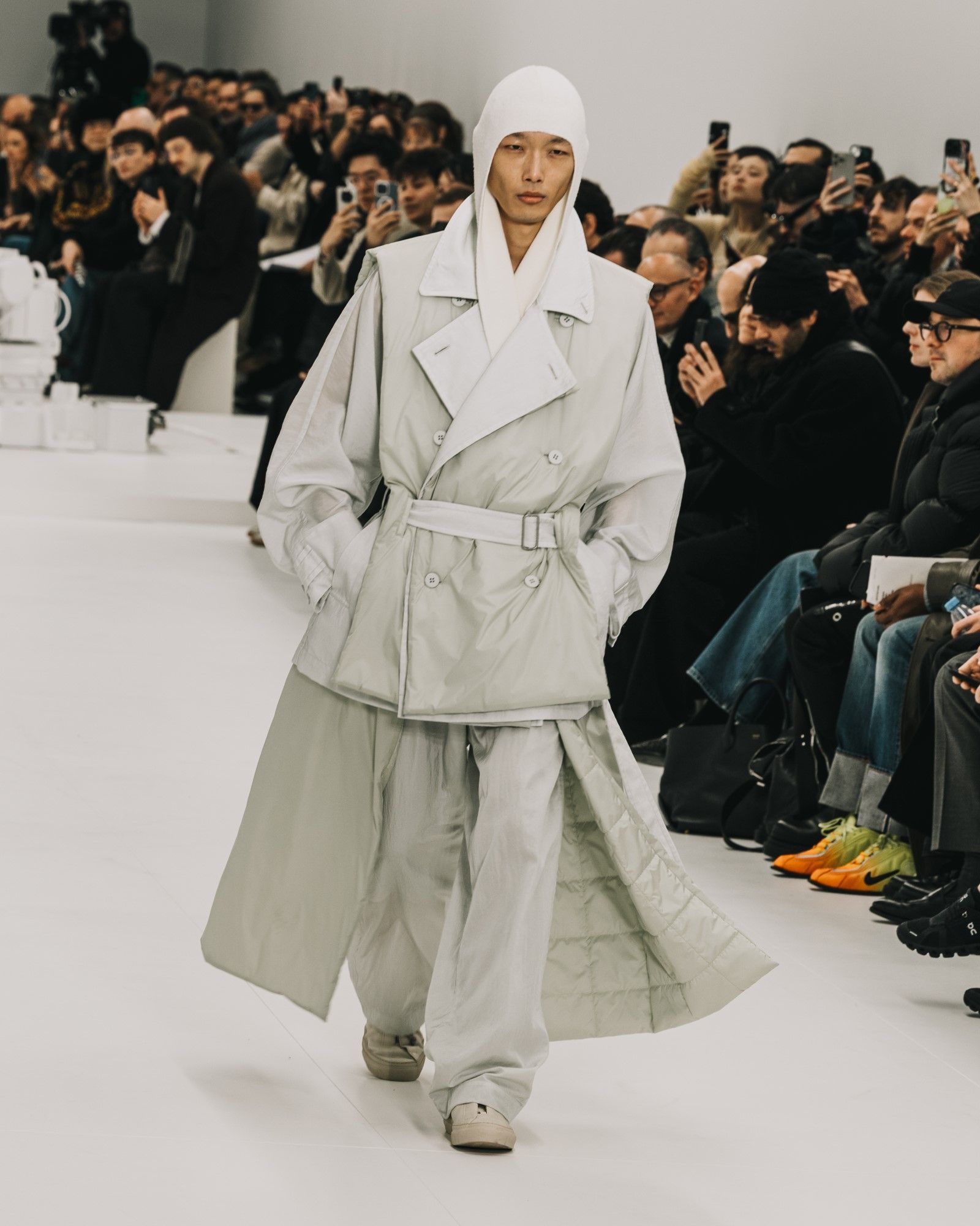 Ieri la collezione FW25 di IM MEN ha fatto il suo debutto ufficiale a Parigi, prendendo il posto che fu di Homme Plissé Issey Miyake sulle passerelle della moda – il che non significa che Homme Plissé Issey Miyake sia scomparso, semplicemente lo si troverà in presentazioni più intime mentre il posto sotto i riflettori sarà preso da questa linea dal sapore più avant-garde. Presentata nella suggestiva cornice del Réfectoire des Cordeliers, un ex monastero del XVI secolo, la sfilata ha segnato l’inizio di un nuovo capitolo per l'eredità del compianto maestro Issey Miyake che, possiamo dirlo, non potrebbe essere in mani migliori. IM MEN rappresenta l'ultima grande creazione del genio giapponese, avviata poco prima della sua scomparsa nel 2022. Il brand è nato dall’unione di tre designer: Sen Kawahara, Yuki Itakura e Nobutaka Kobayashi, che hanno collaborato con Miyake per sviluppare una nuova e più avanzata visione del menswear basata sul concetto cardine della sua filosofia: "A piece of cloth" che è la pietra angolare su cui il compianto designer, il suo vasto team e i suoi successori hanno costruito il complesso edificio di linee e proposte del brand e che spazia dalla moda fino al design d’interni. In questa collezione, il tessuto diventa il punto di partenza per una ridefinizione dell'abbigliamento, che unisce artigianalità, ingegneria e un senso di libertà creativa. Da sempre firma del brand, il libero movimento del corpo nei vestiti è stato protagonista anche della presentazione di ieri, che ha visto i modelli correre sulla passerella sciogliendo e riannodando i capi, mostrandone la leggera e ingengosa architettura. Sempre l’idea di movimento è stata esplorata dall’installazione del designer Tokujin Yoshioka, che ha decorato la venue con enormi braccia robotiche che sollevavano pannelli neri seguendo movimenti ipnotici.