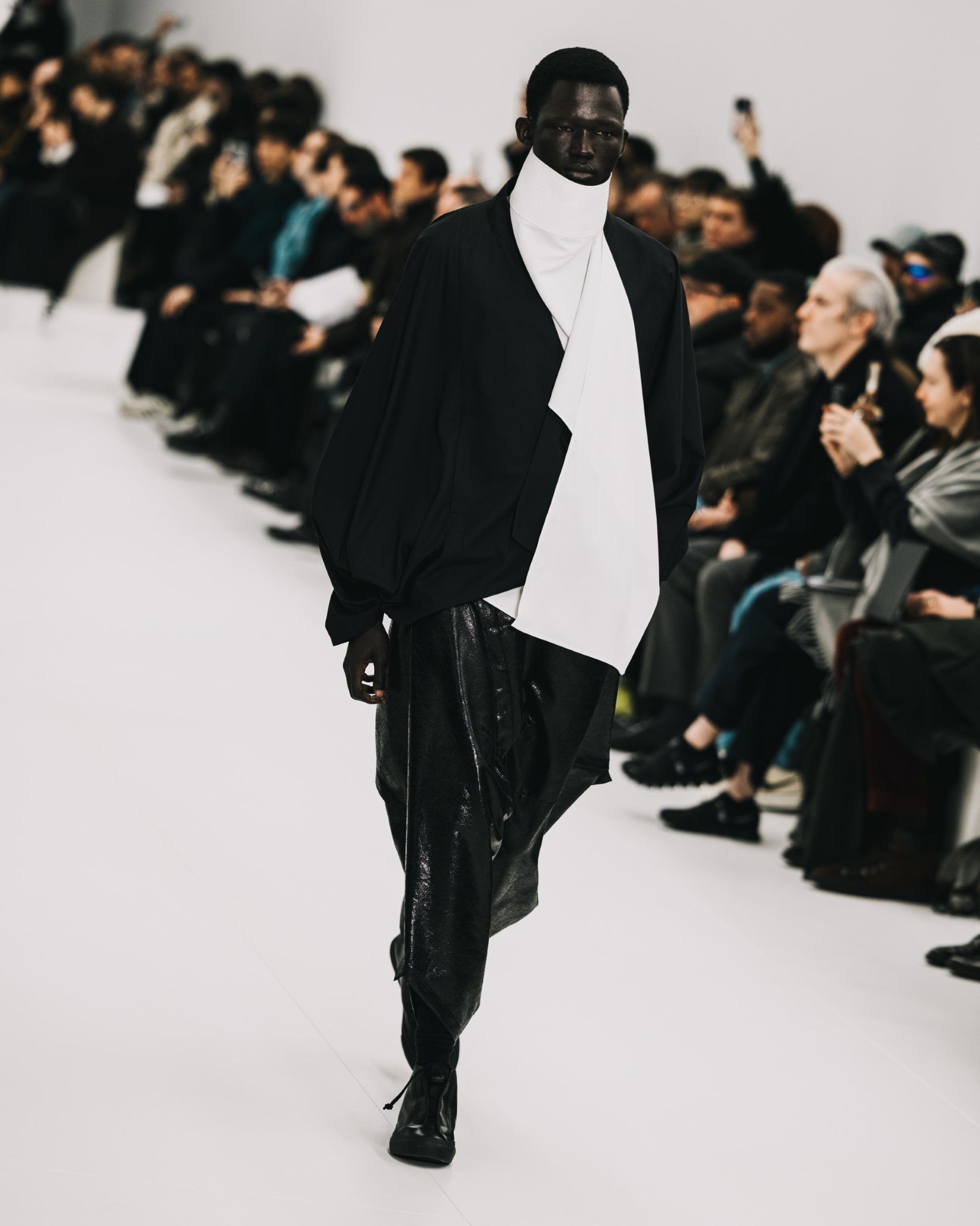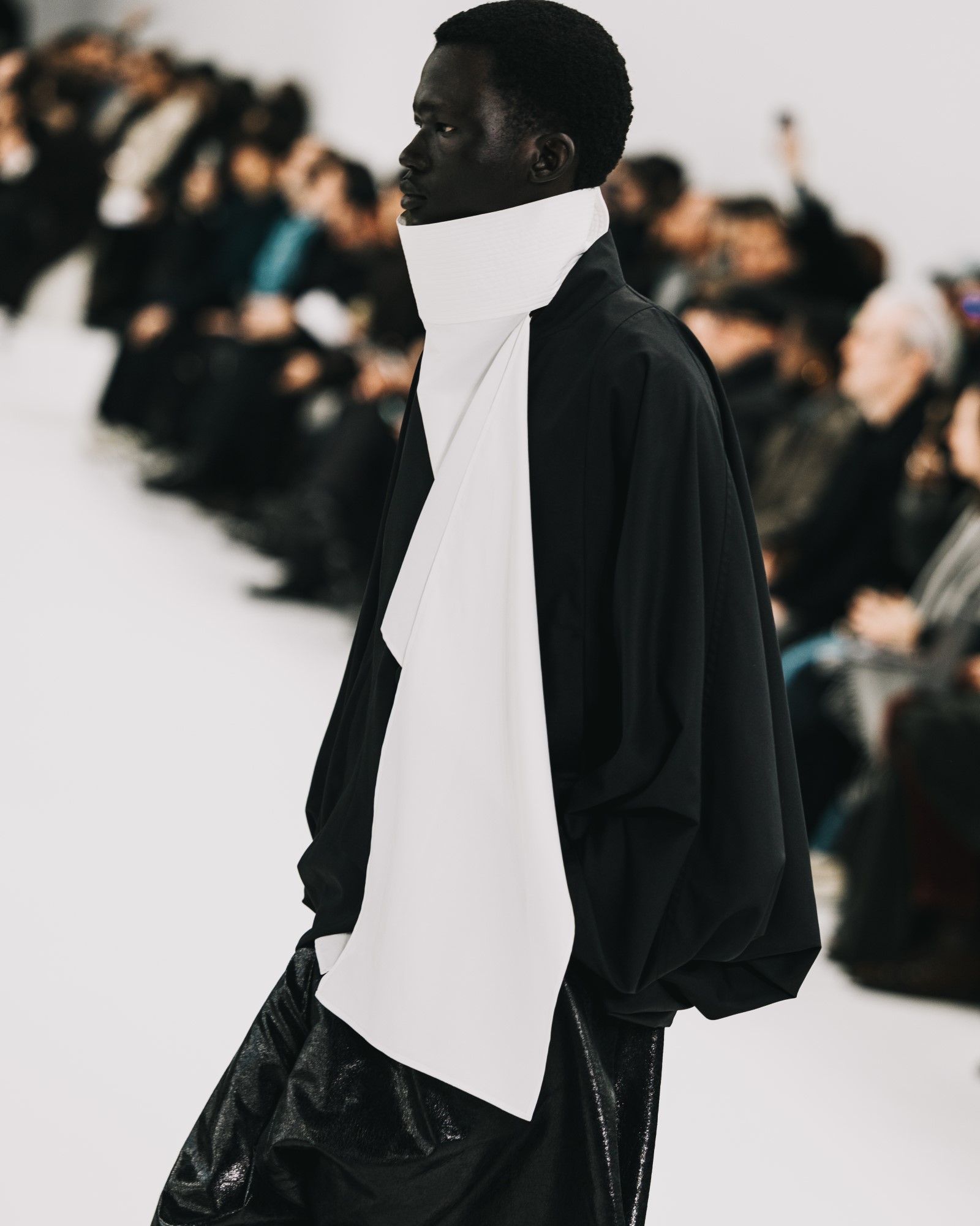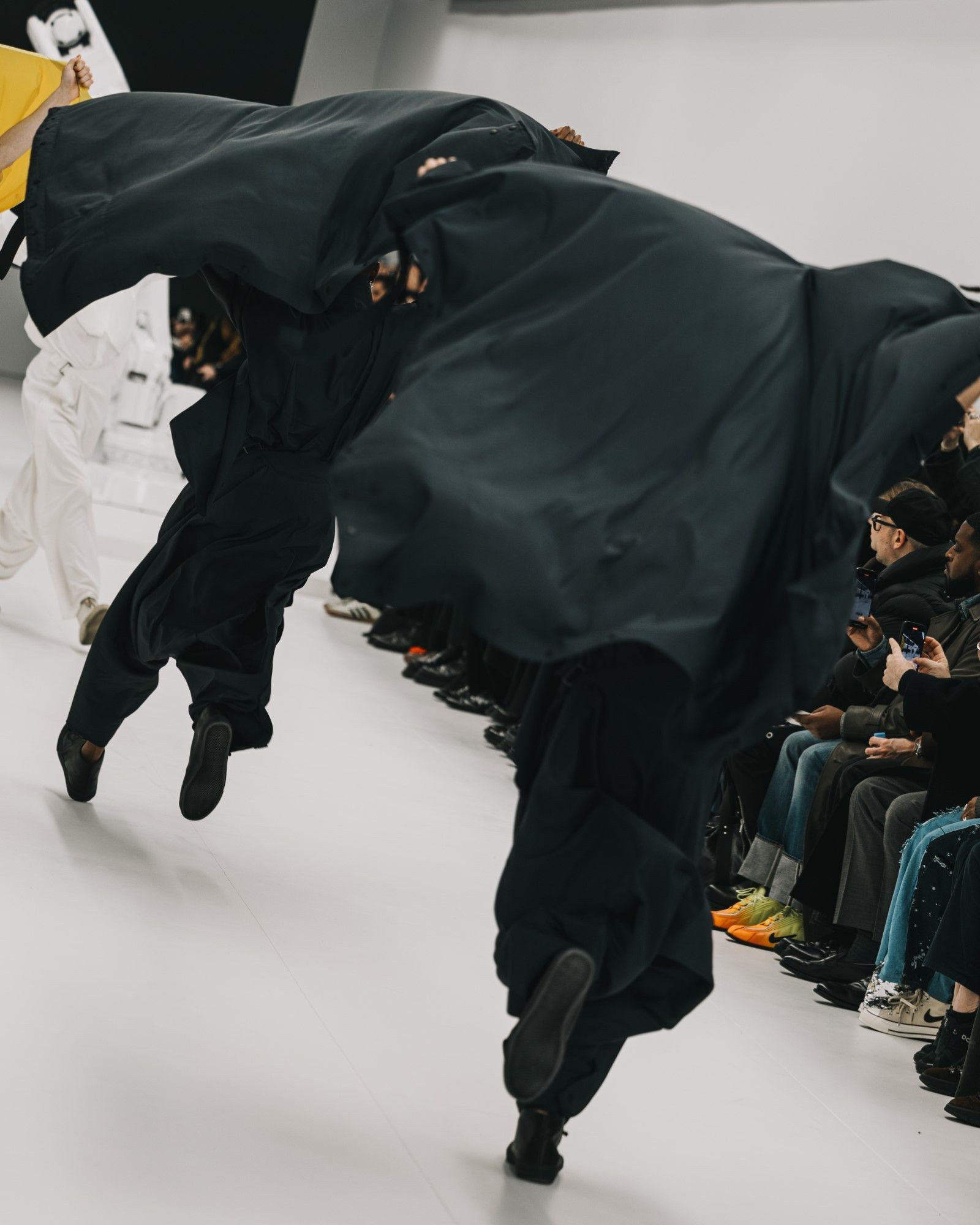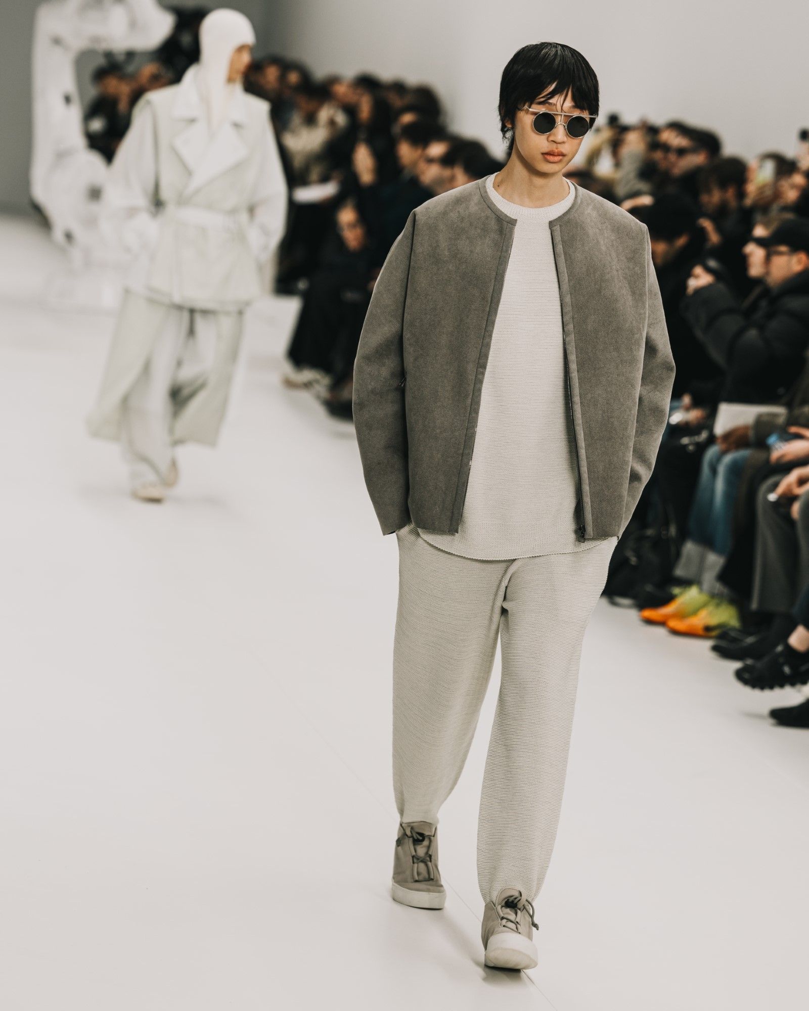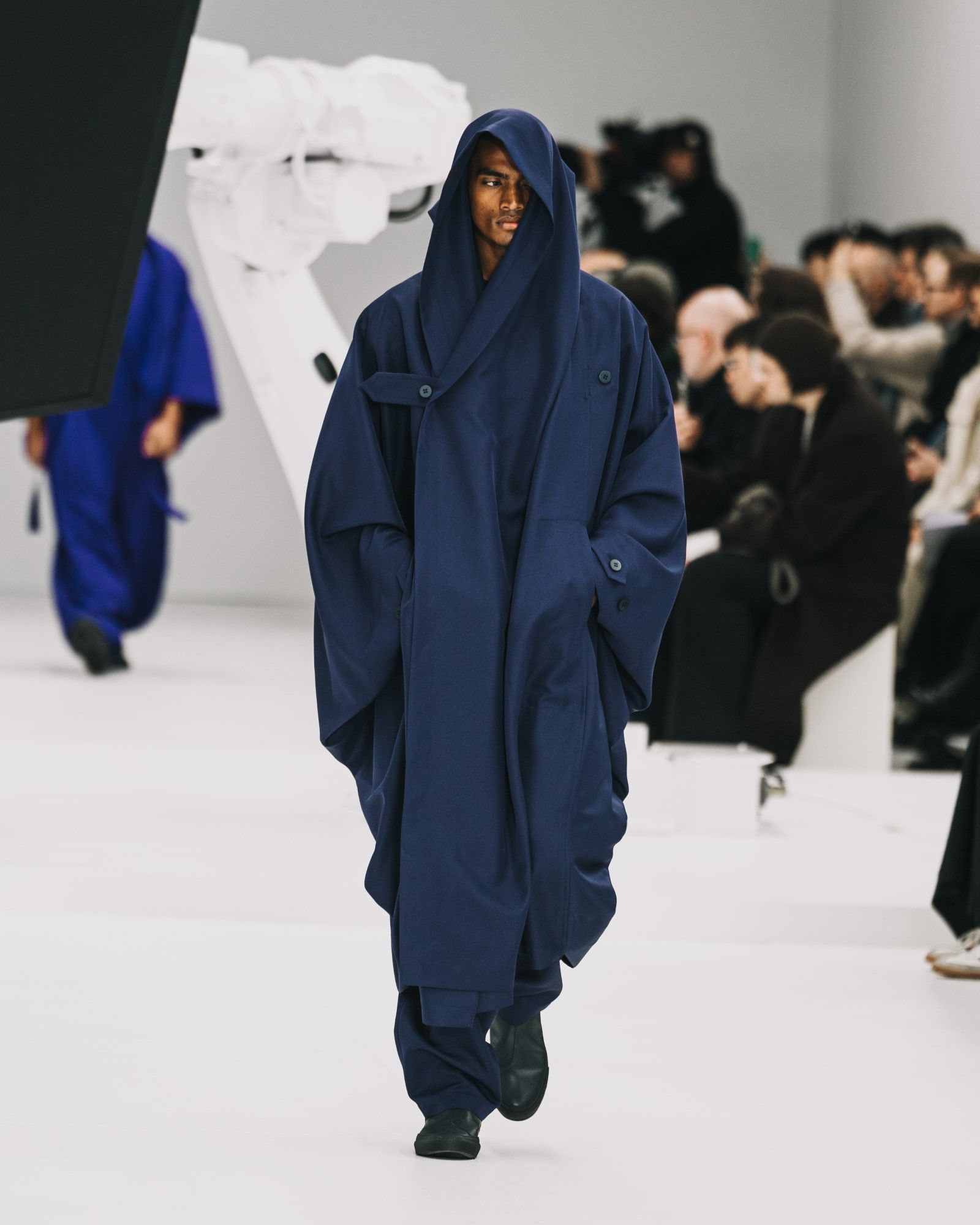 Ieri la collezione FW25 di IM MEN ha fatto il suo debutto ufficiale a Parigi, prendendo il posto che fu di Homme Plissé Issey Miyake sulle passerelle della moda – il che non significa che Homme Plissé Issey Miyake sia scomparso, semplicemente lo si troverà in presentazioni più intime mentre il posto sotto i riflettori sarà preso da questa linea dal sapore più avant-garde. Presentata nella suggestiva cornice del Réfectoire des Cordeliers, un ex monastero del XVI secolo, la sfilata ha segnato l’inizio di un nuovo capitolo per l'eredità del compianto maestro Issey Miyake che, possiamo dirlo, non potrebbe essere in mani migliori. IM MEN rappresenta l'ultima grande creazione del genio giapponese, avviata poco prima della sua scomparsa nel 2022. Il brand è nato dall’unione di tre designer: Sen Kawahara, Yuki Itakura e Nobutaka Kobayashi, che hanno collaborato con Miyake per sviluppare una nuova e più avanzata visione del menswear basata sul concetto cardine della sua filosofia: "A piece of cloth" che è la pietra angolare su cui il compianto designer, il suo vasto team e i suoi successori hanno costruito il complesso edificio di linee e proposte del brand e che spazia dalla moda fino al design d’interni. In questa collezione, il tessuto diventa il punto di partenza per una ridefinizione dell'abbigliamento, che unisce artigianalità, ingegneria e un senso di libertà creativa. Da sempre firma del brand, il libero movimento del corpo nei vestiti è stato protagonista anche della presentazione di ieri, che ha visto i modelli correre sulla passerella sciogliendo e riannodando i capi, mostrandone la leggera e ingengosa architettura. Sempre l’idea di movimento è stata esplorata dall’installazione del designer Tokujin Yoshioka, che ha decorato la venue con enormi braccia robotiche che sollevavano pannelli neri seguendo movimenti ipnotici.