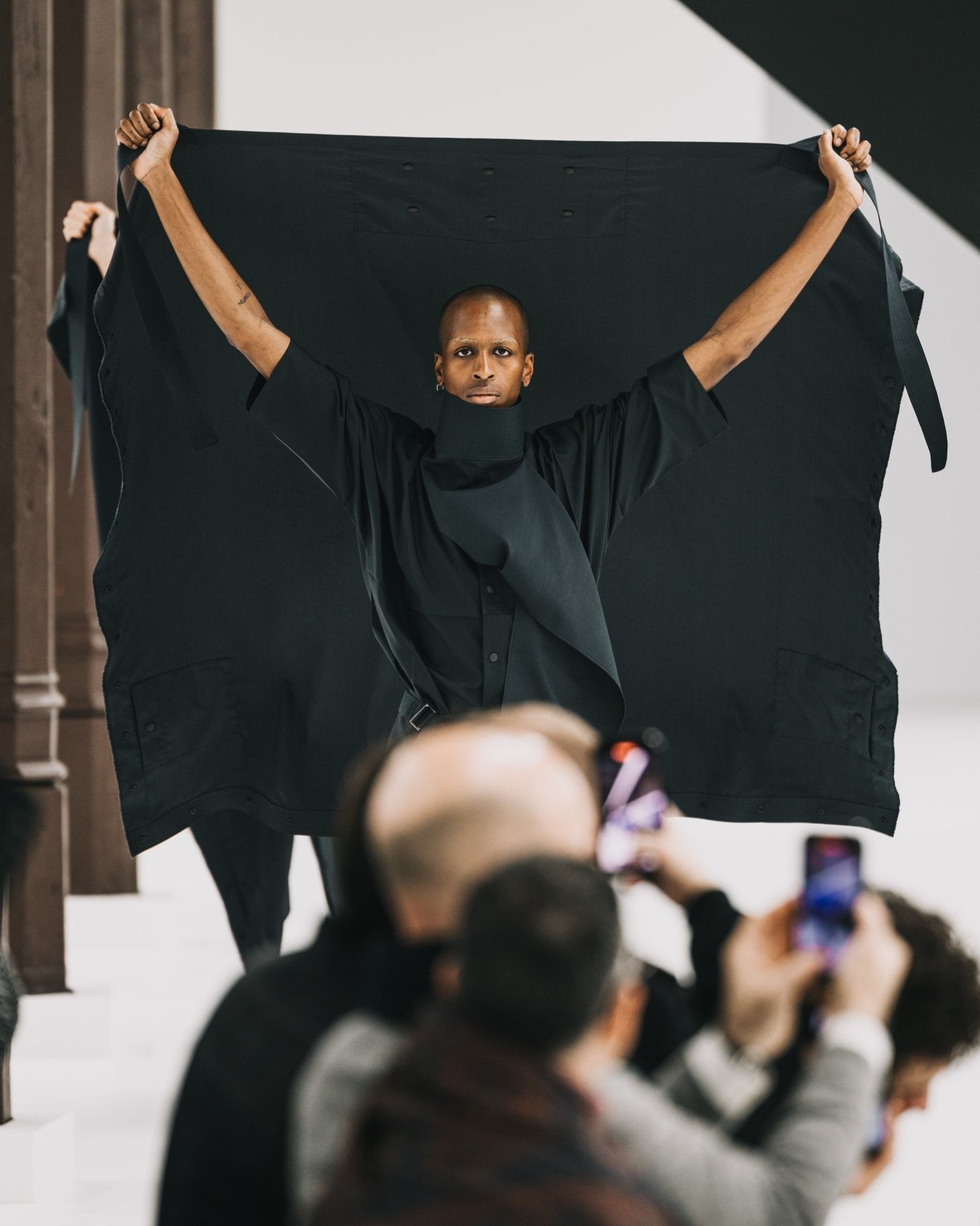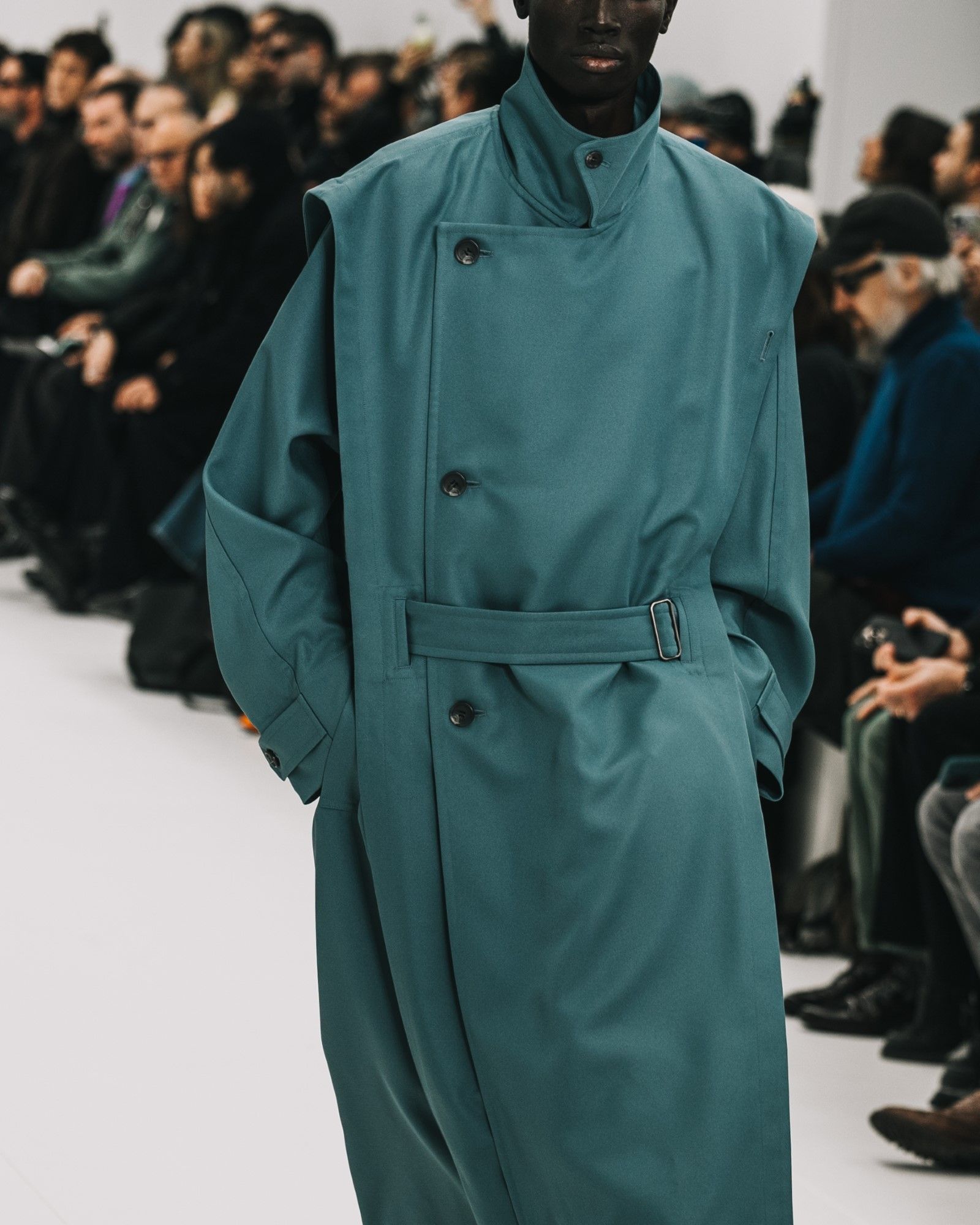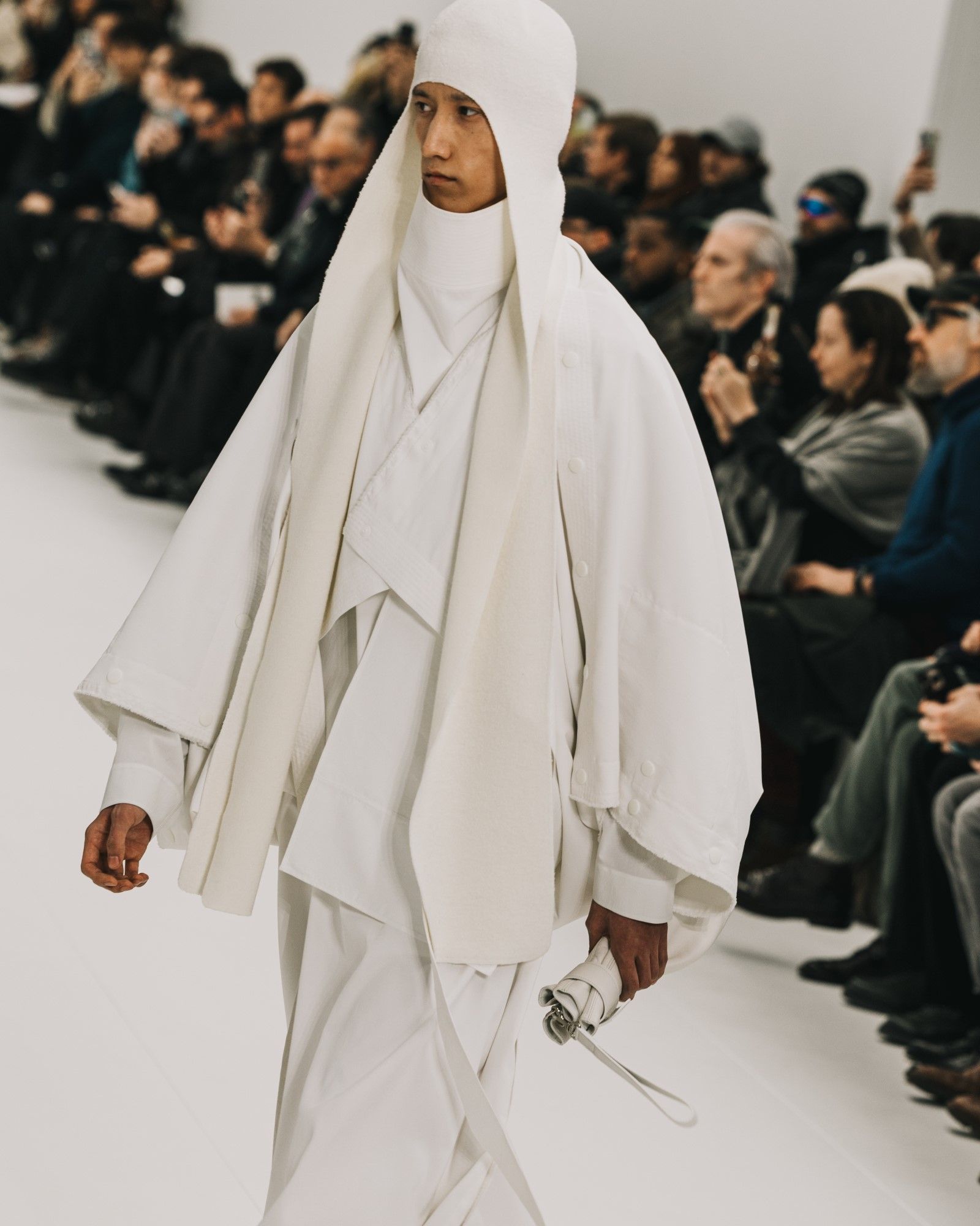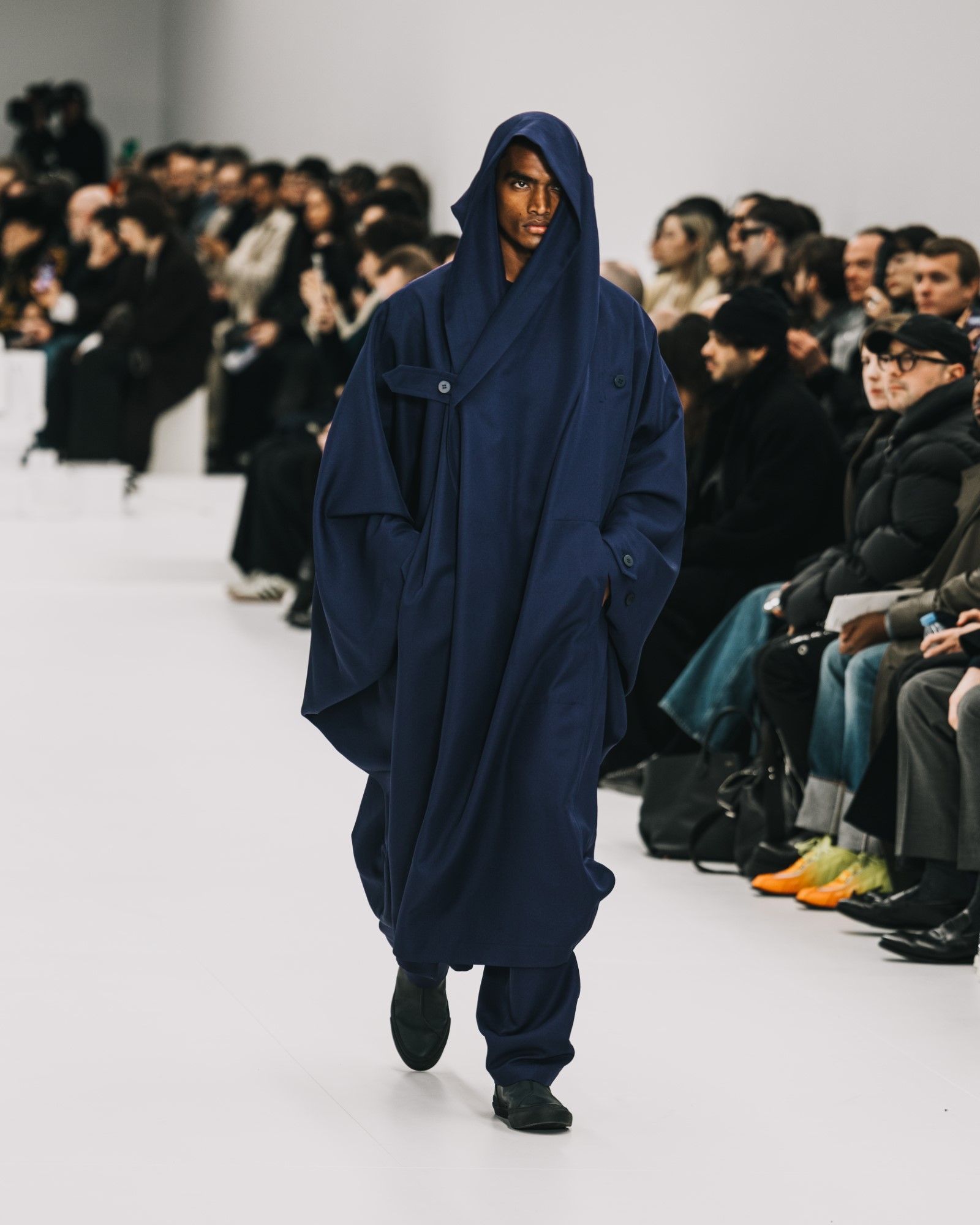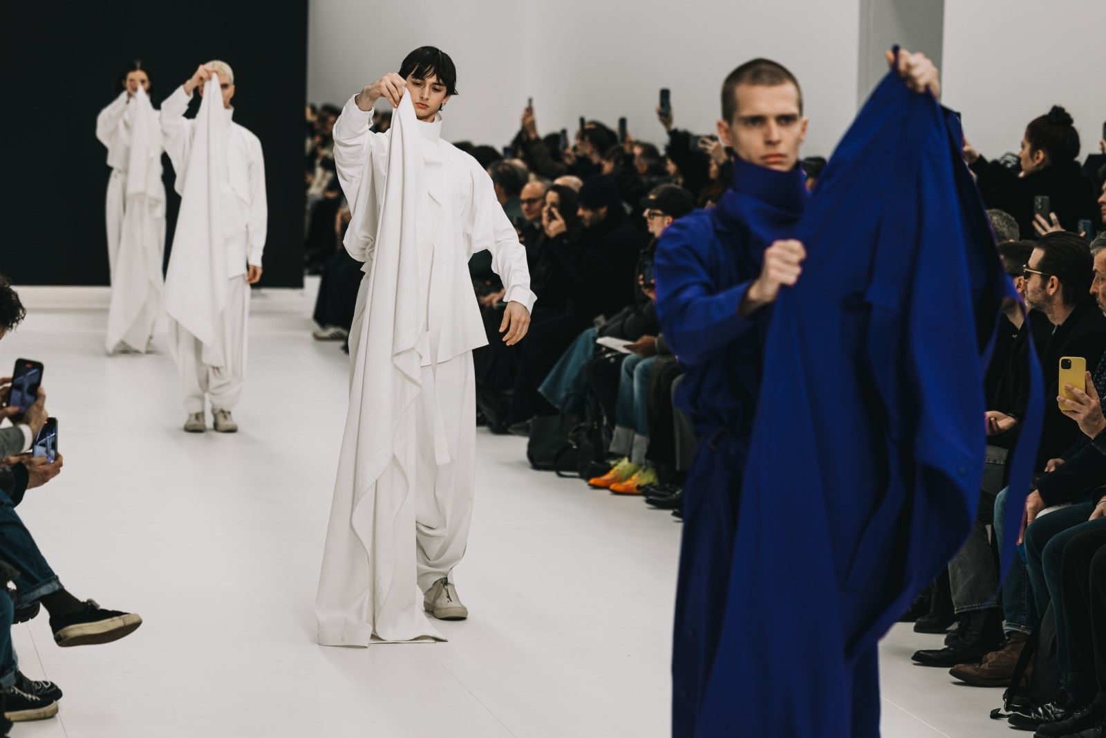 Ieri la collezione FW25 di IM MEN ha fatto il suo debutto ufficiale a Parigi, prendendo il posto che fu di Homme Plissé Issey Miyake sulle passerelle della moda – il che non significa che Homme Plissé Issey Miyake sia scomparso, semplicemente lo si troverà in presentazioni più intime mentre il posto sotto i riflettori sarà preso da questa linea dal sapore più avant-garde. Presentata nella suggestiva cornice del Réfectoire des Cordeliers, un ex monastero del XVI secolo, la sfilata ha segnato l’inizio di un nuovo capitolo per l'eredità del compianto maestro Issey Miyake che, possiamo dirlo, non potrebbe essere in mani migliori. IM MEN rappresenta l'ultima grande creazione del genio giapponese, avviata poco prima della sua scomparsa nel 2022. Il brand è nato dall’unione di tre designer: Sen Kawahara, Yuki Itakura e Nobutaka Kobayashi, che hanno collaborato con Miyake per sviluppare una nuova e più avanzata visione del menswear basata sul concetto cardine della sua filosofia: "A piece of cloth" che è la pietra angolare su cui il compianto designer, il suo vasto team e i suoi successori hanno costruito il complesso edificio di linee e proposte del brand e che spazia dalla moda fino al design d’interni. In questa collezione, il tessuto diventa il punto di partenza per una ridefinizione dell'abbigliamento, che unisce artigianalità, ingegneria e un senso di libertà creativa. Da sempre firma del brand, il libero movimento del corpo nei vestiti è stato protagonista anche della presentazione di ieri, che ha visto i modelli correre sulla passerella sciogliendo e riannodando i capi, mostrandone la leggera e ingengosa architettura. Sempre l’idea di movimento è stata esplorata dall’installazione del designer Tokujin Yoshioka, che ha decorato la venue con enormi braccia robotiche che sollevavano pannelli neri seguendo movimenti ipnotici.