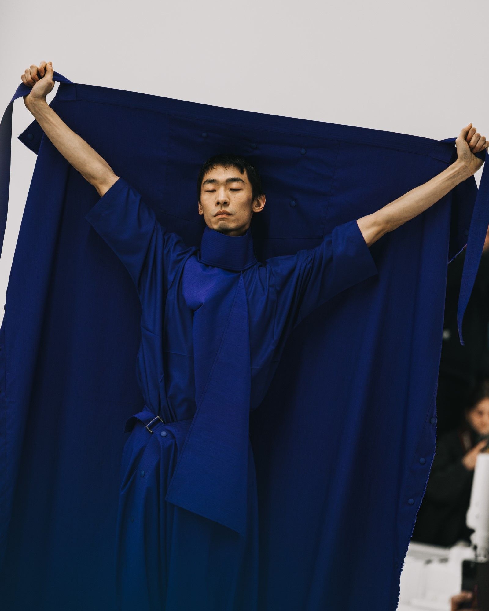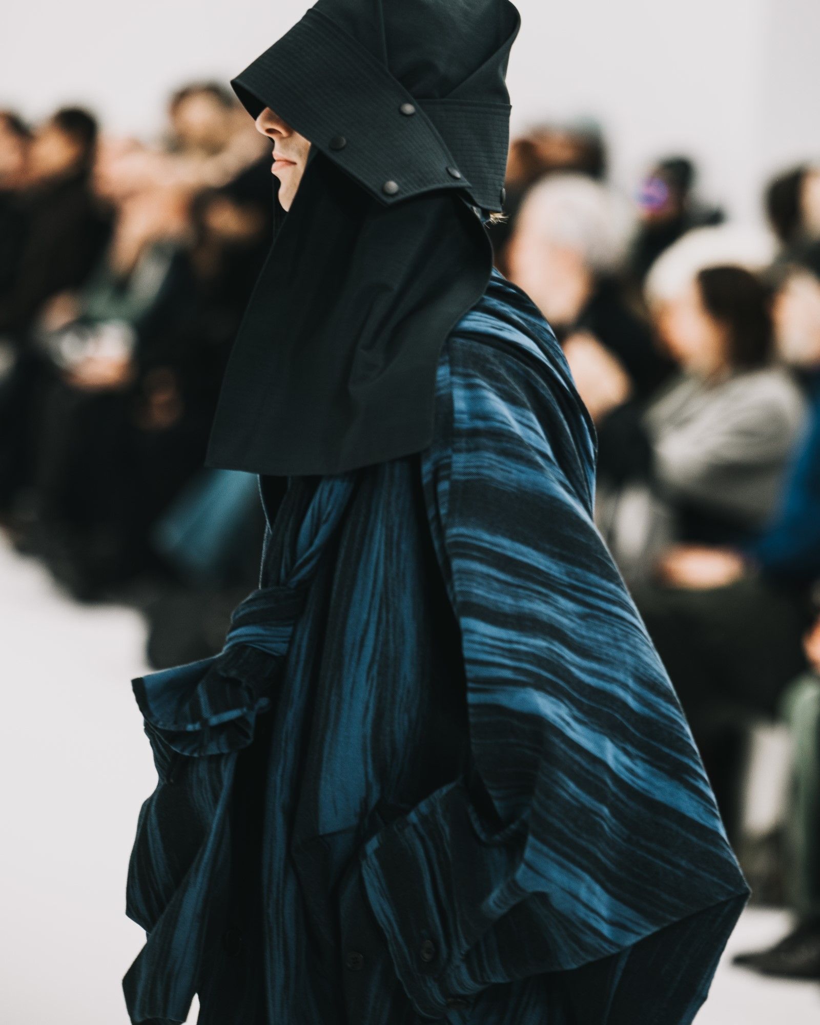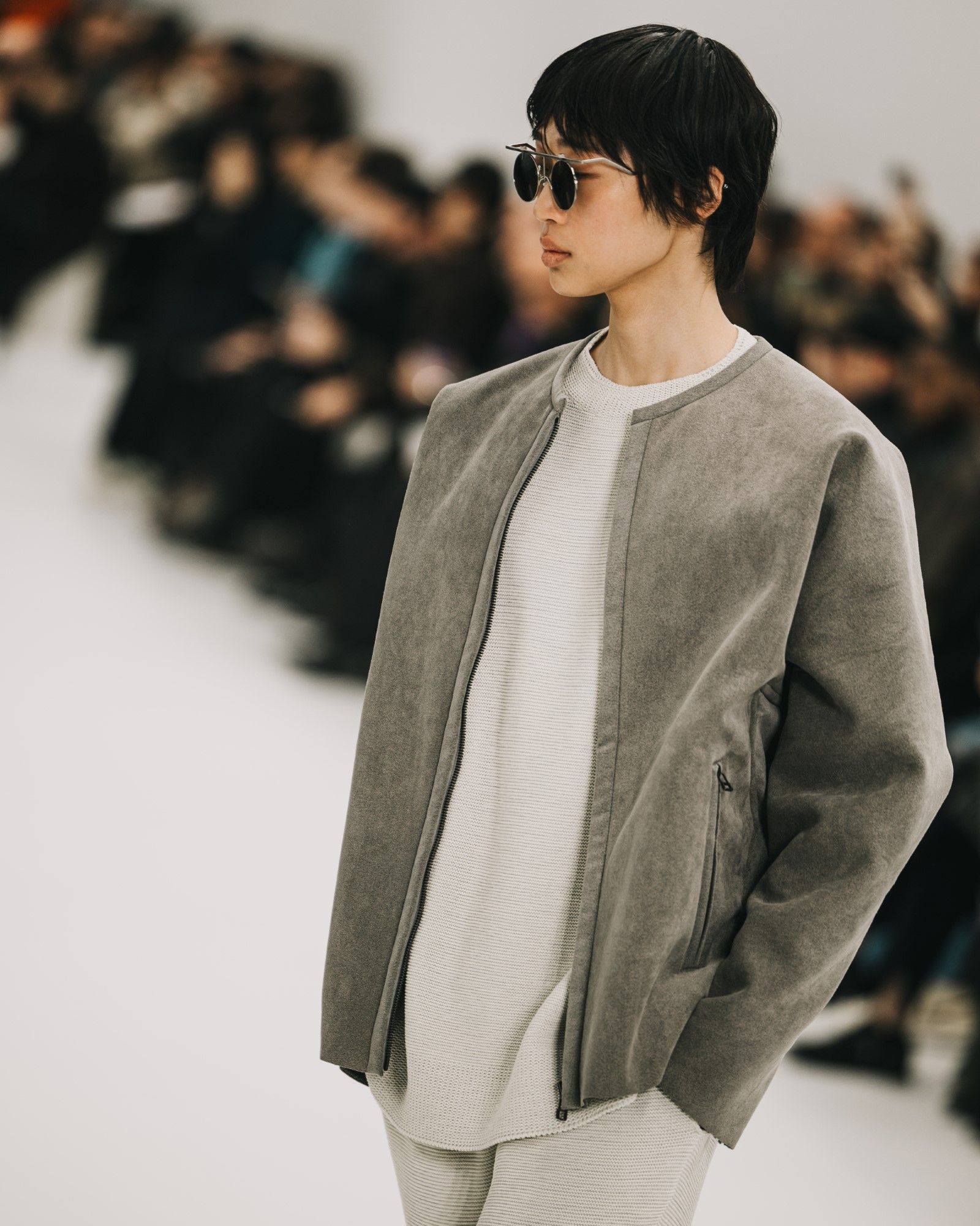 Ma veniamo alla collezione. I capi dello show, come ci si attendeva, hanno esplorato il confine tra moda e scultura giocando con lo spazio vuoto che sta tra il corpo e la stoffa, la quale nel corso del movimento dei modelli (fosse esso un semplice camminare, correre o danzare) assumeva diverse forme e, in base alla costruzione dei singoli pezzi, mostrava nuove funzionalità. Come sempre, questo tipo di ricerca sul “flusso” degli abiti intorno al corpo umano partiva da una profonda ricerca tecnica sui materiali, molti dei quali sostenibili, come il poliestere vegetale e una sorta di scamosciato artificiale di nome Ultrasuede. Questi materiali sono stati tagliati e assemblati secondo principi multifunzionali portando sul corpo dei modelli cappotti reversibili, giacche con pannelli modulari e imbottiture removibili. Le varie possibilità di assemblaggio e riassemblaggio dei capi, e in generale la loro adattabilità, sono state suddivise in altrettante serie di design, ciascuna con diversi nomi. La più notevole si chiamava “Flat Drape” e consisteva in abiti dal tessuto leggero i cui drappeggi partono da precise forme forme geometriche che diventano silhouette morbide e fluide. I pezzi della serie “Wall”, invece, reinterpretano l’outerwear utilizzando i pannelli interni per creare strutture tridimensionali, mentre “Heron”, che sono i capi in cui è stato impiegato l’Ultrasuede, erano una serie di capi perforati. I capi “Switch” e “Metallic Ultra Boa” hanno sperimentato con nylon e finiture metalliche mentre la serie “Kasuri” ha reinterpretato l’omonima tecnica di tessitura utilizzando filati di cotone pre-tinti per creare motivi in gradiente.