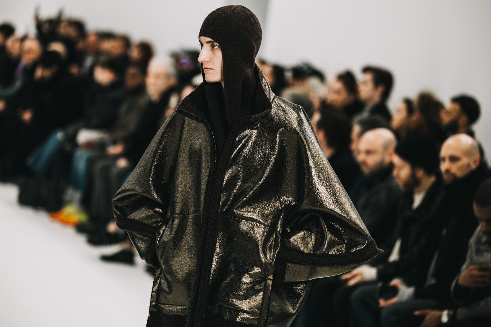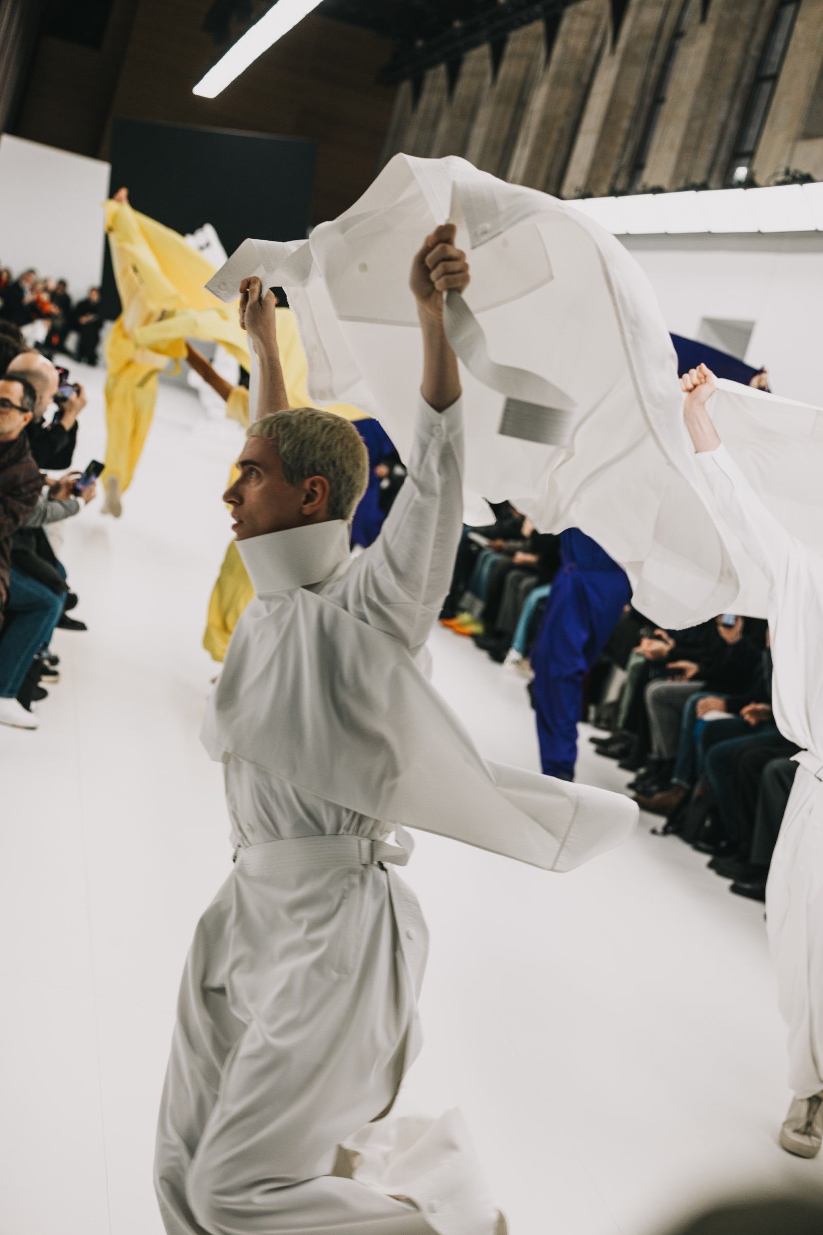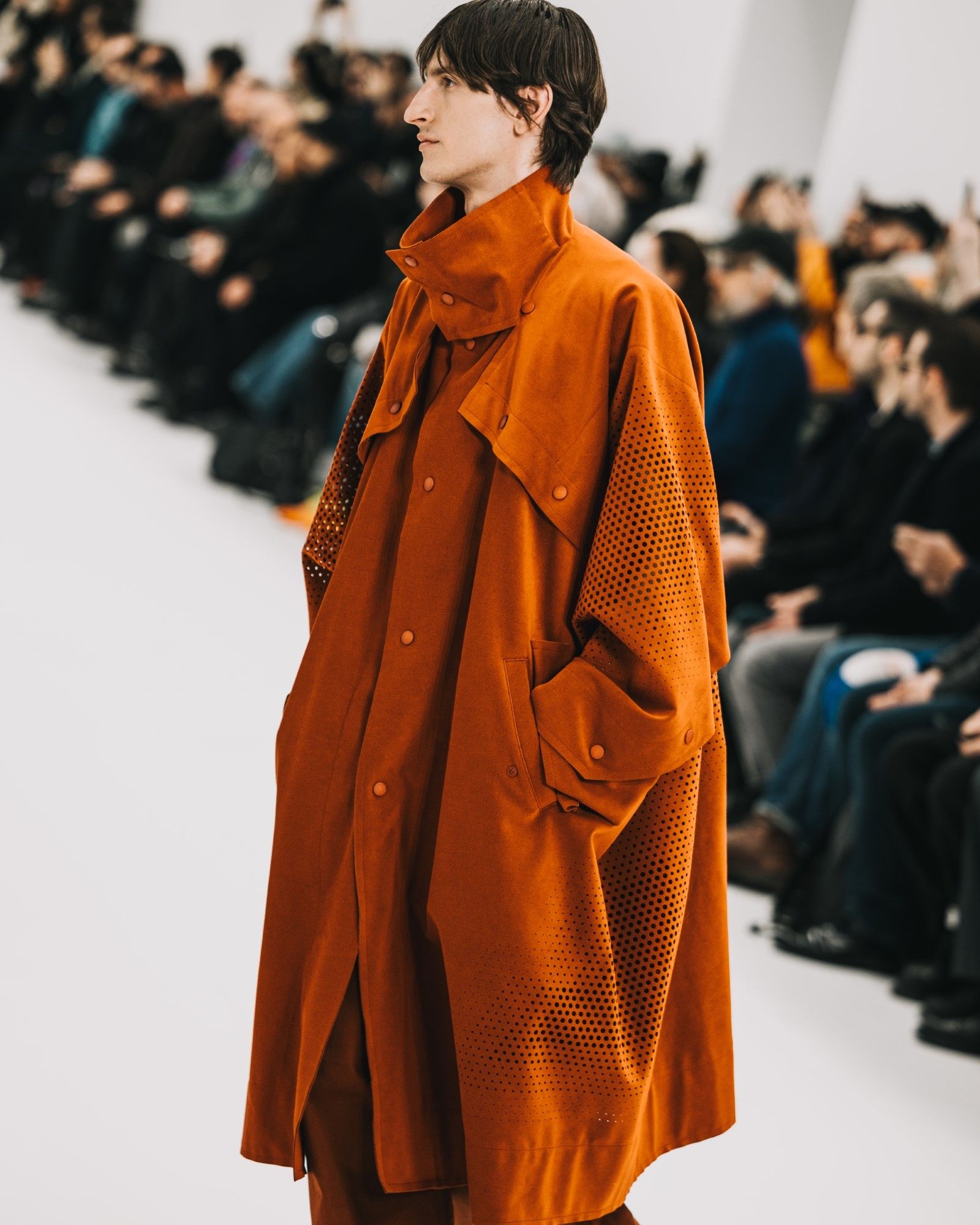 Ma veniamo alla collezione. I capi dello show, come ci si attendeva, hanno esplorato il confine tra moda e scultura giocando con lo spazio vuoto che sta tra il corpo e la stoffa, la quale nel corso del movimento dei modelli (fosse esso un semplice camminare, correre o danzare) assumeva diverse forme e, in base alla costruzione dei singoli pezzi, mostrava nuove funzionalità. Come sempre, questo tipo di ricerca sul “flusso” degli abiti intorno al corpo umano partiva da una profonda ricerca tecnica sui materiali, molti dei quali sostenibili, come il poliestere vegetale e una sorta di scamosciato artificiale di nome Ultrasuede. Questi materiali sono stati tagliati e assemblati secondo principi multifunzionali portando sul corpo dei modelli cappotti reversibili, giacche con pannelli modulari e imbottiture removibili. Le varie possibilità di assemblaggio e riassemblaggio dei capi, e in generale la loro adattabilità, sono state suddivise in altrettante serie di design, ciascuna con diversi nomi. La più notevole si chiamava “Flat Drape” e consisteva in abiti dal tessuto leggero i cui drappeggi partono da precise forme forme geometriche che diventano silhouette morbide e fluide. I pezzi della serie “Wall”, invece, reinterpretano l’outerwear utilizzando i pannelli interni per creare strutture tridimensionali, mentre “Heron”, che sono i capi in cui è stato impiegato l’Ultrasuede, erano una serie di capi perforati. I capi “Switch” e “Metallic Ultra Boa” hanno sperimentato con nylon e finiture metalliche mentre la serie “Kasuri” ha reinterpretato l’omonima tecnica di tessitura utilizzando filati di cotone pre-tinti per creare motivi in gradiente.