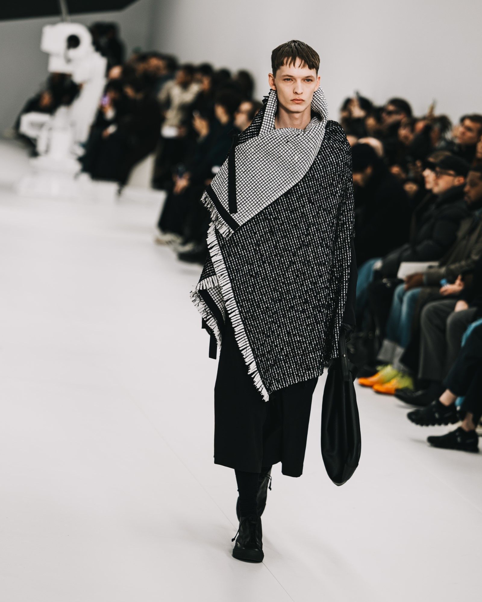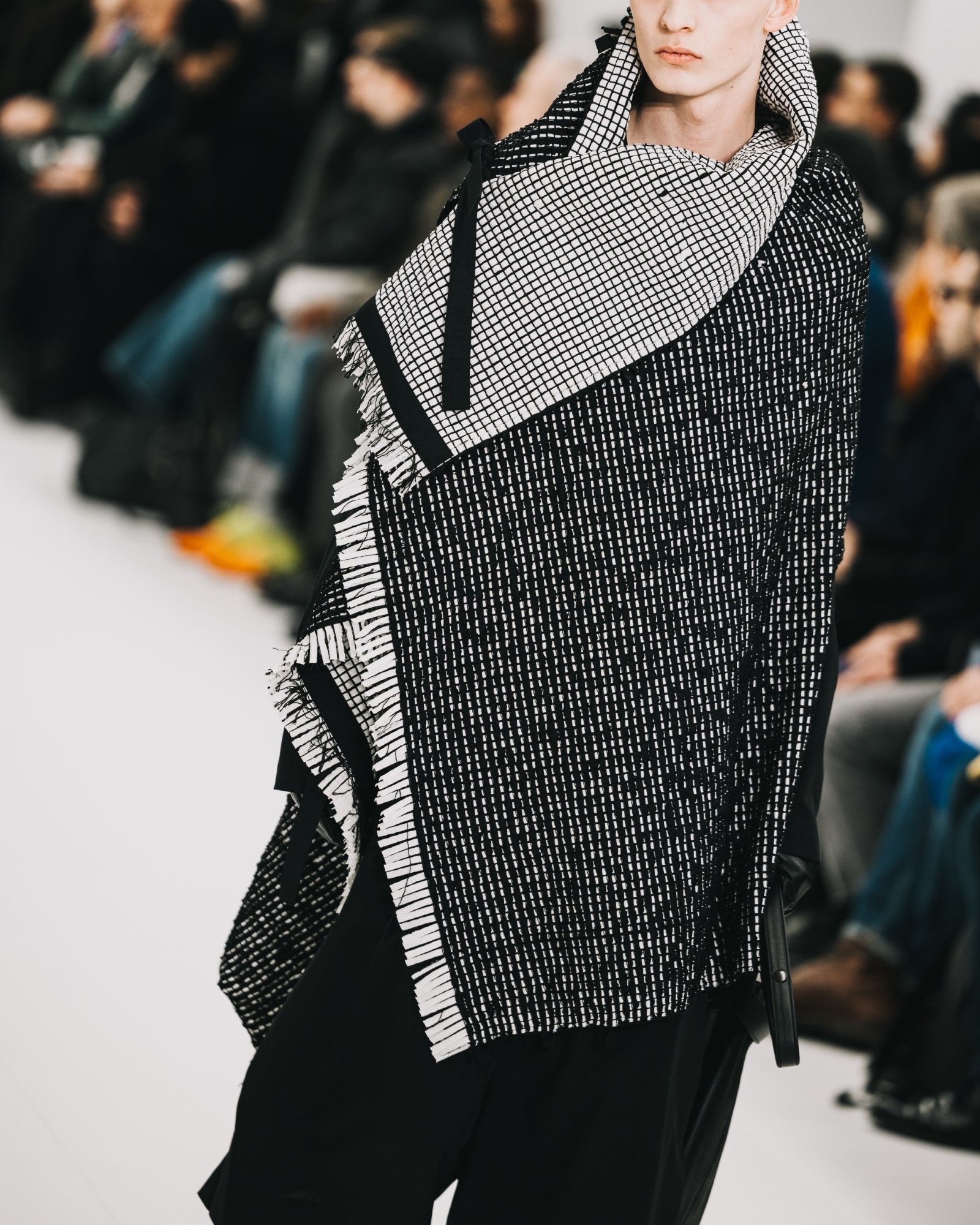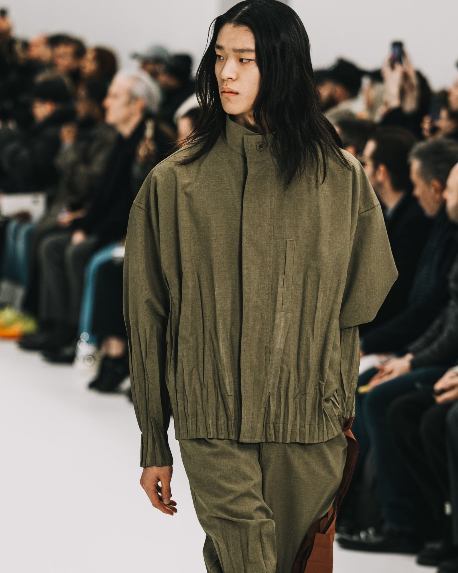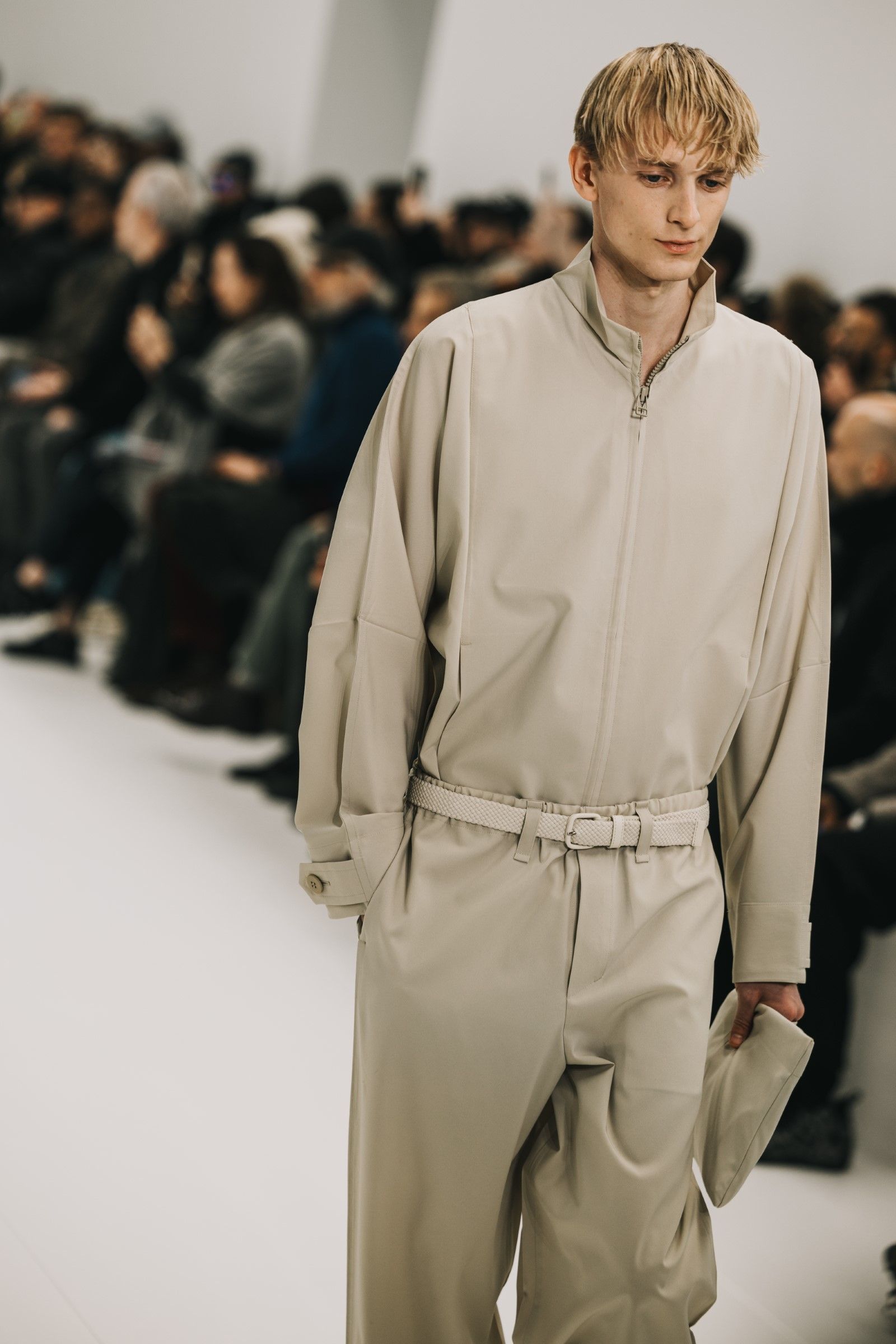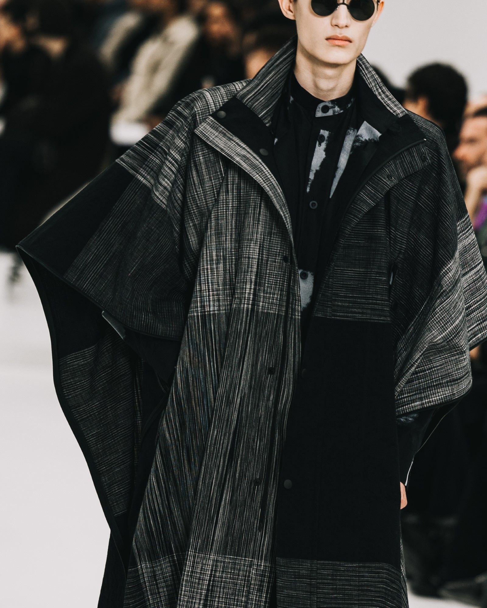 Era comunque inevitabile che tra le due presentazioni, la nuova di IM MEN, e quella classica di Homme Plissé Issey Miyake si facesse un confronto. Posto che la filosofia che anima il brand con le sue diverse diramazioni possiede una propria inconfutabile unità, il nuovo IM MEN appare sicuramente più strutturato rispetto a Homme Plissé Issey Miyake, nelle cui presentazioni il menswear manteneva sì una propria concretezza ma con un estro più rarefatto. La nuova linea invece pur «volando verso l’alto con leggerezza» presenta un design più risoluto e concreto, anche se altrettanto ingegnoso. I volumi sono certamente più pieni e scultorei, mentre risulta molto affascinante il tipo di layering che è stato messo in atto, la cui architettura complessa si è potuta vedere meglio nei primi look total white apparsi in passerella. Elementi di continuità invece sono stati il gusto per un drappeggio articolato e quasi astratto, sempre molto evocativo, e ovviamente lo stupendo uso di colori semplici ma ricchissimi. Altro punto interessante è stata invece la varietà di texture presentate, da quelle più solide delle giacche in Ultrasuede a quelle morbide dei capi imbottiti fino alle superfici scintillanti e sintetiche di certi ensemble di giacca e pantalone dal design angoloso e alla densità dei due look bianchi e neri, in cui quella che sembra una coperta viene portata o appoggiata al braccio come un mantello o avvolta intorno al corpo come un capo ibrido a metà fra la stola, la sciarpa e il cappotto. Si capisce insomma, dalla ricchezza della nuova linea, come mai il brand abbia deciso di sostituire la classica e sempre bellissima presentazione di Homme Plissé Issey Miyake con questa di IM MAN, sicuramente meritevole di una posizione di grande rilievo nel vasto panorama di cui si compone il mondo creato da Issey Miyake.