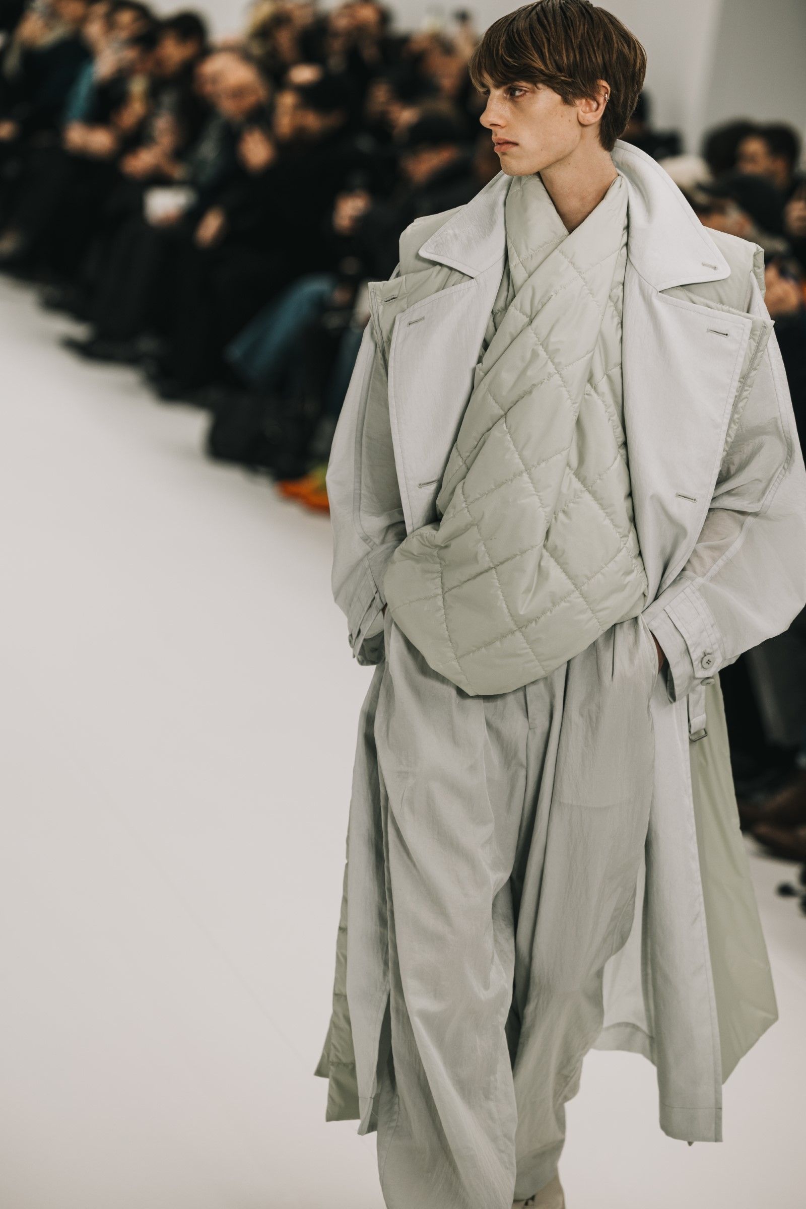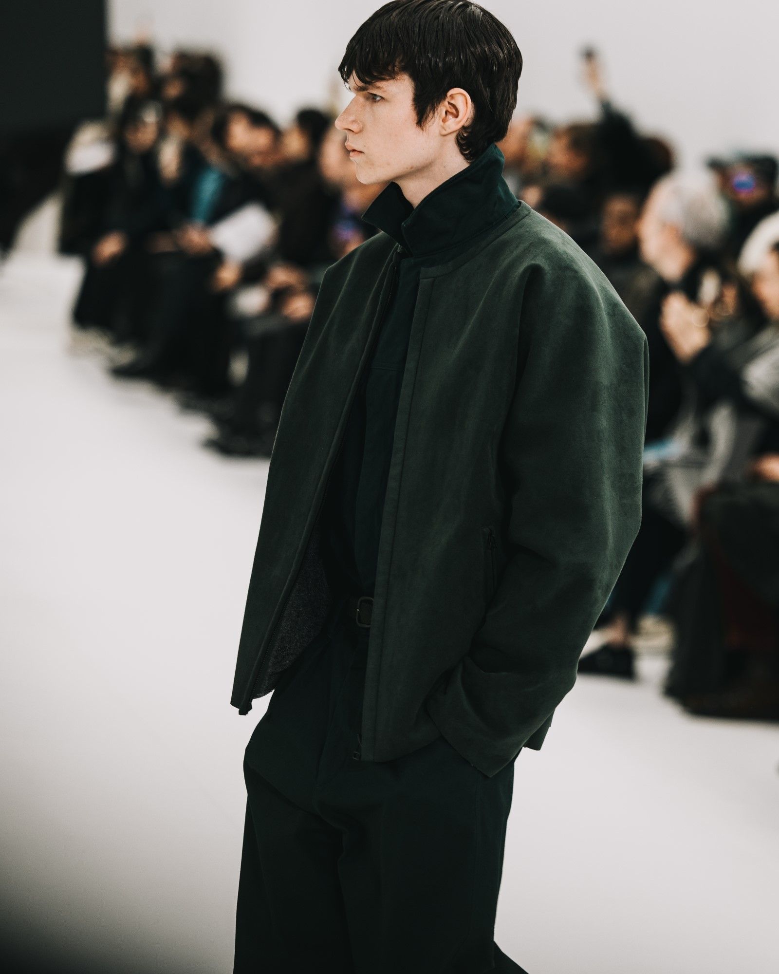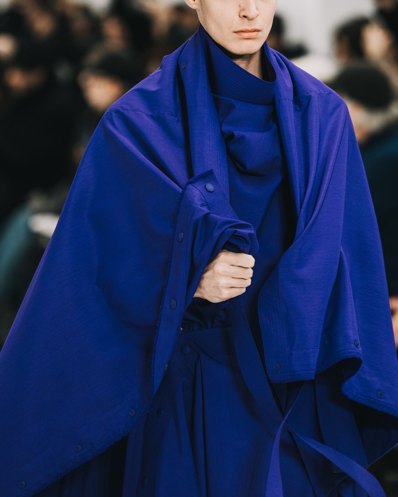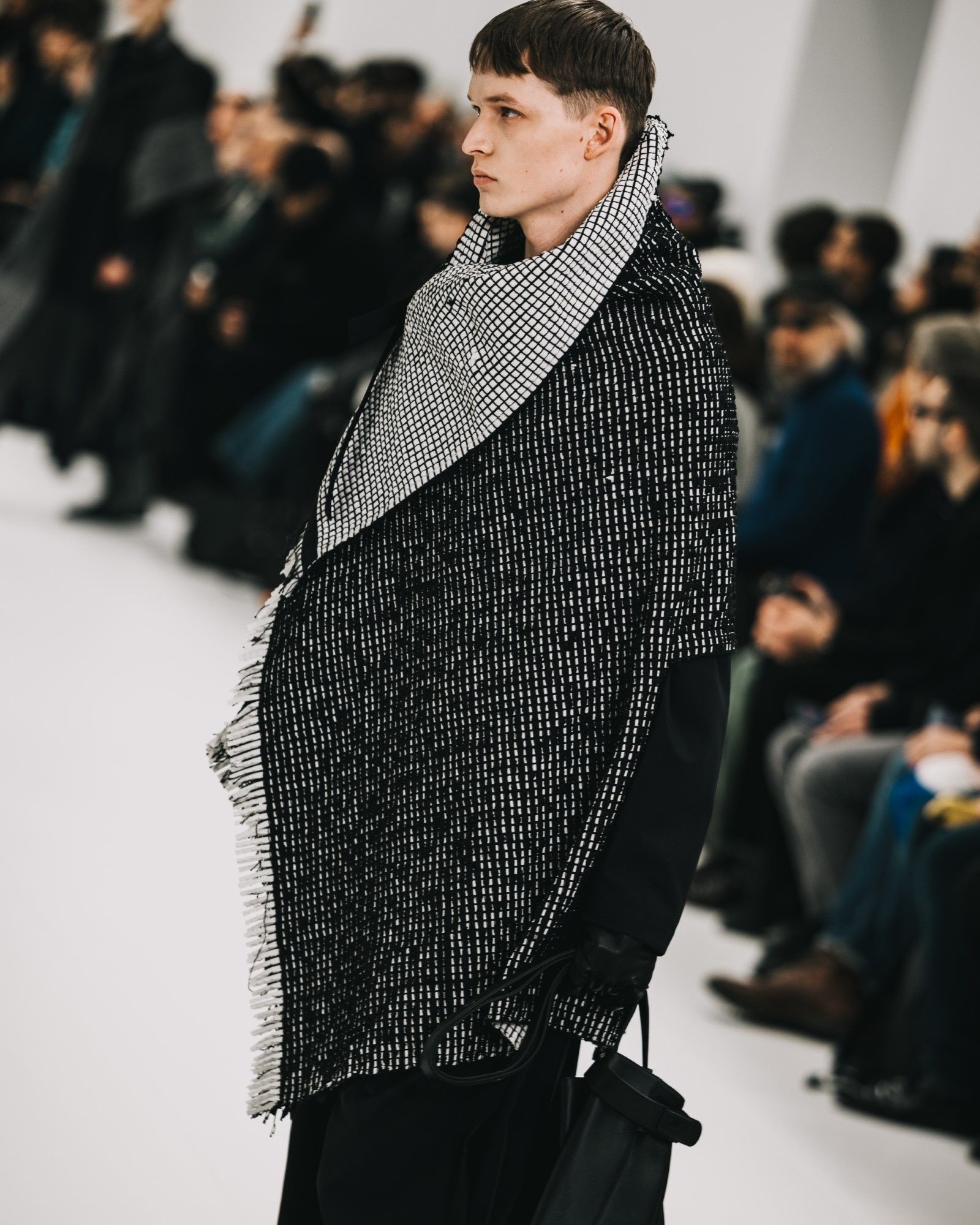 Era comunque inevitabile che tra le due presentazioni, la nuova di IM MEN, e quella classica di Homme Plissé Issey Miyake si facesse un confronto. Posto che la filosofia che anima il brand con le sue diverse diramazioni possiede una propria inconfutabile unità, il nuovo IM MEN appare sicuramente più strutturato rispetto a Homme Plissé Issey Miyake, nelle cui presentazioni il menswear manteneva sì una propria concretezza ma con un estro più rarefatto. La nuova linea invece pur «volando verso l’alto con leggerezza» presenta un design più risoluto e concreto, anche se altrettanto ingegnoso. I volumi sono certamente più pieni e scultorei, mentre risulta molto affascinante il tipo di layering che è stato messo in atto, la cui architettura complessa si è potuta vedere meglio nei primi look total white apparsi in passerella. Elementi di continuità invece sono stati il gusto per un drappeggio articolato e quasi astratto, sempre molto evocativo, e ovviamente lo stupendo uso di colori semplici ma ricchissimi. Altro punto interessante è stata invece la varietà di texture presentate, da quelle più solide delle giacche in Ultrasuede a quelle morbide dei capi imbottiti fino alle superfici scintillanti e sintetiche di certi ensemble di giacca e pantalone dal design angoloso e alla densità dei due look bianchi e neri, in cui quella che sembra una coperta viene portata o appoggiata al braccio come un mantello o avvolta intorno al corpo come un capo ibrido a metà fra la stola, la sciarpa e il cappotto. Si capisce insomma, dalla ricchezza della nuova linea, come mai il brand abbia deciso di sostituire la classica e sempre bellissima presentazione di Homme Plissé Issey Miyake con questa di IM MAN, sicuramente meritevole di una posizione di grande rilievo nel vasto panorama di cui si compone il mondo creato da Issey Miyake.