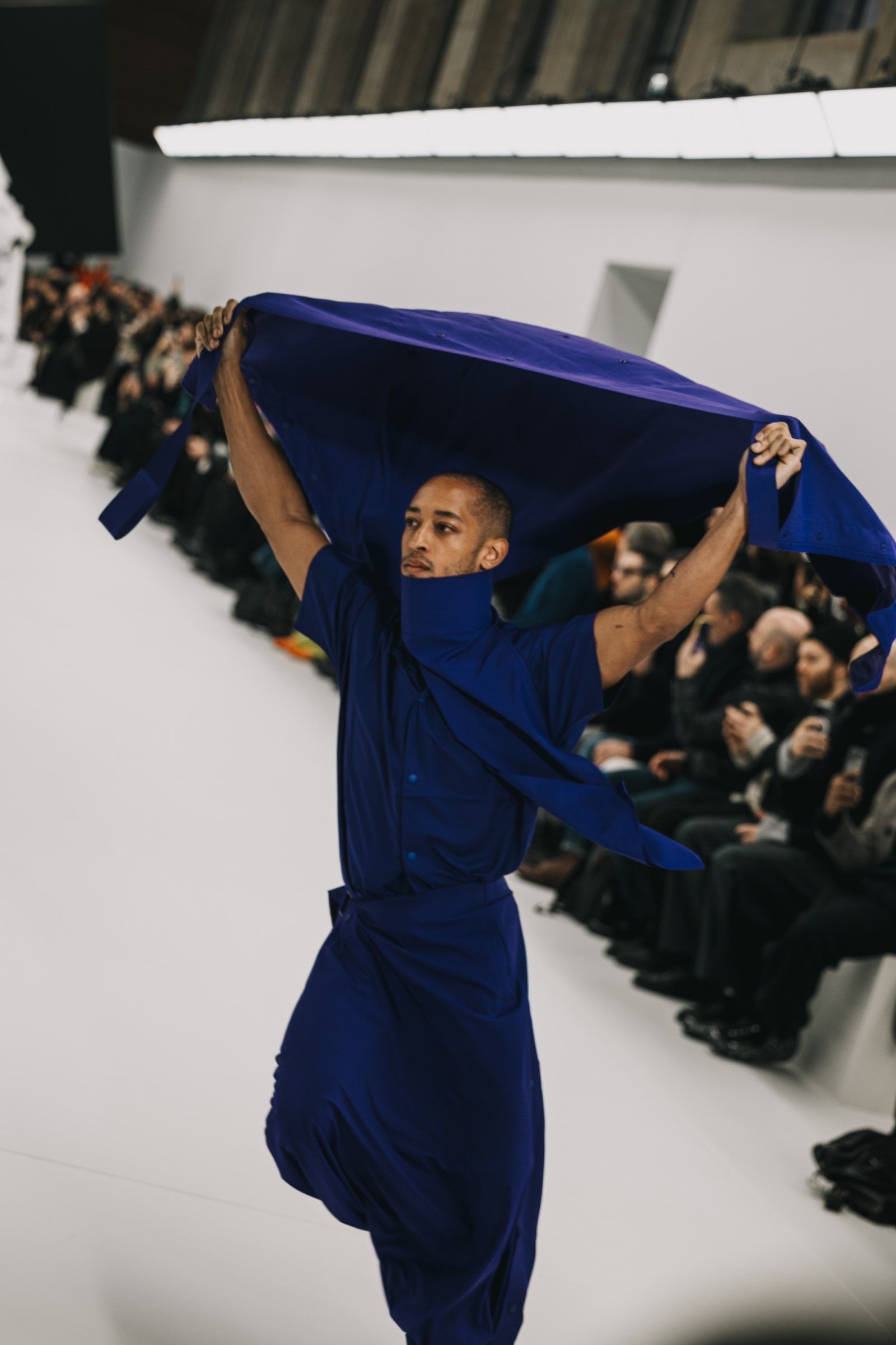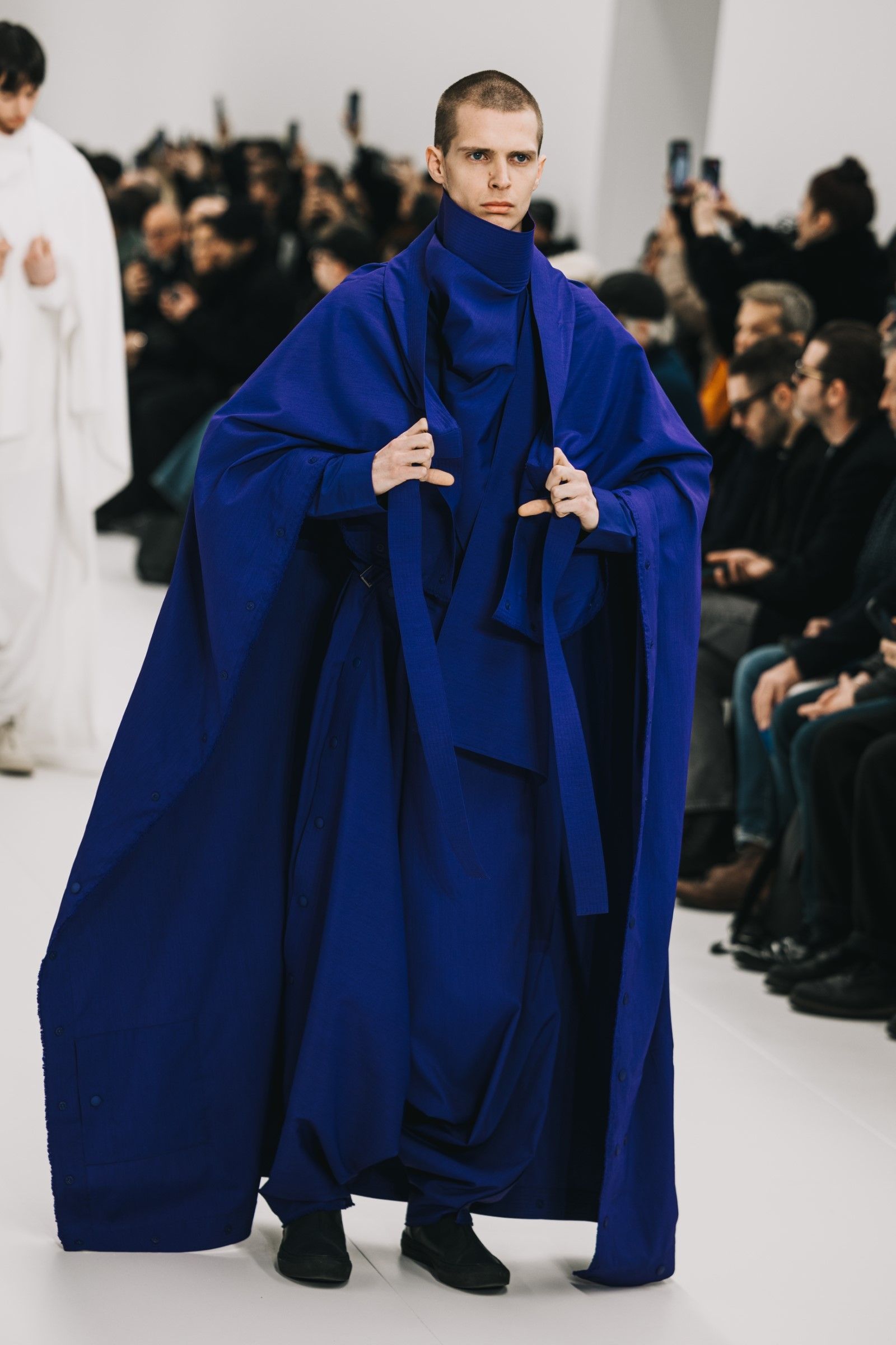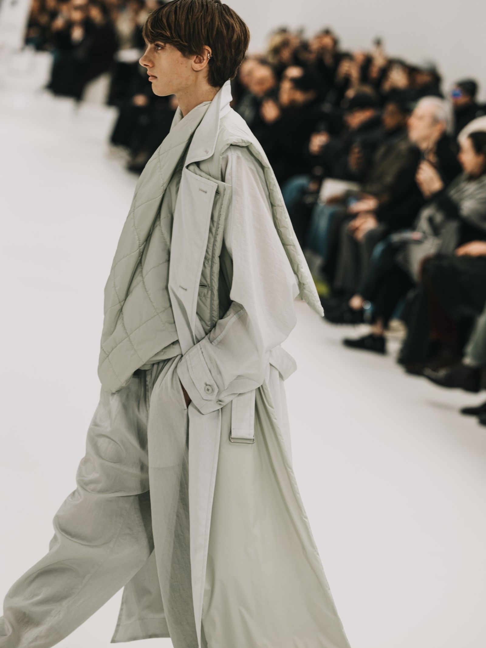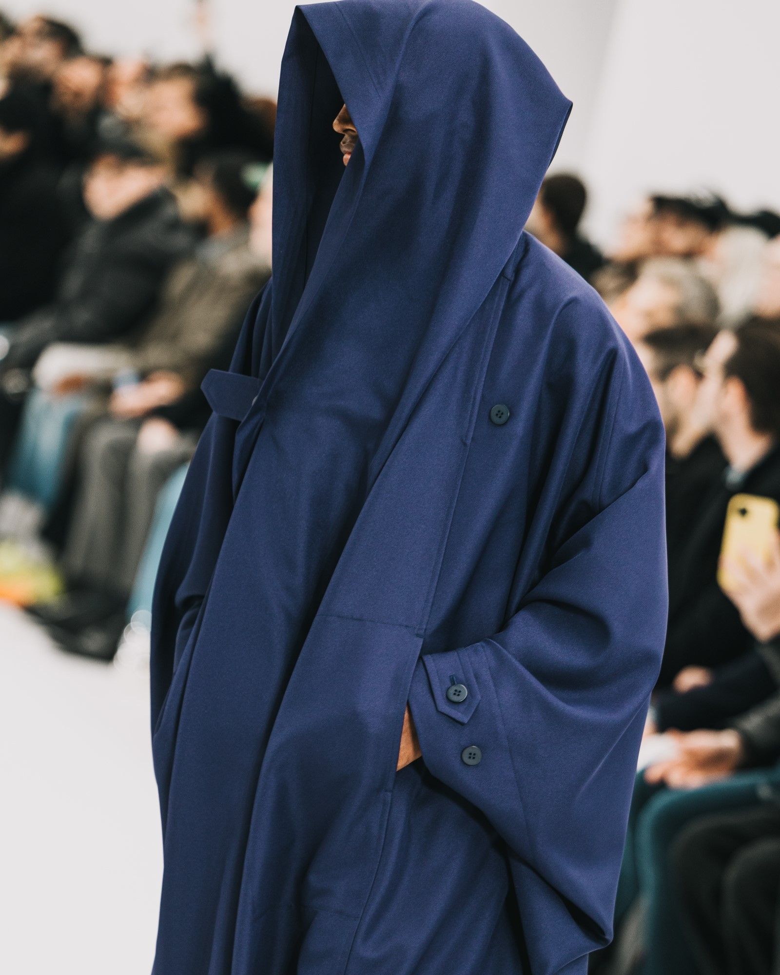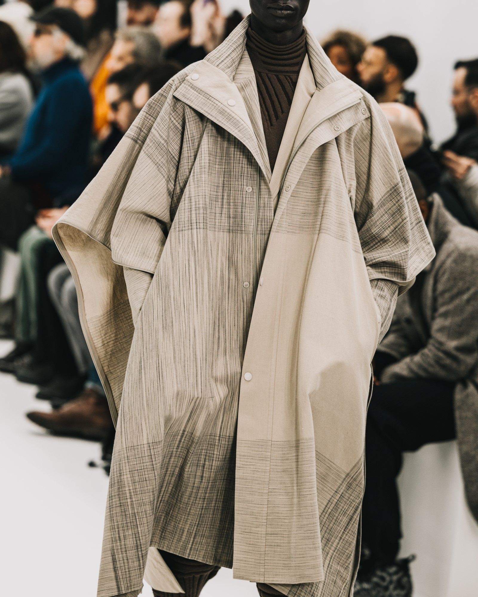 Era comunque inevitabile che tra le due presentazioni, la nuova di IM MEN, e quella classica di Homme Plissé Issey Miyake si facesse un confronto. Posto che la filosofia che anima il brand con le sue diverse diramazioni possiede una propria inconfutabile unità, il nuovo IM MEN appare sicuramente più strutturato rispetto a Homme Plissé Issey Miyake, nelle cui presentazioni il menswear manteneva sì una propria concretezza ma con un estro più rarefatto. La nuova linea invece pur «volando verso l’alto con leggerezza» presenta un design più risoluto e concreto, anche se altrettanto ingegnoso. I volumi sono certamente più pieni e scultorei, mentre risulta molto affascinante il tipo di layering che è stato messo in atto, la cui architettura complessa si è potuta vedere meglio nei primi look total white apparsi in passerella. Elementi di continuità invece sono stati il gusto per un drappeggio articolato e quasi astratto, sempre molto evocativo, e ovviamente lo stupendo uso di colori semplici ma ricchissimi. Altro punto interessante è stata invece la varietà di texture presentate, da quelle più solide delle giacche in Ultrasuede a quelle morbide dei capi imbottiti fino alle superfici scintillanti e sintetiche di certi ensemble di giacca e pantalone dal design angoloso e alla densità dei due look bianchi e neri, in cui quella che sembra una coperta viene portata o appoggiata al braccio come un mantello o avvolta intorno al corpo come un capo ibrido a metà fra la stola, la sciarpa e il cappotto. Si capisce insomma, dalla ricchezza della nuova linea, come mai il brand abbia deciso di sostituire la classica e sempre bellissima presentazione di Homme Plissé Issey Miyake con questa di IM MAN, sicuramente meritevole di una posizione di grande rilievo nel vasto panorama di cui si compone il mondo creato da Issey Miyake.
