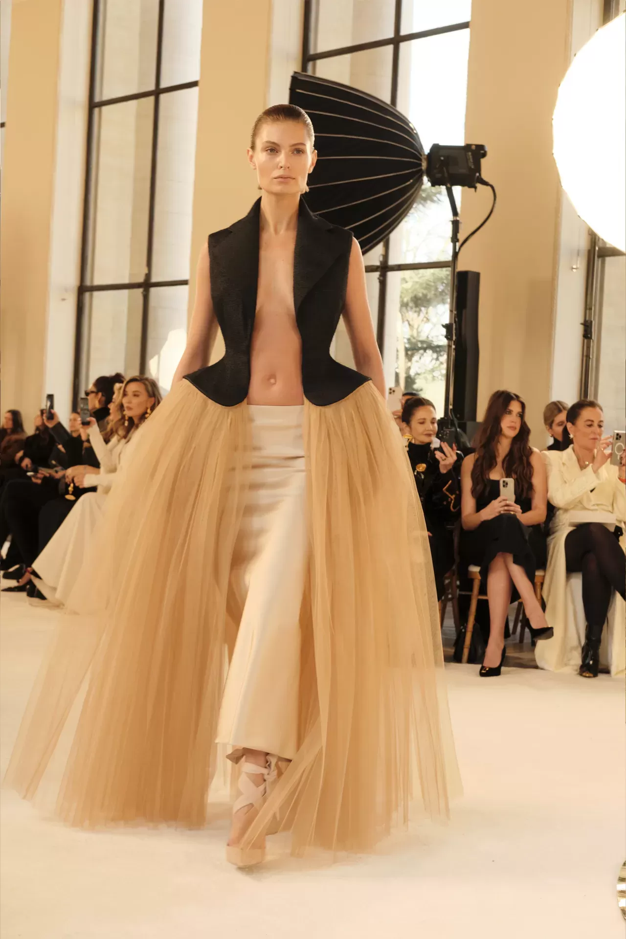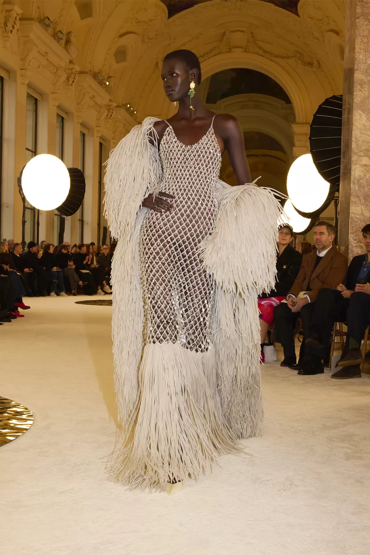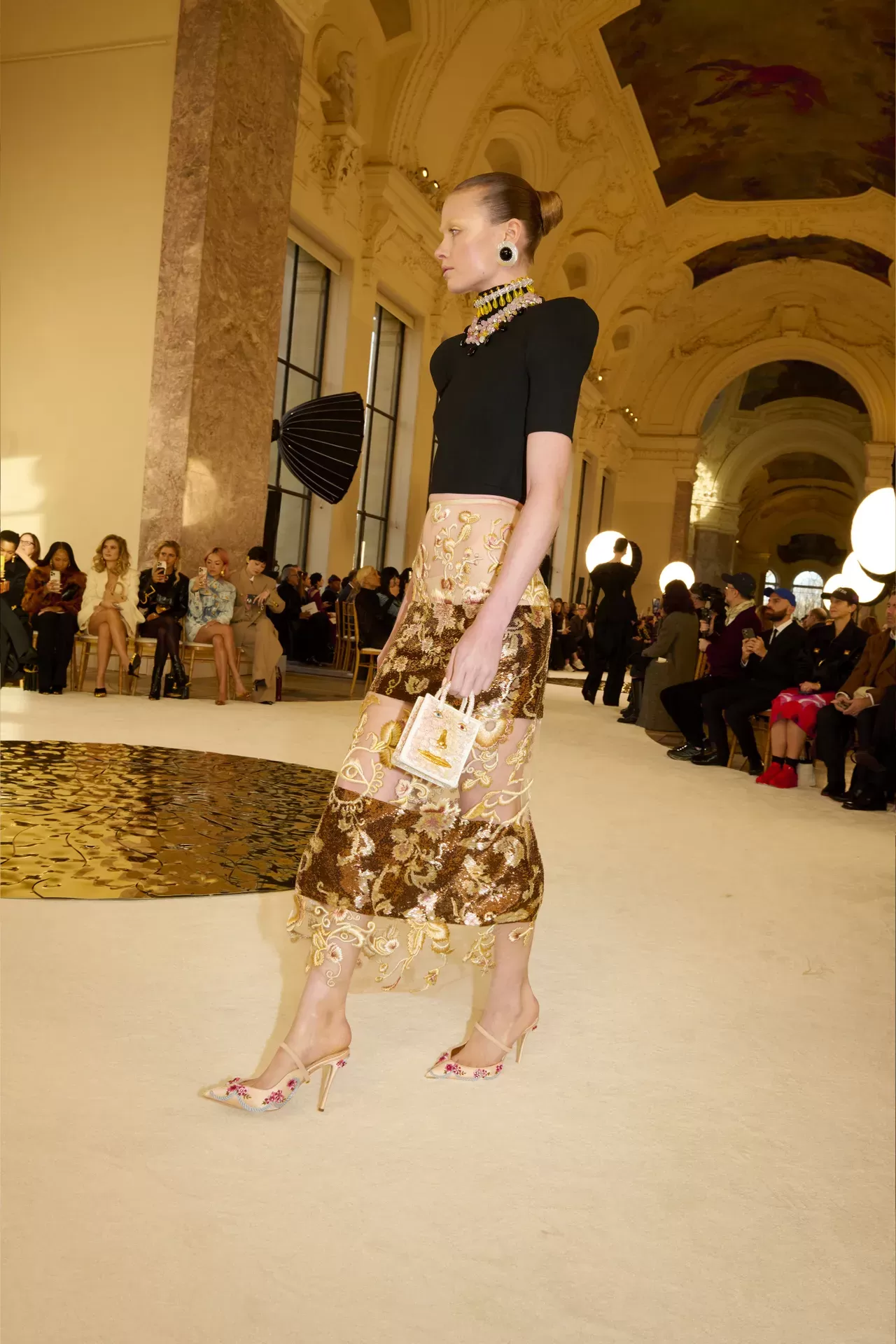 Dal blazer Schiap, uno dei grandi classici della Maison, ricamato con fili di raso di seta, alle piume immerse nella glicerina e spazzolate con la cheratina, passando per i ricami tridimensionali arricchiti con migliaia di gocce di quarzo fumé, la Maison ha portato la Couture a un livello ancora superiore. «Negli atelier - spiega Daniel Roseberry - abbiamo perfezionato la tecnica per costruire corsetti in toile, rivestendoli di strati sottili di lana e cotone, sopra i quali viene teso raso di seta elastico, creando un effetto impeccabile. Ogni look è stato curato con la massima attenzione, come se fosse una piccola opera d’arte, incluse scarpe e borse, trattate come gioielli e decorate con tecniche artigianali, dal cordoncino Matador alle rosette in resina».