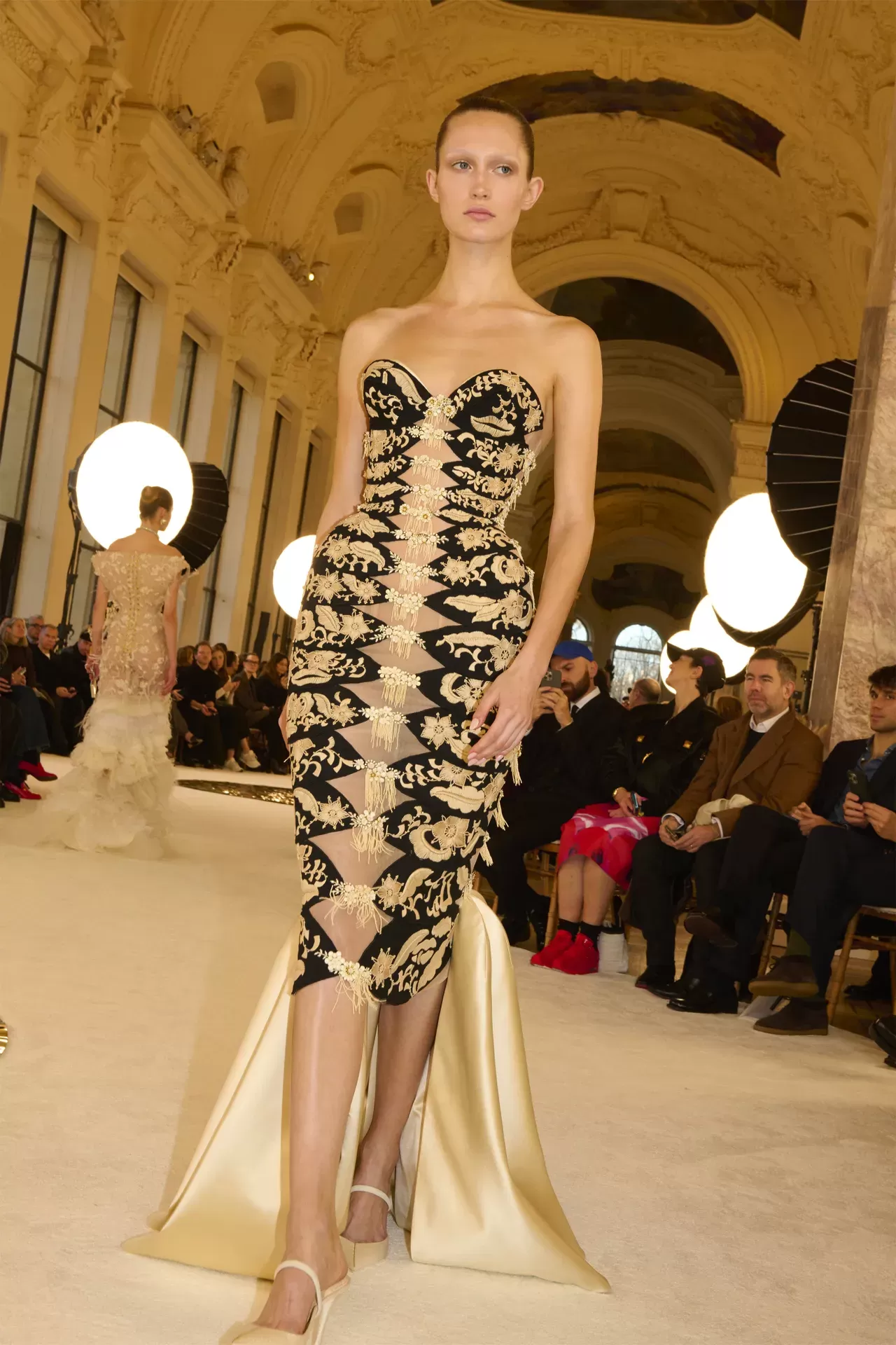 Se Icaro incarna un eroe tragico con un destino abbreviato da un orgoglio smisurato e una disobbedienza che gli sarà fatale, la collezione Couture Spring 2025 di Schiaparelli, intitolata Icarus, non ha nulla di funesto o straziante, anzi tutt'altro. Orgogliosa sì, smisurata certamente, ma cupa e sinistra per niente. Presentata ieri, la collezione realizzata da Daniel Roseberry ha aperto le danze di questa settimana dell'Alta Moda di Parigi, con trentatrè look che incarnano ciascuno a modo proprio l'opulence, la ricchezza e l'eleganza del XX secolo riportando in auge un barocco tinto di modernità. La collezione trova ispirazione nei nastri degli anni '20 e '30 trovati per caso dal direttore creativo in un negozio di antiquariato. Si tratta di nastri antichi, nascosti e dimenticati dalla storia con l'arrivo dell'occupazione tedesca in Francia.