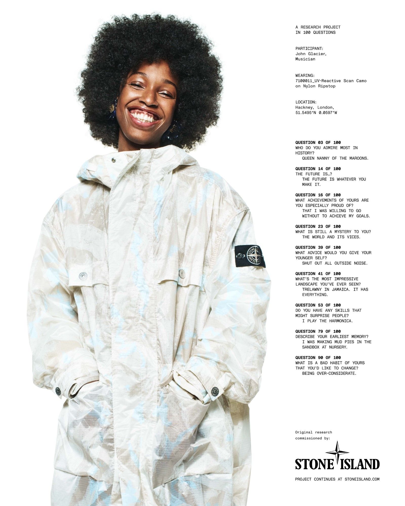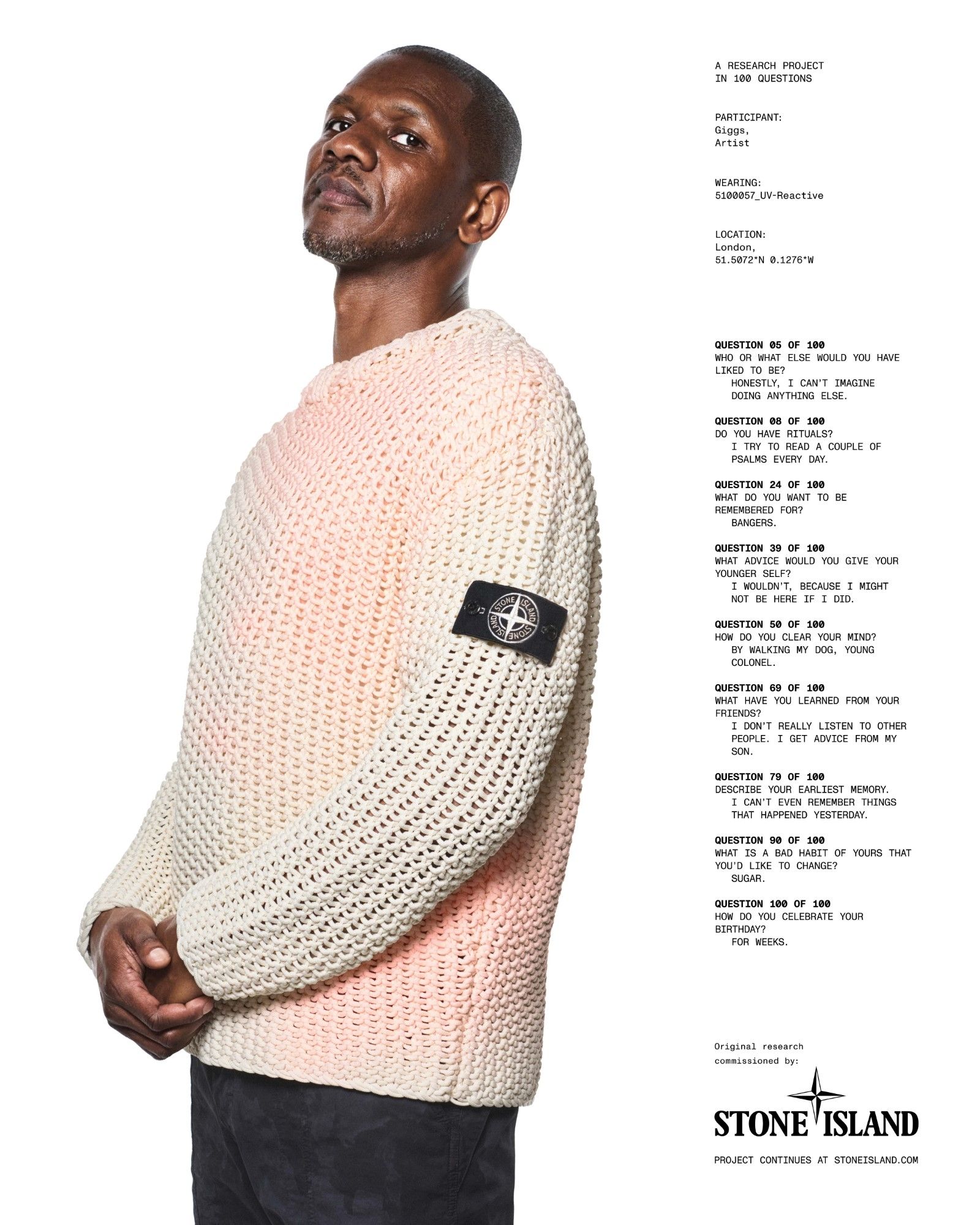 Non solo figure del mondo dello spettacolo e dello sport, ma anche personaggi provenienti da altri settori che contribuiscono a comporre il mosaico variegato della community Stone Island. Tra questi ci sono Avi Gold, fondatore del negozio di design e cultura Better Gift Shop, il cestista Jalen Green, l’attore Ethan Ruan, e il wide receiver dei New York Jets Garrett Wilson. In aggiunta, troviamo la chef Ruth Rogers e il musicista Gene Gallagher, figure che rappresentano perfettamente il dinamismo e la poliedricità del marchio.La campagna si distingue anche per la scelta artistica, che punta sulla semplicità visiva e sul forte impatto del ritratto. Le foto, firmate dal celebre fotografo David Sims, sono scattate su uno sfondo bianco, che permette ai protagonisti di emergere in modo netto, mettendo in risalto sia le loro personalità che i capi indossati, simbolo dell’eccellenza sartoriale e dell’innovazione dei materiali che contraddistinguono la collezione. L’aspetto visivo è accompagnato da una serie di domande provocatorie pensate dal direttore artistico Hans Ulrich Obrist, noto per il suo approccio concettuale e per il suo lavoro alla Serpentine Gallery di Londra. Le domande non solo stimolano la riflessione sul processo creativo e l’evoluzione delle tendenze, ma anche sul significato che la comunità e la collaborazione rivestono nell’era contemporanea.