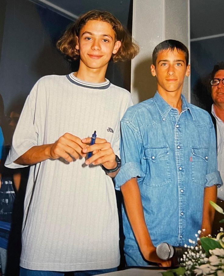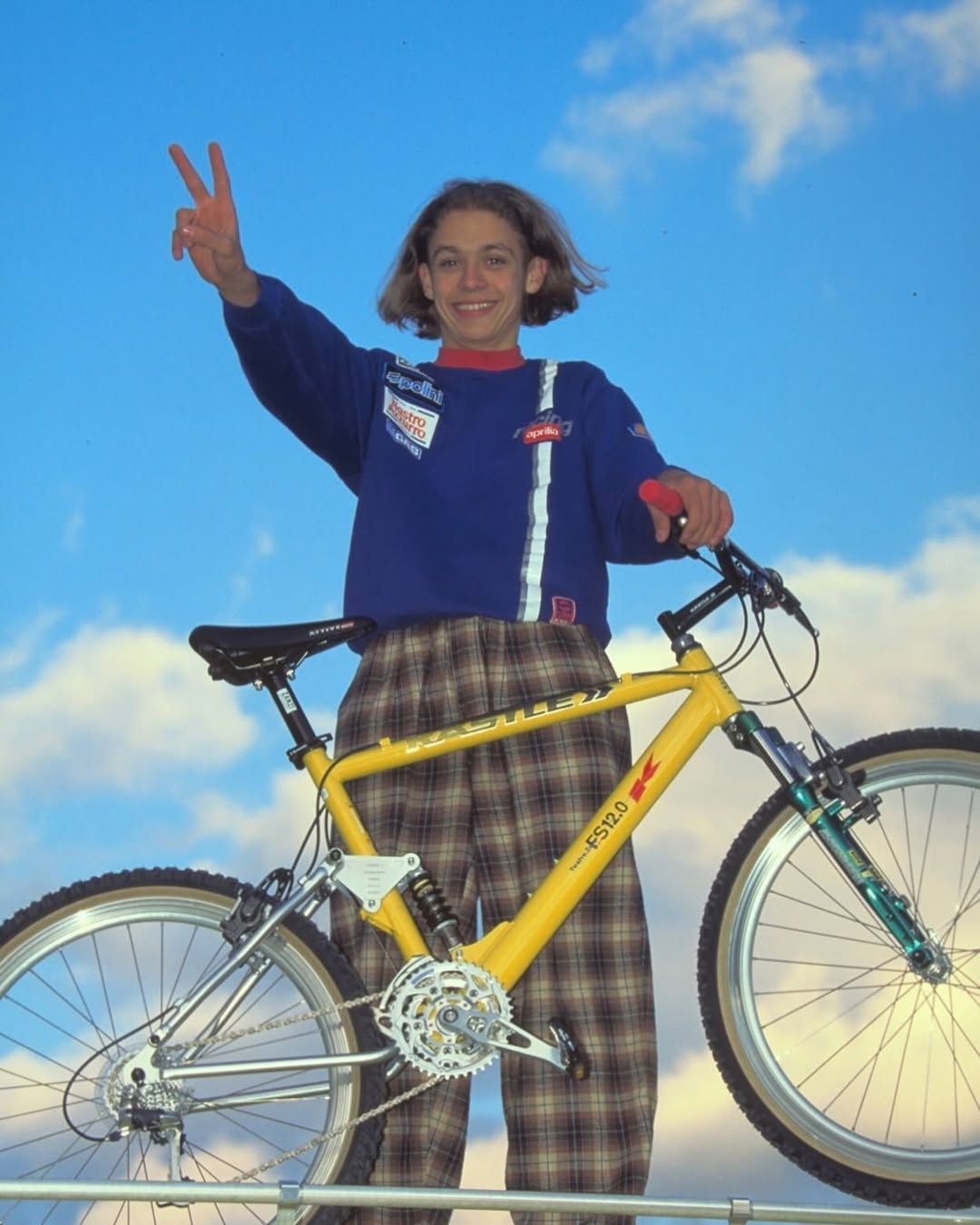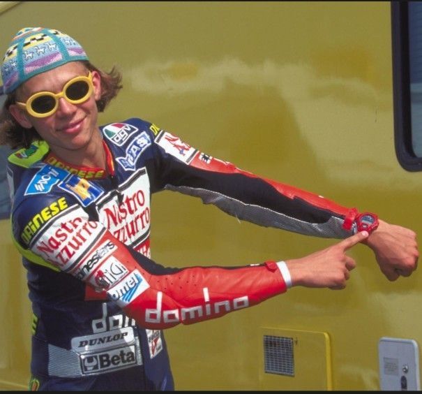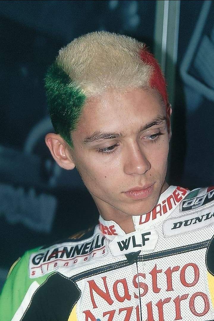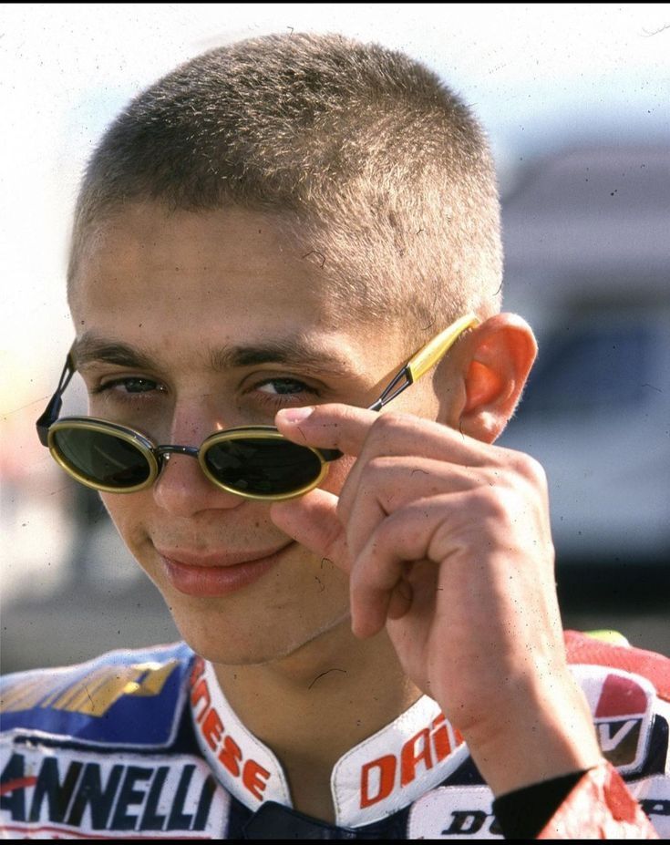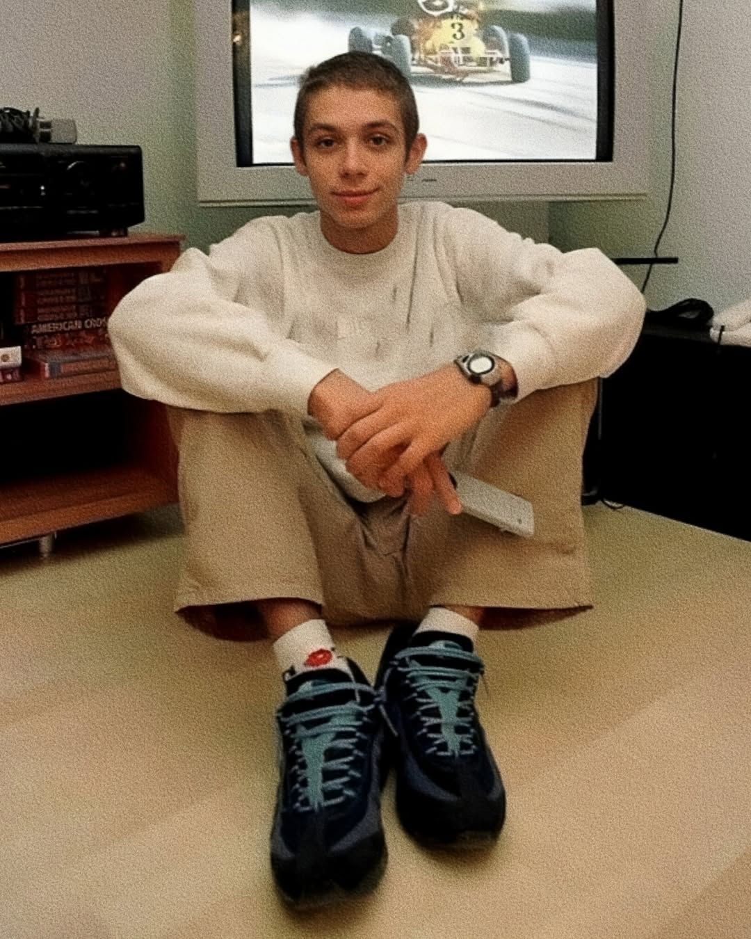 Come tutti i ragazzi cresciuti negli anni ’90 (Valentino Rossi è nato il 16 febbraio 1979), lo stile del Dottore seguiva la moda sportiva all'avanguardia dell’epoca, sebbene con una marcia in più. Al polso portava orologi G-Shock in tutti i colori, un grande classico dell’era della rivoluzione digitale; sul viso occhiali da sole sportivi in total black o argento della Oakley. Da piccolo poi, tantissime t-shirt oversize con le stampe dei Looney Tunes (del resto, il cult Space Jam con Michael Jordan e Bugs Bunny è uscito nel 1996) e scritte graffiti-style, tra cui la più significativa, “No Fear”. Sotto il casco, i capelli del giovane Valentino Rossi erano ribelli come lui, biondi e lunghissimi oppure rasati e tinti di tutti i colori, dal verde brillante al platino, passando per lo split-dye bianco e nero. Da vero fan dello streetwear, nell’armadio del Dottore c’era una collezione vastissima di Nike Air Max 95 ma anche Air Jordan 1 Retro High, Vans, Converse All Stars e Oakley Flesh Sandal.