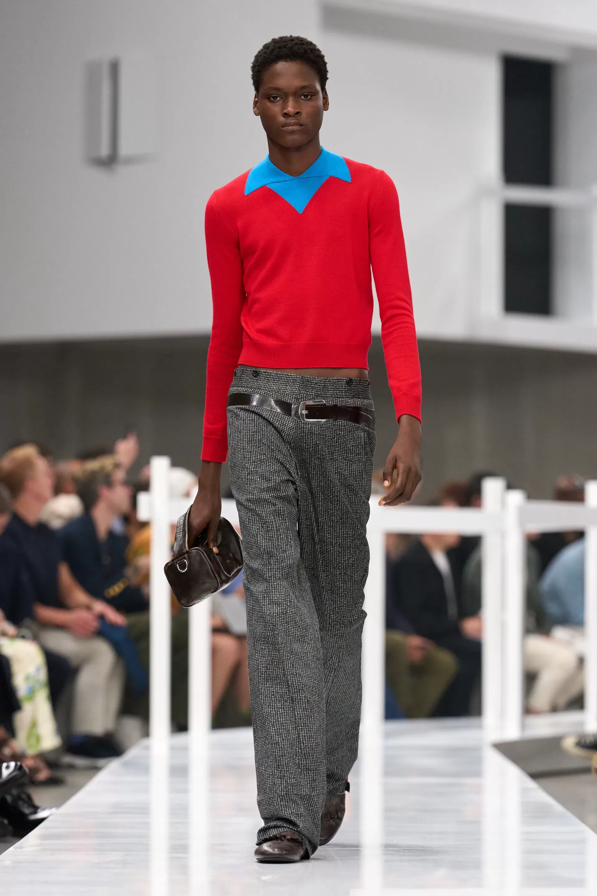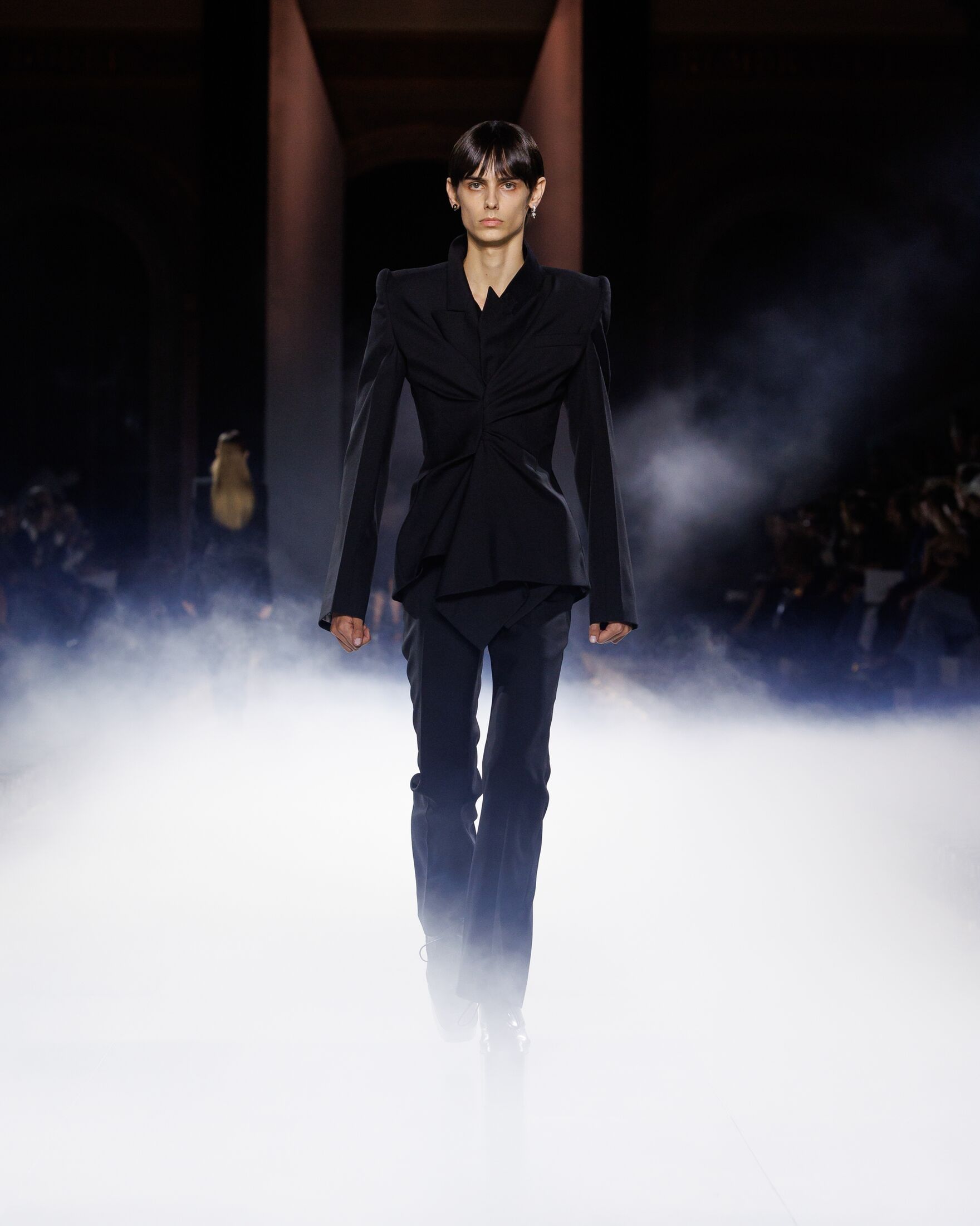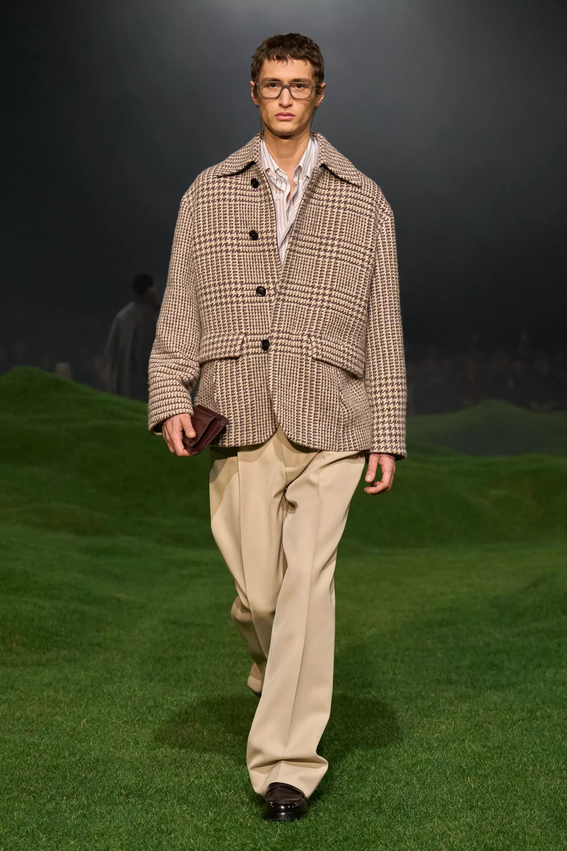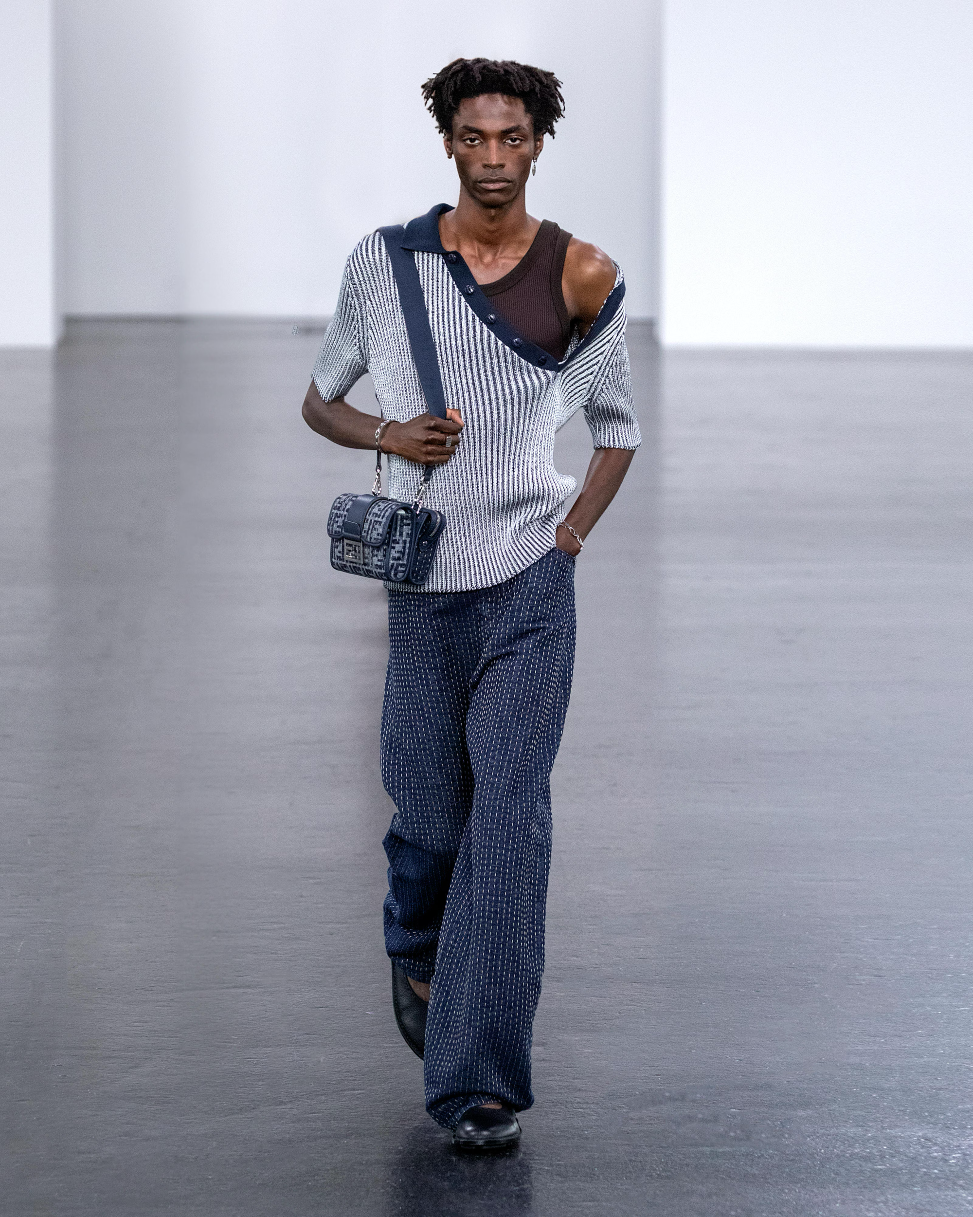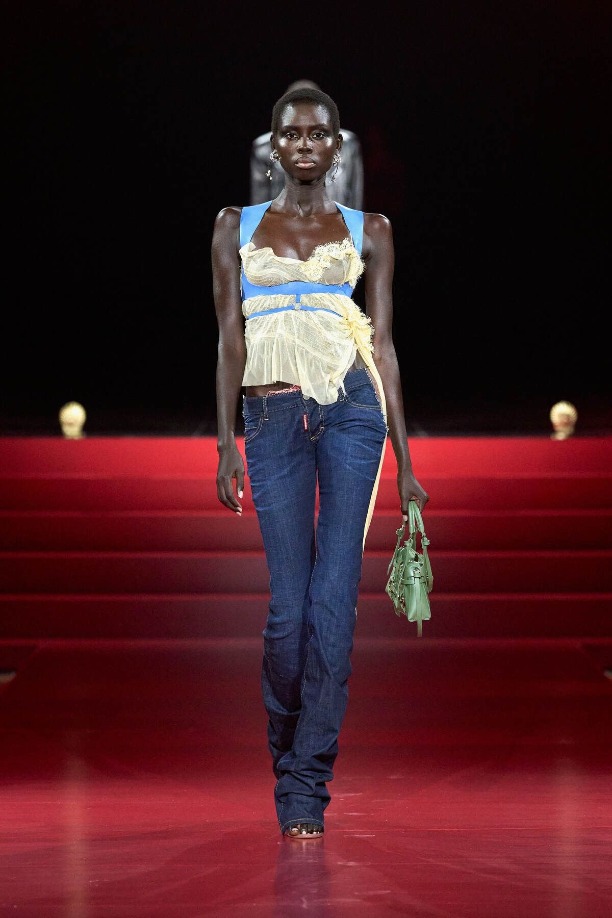 Sebbene non fossero riservati esclusivamente alle passerelle maschili, il taglio bootcut ha trovato terreno fertile in entrambe le fashion season del 2025. A settembre, infatti, Prada, Louis Vuitton di Pharrell e Fendi li avevano già reinterpretati in chiave più rilassata, con una silhouette vicina al baggy ma comunque caratterizzata da una forte influenza anni ’70: Prada li aveva abbinati a un maglioncino attillato e cropped; Fendi, invece, si era ispirato allo stile svasato californiano dell’epoca, con un ensemble interamente in cotone morbido che cadeva dalla spalla, lasciando spazio a una canottiera “wife lover”; i look di Vuitton, infine, richiamavano i completi a vita alta, spesso abbinati a doppiopetti o giacche con colletti. Per quanto riguarda la donna, durante la MFW dello scorso settembre sono stati soprattutto Versace e DSQUARED2 a riprendere la silhouette del bootcut, in due varianti completamente diverse: Versace ha guardato agli anni ’90 (a loro volta ispirati dal decennio precedente), mentre DSQUARED2 ha portato in passerella un look Y2K storicamente accurato, con il suo iconico taglio a campana abbinato a un bustier decostruito. Chi invece si è allontanato totalmente dalle influenze casual, concentrandosi sulla drammaticità e la rigidità delle forme, è stato Sean McGirr da Alexander McQueen che, sempre durante la SS25, ha reso il bootcut parte integrante dei key look sia femminili che maschili. In questo caso, però, la declinazione è più cupa, usata per enfatizzare angoli appuntiti (forse un’anticipazione dell’estetica vampiresca del Nosferatu Winter).