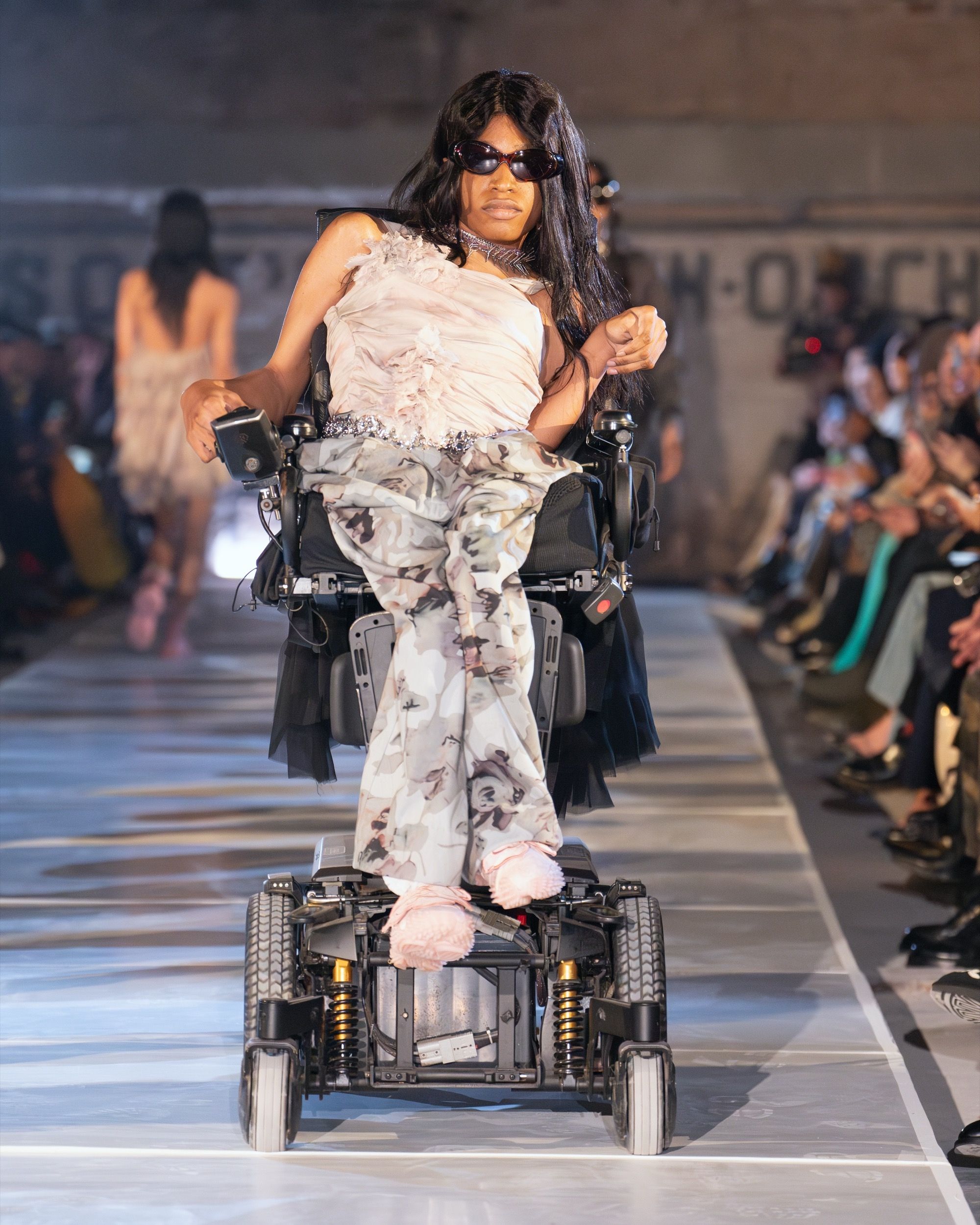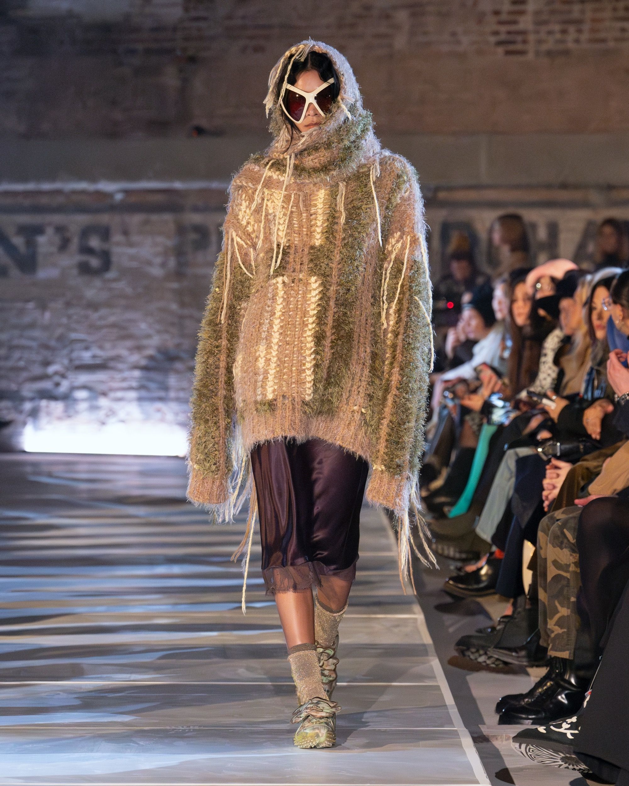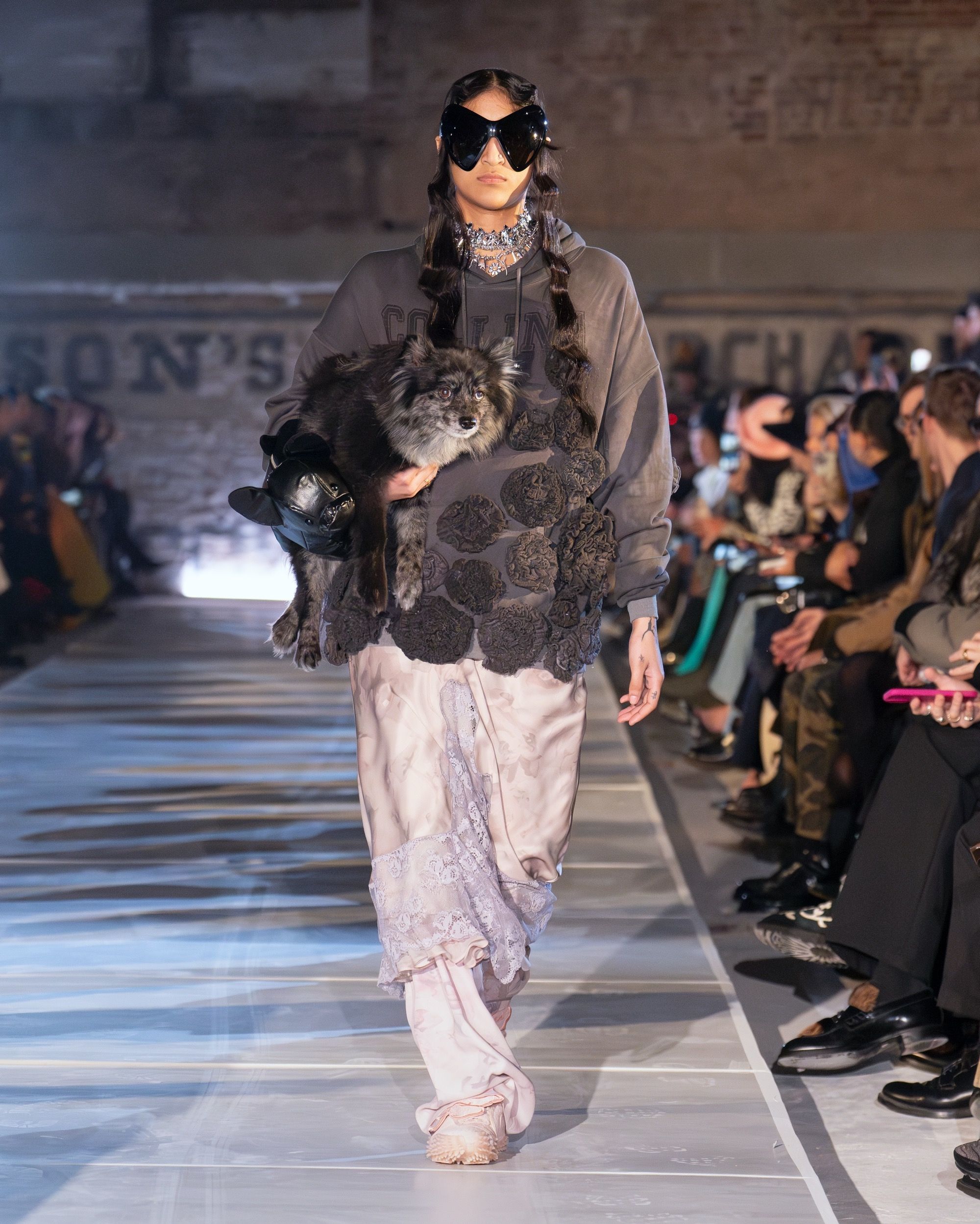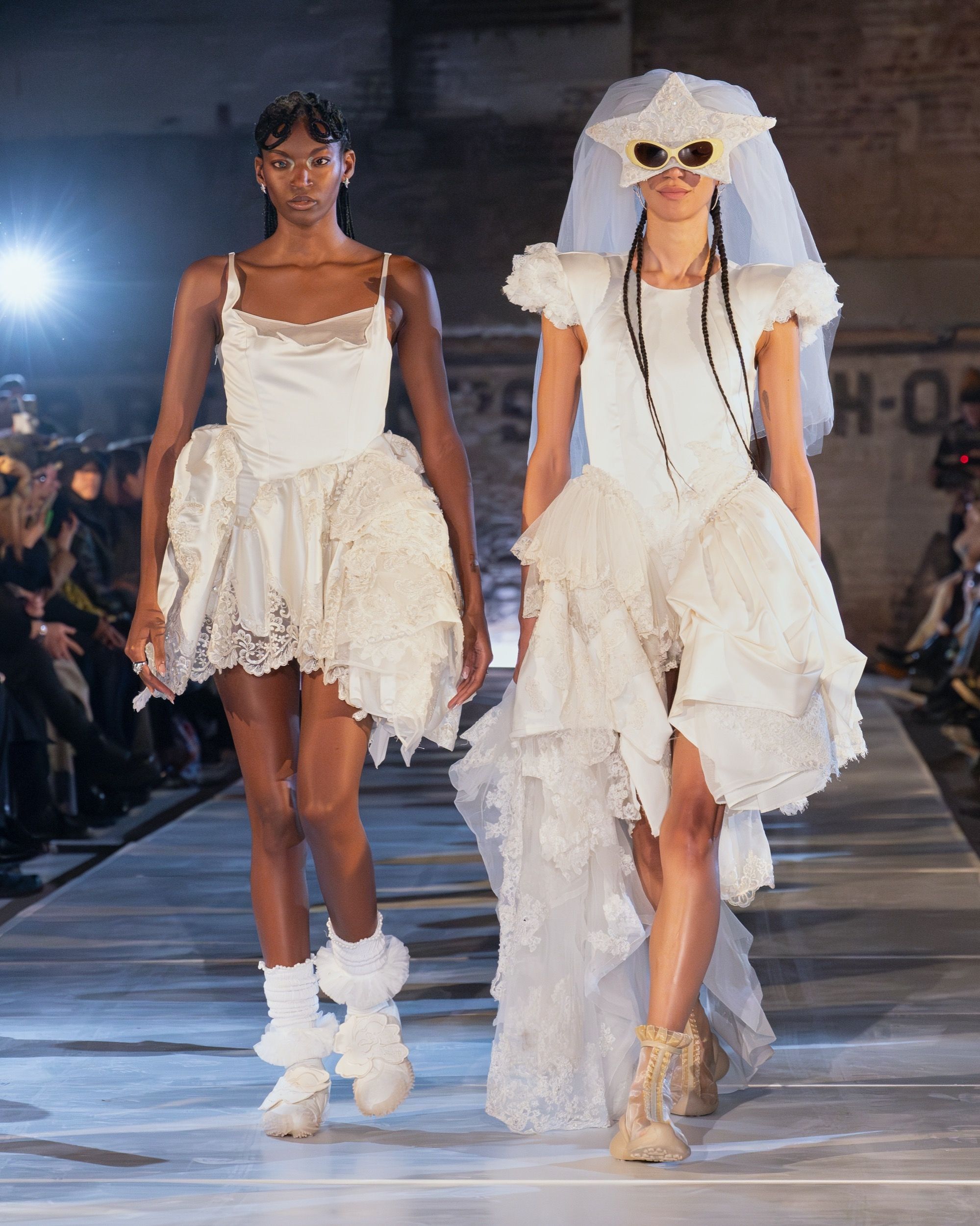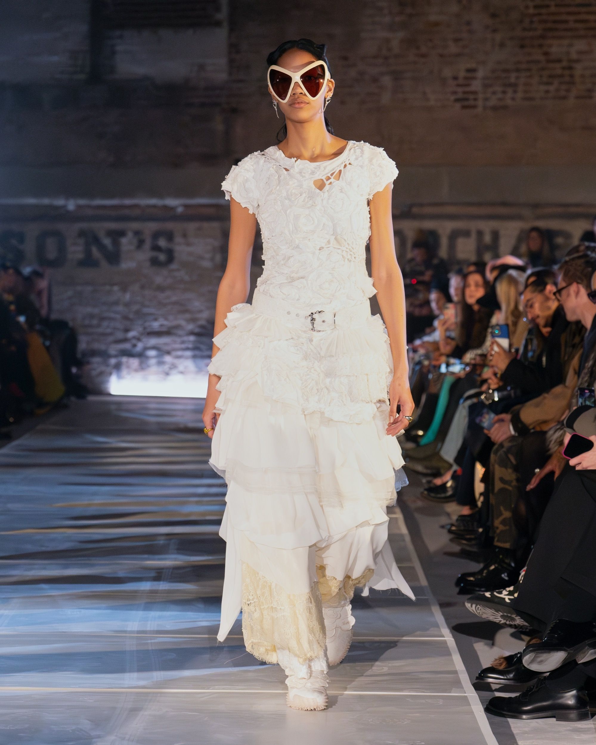 Irriverente, forte e piena di heritage: queste sono le caratteristiche principali tanto della città di New York quanto della FW25 di Collina Strada. Per questa collezione, Hillary Taymour immagina una linea temporale in cui «la femminilità, l’essere queer e le disabilità non sono combattute, ma accettate empaticamente». Tra abiti da sposa trasformati e ripensati e vecchi cappotti doppiopetto, la collezione gioca su un’innumerevole varietà di texture e materiali, dando loro la possibilità di rinascere e trovare nuova vita. Il tutto avvolto in un’estetica punk così fieramente femminile che a tratti ricorda in maniera velata ma celebrativa Vivianne Westwood.