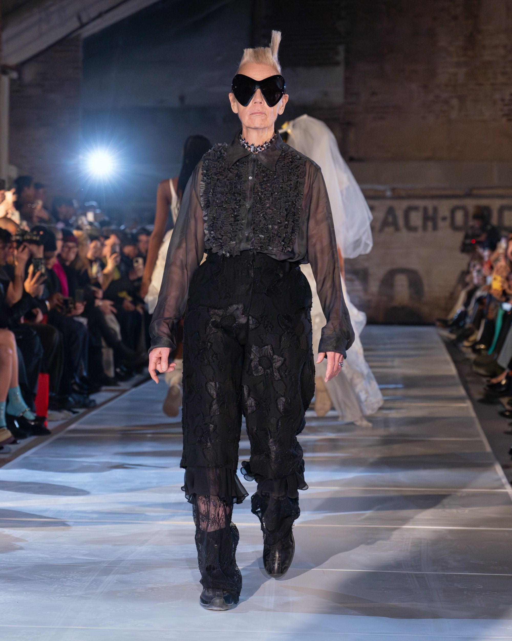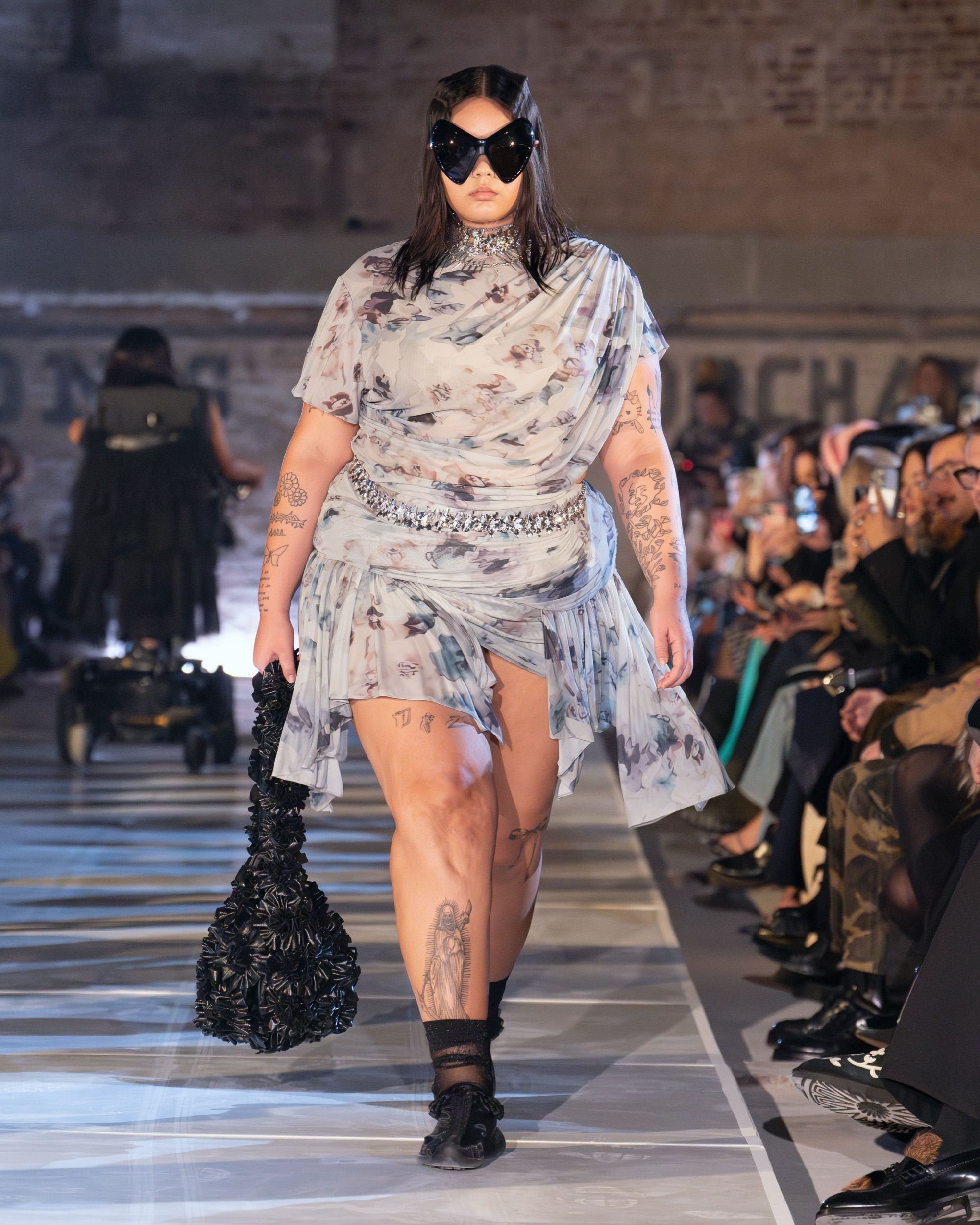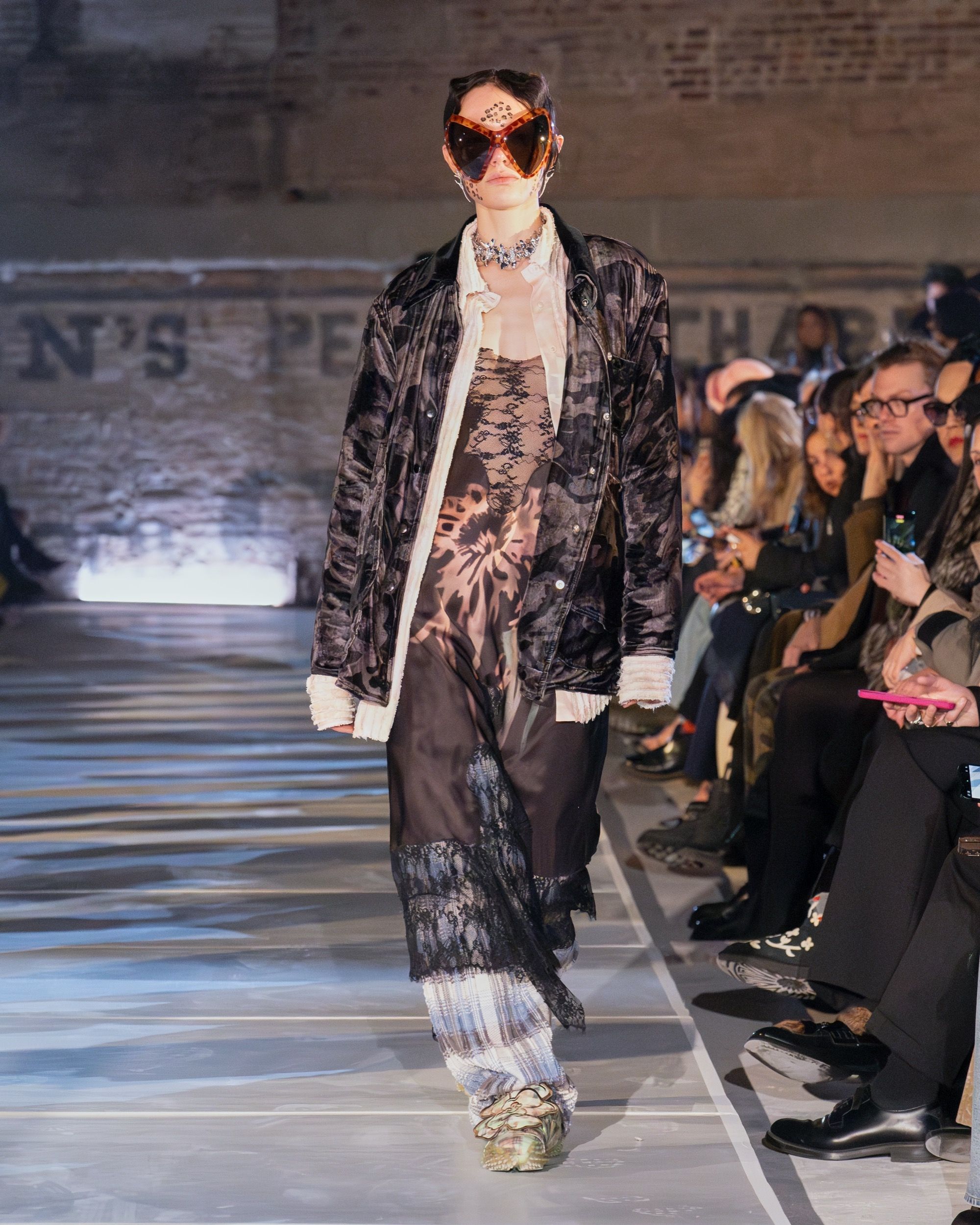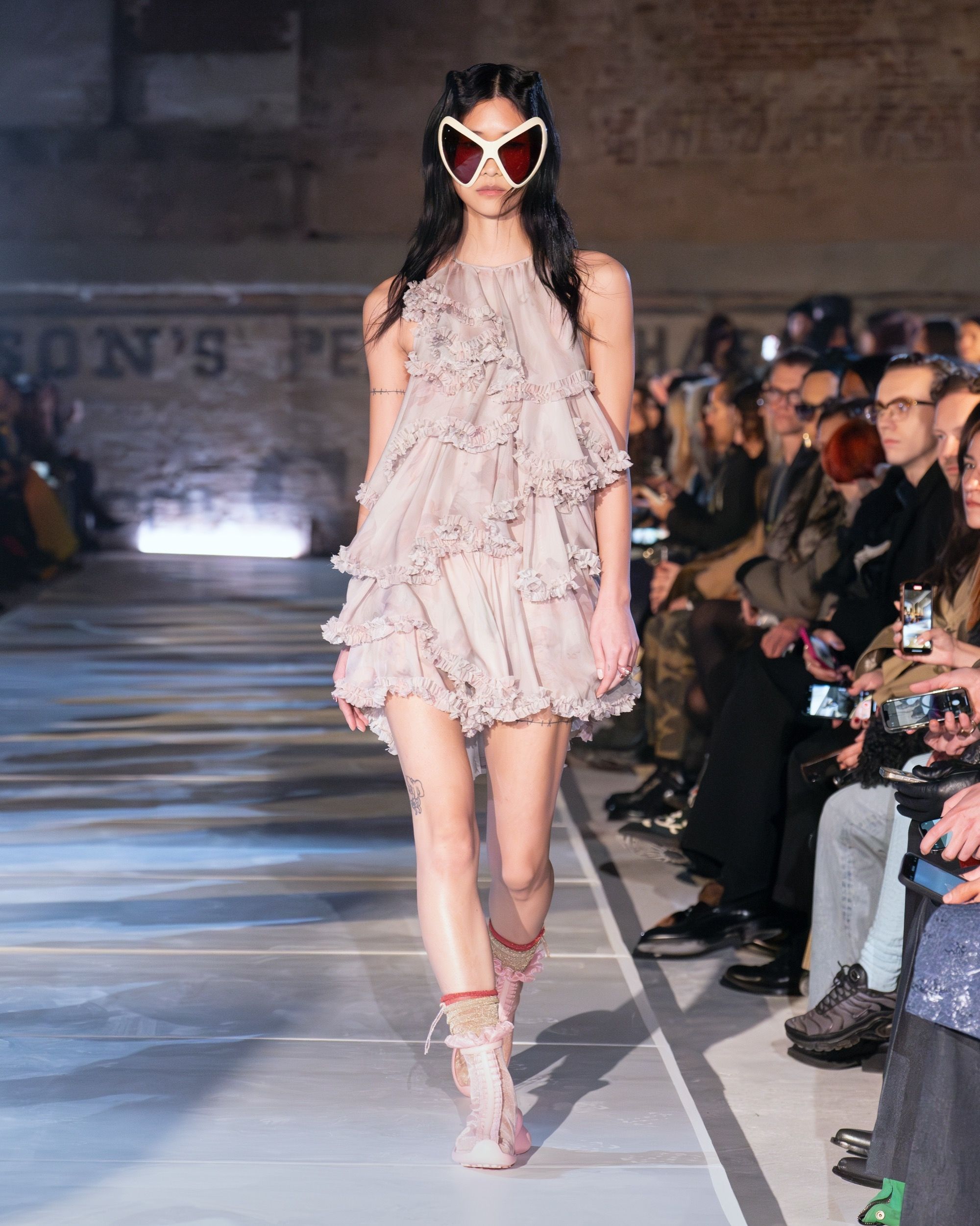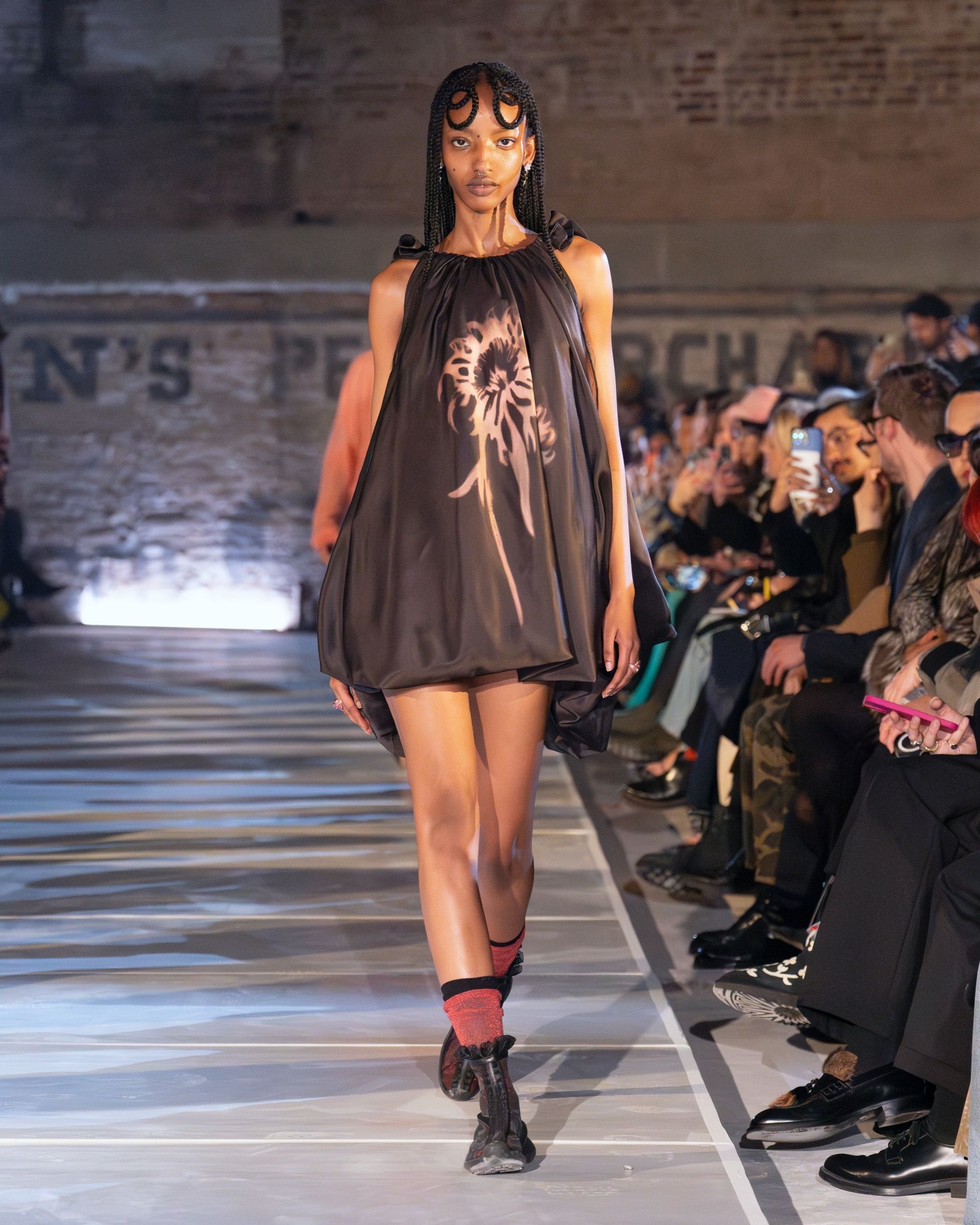 Irriverente, forte e piena di heritage: queste sono le caratteristiche principali tanto della città di New York quanto della FW25 di Collina Strada. Per questa collezione, Hillary Taymour immagina una linea temporale in cui «la femminilità, l’essere queer e le disabilità non sono combattute, ma accettate empaticamente». Tra abiti da sposa trasformati e ripensati e vecchi cappotti doppiopetto, la collezione gioca su un’innumerevole varietà di texture e materiali, dando loro la possibilità di rinascere e trovare nuova vita. Il tutto avvolto in un’estetica punk così fieramente femminile che a tratti ricorda in maniera velata ma celebrativa Vivianne Westwood.