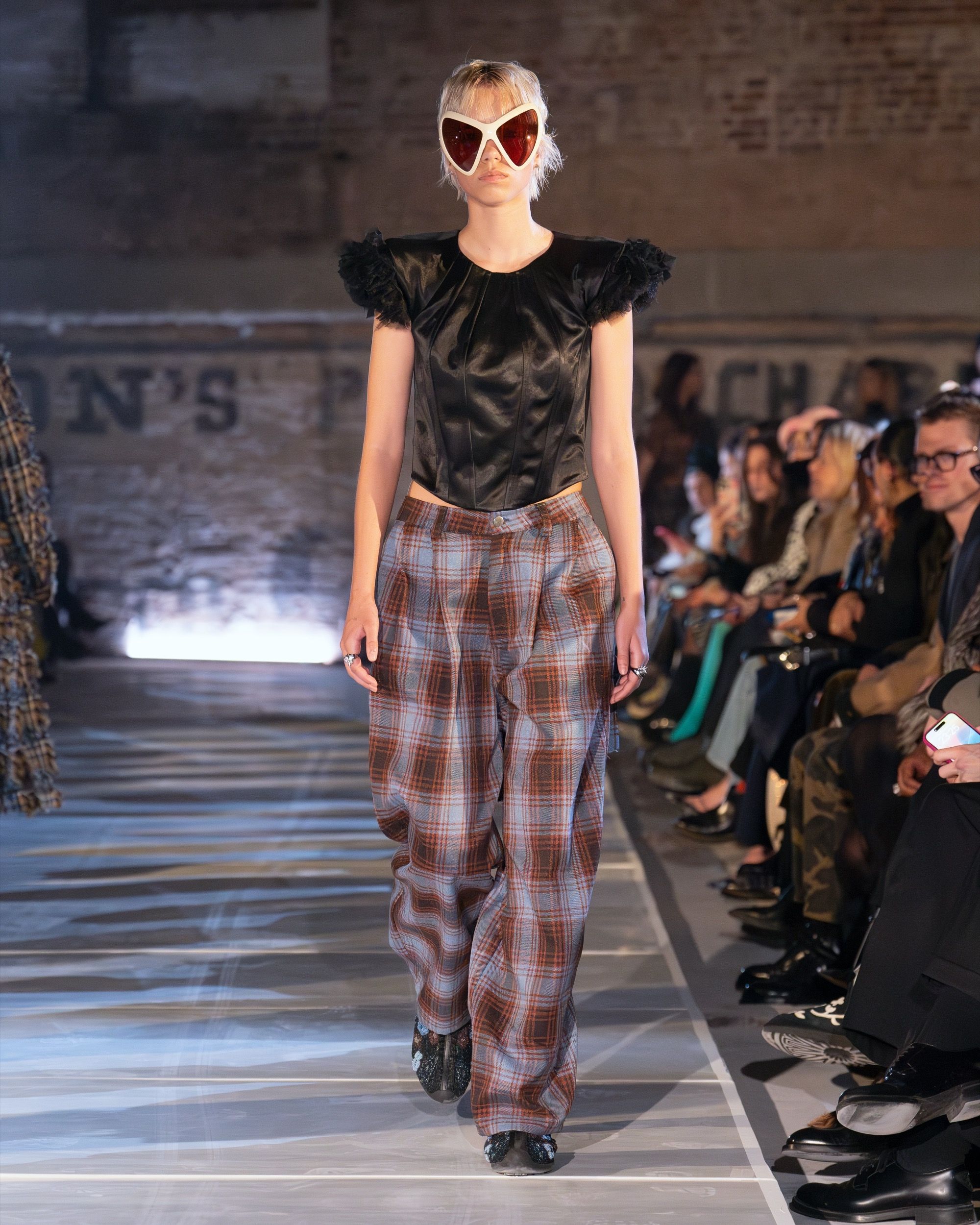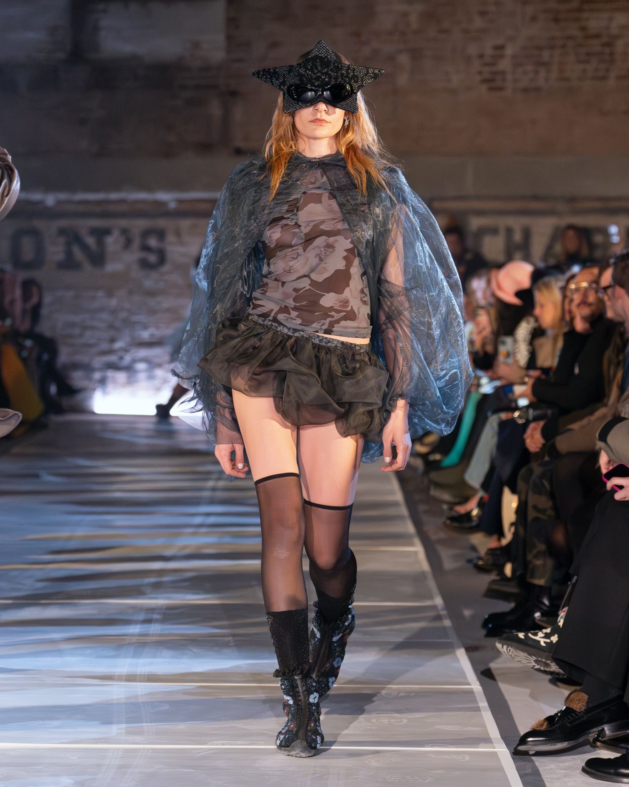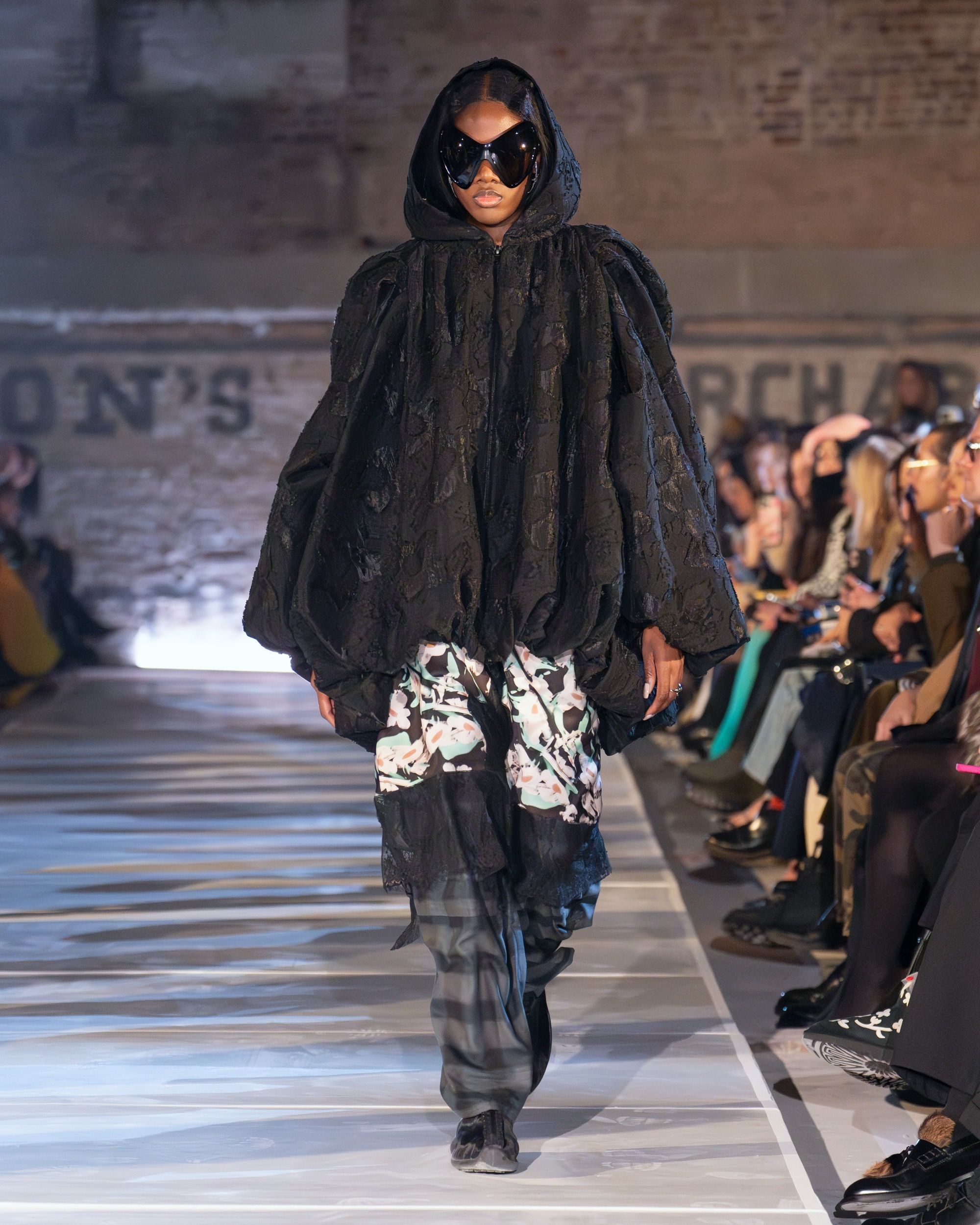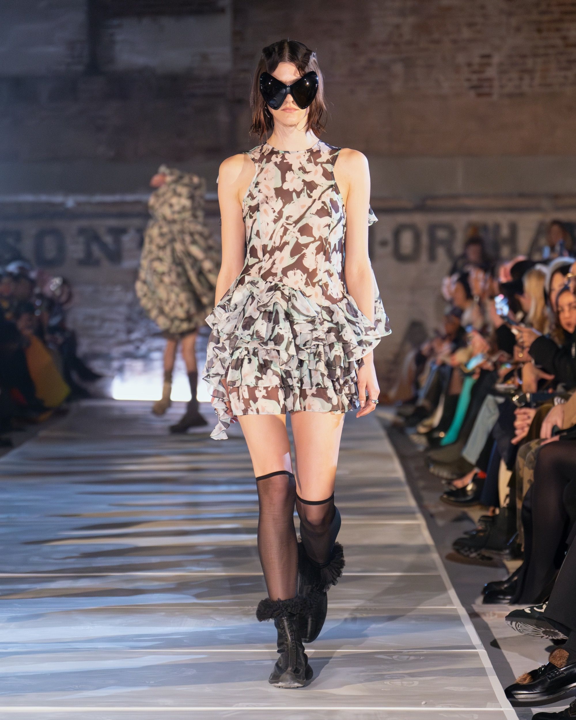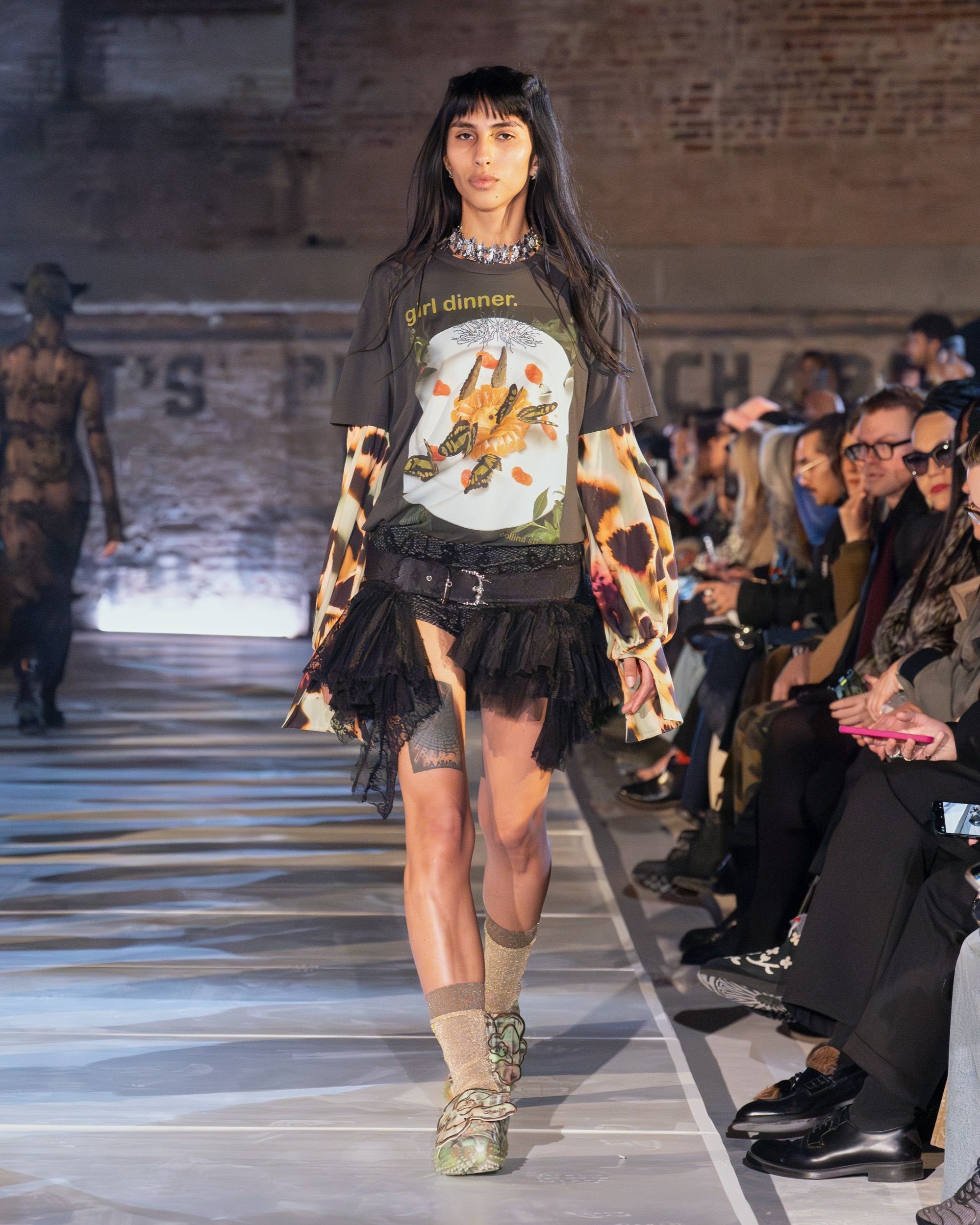 Irriverente, forte e piena di heritage: queste sono le caratteristiche principali tanto della città di New York quanto della FW25 di Collina Strada. Per questa collezione, Hillary Taymour immagina una linea temporale in cui «la femminilità, l’essere queer e le disabilità non sono combattute, ma accettate empaticamente». Tra abiti da sposa trasformati e ripensati e vecchi cappotti doppiopetto, la collezione gioca su un’innumerevole varietà di texture e materiali, dando loro la possibilità di rinascere e trovare nuova vita. Il tutto avvolto in un’estetica punk così fieramente femminile che a tratti ricorda in maniera velata ma celebrativa Vivianne Westwood.
