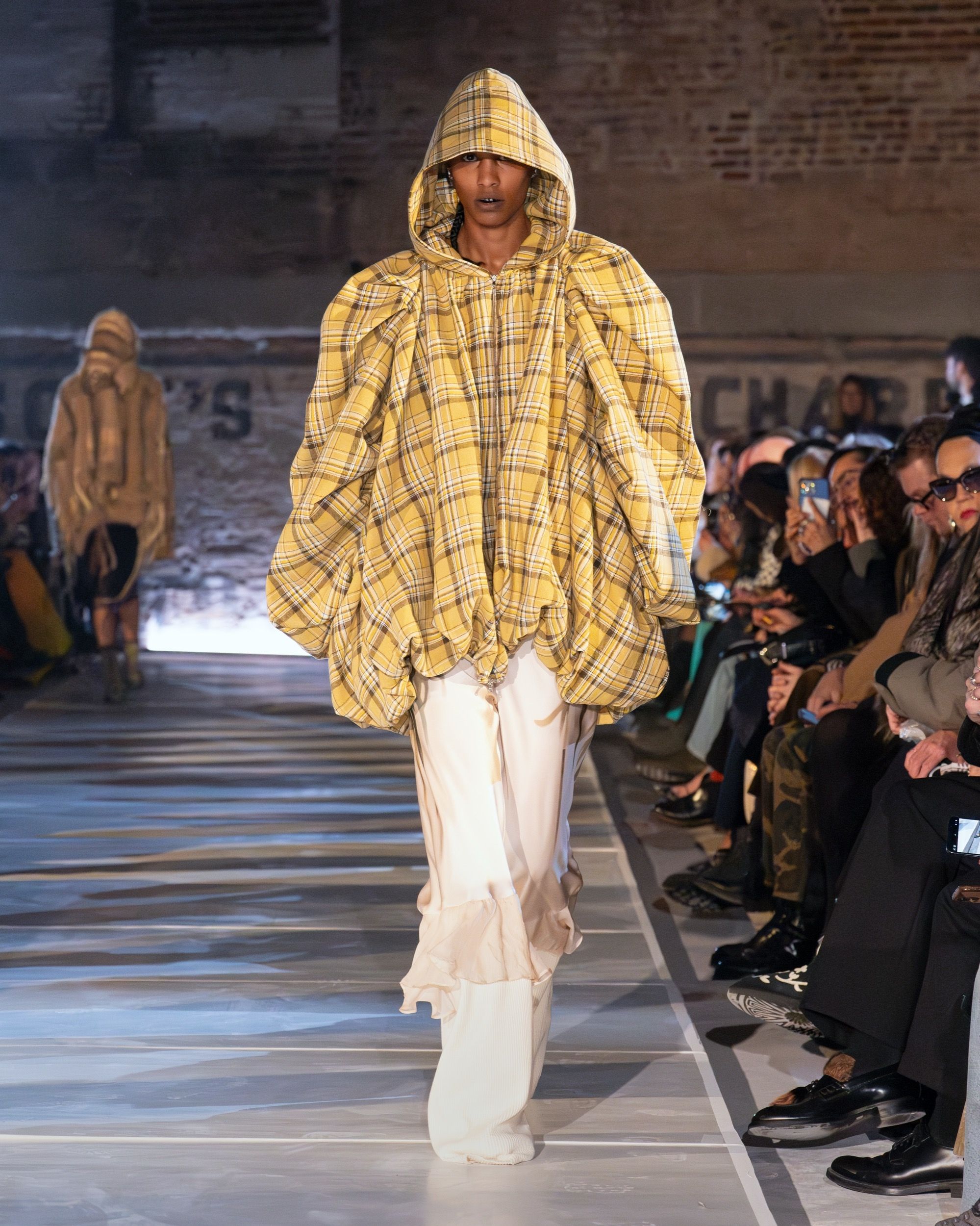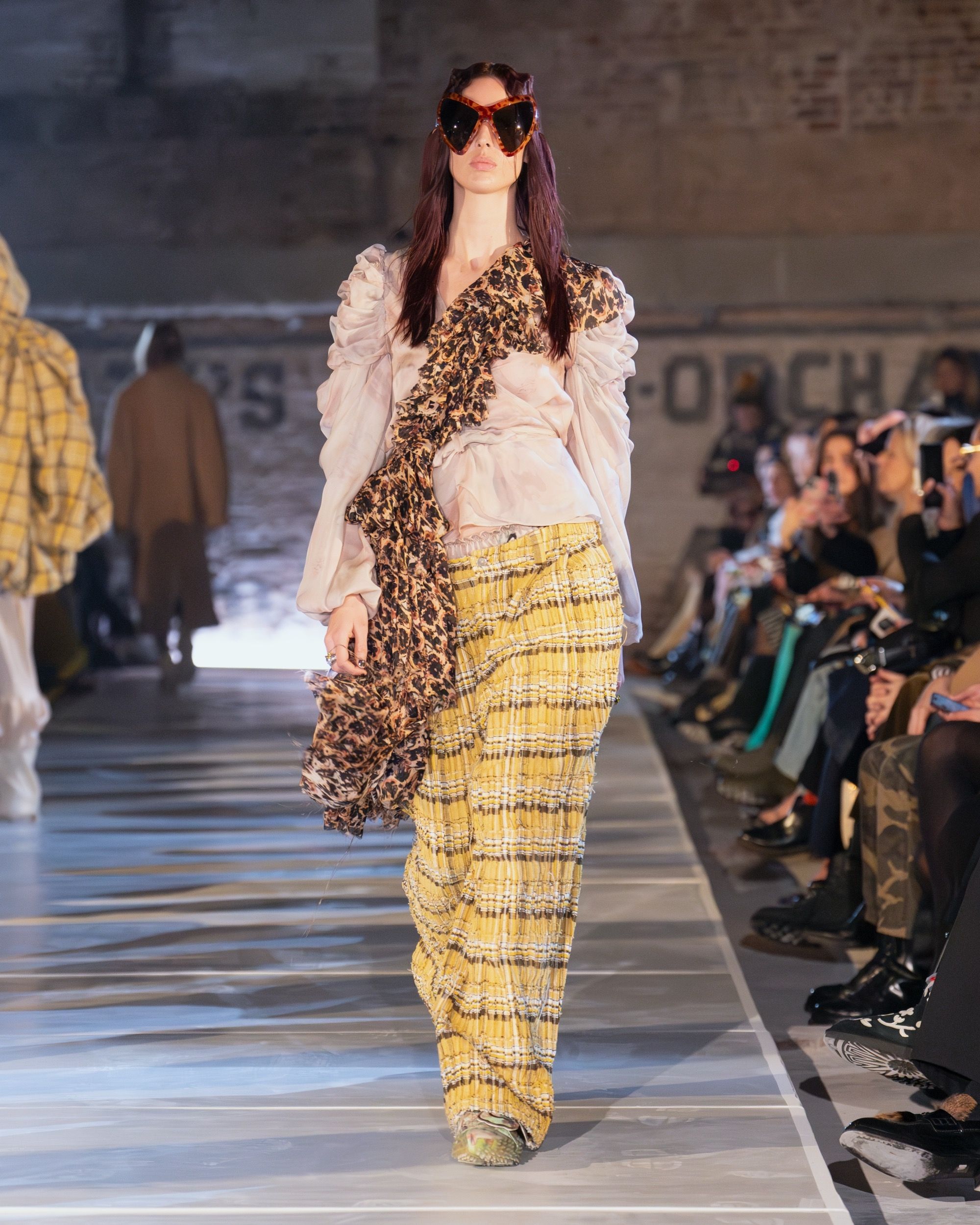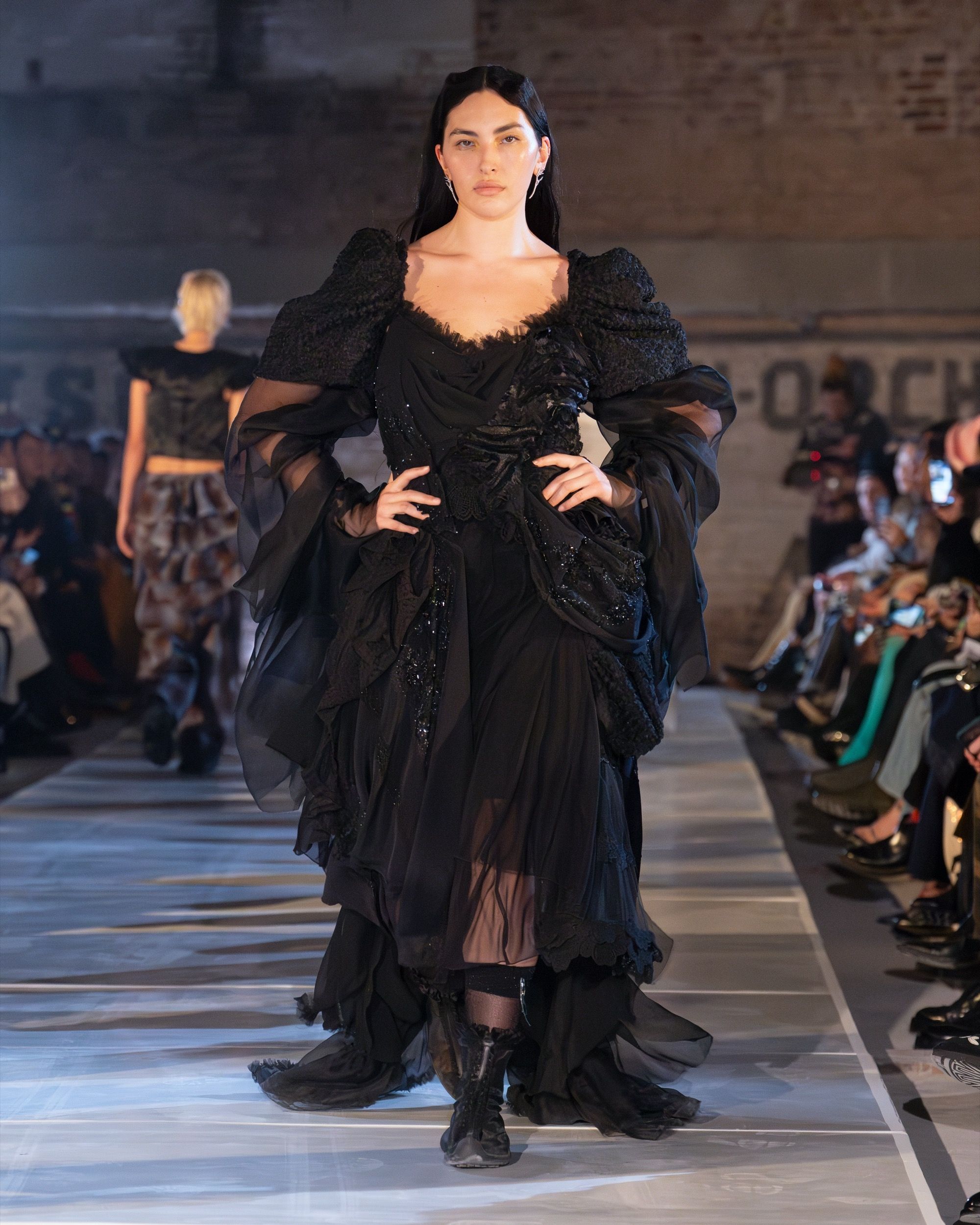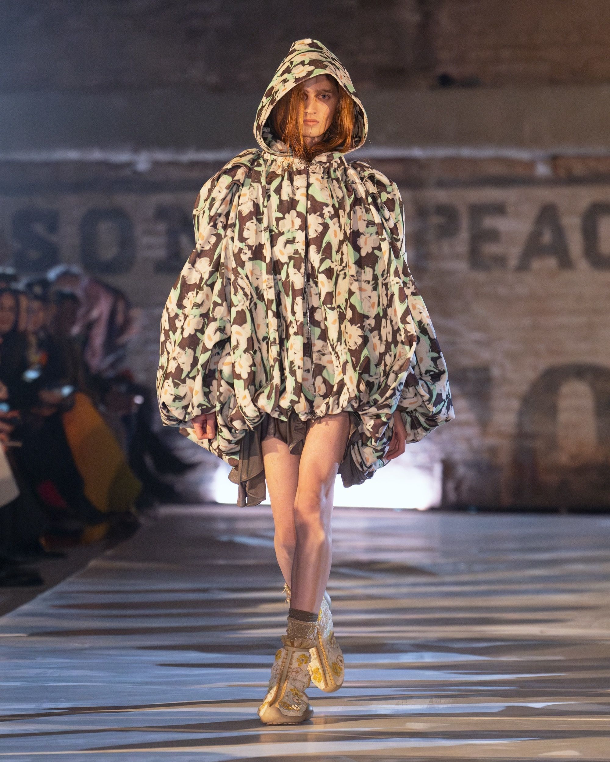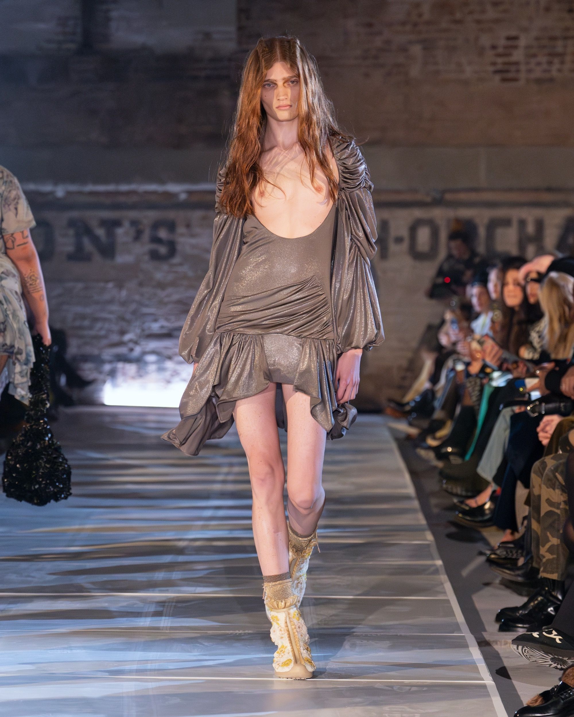 Irriverente, forte e piena di heritage: queste sono le caratteristiche principali tanto della città di New York quanto della FW25 di Collina Strada. Per questa collezione, Hillary Taymour immagina una linea temporale in cui «la femminilità, l’essere queer e le disabilità non sono combattute, ma accettate empaticamente». Tra abiti da sposa trasformati e ripensati e vecchi cappotti doppiopetto, la collezione gioca su un’innumerevole varietà di texture e materiali, dando loro la possibilità di rinascere e trovare nuova vita. Il tutto avvolto in un’estetica punk così fieramente femminile che a tratti ricorda in maniera velata ma celebrativa Vivianne Westwood.