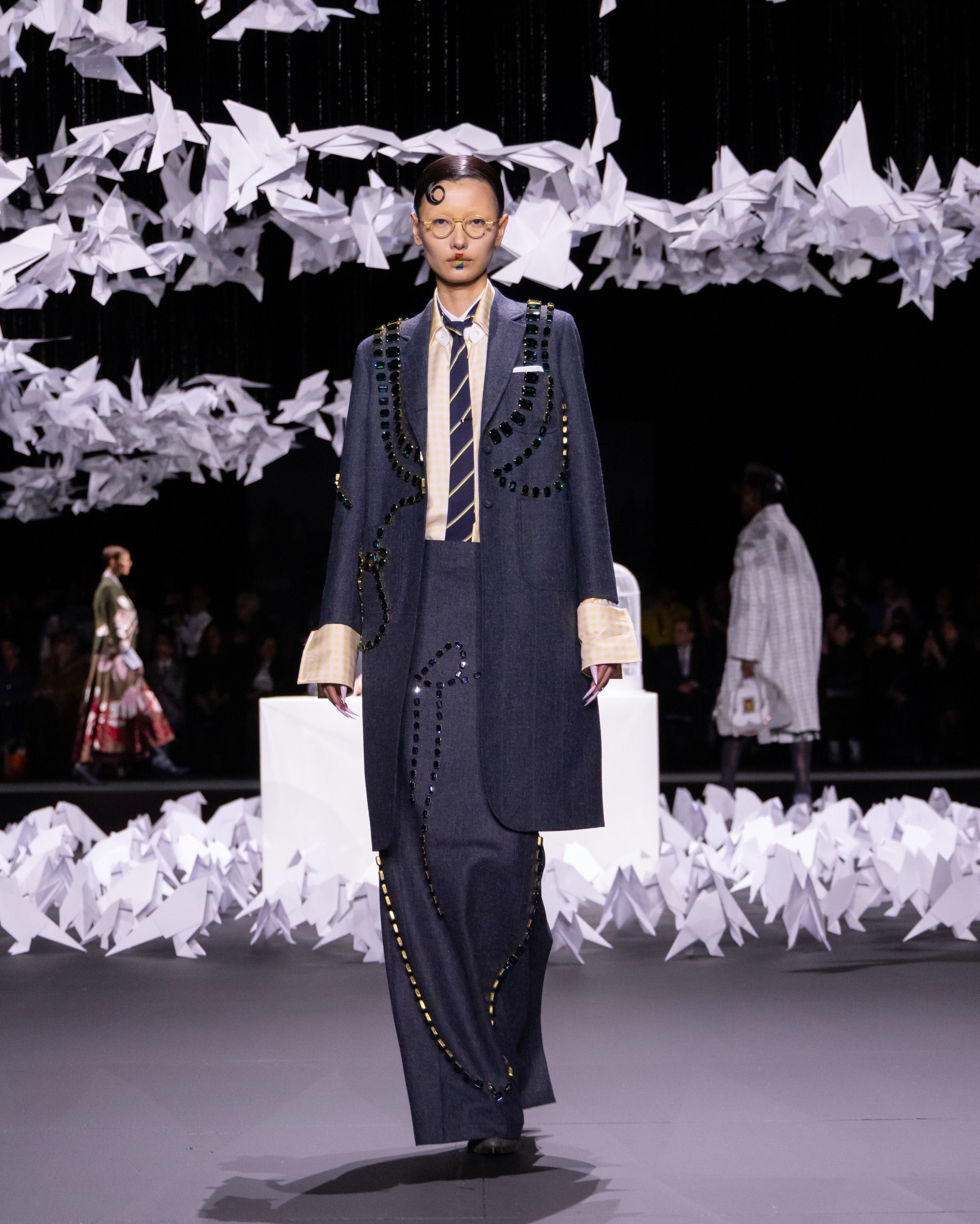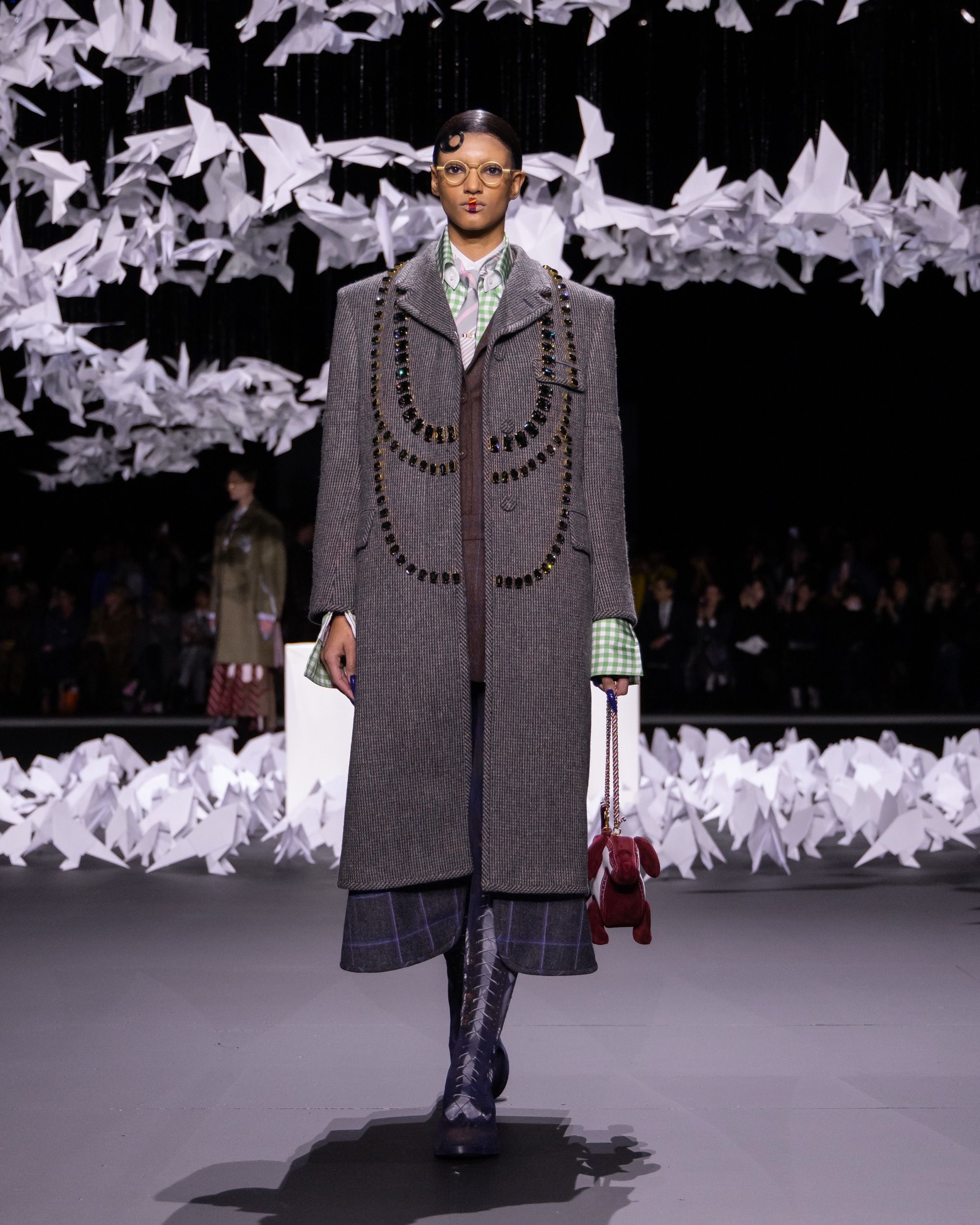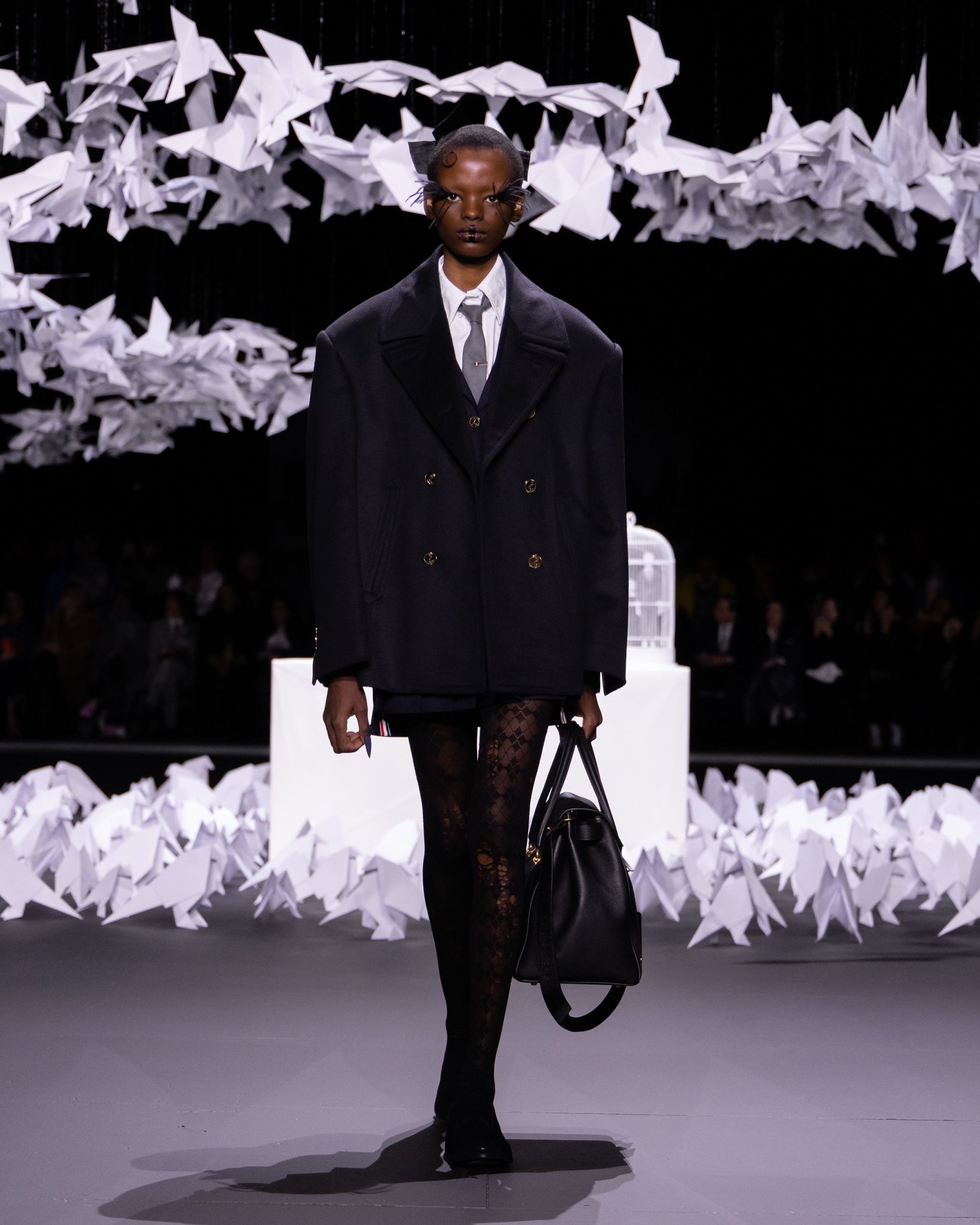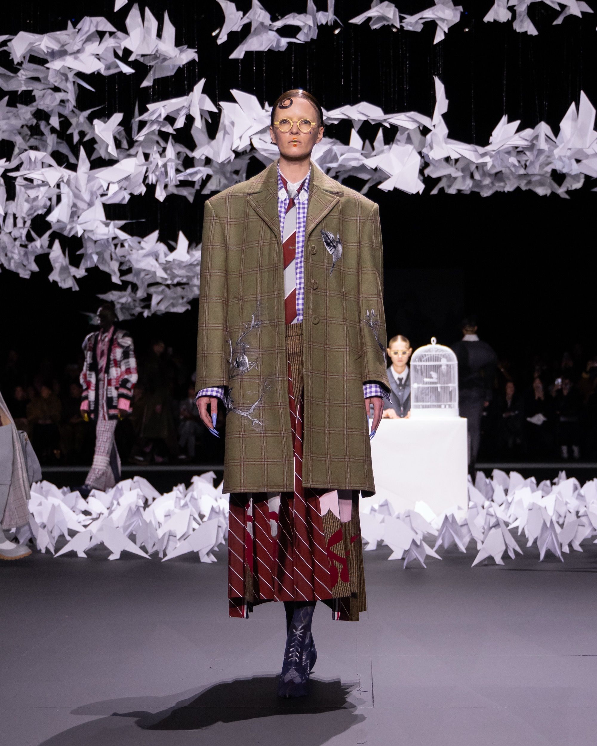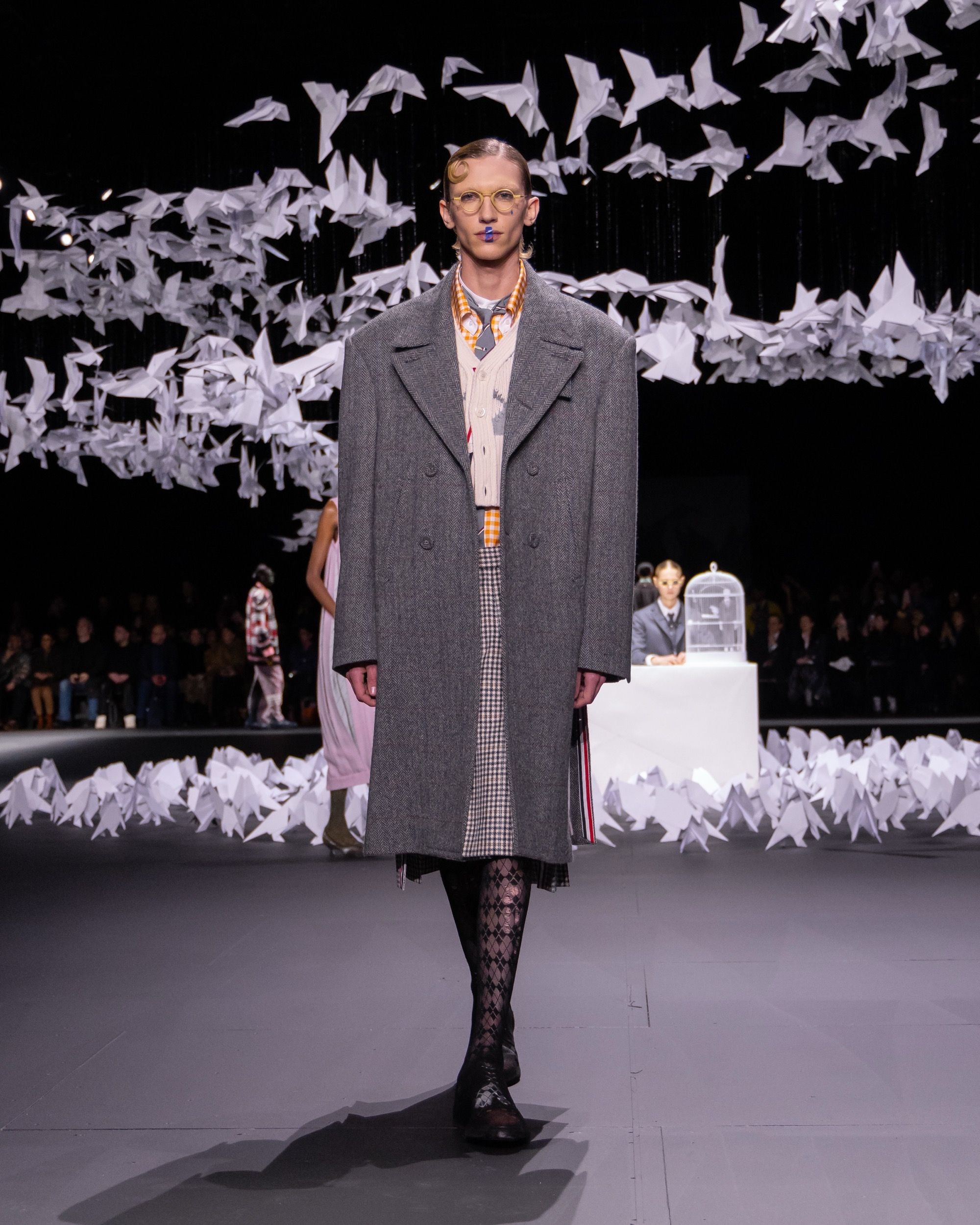 Dopo essere diventato il designer prediletto di Doechii, Thom Browne ha deciso di chiudere la NYFW con uno show che unisce teatralità e rigore sartoriale. La FW25 è un viaggio tra classicismo e surrealismo, dove la silhouette maschile tradizionale si deforma per diventare qualcos’altro. Giacche strutturate si allungano fino a sfiorare il pavimento, gonne plissettate sovrapposte si muovono a ogni passo, mentre completi in tweed si arricchiscono di dettagli ispirati al mondo dell’ornitologia. L’influenza degli uccelli è evidente in ogni elemento, dalle proporzioni alle texture, con piumaggi ricreati attraverso intrecci di bouclé e inserti di cristalli Swarovski. Il risultato è una collezione che conferma l’abilità di Browne nel trasformare il tailoring in una performance, mantenendo la sua estetica rigorosa ma sempre in evoluzione.