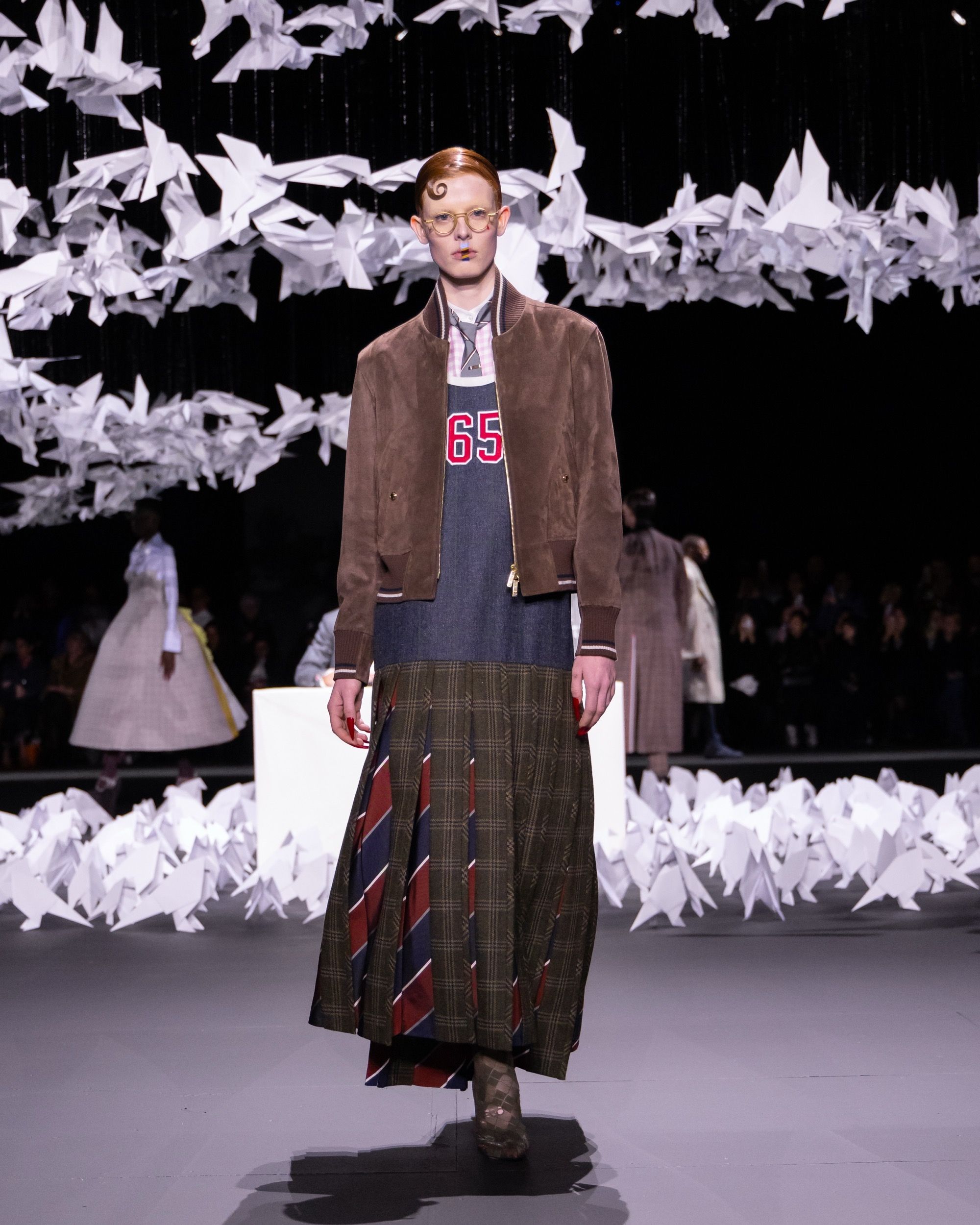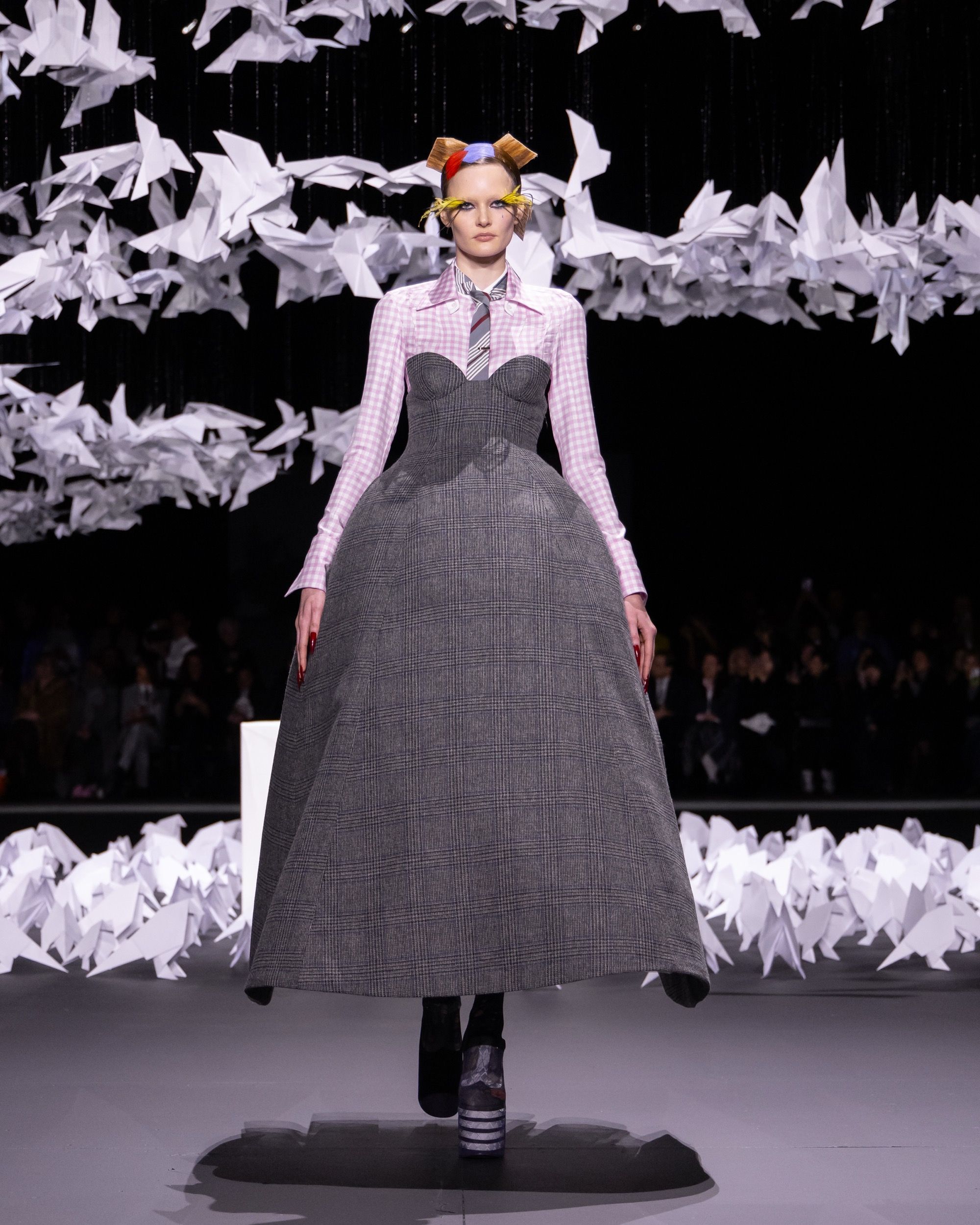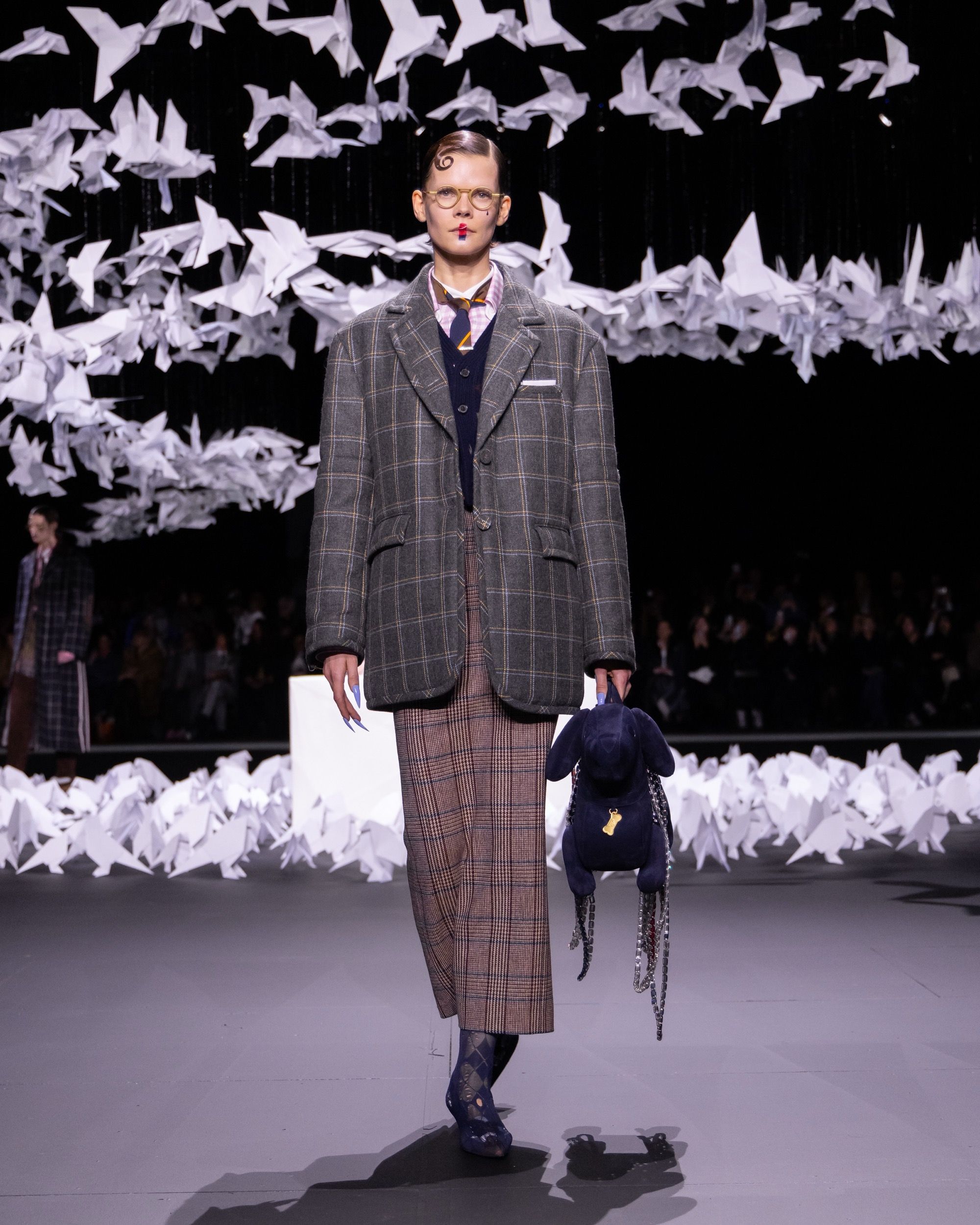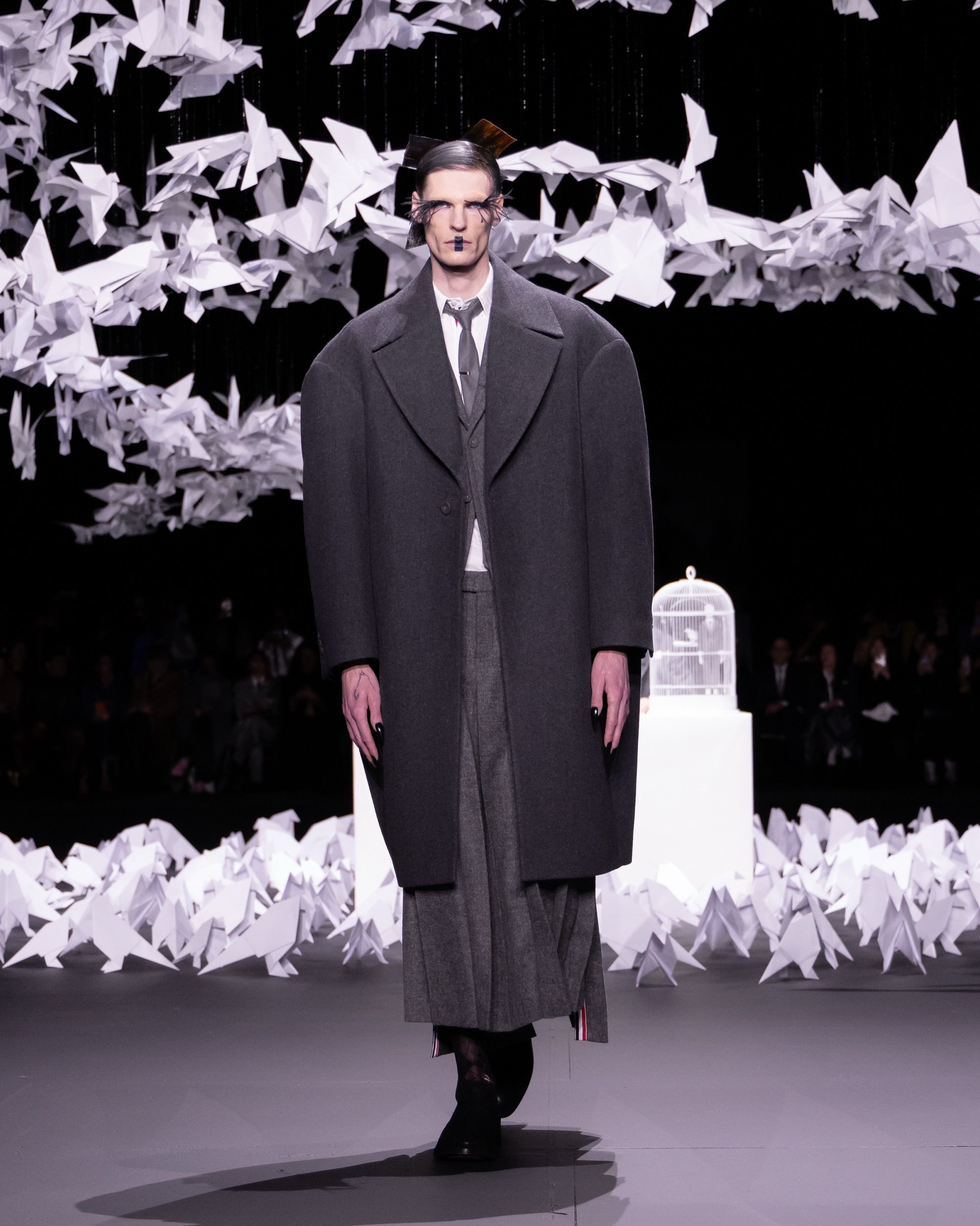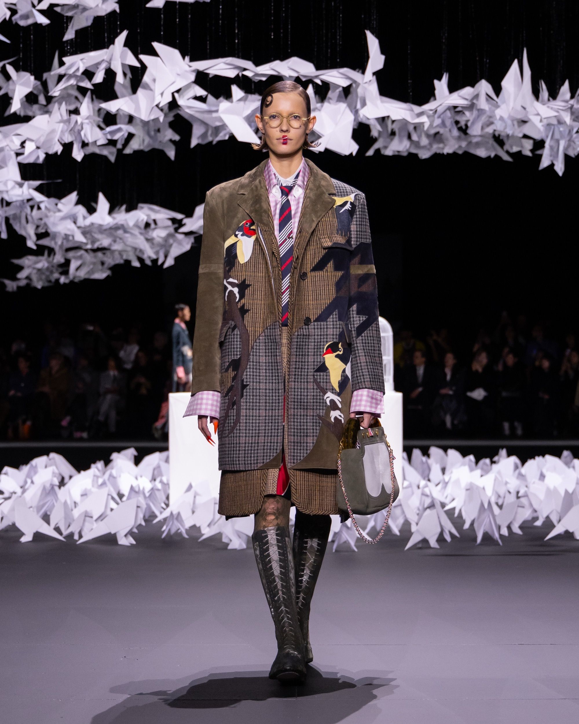 Dopo essere diventato il designer prediletto di Doechii, Thom Browne ha deciso di chiudere la NYFW con uno show che unisce teatralità e rigore sartoriale. La FW25 è un viaggio tra classicismo e surrealismo, dove la silhouette maschile tradizionale si deforma per diventare qualcos’altro. Giacche strutturate si allungano fino a sfiorare il pavimento, gonne plissettate sovrapposte si muovono a ogni passo, mentre completi in tweed si arricchiscono di dettagli ispirati al mondo dell’ornitologia. L’influenza degli uccelli è evidente in ogni elemento, dalle proporzioni alle texture, con piumaggi ricreati attraverso intrecci di bouclé e inserti di cristalli Swarovski. Il risultato è una collezione che conferma l’abilità di Browne nel trasformare il tailoring in una performance, mantenendo la sua estetica rigorosa ma sempre in evoluzione.