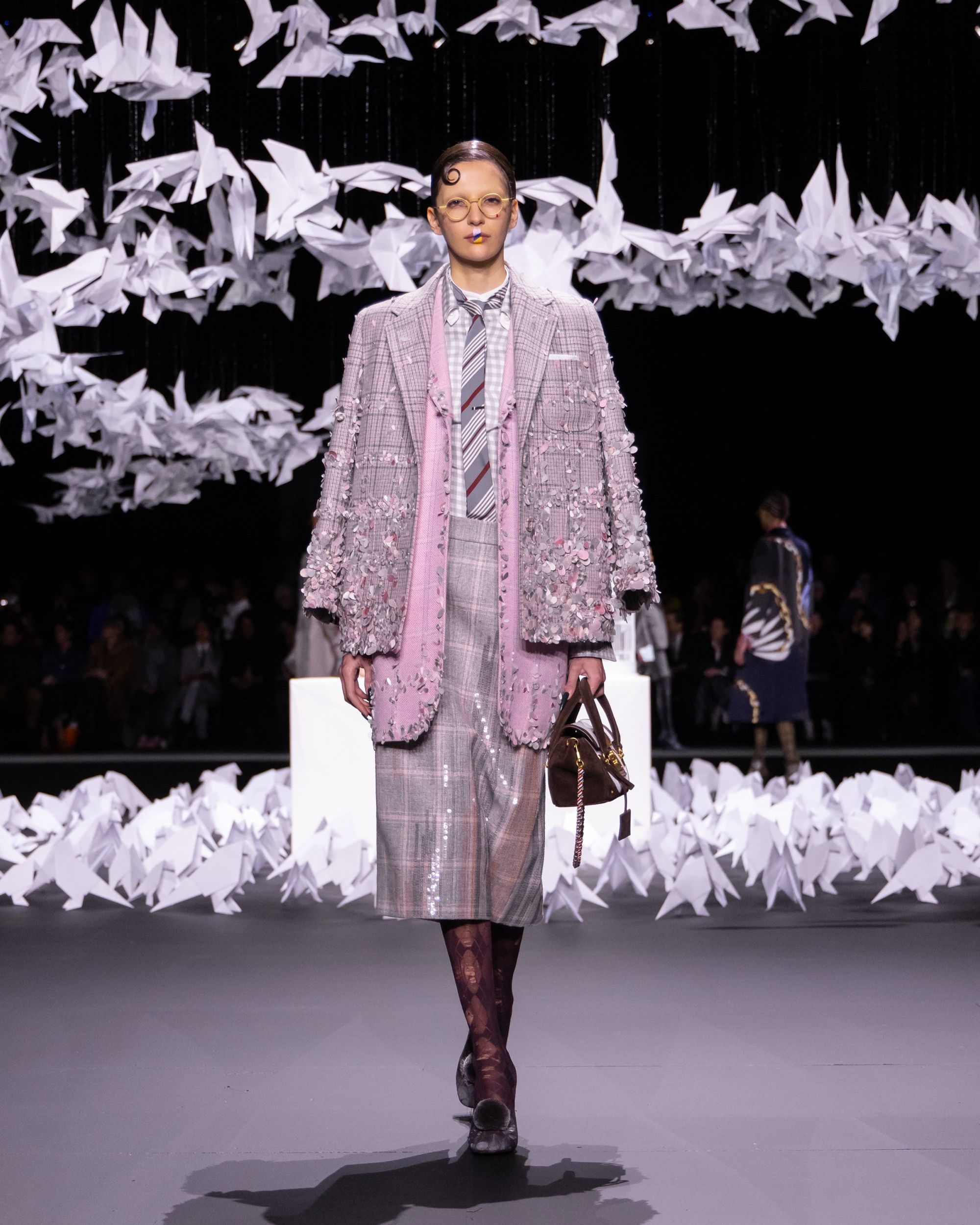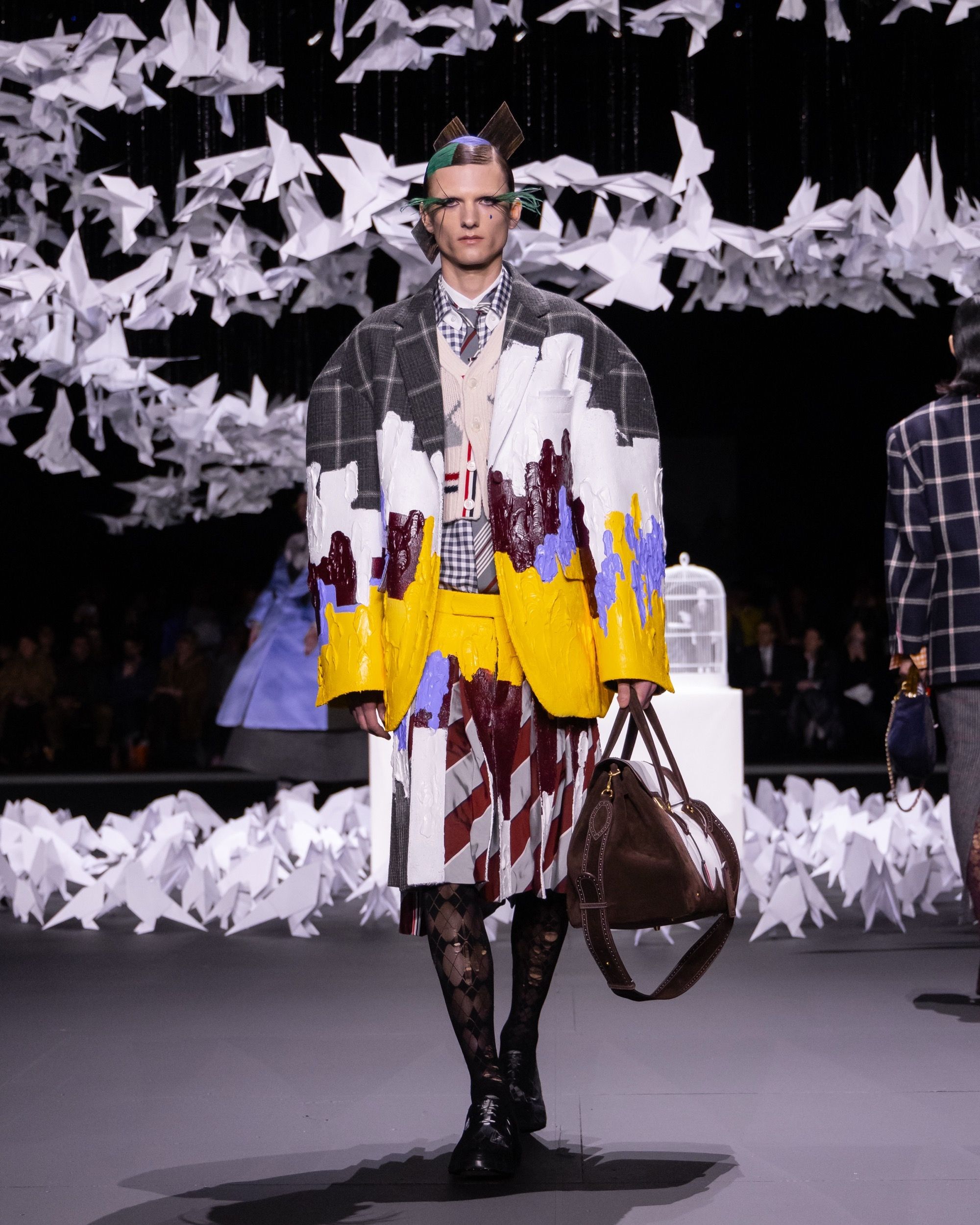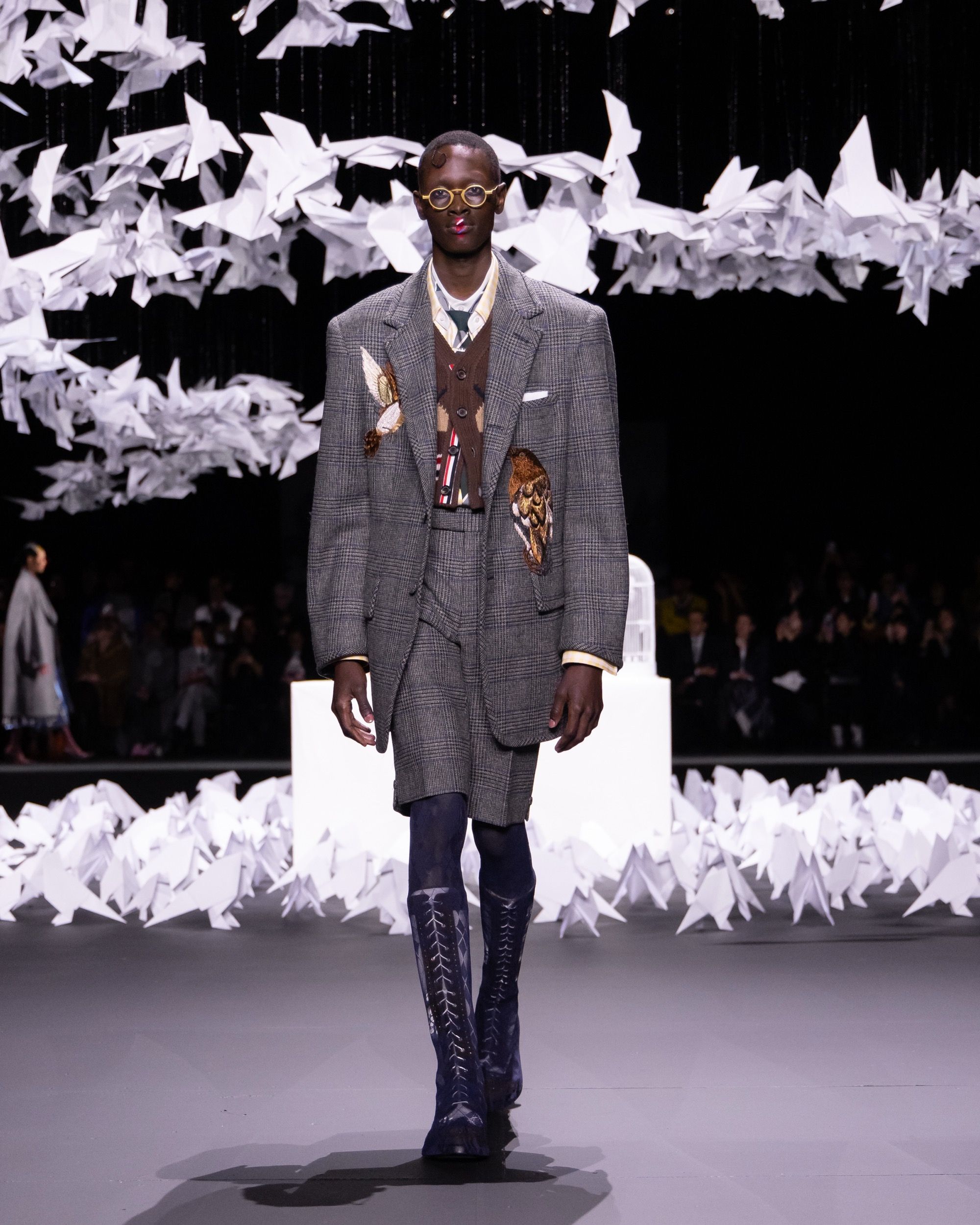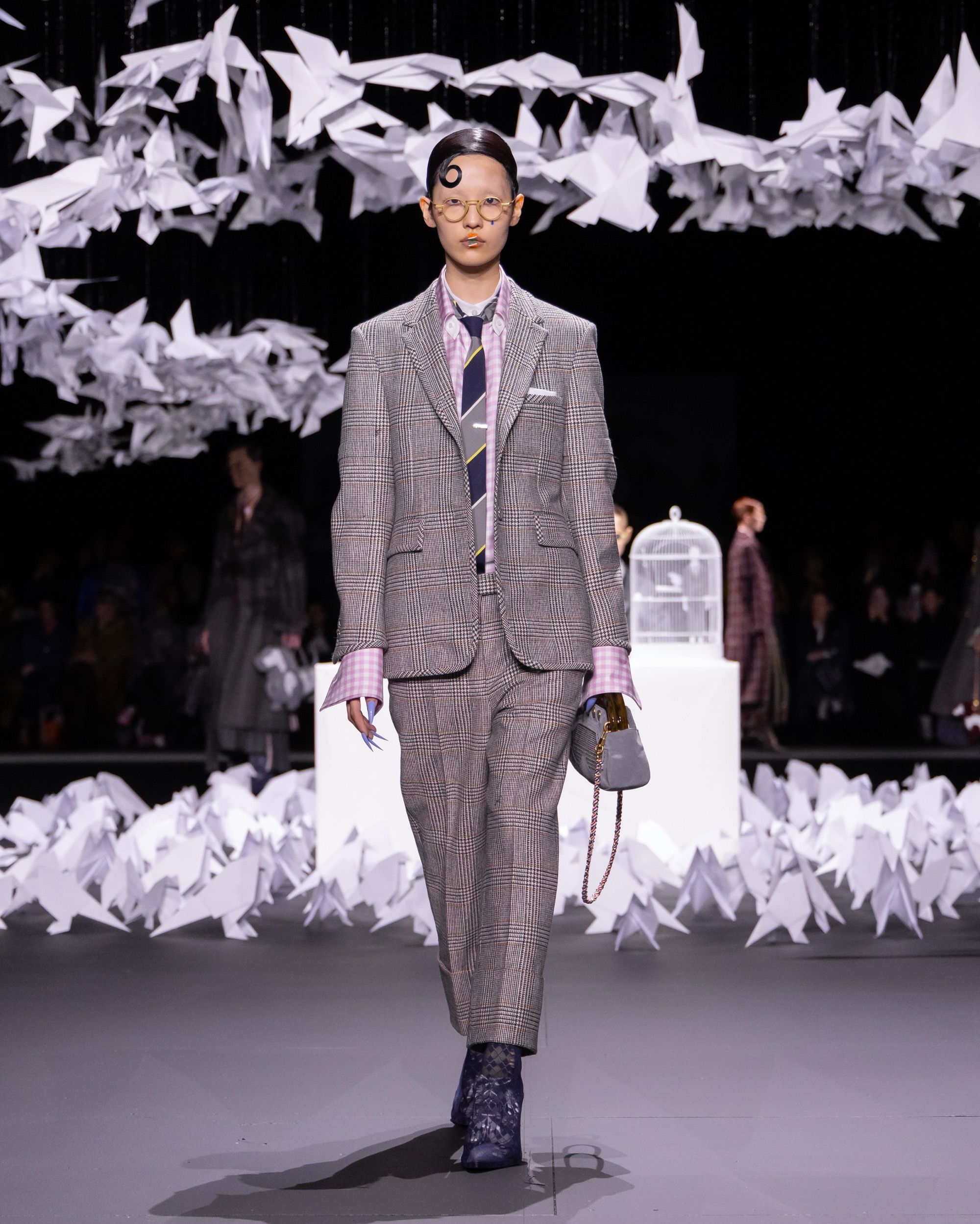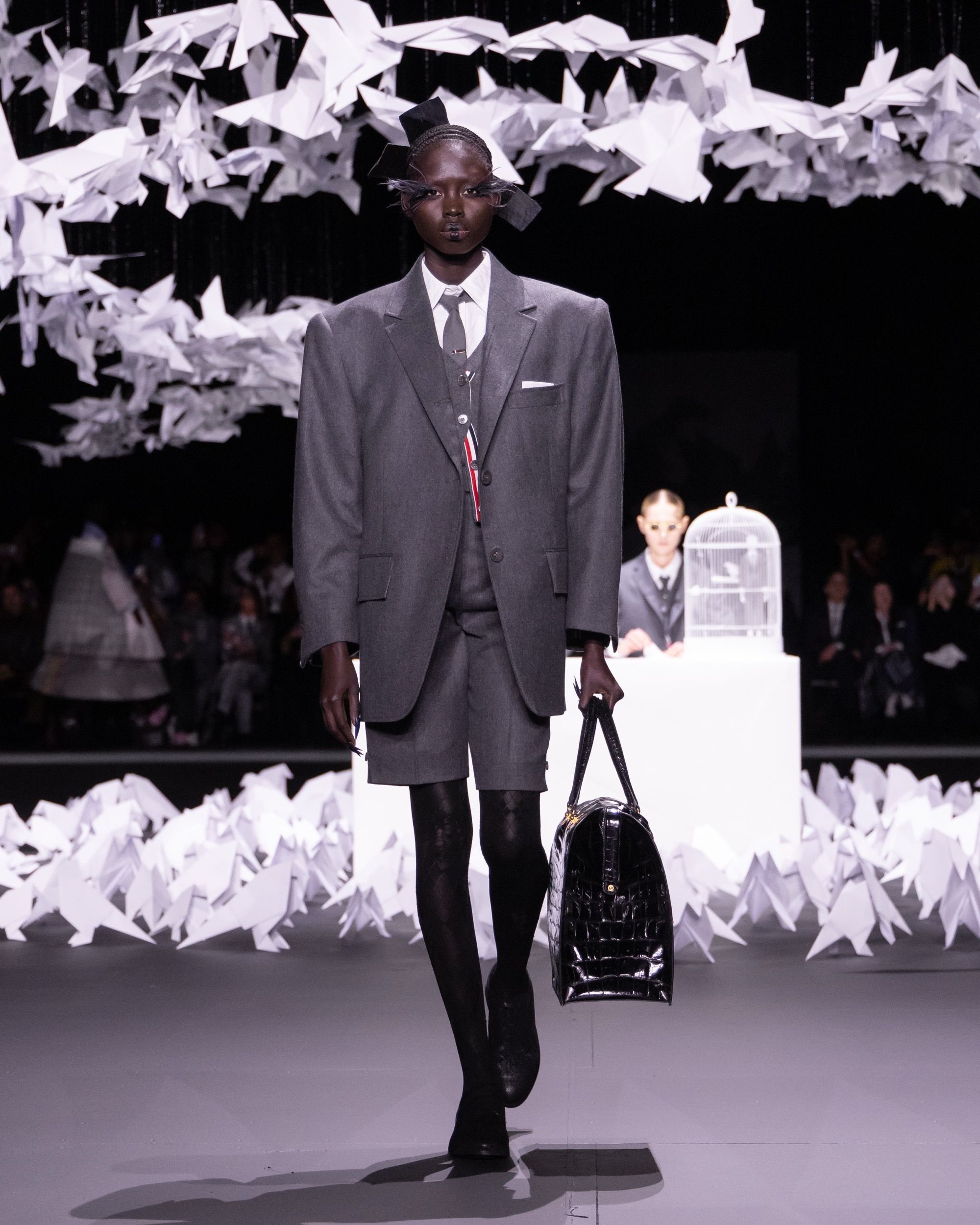 Dopo essere diventato il designer prediletto di Doechii, Thom Browne ha deciso di chiudere la NYFW con uno show che unisce teatralità e rigore sartoriale. La FW25 è un viaggio tra classicismo e surrealismo, dove la silhouette maschile tradizionale si deforma per diventare qualcos’altro. Giacche strutturate si allungano fino a sfiorare il pavimento, gonne plissettate sovrapposte si muovono a ogni passo, mentre completi in tweed si arricchiscono di dettagli ispirati al mondo dell’ornitologia. L’influenza degli uccelli è evidente in ogni elemento, dalle proporzioni alle texture, con piumaggi ricreati attraverso intrecci di bouclé e inserti di cristalli Swarovski. Il risultato è una collezione che conferma l’abilità di Browne nel trasformare il tailoring in una performance, mantenendo la sua estetica rigorosa ma sempre in evoluzione.