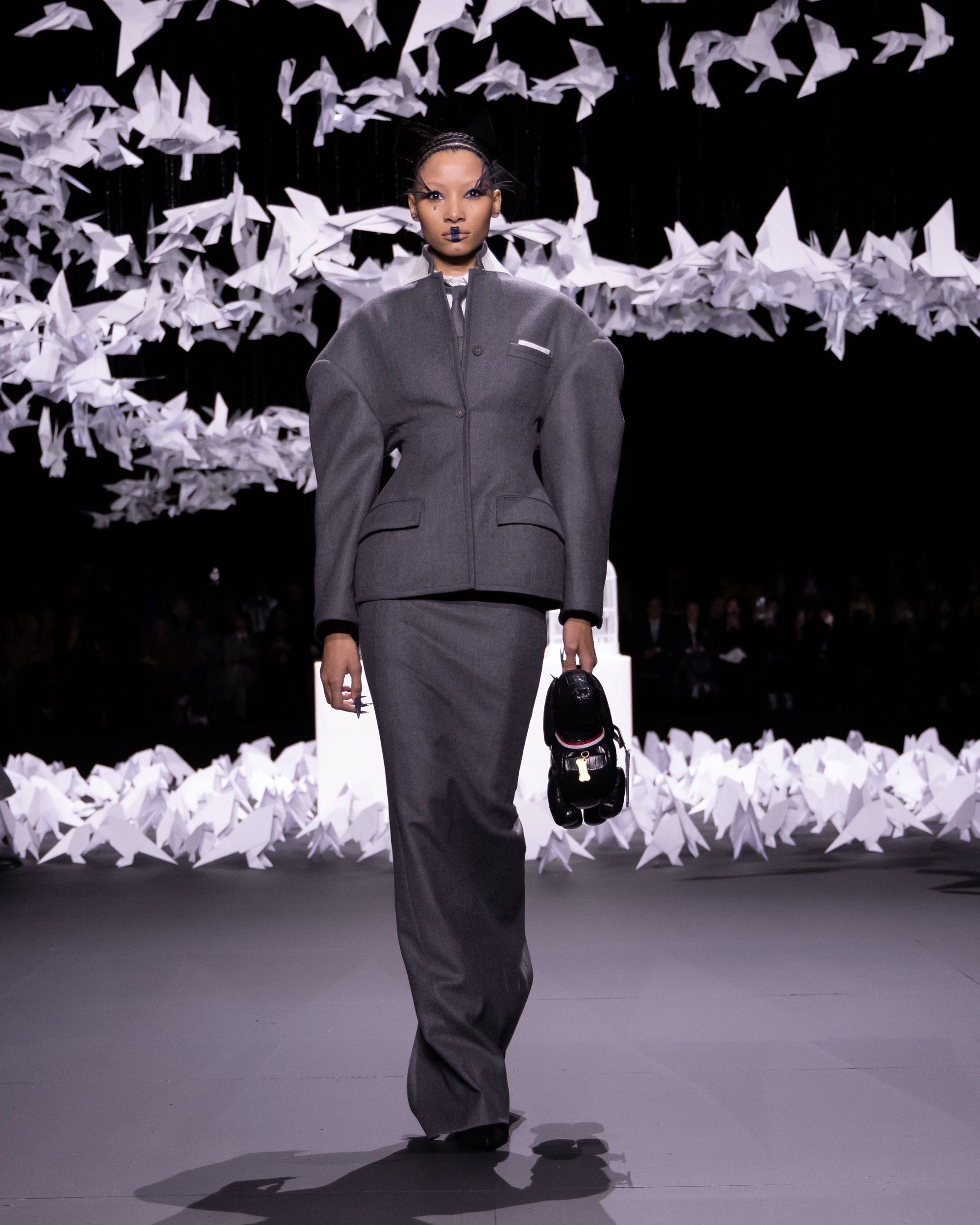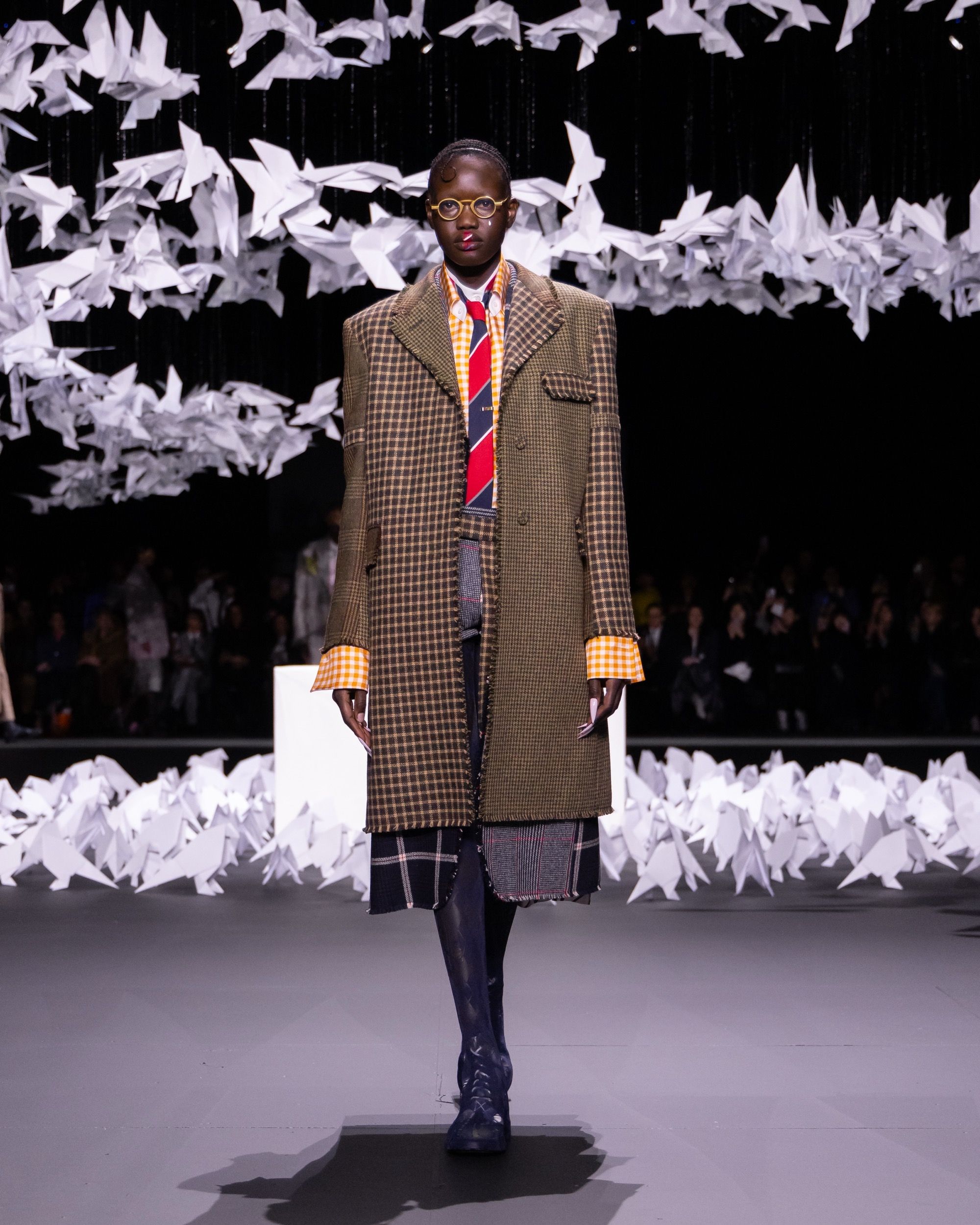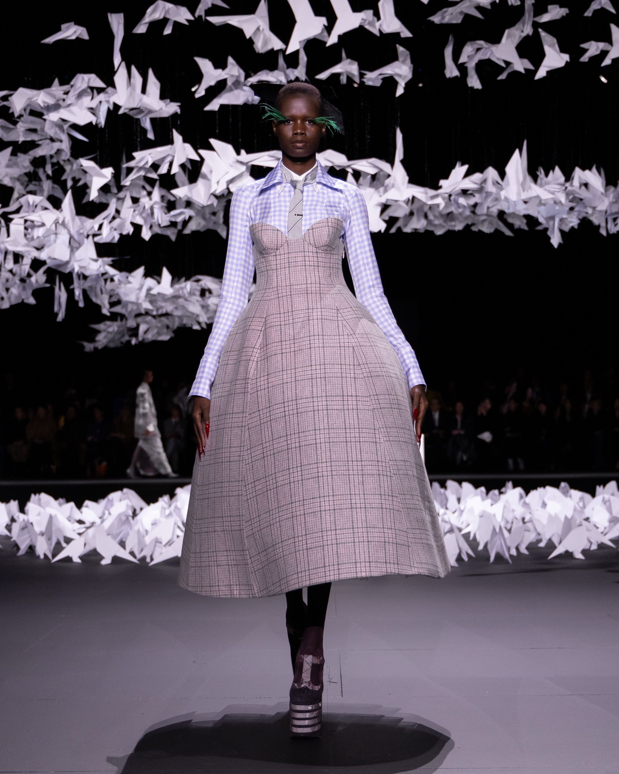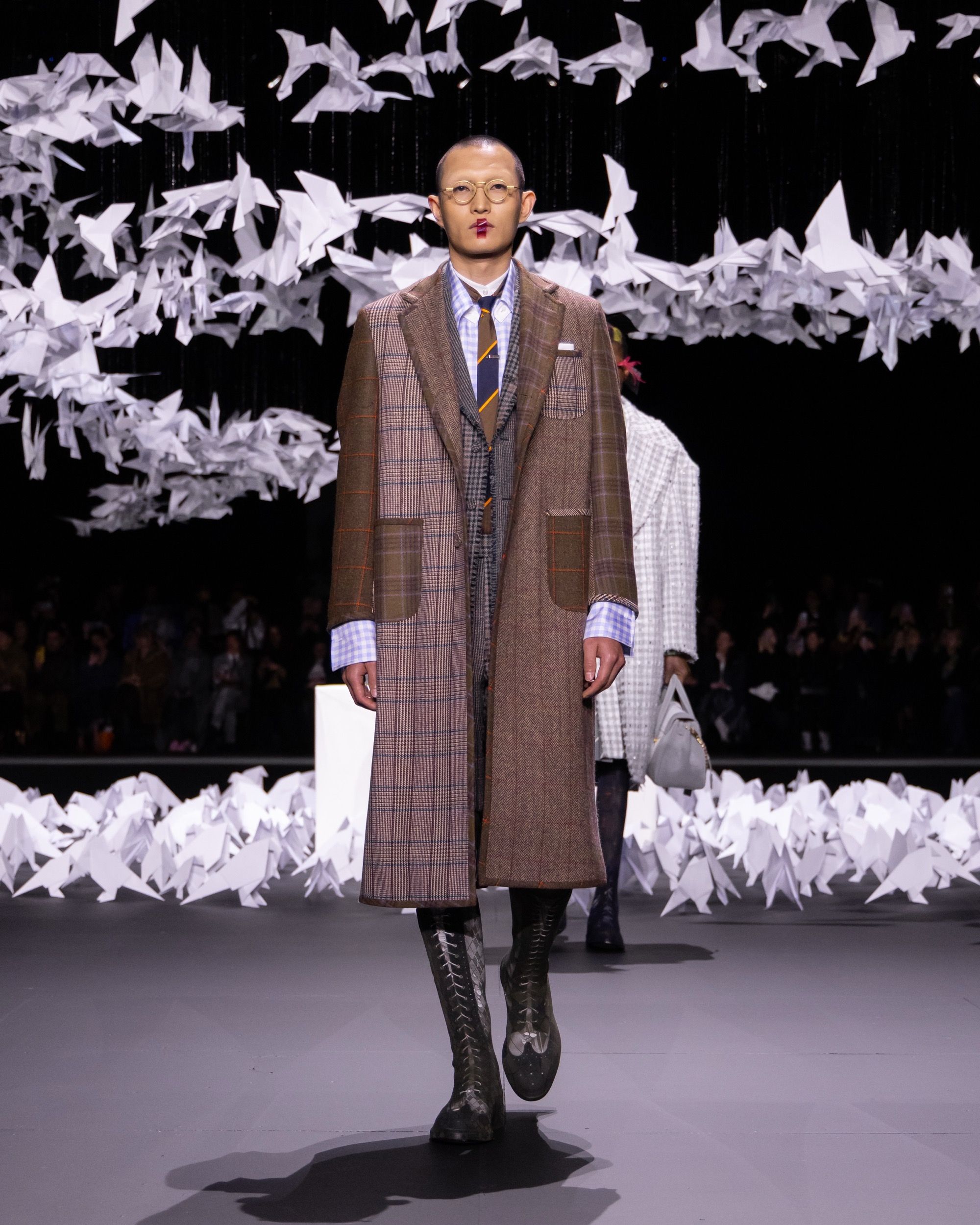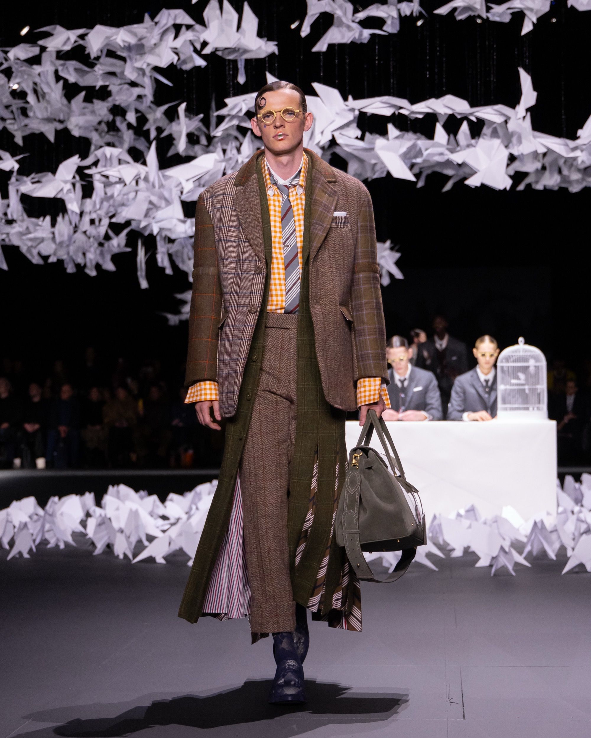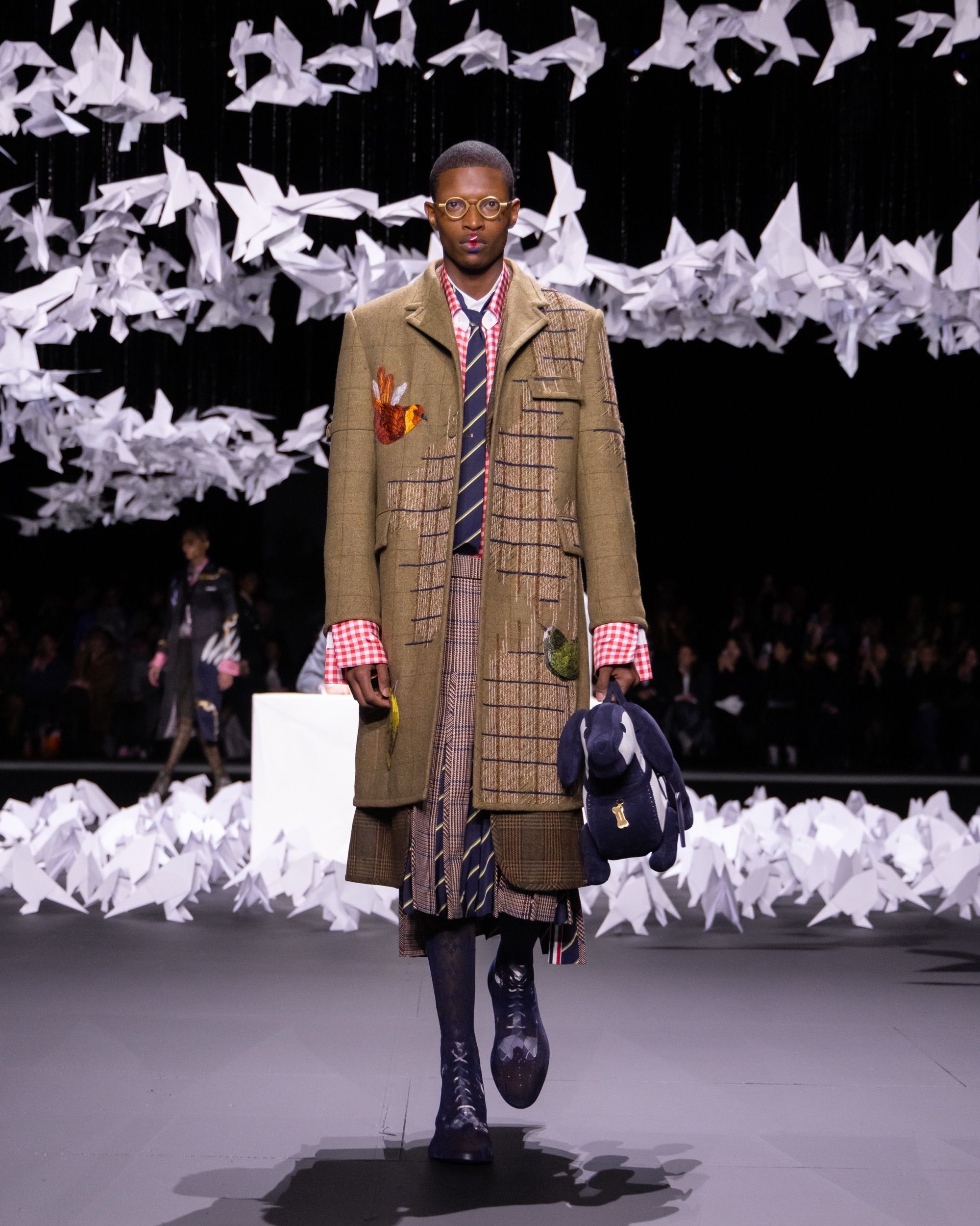 Dopo essere diventato il designer prediletto di Doechii, Thom Browne ha deciso di chiudere la NYFW con uno show che unisce teatralità e rigore sartoriale. La FW25 è un viaggio tra classicismo e surrealismo, dove la silhouette maschile tradizionale si deforma per diventare qualcos’altro. Giacche strutturate si allungano fino a sfiorare il pavimento, gonne plissettate sovrapposte si muovono a ogni passo, mentre completi in tweed si arricchiscono di dettagli ispirati al mondo dell’ornitologia. L’influenza degli uccelli è evidente in ogni elemento, dalle proporzioni alle texture, con piumaggi ricreati attraverso intrecci di bouclé e inserti di cristalli Swarovski. Il risultato è una collezione che conferma l’abilità di Browne nel trasformare il tailoring in una performance, mantenendo la sua estetica rigorosa ma sempre in evoluzione.