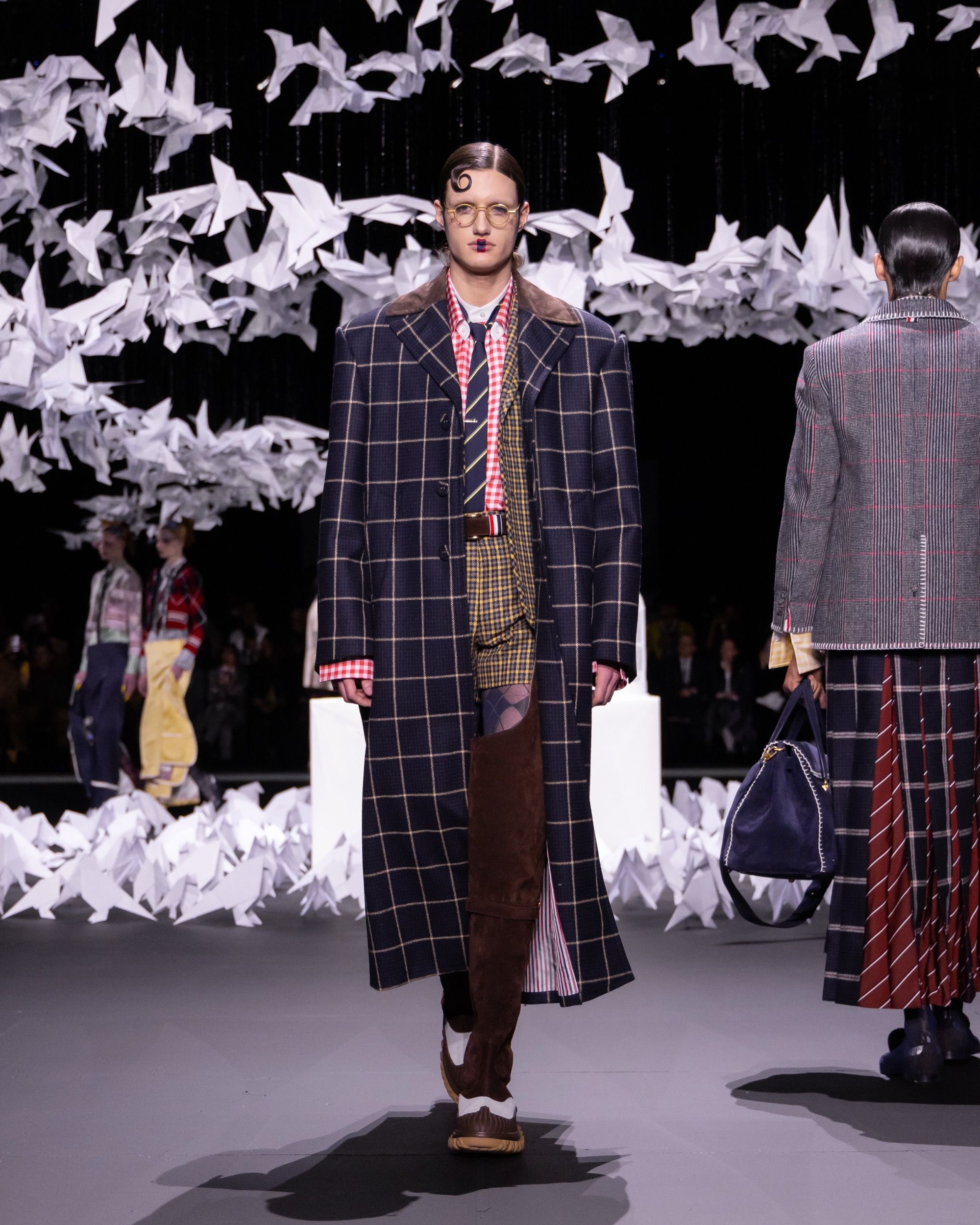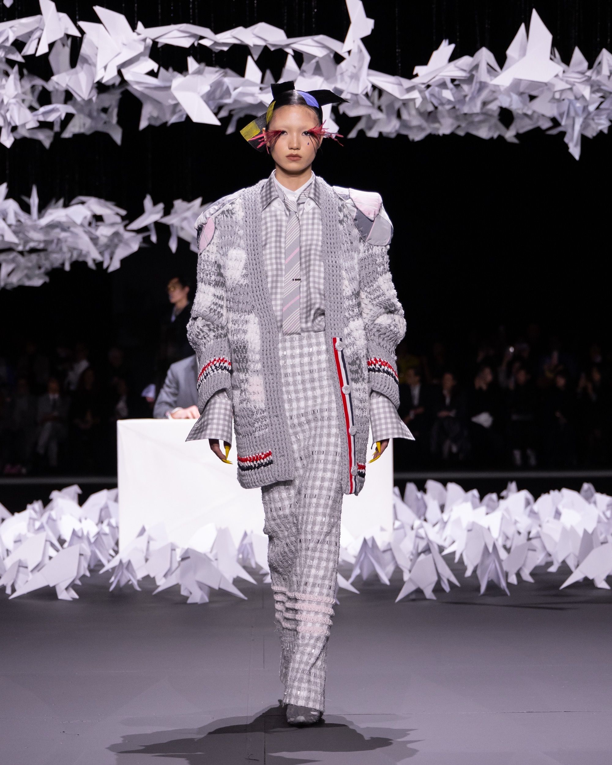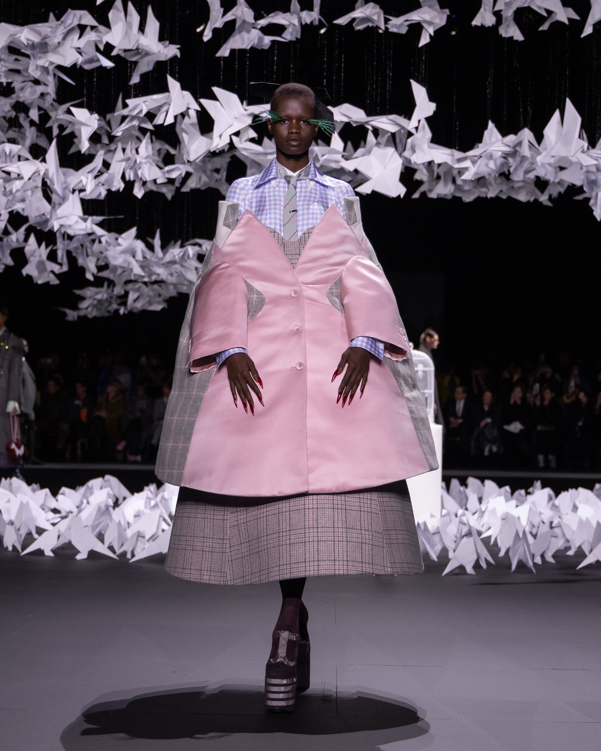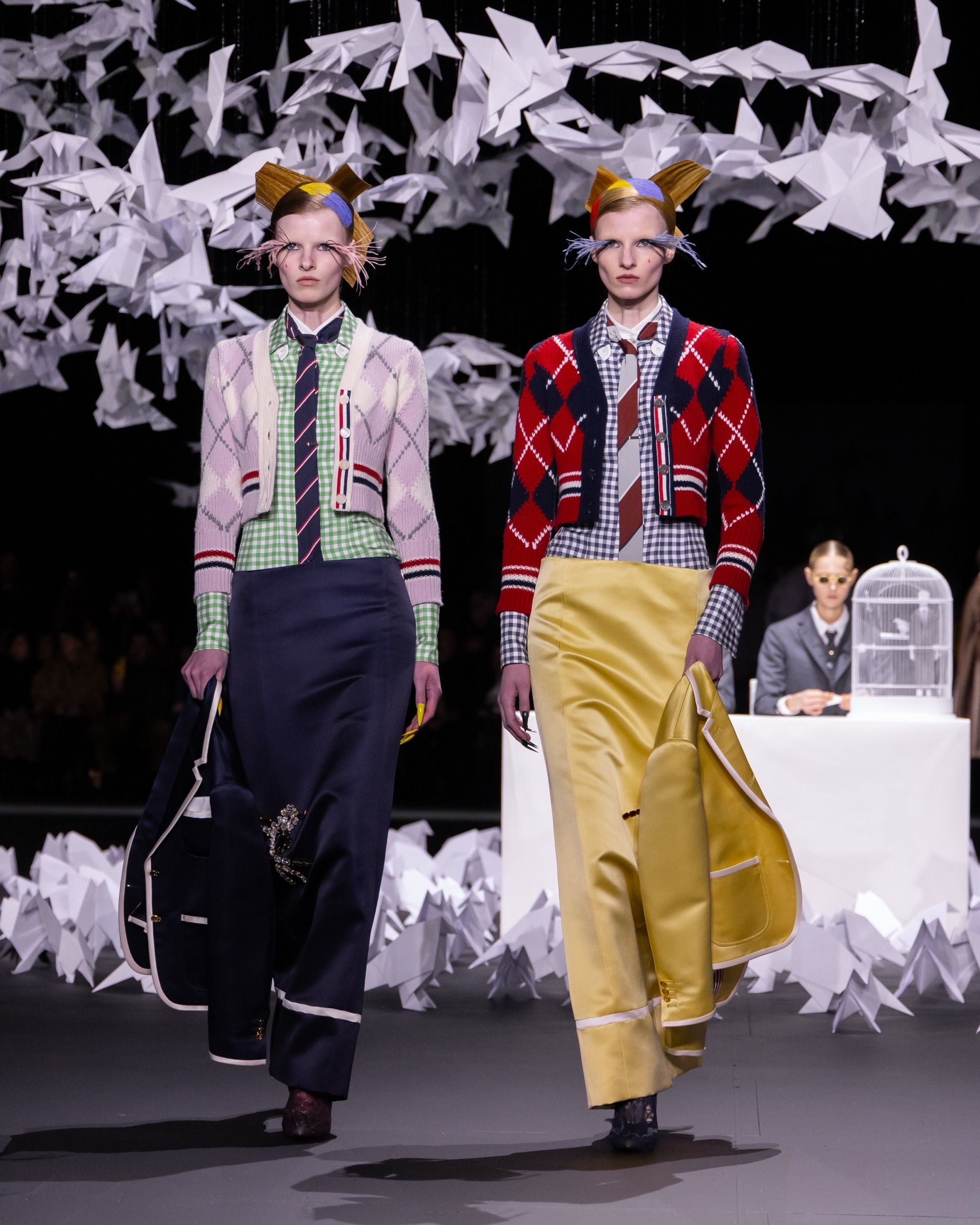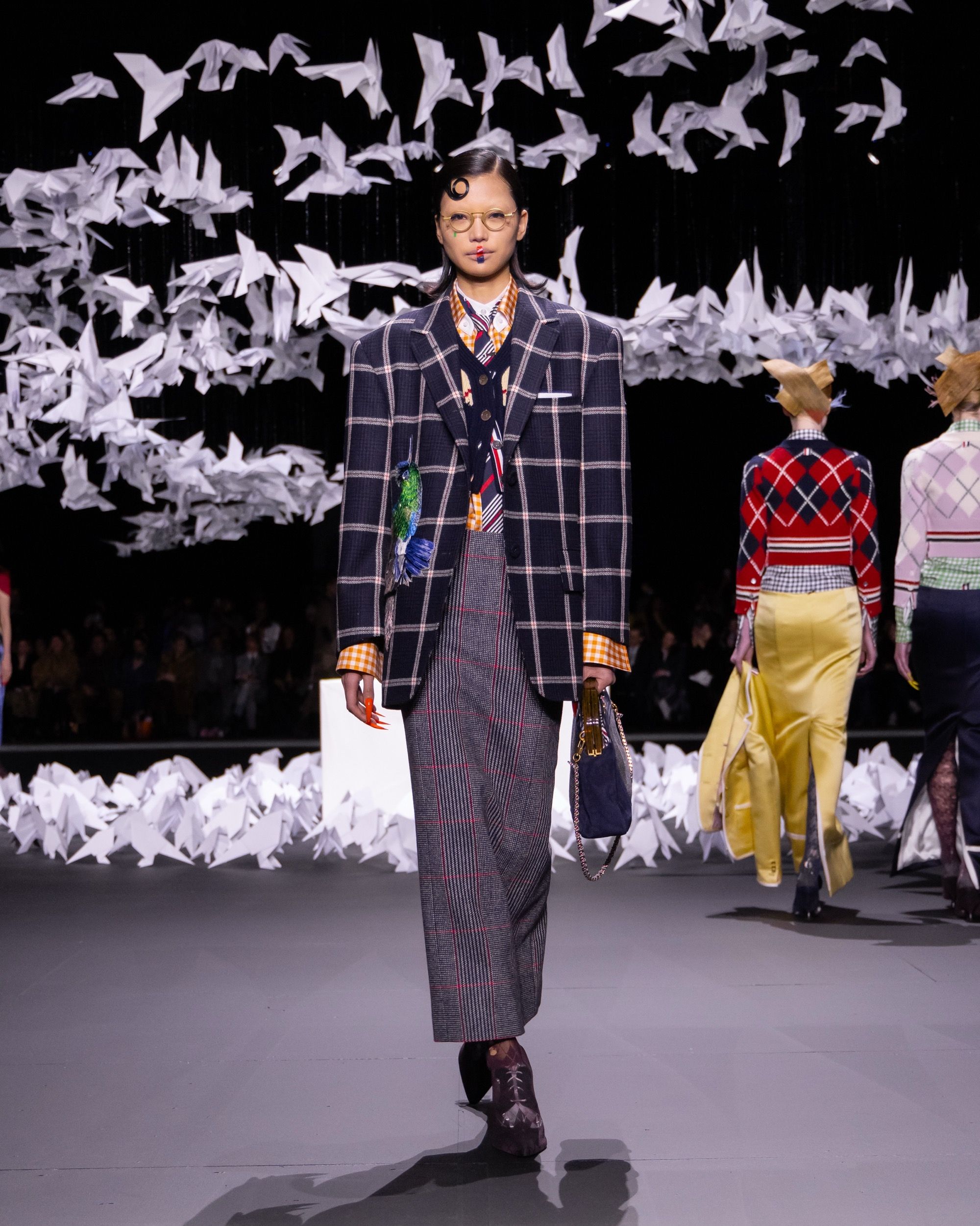 Dopo essere diventato il designer prediletto di Doechii, Thom Browne ha deciso di chiudere la NYFW con uno show che unisce teatralità e rigore sartoriale. La FW25 è un viaggio tra classicismo e surrealismo, dove la silhouette maschile tradizionale si deforma per diventare qualcos’altro. Giacche strutturate si allungano fino a sfiorare il pavimento, gonne plissettate sovrapposte si muovono a ogni passo, mentre completi in tweed si arricchiscono di dettagli ispirati al mondo dell’ornitologia. L’influenza degli uccelli è evidente in ogni elemento, dalle proporzioni alle texture, con piumaggi ricreati attraverso intrecci di bouclé e inserti di cristalli Swarovski. Il risultato è una collezione che conferma l’abilità di Browne nel trasformare il tailoring in una performance, mantenendo la sua estetica rigorosa ma sempre in evoluzione.