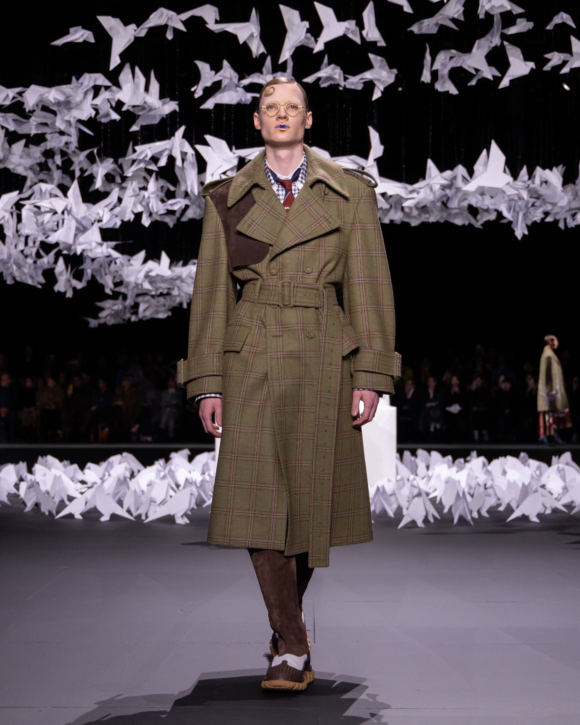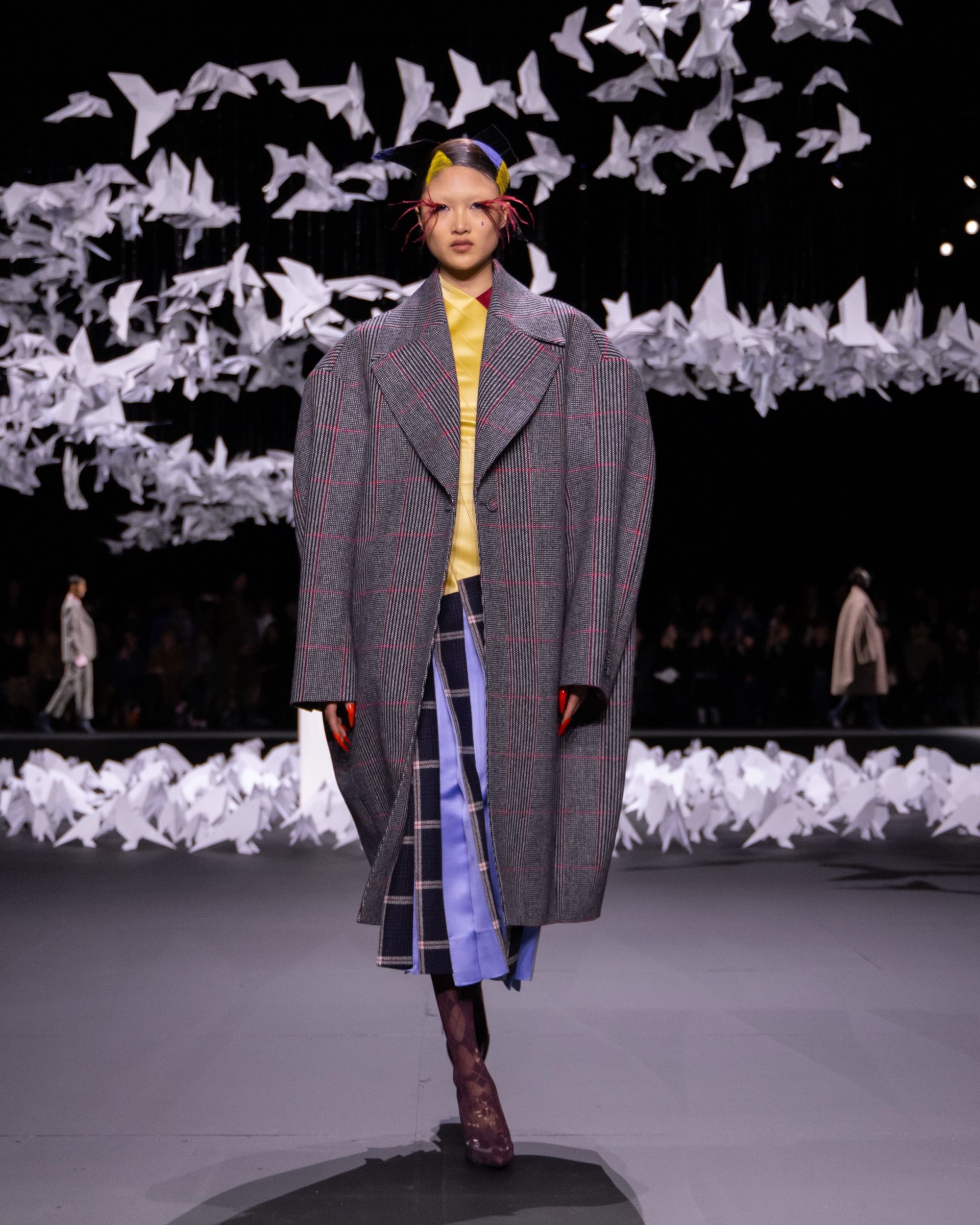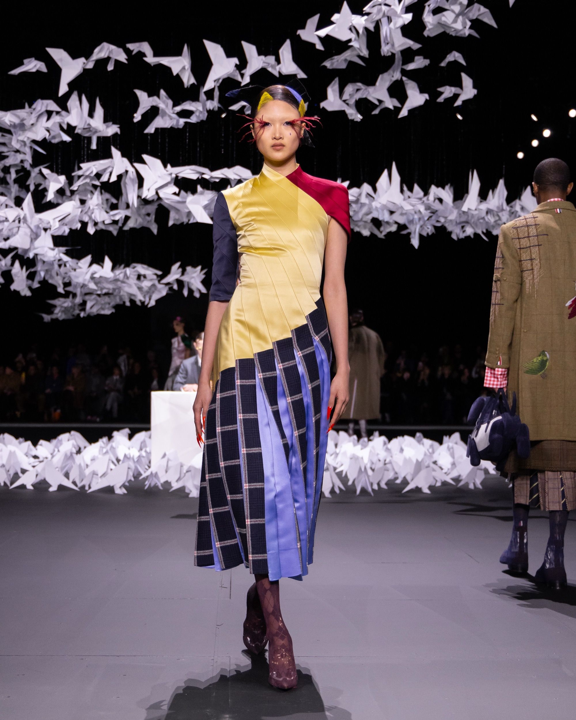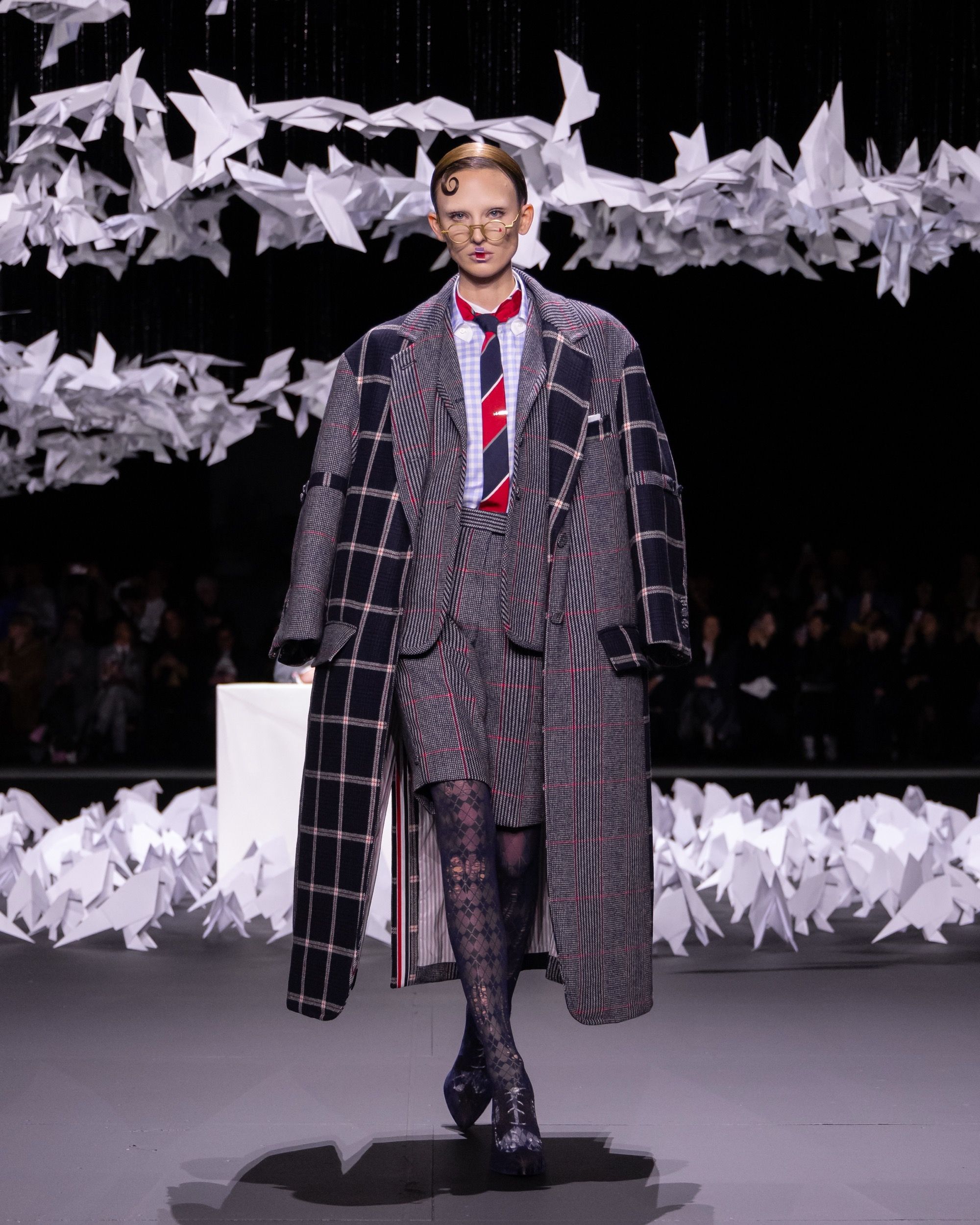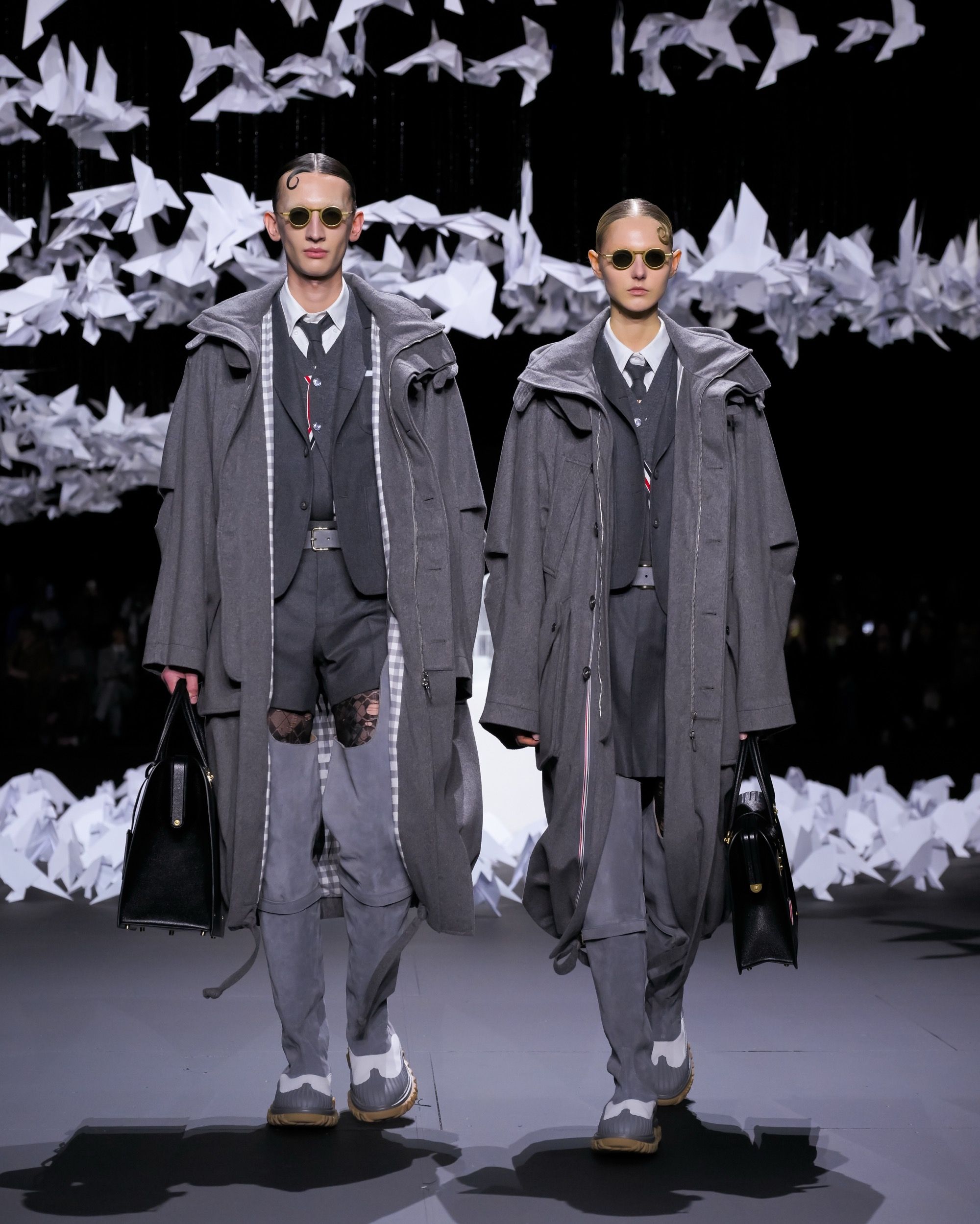 Dopo essere diventato il designer prediletto di Doechii, Thom Browne ha deciso di chiudere la NYFW con uno show che unisce teatralità e rigore sartoriale. La FW25 è un viaggio tra classicismo e surrealismo, dove la silhouette maschile tradizionale si deforma per diventare qualcos’altro. Giacche strutturate si allungano fino a sfiorare il pavimento, gonne plissettate sovrapposte si muovono a ogni passo, mentre completi in tweed si arricchiscono di dettagli ispirati al mondo dell’ornitologia. L’influenza degli uccelli è evidente in ogni elemento, dalle proporzioni alle texture, con piumaggi ricreati attraverso intrecci di bouclé e inserti di cristalli Swarovski. Il risultato è una collezione che conferma l’abilità di Browne nel trasformare il tailoring in una performance, mantenendo la sua estetica rigorosa ma sempre in evoluzione.