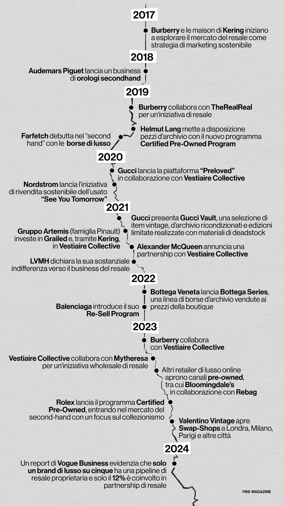 LVMH si è dichiarata sostanzialmente indifferente a questo business già nel 2021, ma negli ultimi cinque-sei anni sia Burberry che le maison di Kering hanno iniziato a flirtare con il resale sulla scorta di una strategia di marketing fortemente orientata alla sostenibilità. Nel 2019 Burberry collaborò con TheRealReal; nel 2020, Gucci lanciò la sua piattaforma "Preloved" in collaborazione con Vestiaire Collective, e l’anno successivo creò Gucci Vault, in cui si trovavano item vintage o d’archivio ricondizionati e offriva prodotti in edizione limitata realizzati con materiali di deadstock. Il progetto funzionò per certi versi, come ad esempio esaltare la bellezza dei prodotti storici e portando alla ribalta giovani e brand e designer, ma non divenne una vera e propria piattaforma di resell dato che si dedicava a pochi pezzi da collezione venduti a prezzi in linea con quelli delle boutique – e dunque veniva eliminato il lato della convenienza economica che è un po’ la base del secondhand. Nel 2021 il Gruppo Artemis della famiglia Pinault divenne investitore di Grailed e, tramite Kering, investì in Vestiaire Collective con cui poi Alexander McQueen annunciò una partnership. Nel 2022 Bottega Veneta lanciò Bottega Series, che propone borse d’archivio ma sempre ai prezzi della boutique, e Balenciaga il suo Re-Sell Program. Nel 2023 Burberry collaborò con Vestiaire Collective mentre lo scorso maggio, un altro esperimento (questo pare riuscito) si è svolto nel mondo wholesale con la partnership di Vestiaire Collective con Mytheresa, l’apertura dei canali pre-owned su retailer di lusso online e anche con quella tra Bloomingdale’s e Rebag. Lo scorso settembre fu Rolex a presentare il programma Certified Pre-Owned che gli dava accesso al vasto mercato secondario degli orologi di lusso pur con un’inclinazione verso il collezionismo. Ma, come si diceva, almeno nella moda classica, si è trattato di esperimenti. Come si legge in un report di Vogue Business: «solo un brand di lusso su cinque ha una pipeline di rivendita di proprietà del marchio, mentre solo il 12% è impegnato in partnership di rivendita».