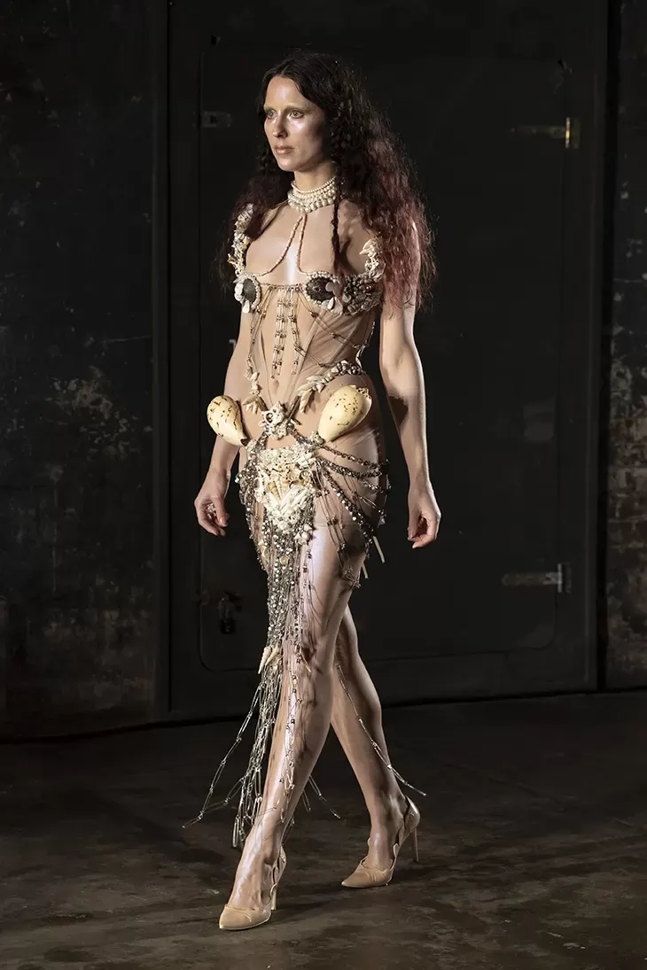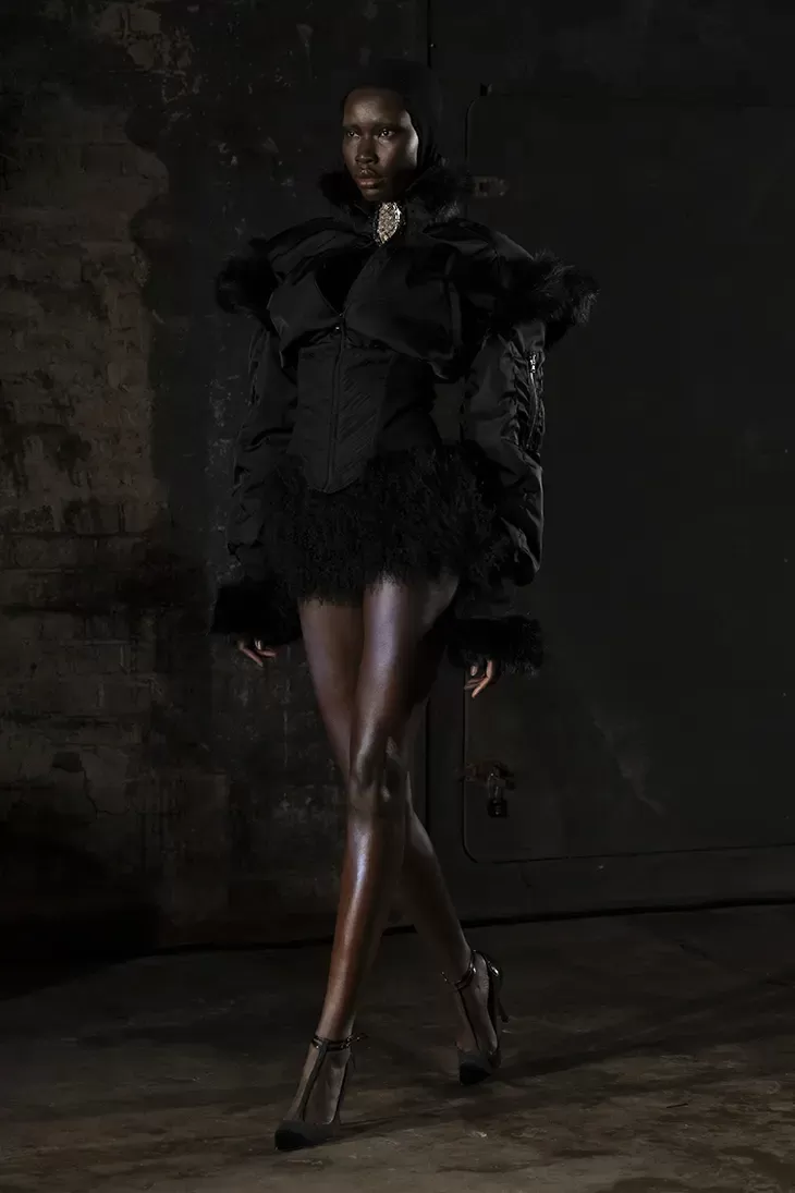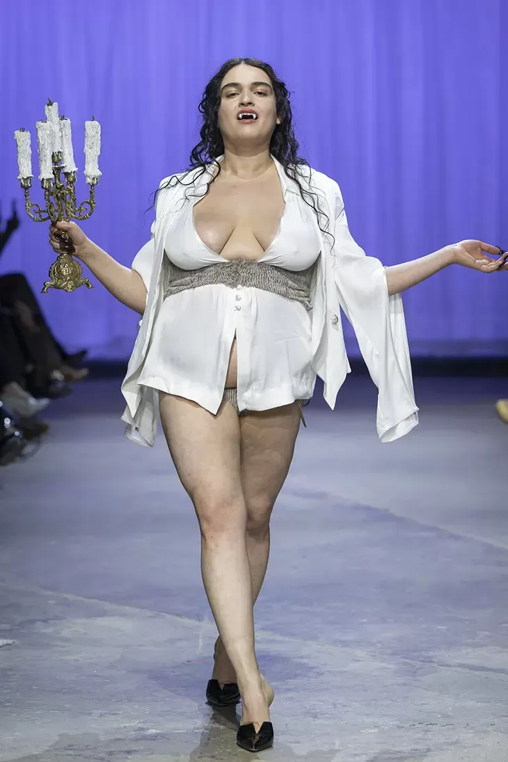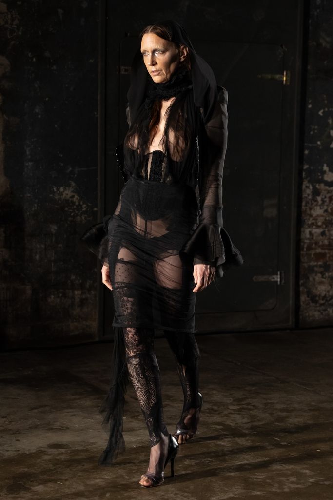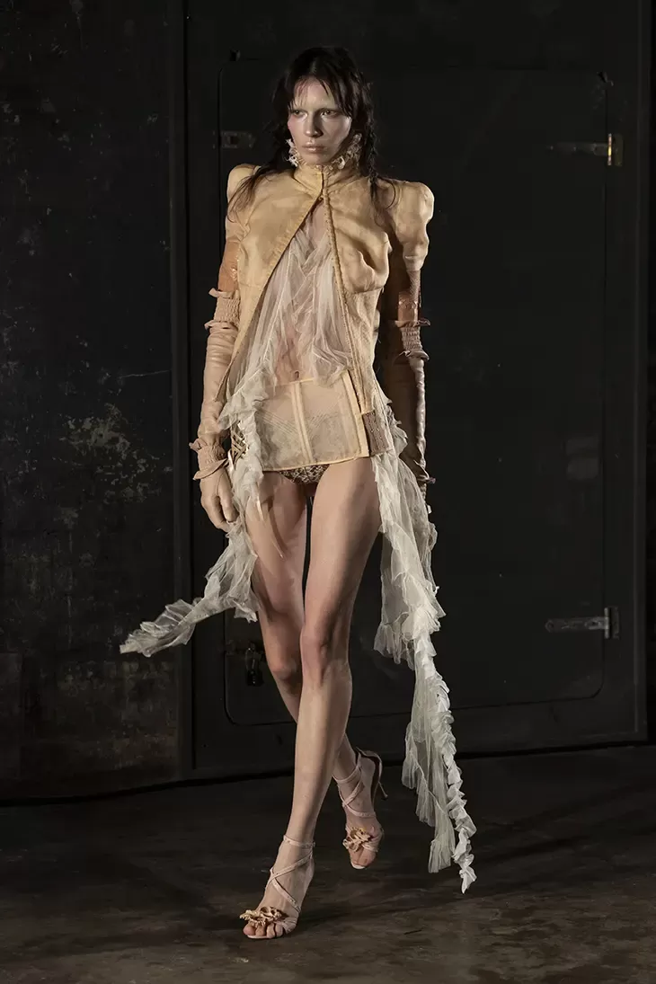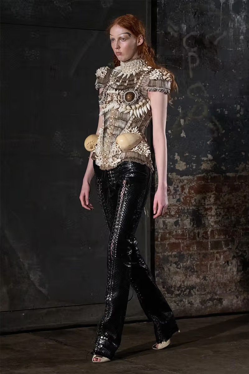 Ogni show di Dilara Findikoglu si distingue per la sua scenicità. Nella FW25, la femme fatale idealizzata dalla designer si è fatta strega, vampiro, sirena; tutto fuorché umana. I corsetti sono tornati ad abbracciare la vita delle modelle, questa volta interamente ricoperti da conchiglie in un decoro simmetrico tanto da intimidire data la sua somiglianza allo scheletro umano; cappucci e camicie bianche hanno ricordato la figura della suora, se non fosse stato per la minigonna inguinale e i tacchi a spillo argentati. Pizzo, inserti in pelle e broccato rosso hanno ricordato la sensualità di Intervista col Vampiro, e mentre abiti sinuosi bianchi e avorio ammiccavano a un romanticismo rinascimentale l'apparizione delle Converse All Star evocava il costume design divertito di Marie Antoinette. Uno degli abiti a tubino ha lasciato particolarmente il segno, realizzato in pelle color carne e interamente ricoperto di sigilli rossi, come tatuaggi sul corpo della modella. Persino l’utilizzo dei capelli, un escamotage artistico di cui i designer di ogni città stanno facendo uso nei loro ultimi show, è stato sorpredente e originale, per la realizzazione di top a mantello biondi e la decorazione di corsetti, o ancora per la realizzazione di giarrettiere fatte di sottili trecce nere.