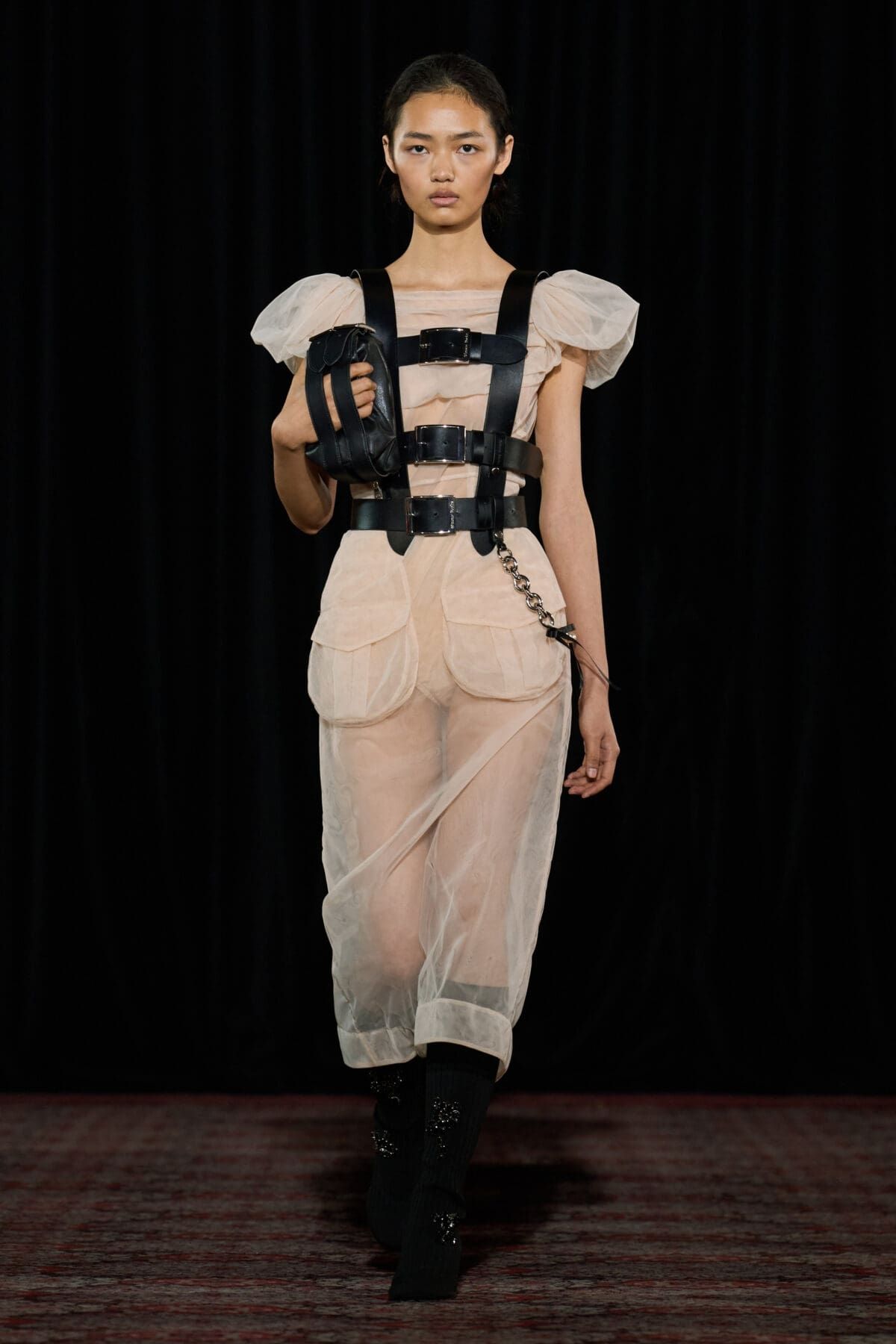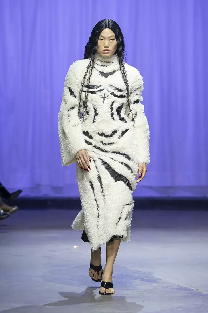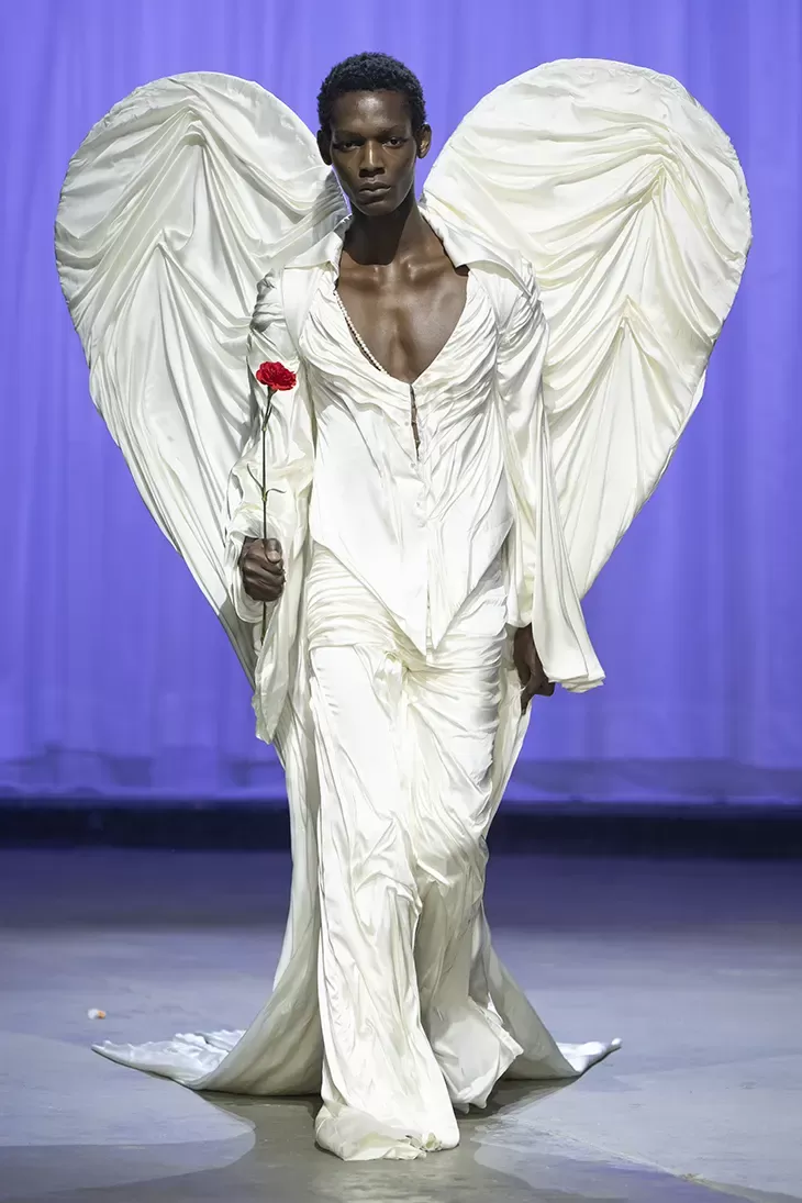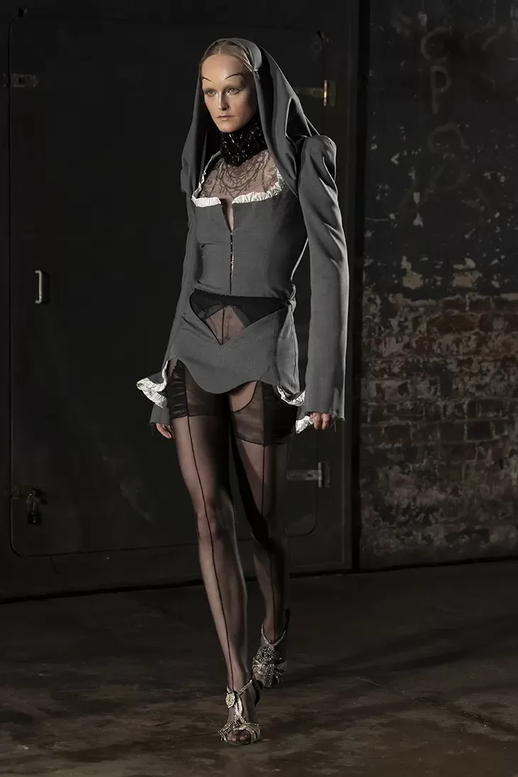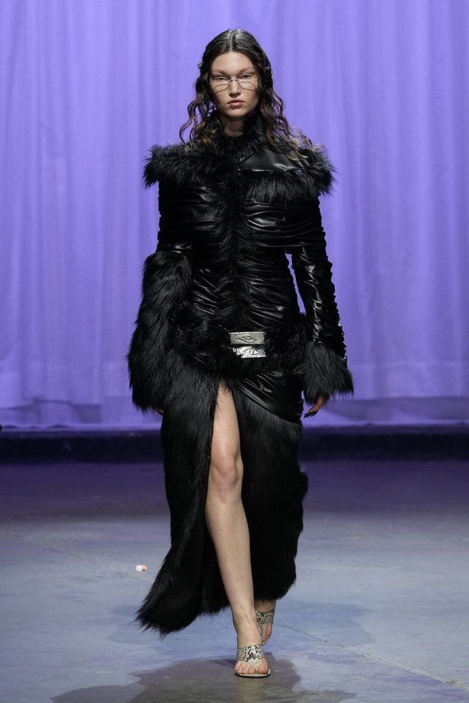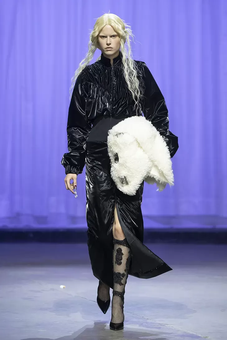 Ogni show di Dilara Findikoglu si distingue per la sua scenicità. Nella FW25, la femme fatale idealizzata dalla designer si è fatta strega, vampiro, sirena; tutto fuorché umana. I corsetti sono tornati ad abbracciare la vita delle modelle, questa volta interamente ricoperti da conchiglie in un decoro simmetrico tanto da intimidire data la sua somiglianza allo scheletro umano; cappucci e camicie bianche hanno ricordato la figura della suora, se non fosse stato per la minigonna inguinale e i tacchi a spillo argentati. Pizzo, inserti in pelle e broccato rosso hanno ricordato la sensualità di Intervista col Vampiro, e mentre abiti sinuosi bianchi e avorio ammiccavano a un romanticismo rinascimentale l'apparizione delle Converse All Star evocava il costume design divertito di Marie Antoinette. Uno degli abiti a tubino ha lasciato particolarmente il segno, realizzato in pelle color carne e interamente ricoperto di sigilli rossi, come tatuaggi sul corpo della modella. Persino l’utilizzo dei capelli, un escamotage artistico di cui i designer di ogni città stanno facendo uso nei loro ultimi show, è stato sorpredente e originale, per la realizzazione di top a mantello biondi e la decorazione di corsetti, o ancora per la realizzazione di giarrettiere fatte di sottili trecce nere.
