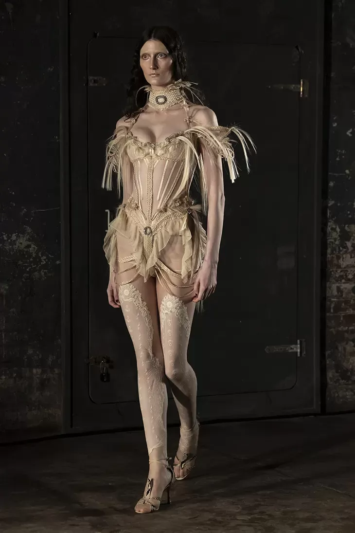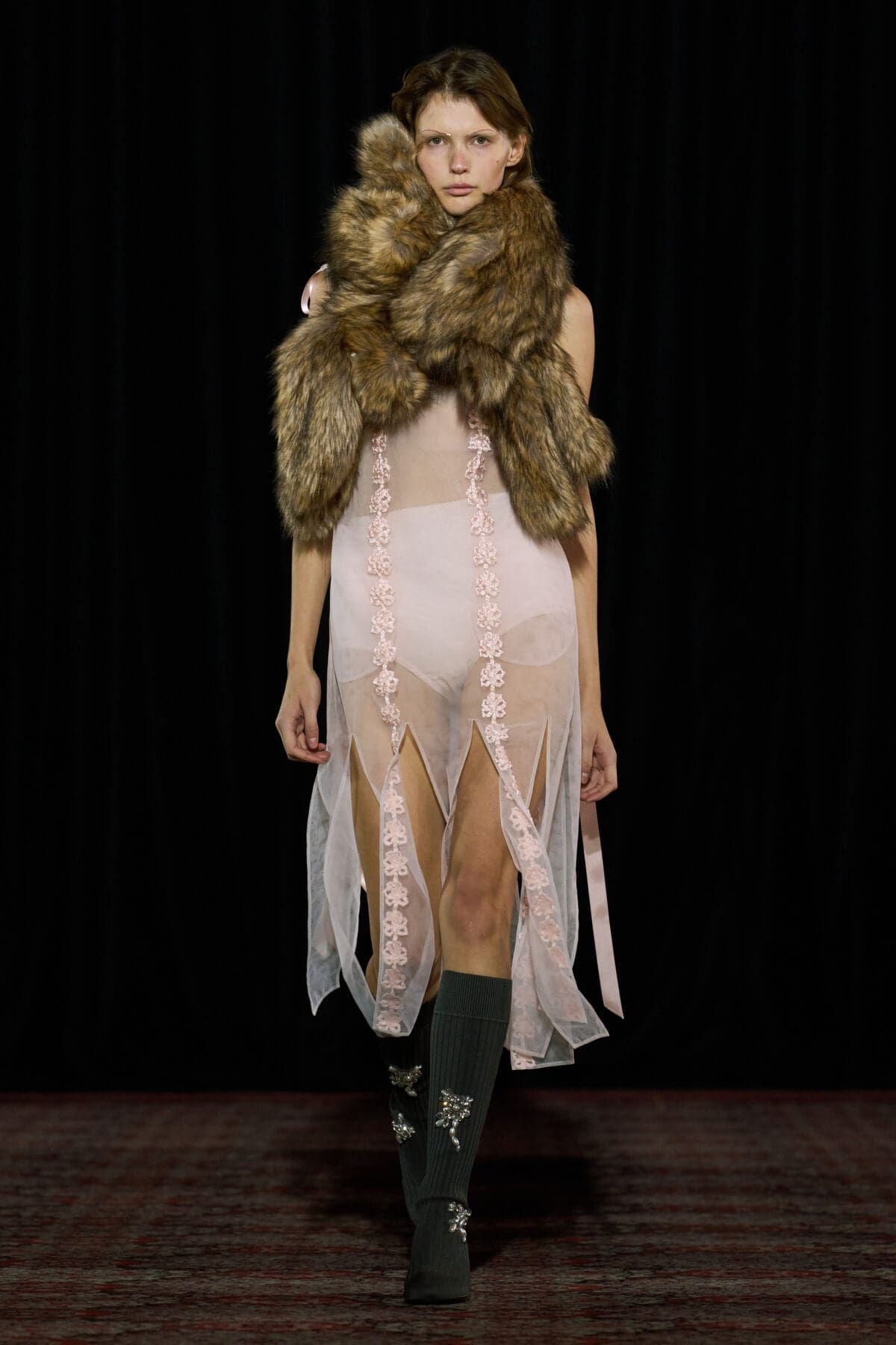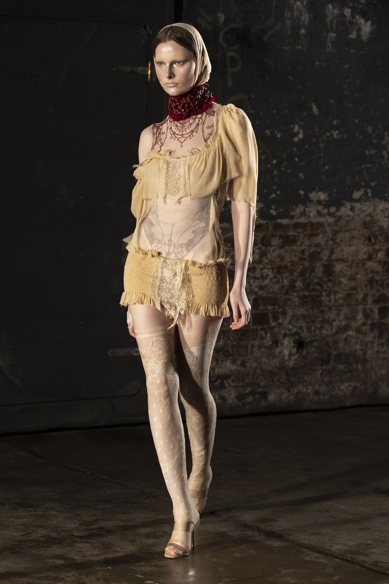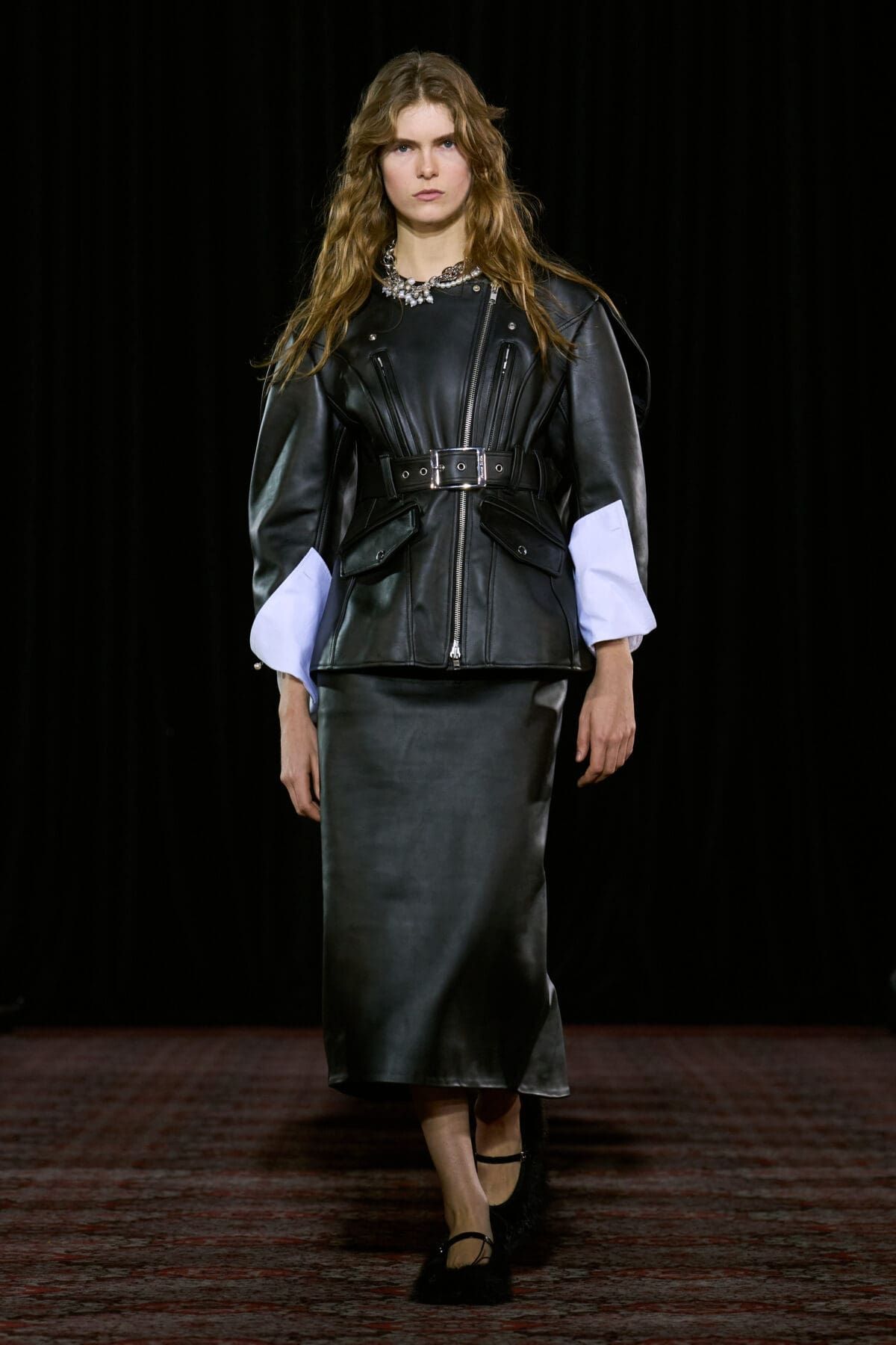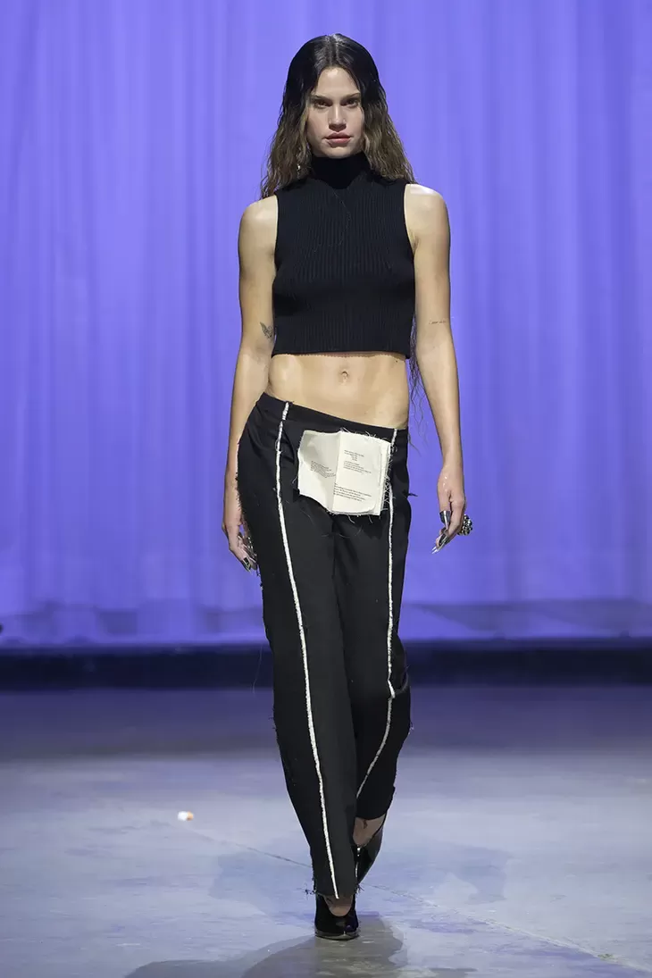 Ogni show di Dilara Findikoglu si distingue per la sua scenicità. Nella FW25, la femme fatale idealizzata dalla designer si è fatta strega, vampiro, sirena; tutto fuorché umana. I corsetti sono tornati ad abbracciare la vita delle modelle, questa volta interamente ricoperti da conchiglie in un decoro simmetrico tanto da intimidire data la sua somiglianza allo scheletro umano; cappucci e camicie bianche hanno ricordato la figura della suora, se non fosse stato per la minigonna inguinale e i tacchi a spillo argentati. Pizzo, inserti in pelle e broccato rosso hanno ricordato la sensualità di Intervista col Vampiro, e mentre abiti sinuosi bianchi e avorio ammiccavano a un romanticismo rinascimentale l'apparizione delle Converse All Star evocava il costume design divertito di Marie Antoinette. Uno degli abiti a tubino ha lasciato particolarmente il segno, realizzato in pelle color carne e interamente ricoperto di sigilli rossi, come tatuaggi sul corpo della modella. Persino l’utilizzo dei capelli, un escamotage artistico di cui i designer di ogni città stanno facendo uso nei loro ultimi show, è stato sorpredente e originale, per la realizzazione di top a mantello biondi e la decorazione di corsetti, o ancora per la realizzazione di giarrettiere fatte di sottili trecce nere.