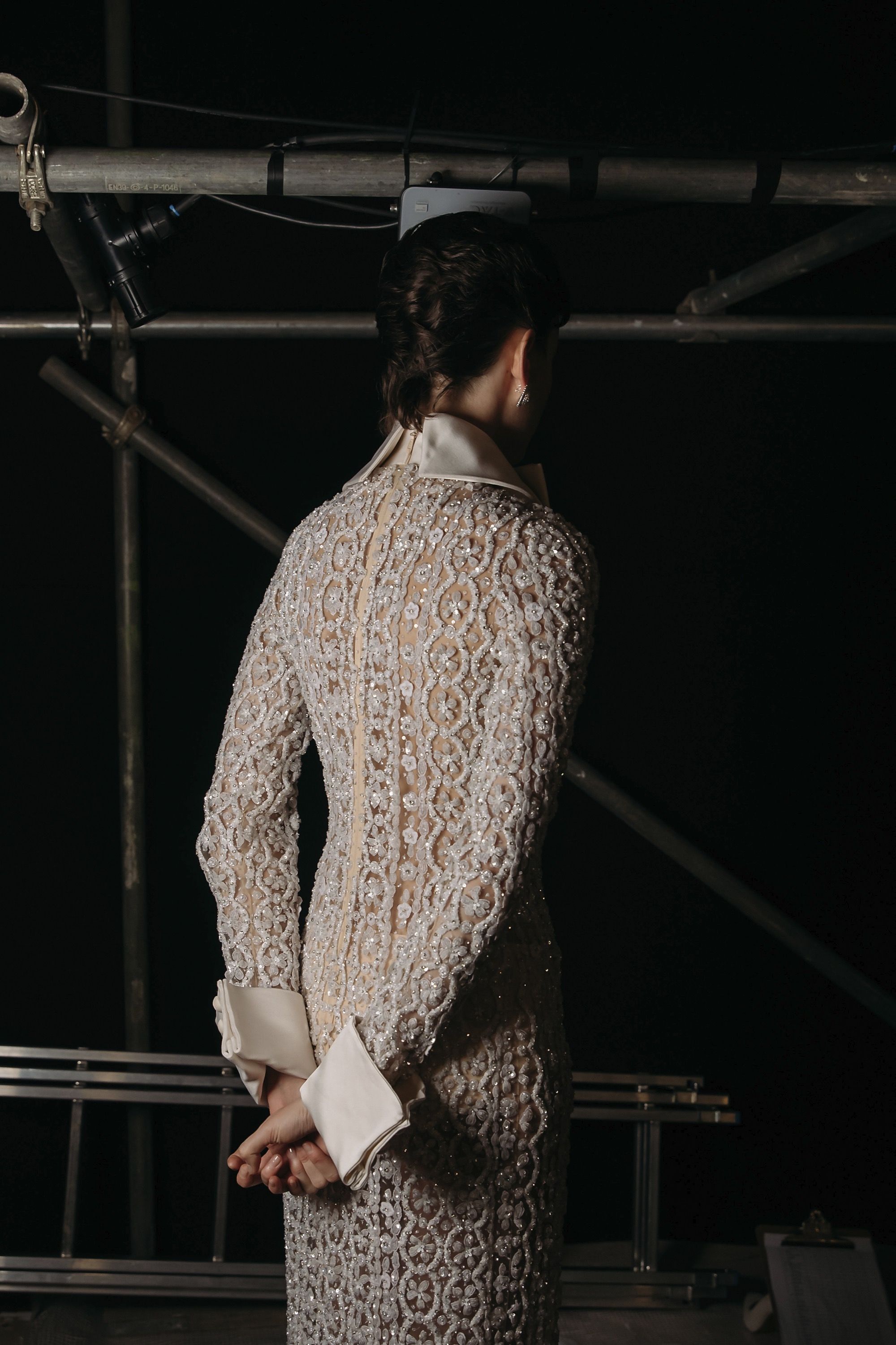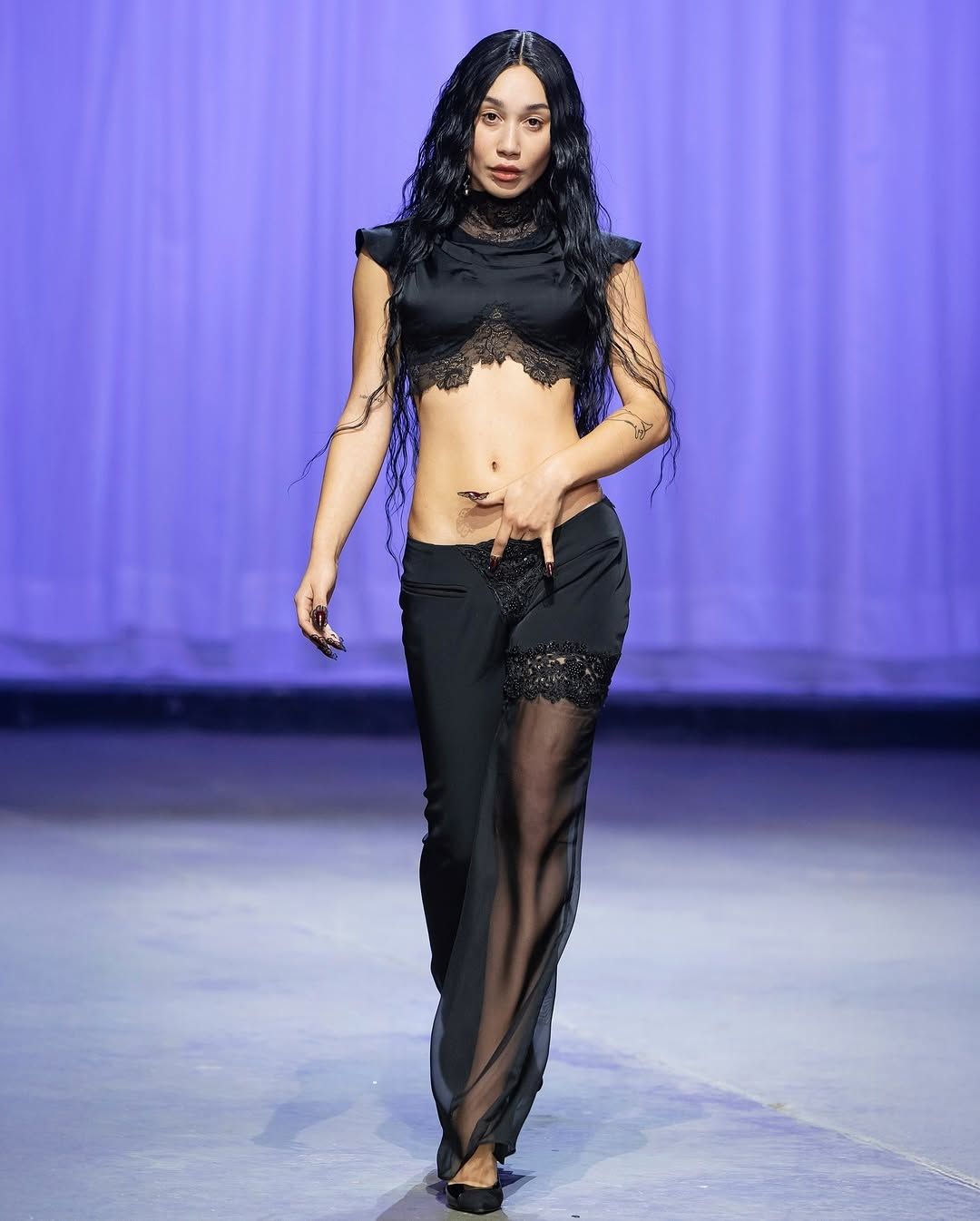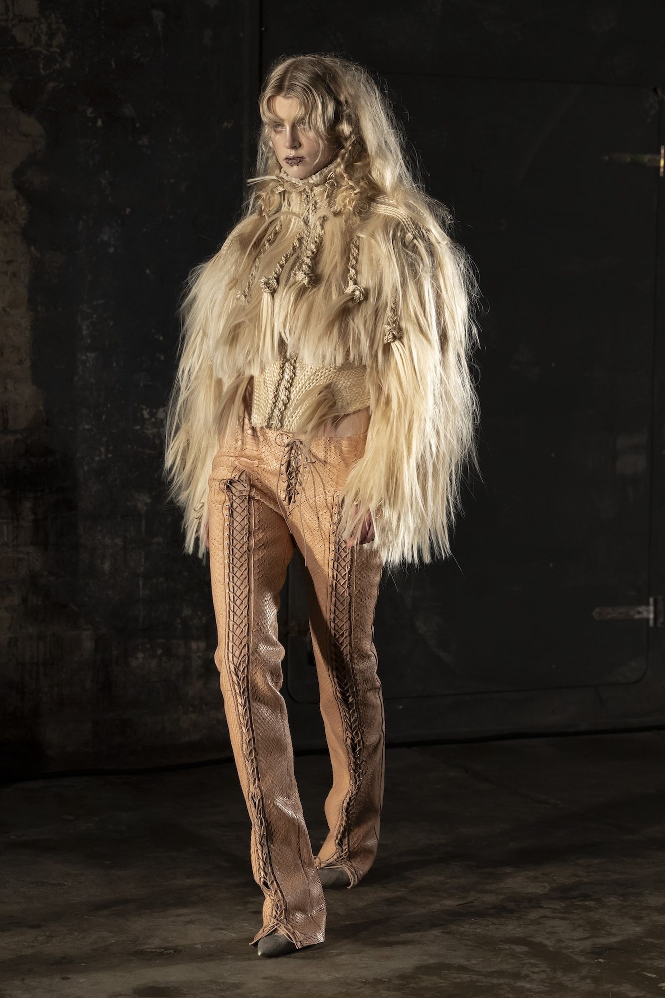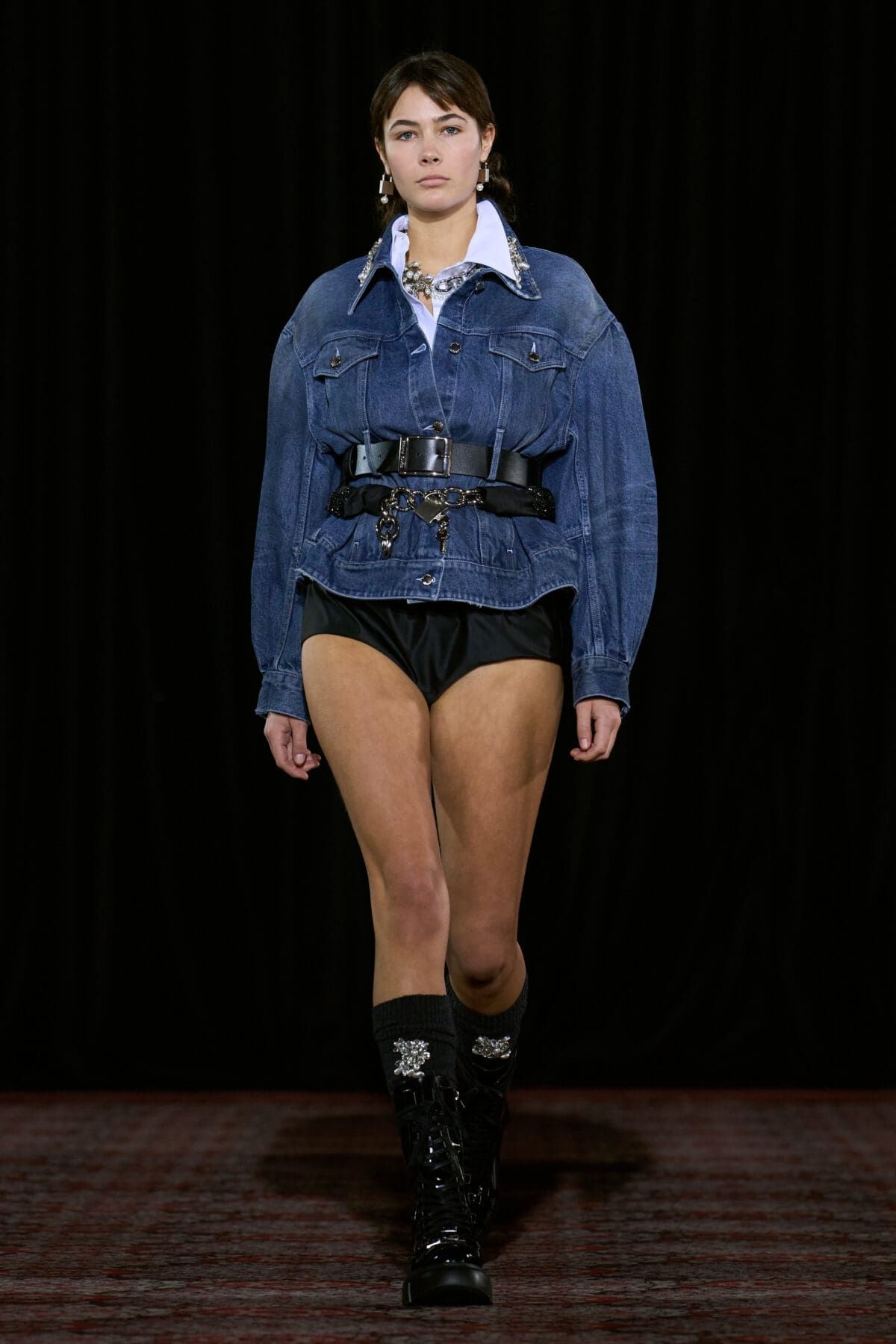Ogni show di Dilara Findikoglu si distingue per la sua scenicità. Nella FW25, la femme fatale idealizzata dalla designer si è fatta strega, vampiro, sirena; tutto fuorché umana. I corsetti sono tornati ad abbracciare la vita delle modelle, questa volta interamente ricoperti da conchiglie in un decoro simmetrico tanto da intimidire data la sua somiglianza allo scheletro umano; cappucci e camicie bianche hanno ricordato la figura della suora, se non fosse stato per la minigonna inguinale e i tacchi a spillo argentati. Pizzo, inserti in pelle e broccato rosso hanno ricordato la sensualità di Intervista col Vampiro, e mentre abiti sinuosi bianchi e avorio ammiccavano a un romanticismo rinascimentale l'apparizione delle Converse All Star evocava il costume design divertito di Marie Antoinette. Uno degli abiti a tubino ha lasciato particolarmente il segno, realizzato in pelle color carne e interamente ricoperto di sigilli rossi, come tatuaggi sul corpo della modella. Persino l’utilizzo dei capelli, un escamotage artistico di cui i designer di ogni città stanno facendo uso nei loro ultimi show, è stato sorpredente e originale, per la realizzazione di top a mantello biondi e la decorazione di corsetti, o ancora per la realizzazione di giarrettiere fatte di sottili trecce nere.