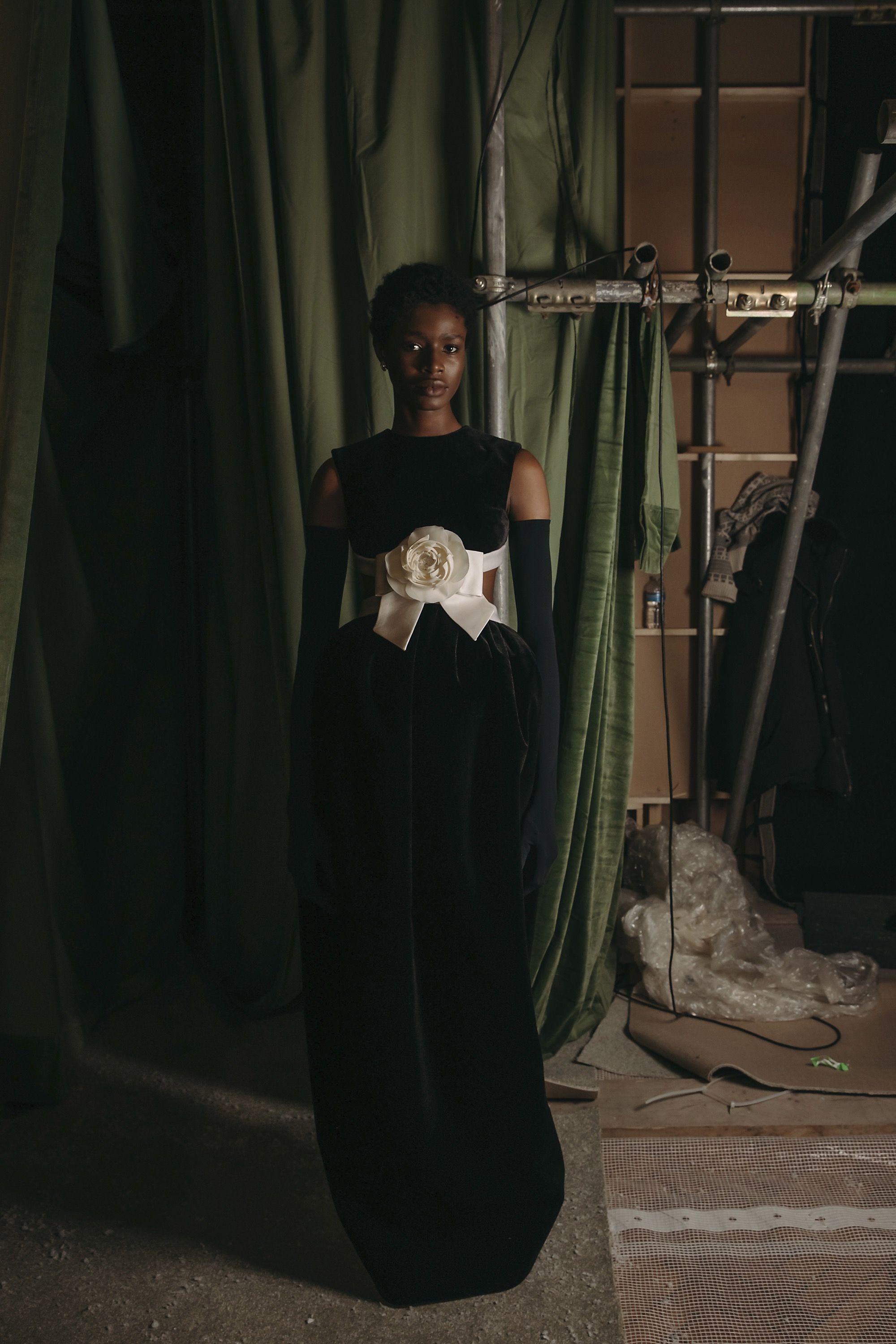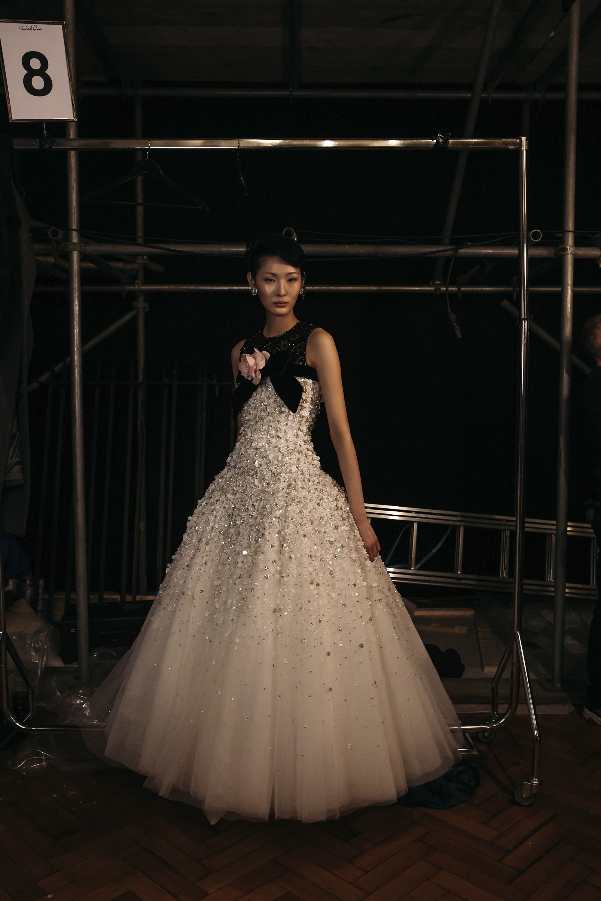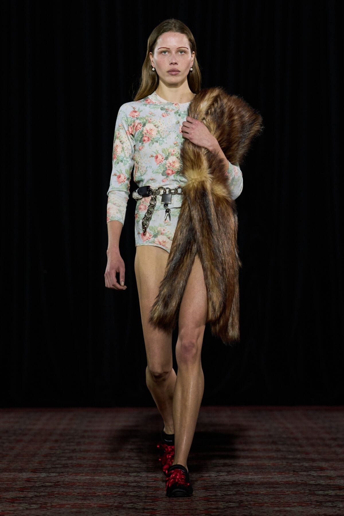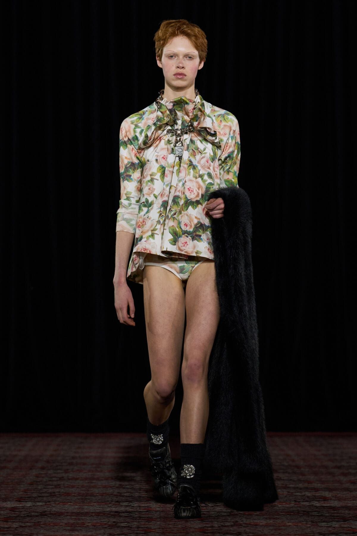 La Fw25 di Richard Quinn racconta la femminilità attraverso i ricordi e gli abiti come oggetti che durano negli anni. Su un set magnifico, di fronte a un grande sipario verde e su un tappeto di neve, hanno sfilato abiti da cerimonia tradizionali contrassegnati dal classico twist romantico per cui è ormai noto il designer britannico. I motivi floreali hanno ricoperto raso, tulle e taffetà in abiti voluminosi; maniche a palloncino, silhoette a sirena, mantelle, pietre luminose e fiocchi sono stati gli star della sfilata. Oltre a riempire i tessuti, enormi rose rosse decoravano lo scollo a barca di un abito a tubino, mentre le versioni rosa e bianca sono state utilizzate per accentuare il decolletè o il punto vita. Insomma, tra drappeggi e applique, colletti à la Pierrot e abiti à la Jackie Kennedy, la FW25 di Richard Quinn è stato un vero e proprio esercizio di stile - forse in preparazione dell’ingresso in haute couture - con la partecipazione eccezionale della it-girl degli anni '60 Penelope Tree.