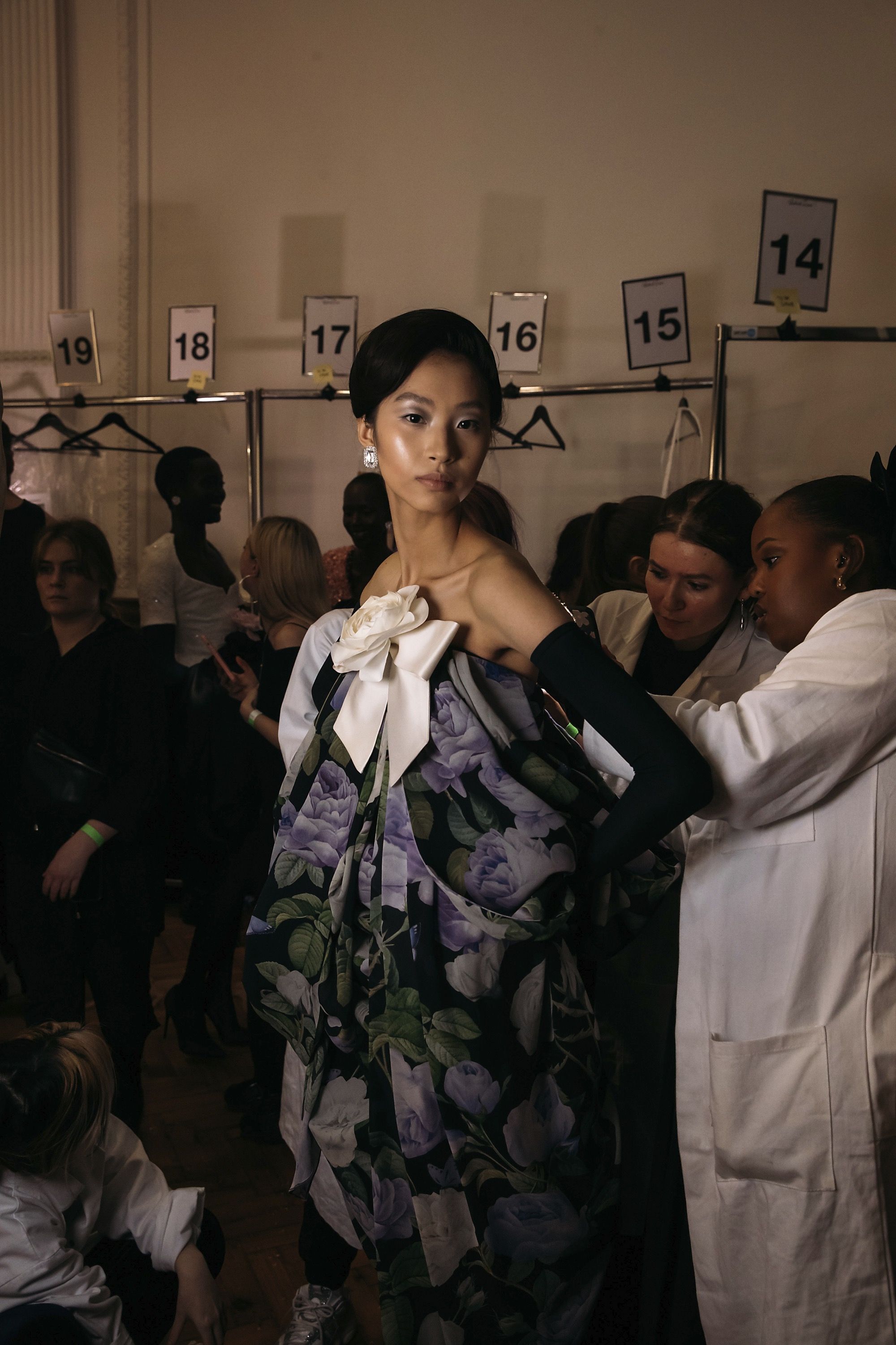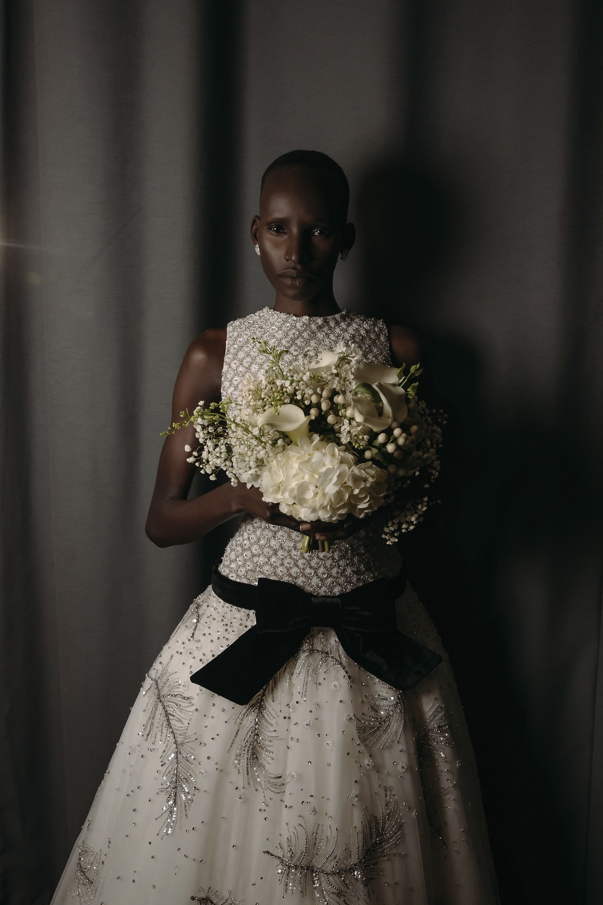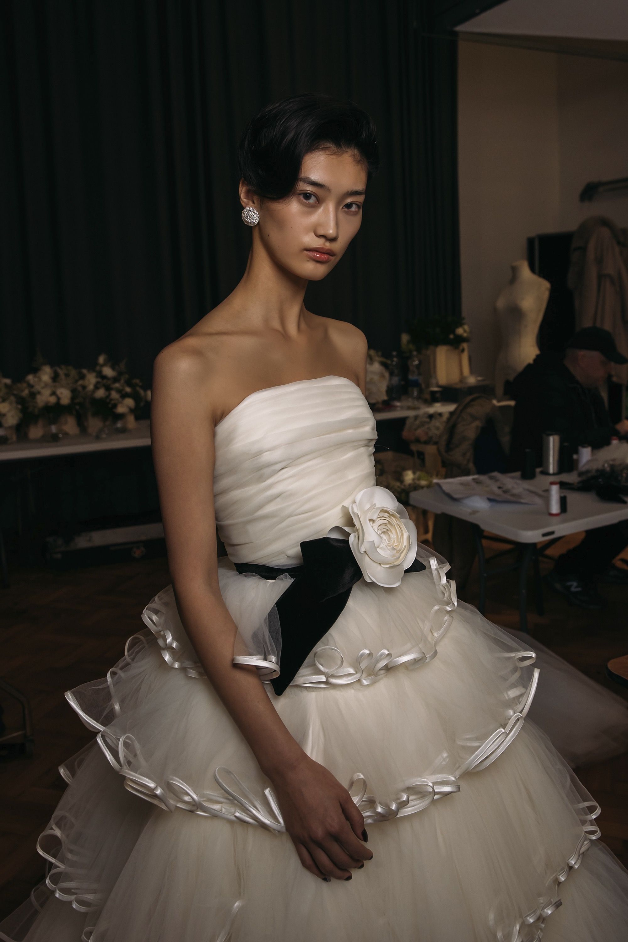 La Fw25 di Richard Quinn racconta la femminilità attraverso i ricordi e gli abiti come oggetti che durano negli anni. Su un set magnifico, di fronte a un grande sipario verde e su un tappeto di neve, hanno sfilato abiti da cerimonia tradizionali contrassegnati dal classico twist romantico per cui è ormai noto il designer britannico. I motivi floreali hanno ricoperto raso, tulle e taffetà in abiti voluminosi; maniche a palloncino, silhoette a sirena, mantelle, pietre luminose e fiocchi sono stati gli star della sfilata. Oltre a riempire i tessuti, enormi rose rosse decoravano lo scollo a barca di un abito a tubino, mentre le versioni rosa e bianca sono state utilizzate per accentuare il decolletè o il punto vita. Insomma, tra drappeggi e applique, colletti à la Pierrot e abiti à la Jackie Kennedy, la FW25 di Richard Quinn è stato un vero e proprio esercizio di stile - forse in preparazione dell’ingresso in haute couture - con la partecipazione eccezionale della it-girl degli anni '60 Penelope Tree.