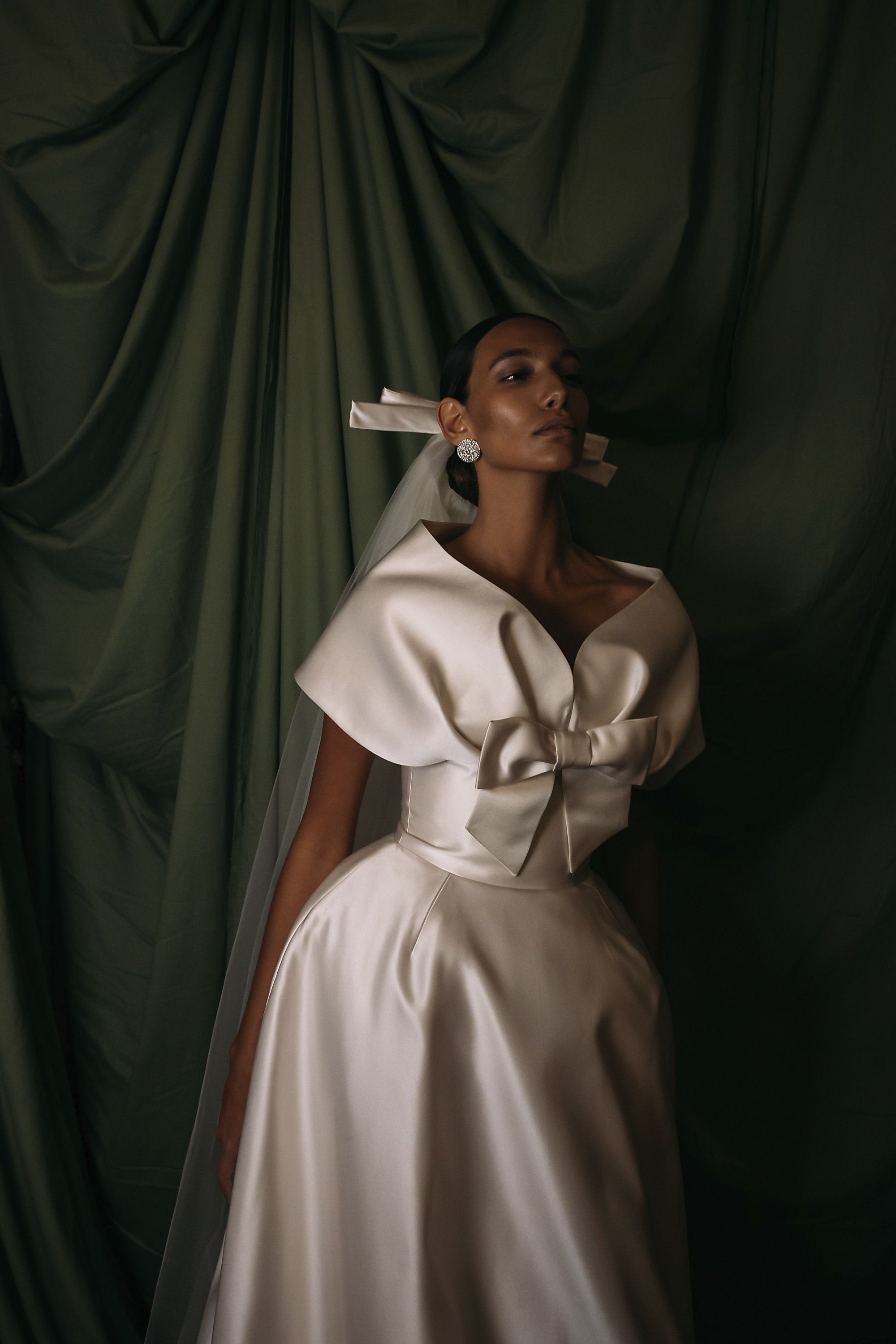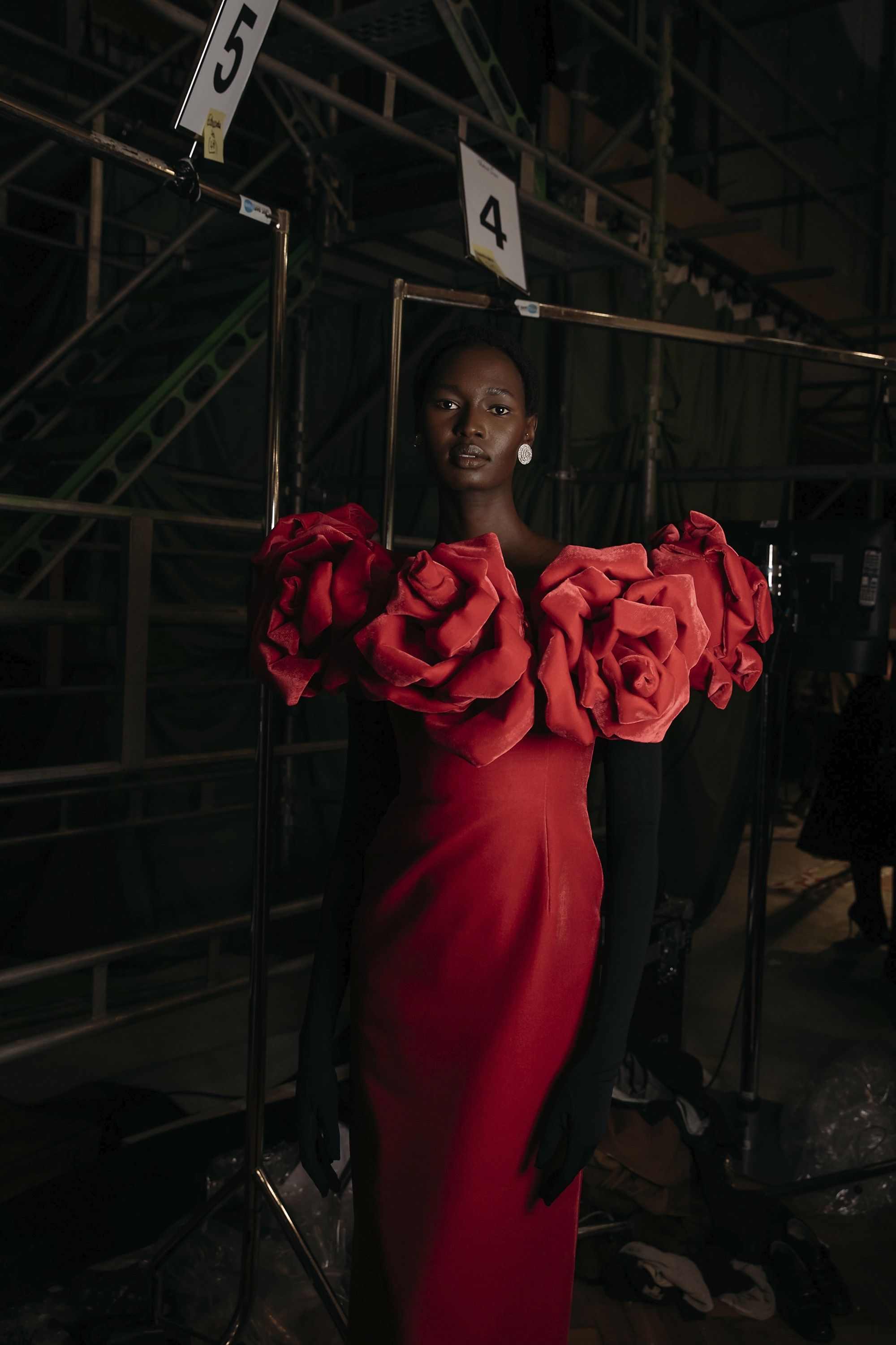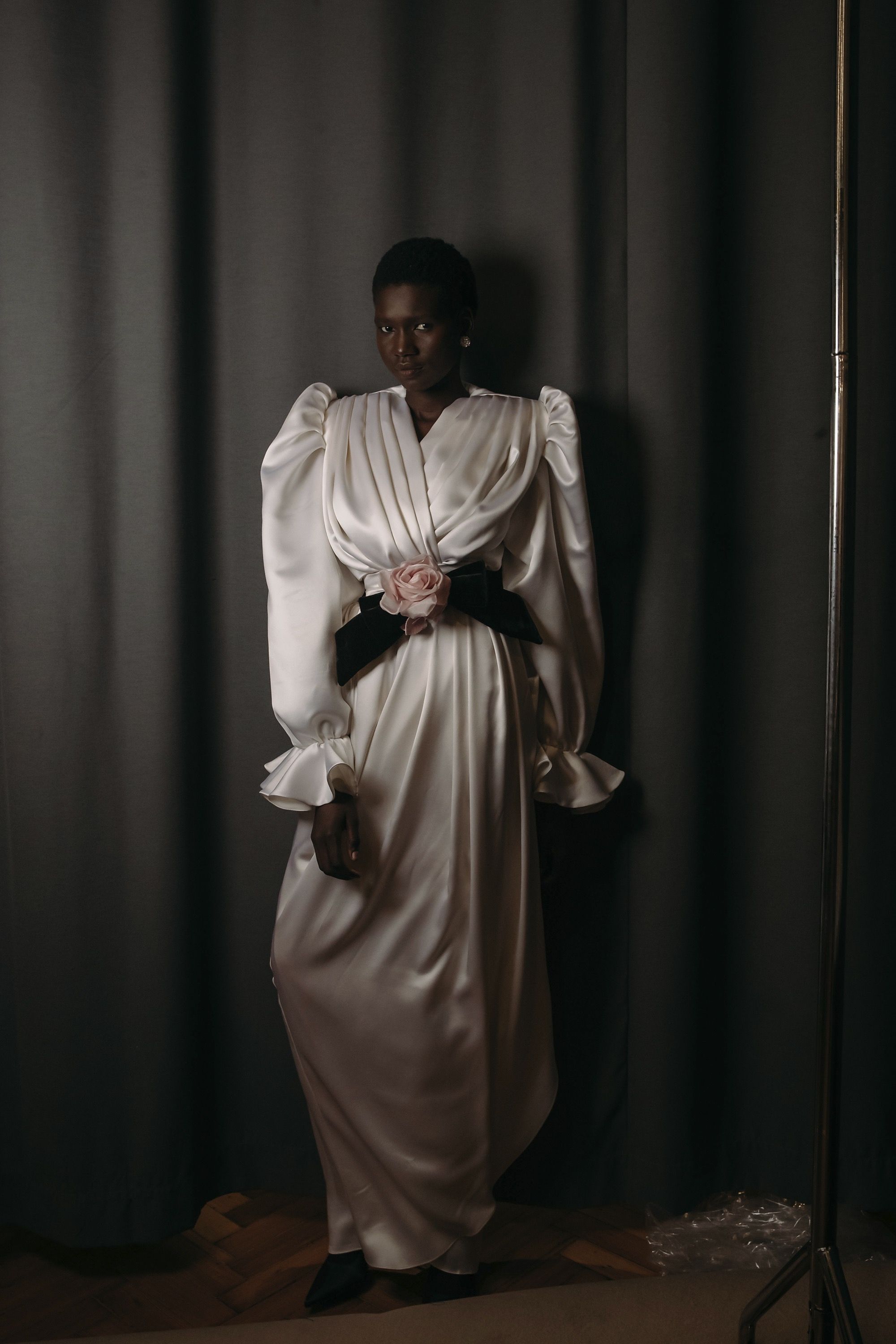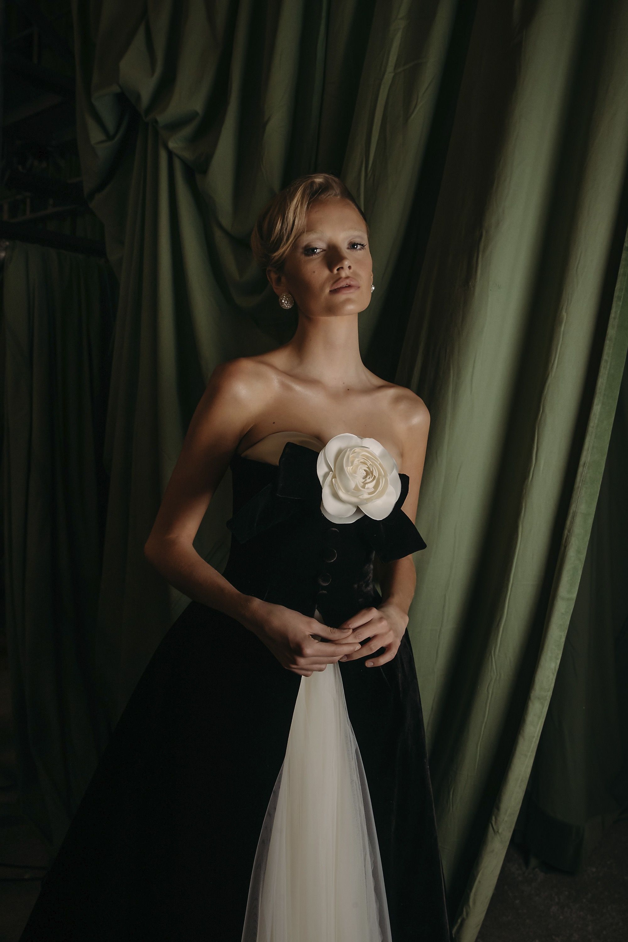 La Fw25 di Richard Quinn racconta la femminilità attraverso i ricordi e gli abiti come oggetti che durano negli anni. Su un set magnifico, di fronte a un grande sipario verde e su un tappeto di neve, hanno sfilato abiti da cerimonia tradizionali contrassegnati dal classico twist romantico per cui è ormai noto il designer britannico. I motivi floreali hanno ricoperto raso, tulle e taffetà in abiti voluminosi; maniche a palloncino, silhoette a sirena, mantelle, pietre luminose e fiocchi sono stati gli star della sfilata. Oltre a riempire i tessuti, enormi rose rosse decoravano lo scollo a barca di un abito a tubino, mentre le versioni rosa e bianca sono state utilizzate per accentuare il decolletè o il punto vita. Insomma, tra drappeggi e applique, colletti à la Pierrot e abiti à la Jackie Kennedy, la FW25 di Richard Quinn è stato un vero e proprio esercizio di stile - forse in preparazione dell’ingresso in haute couture - con la partecipazione eccezionale della it-girl degli anni '60 Penelope Tree.