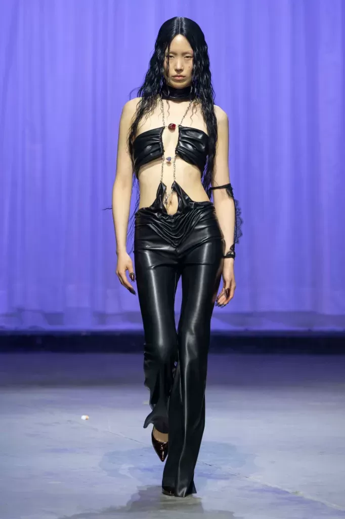 Se Dilara Findikoglu ha prodotto dei personaggi fantastici per la FW25, Di Petsa ha spinto l’acceleratore sulla fantasia arrivando a realizzare dei veri e propri costumi di scena. In Reflections of Desire, la designer greca Dimitra Petsa è tornata a parlare della sensualità femminile con un ritrovato senso politico. Partendo dalla mitologia, la nuova collezione esplora le protagoniste storiche delle tenebre, dalle sirene alle streghe, dalle vampiresse alle dee greche. L’iconografia antica si è scontrata con la realtà grazie all’utilizzo di pesanti trasparenze, di silhouette dinamiche nonché del moderno wet look per cui la designer è ormai famosa. Con questa collezione la designer ha dimostrato di essere diventata più matura e sicura dei propri valori, tra cui le proprie radici, celebrate a fine show con una danza tradizionale greca.