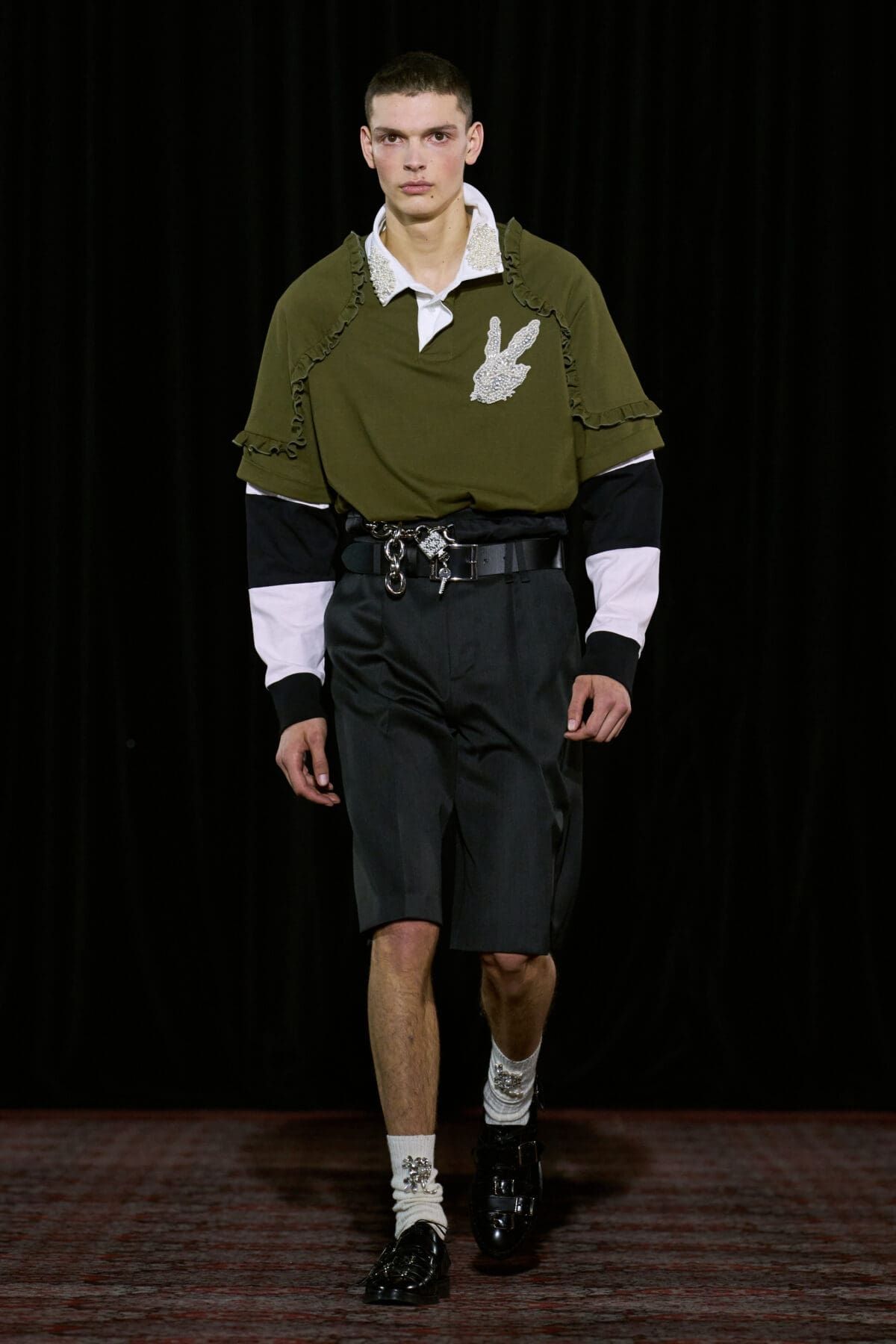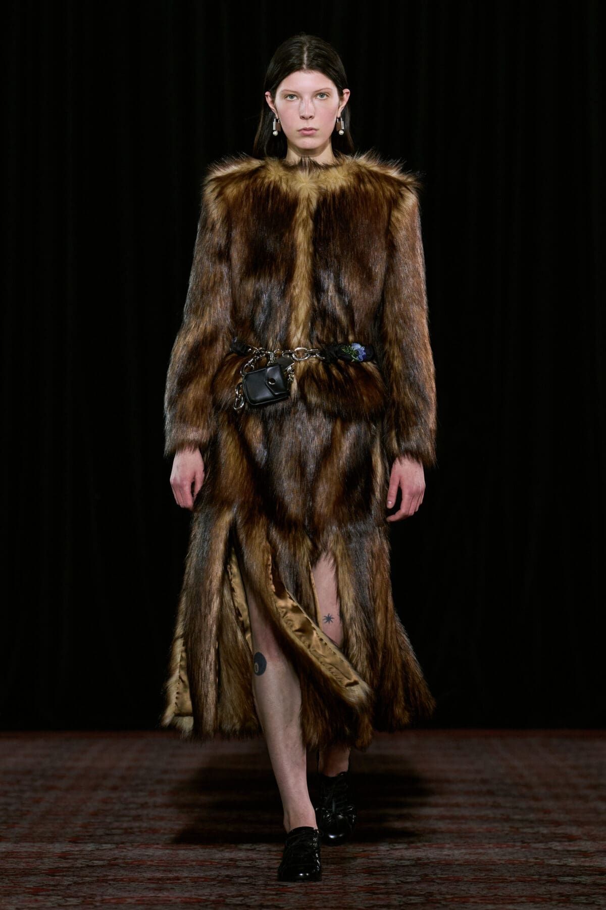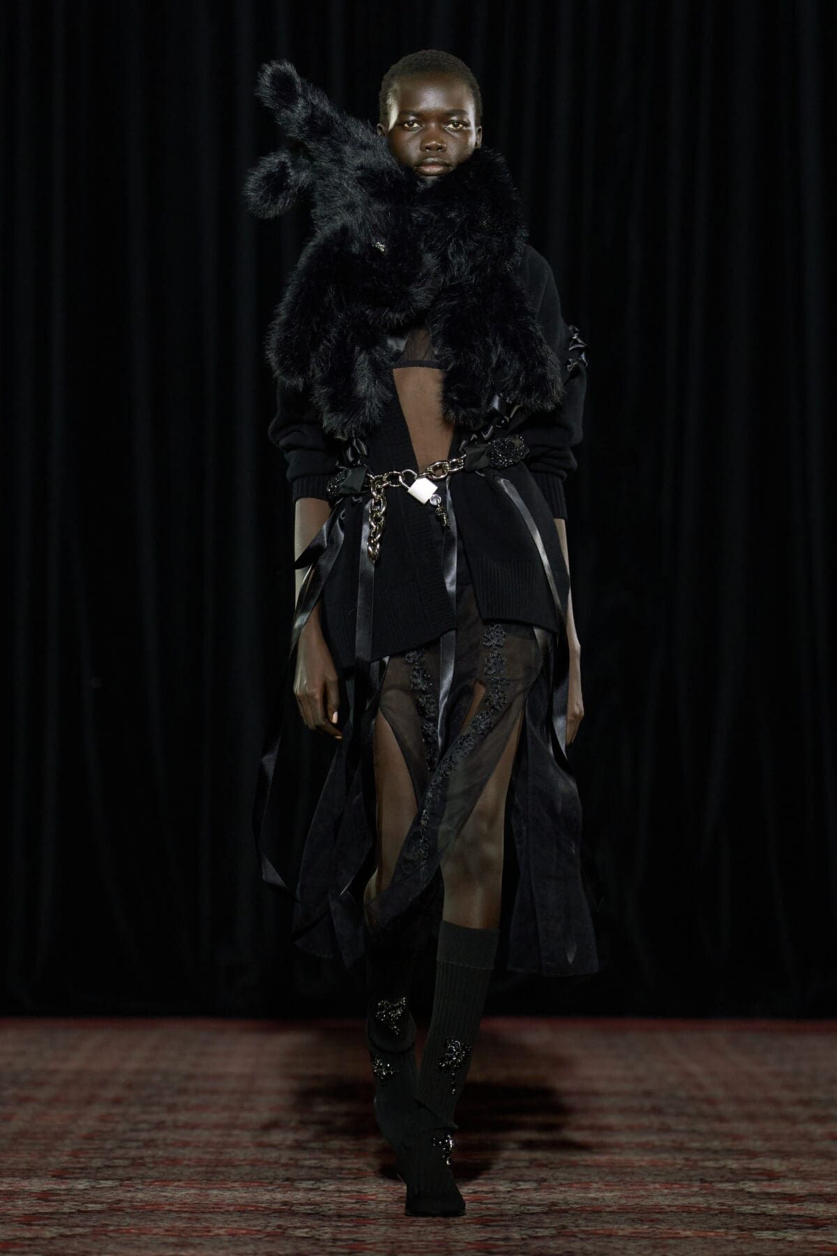 Se si cercano accessori o scarpe ironici ma affascinanti, con Simone Rocha non si sbaglia. Nonostante nelle ultime collezioni la designer irlandese abbia intrapreso una direzione decisamente dark, fatta di biker jacket e look total black (questa volta sono comparsi anche un paio di maglie da rugby impreziosite da perline e balze), lo spirito iper-femminile, simpatico e sentimentale di Rocha brilla ancora. Camicie da notte rosa pastello sono state coperte da sciarpe e lunghi cappotti di pelliccia marrone o decorae da imbracature in pelle nera. Le cinture sono state il fil rouge della collezione, spesse e sovrapposte sui fianchi delle modelle ma anche sulle borse e gli accessori. Giacche di tweed dall’animo vintage sono state modernizzate da mini-pant in pelliccia, mentre loden in lana spessa, parka, abiti e camicie in raso anni ’80 sono stati resi giovani da catene e gioielli in metallo. Assieme alla cinture è stato protagonista il coniglio, una borsa peluche declinata in più e più colori, dimensioni e tessuti. Il tema della collezione? Gli archetipi liceali più amati di sempre, tra emo, tomboy, nerd, ribelli e sportivi.