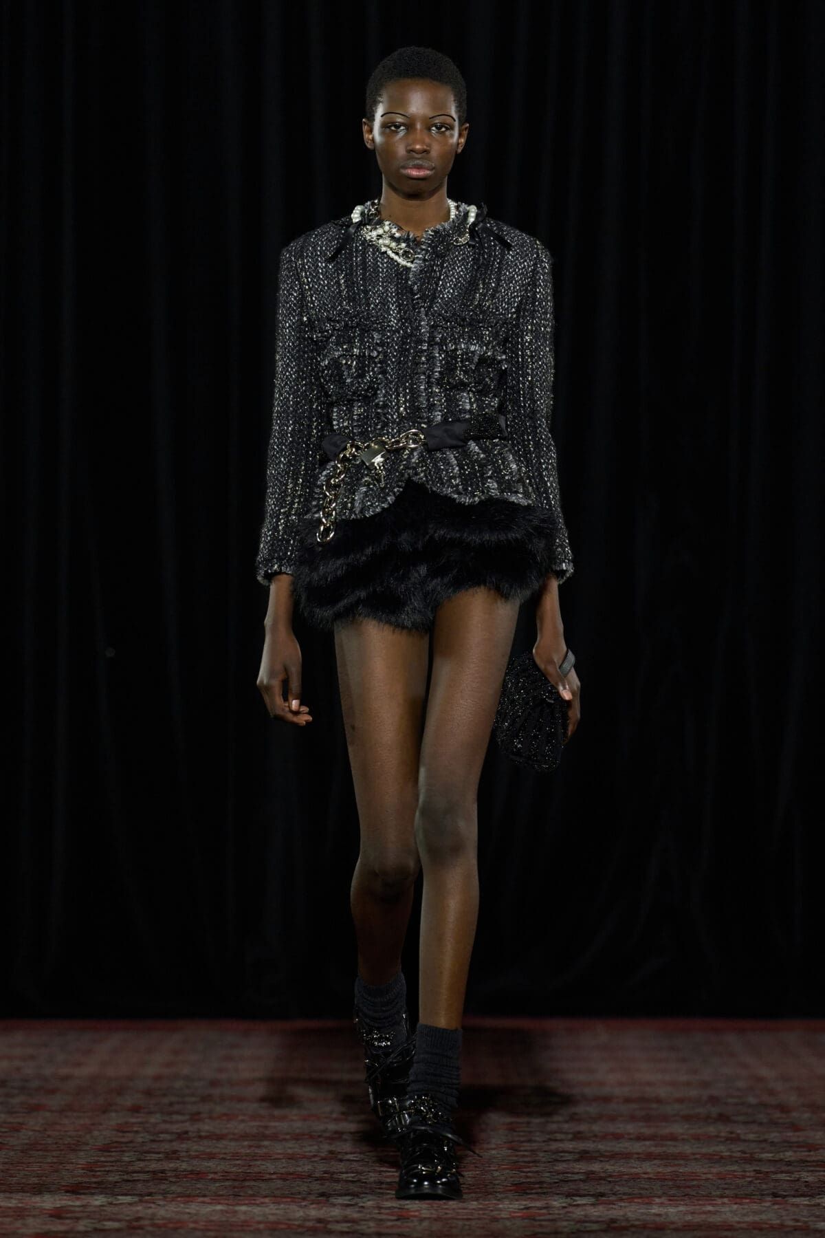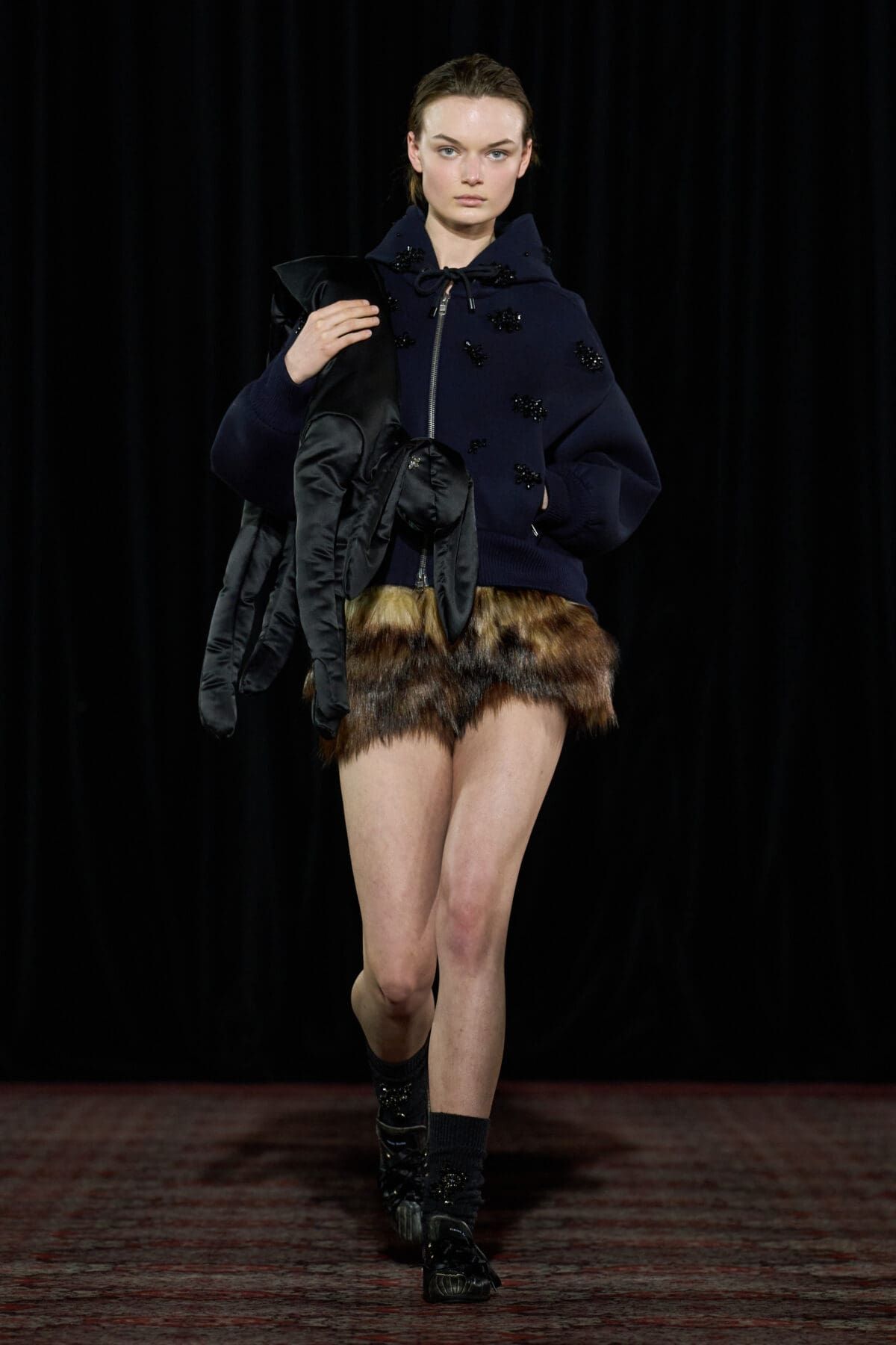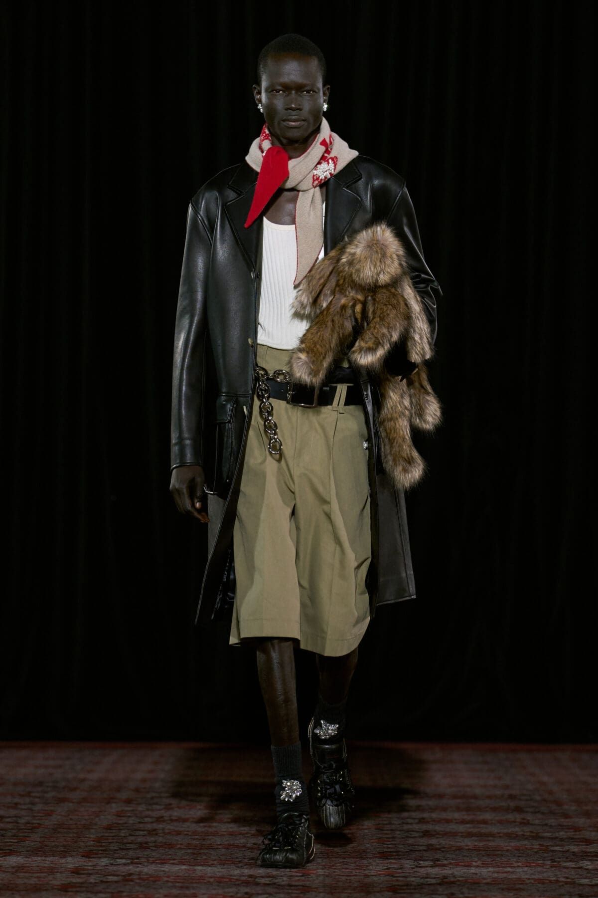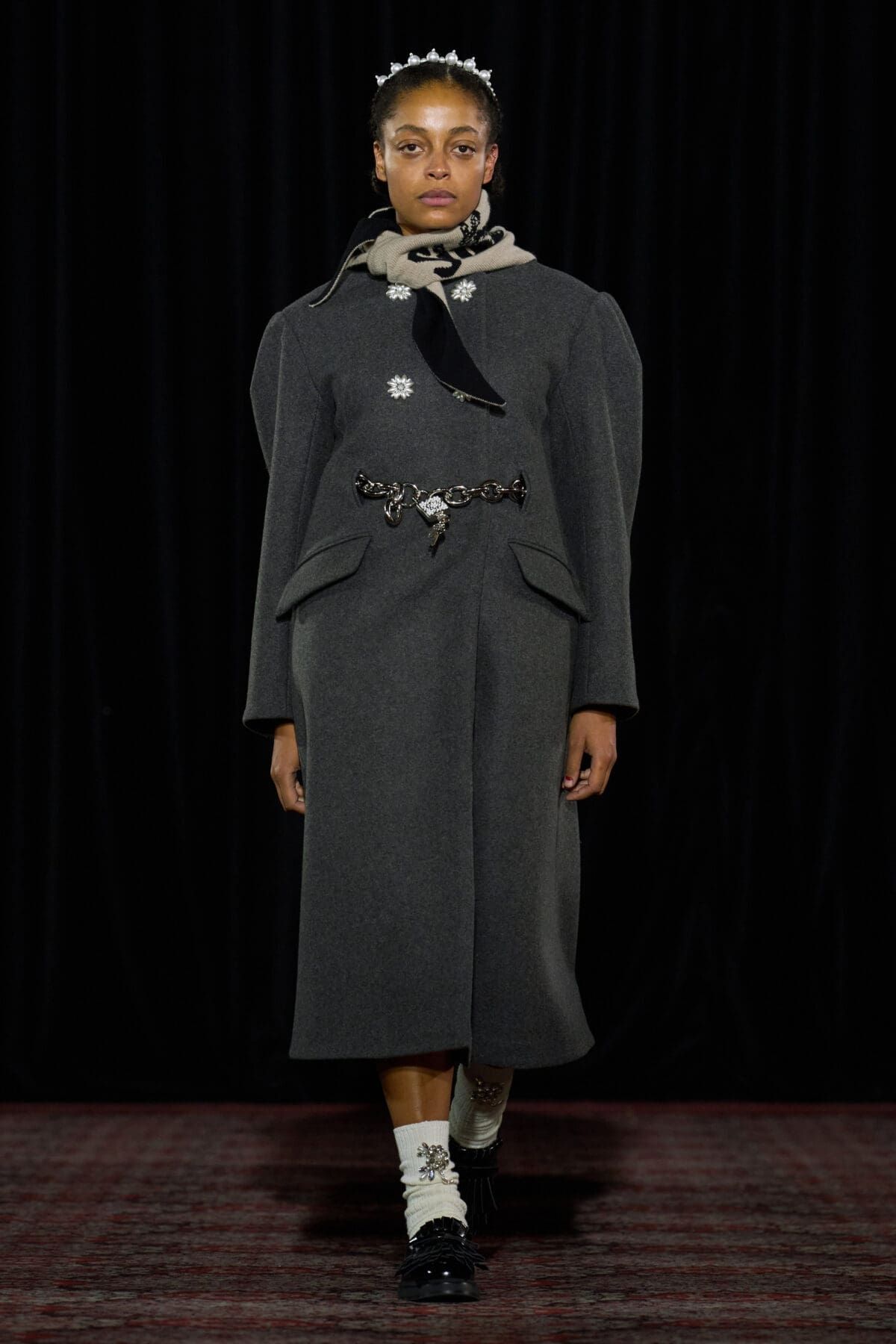 Se si cercano accessori o scarpe ironici ma affascinanti, con Simone Rocha non si sbaglia. Nonostante nelle ultime collezioni la designer irlandese abbia intrapreso una direzione decisamente dark, fatta di biker jacket e look total black (questa volta sono comparsi anche un paio di maglie da rugby impreziosite da perline e balze), lo spirito iper-femminile, simpatico e sentimentale di Rocha brilla ancora. Camicie da notte rosa pastello sono state coperte da sciarpe e lunghi cappotti di pelliccia marrone o decorae da imbracature in pelle nera. Le cinture sono state il fil rouge della collezione, spesse e sovrapposte sui fianchi delle modelle ma anche sulle borse e gli accessori. Giacche di tweed dall’animo vintage sono state modernizzate da mini-pant in pelliccia, mentre loden in lana spessa, parka, abiti e camicie in raso anni ’80 sono stati resi giovani da catene e gioielli in metallo. Assieme alla cinture è stato protagonista il coniglio, una borsa peluche declinata in più e più colori, dimensioni e tessuti. Il tema della collezione? Gli archetipi liceali più amati di sempre, tra emo, tomboy, nerd, ribelli e sportivi.
