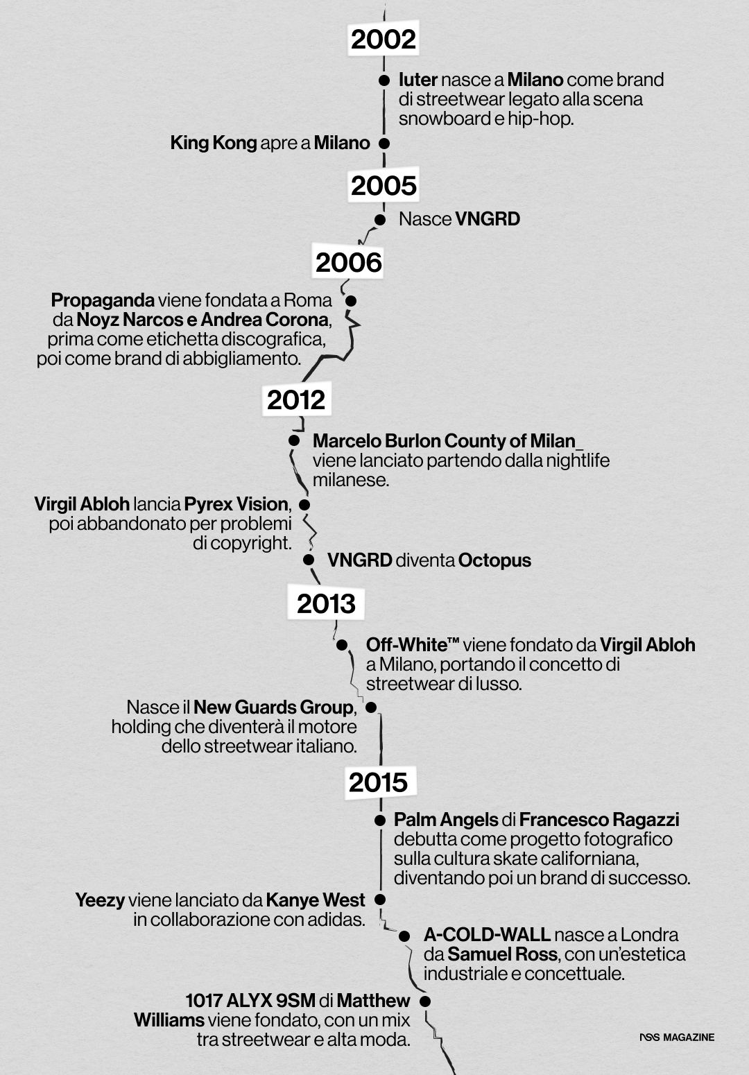 Altri esempi di streetwear brand locali nati nel contesto milanese sono Propaganda, nato nel 2006, grazie a Noyz Narcos e Andrea Corona. Il loro progetto che si è evoluto da etichetta discografica a network di creativi, agenzia di booking e brand di streetwear. Nato a Roma, anche quella di Propaganda è una storia underground: la svolta avviene con l’apertura del primo store a Milano, che inizialmente vendeva esclusivamente sul merchandising del rapper. In poco tempo, la visibilità di Propaganda aumenta, con il logo del serpente che diventa un'icona sempre più riconoscibile tra i giovani. Negli ultimi anni, l'hype attorno al brand è però diminuito così come l'attenzione mediatica, anche se Propaganda rimane un punto di riferimento enorme per tutti i fan del rap italiano. Mentre un fenomeno particolare è stato Iuter, vero OG della scena streetwear italiana nato nel 2002 come logo per una crew di snowboard e diventato uno dei marchi storici di streetwear più importanti d'Italia. Fondato da Alberto Leoni e Andrea Torella, la sua crescita è stata organica, spinta dalle radici nell'hip-hop e negli action sport. Negli anni, ha espanso la sua proposta e collaborato con artisti e brand. L'ultima collaborazione risale a tre anni fa, per l’anniversario dei 20 anni del brand celebrato con una collaborazione con Fabri Fibra.