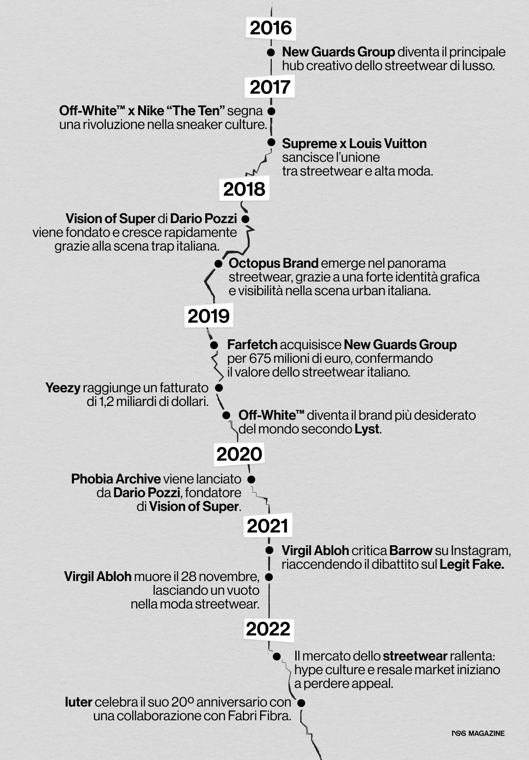 La scarsità pilotata, le collaborazioni in edizione limitata e le strategie di distribuzione frammentata hanno trasformato ogni oggetto in una valuta, il cui prezzo era deciso non più dal marchio ma dalla domanda ossessiva del pubblico. Il successo non si misurava più attraverso la vendita diretta, ma attraverso la febbre del resell, dove sneaker e capi diventavano asset speculativi, soggetti a un’impennata di valore sul mercato secondario. Questo nuovo approccio alla moda fu esemplificato più di tutti dal New Guards Group: il primo seme del gruppo fu gettato nel 2012 da Marcelo Burlon, ai tempi il re della nightlife milanese, che lanciò una collezione di merch che divenne in breve la divisa dei club kids milanesi. Quattro anni dopo, Marcelo Burlon - County of Milan aveva un fatturato di 35 milioni di euro e, insieme a Claudio Antonioli e Davide De Giglio, aveva fondato un nuovo conglomerato, il New Guards Group, sotto il cui tetto si sviluppavano gli streetwear brand più di rottura del momento: Off-White, Palm Angels, Unravel Project ed Heron Preston. Più tardi si aggiunsero anche Opening Ceremony e Ambush. Nel 2019, il gruppo venne acquisito da Farfetch, ma fu solo l’inizio di un momento di decadenza che culminò poi, come vedremo, nel collasso del gigante dell’e-commerce e nello sbandamento dell’originale line-up di brand e designer.