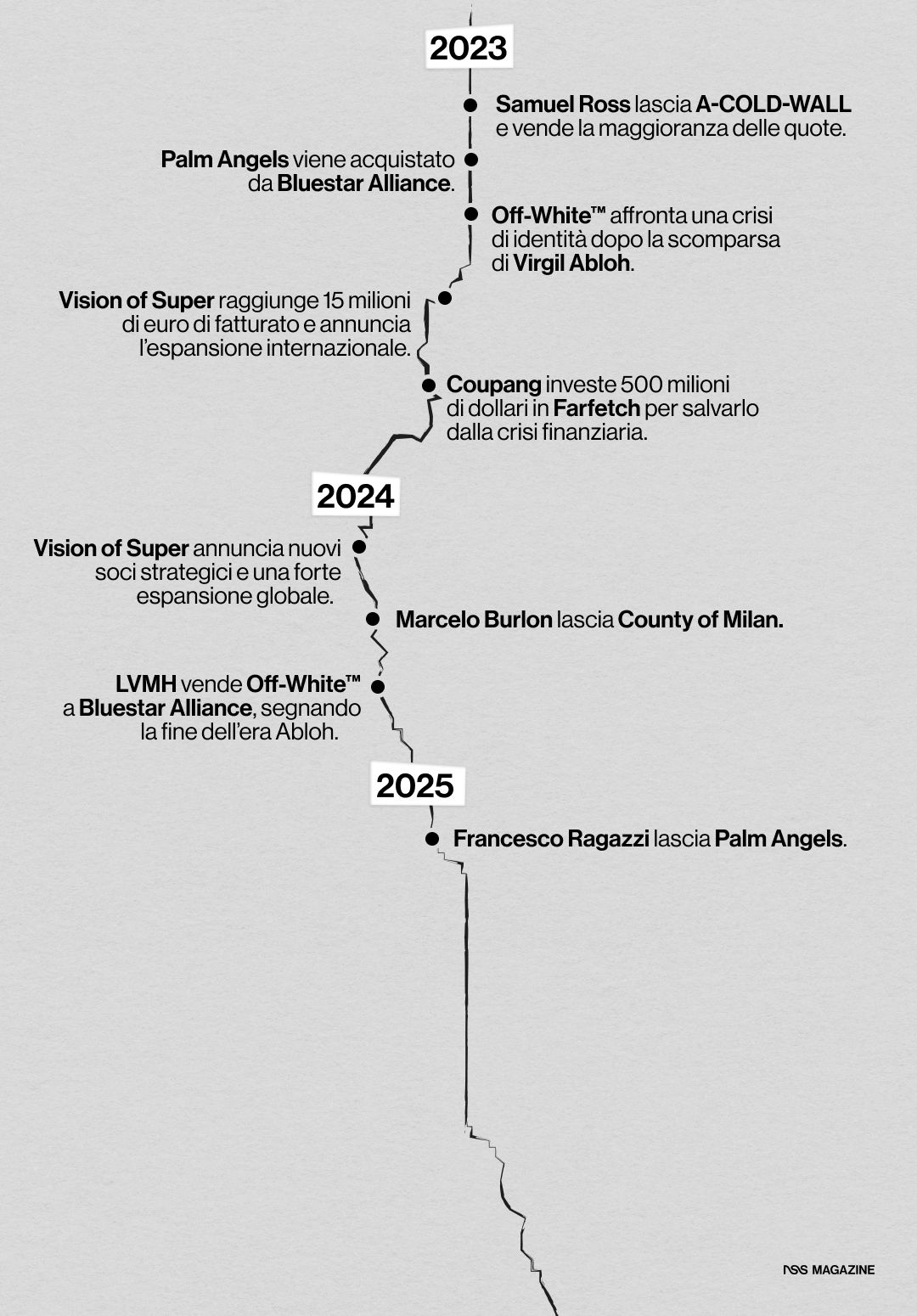 Simile a quella dei brand italo-americani del New Guards Group nati sulla scia di Abloh, è la vicenda di Palm Angels, presentato come tanti altri suoi pari nel 2015 da Francesco Ragazzi come esplorazione della la cultura dello skate. Palm Angels si è subito inserito tra i brand di riferimento del mercato streetwear, affermandosi anche grazie alle iconiche collaborazioni, come quella con Moncler. Dopo essere entrato nel gruppo New Guards Group, è stato recentemente acqusisito dallo statunitense Bluestar Alliance, che commercializza anche Off- White™ e Scotch & Soda. Nel 2023, Palm Angels è arrivato a superare i 100 milioni di euro di fatturato, di cui l'80% è rappresentato dal menswear, punta di diamante del marchio. Il brand, che agli albori conquistava il mercato grazie a tute e T-shirt, è riuscito a imporsi non solo in Italia ma a livello globale, con punti vendita monomarca a New York, Parigi, Milano, Miami e Las Vegas, fino in Asia, dove il brand sta cercando di conquistare una nuova fetta di mercato aprendo diversi negozi. Oltre alla recente acquisizione del brand, lo scorso febbraio Francesco Ragazzi ha lasciato il timone creativo aprendo così un nuovo capitolo per il brand. Ragazzi stesso, invece, ha spostato il suo focus sui profumi lanciando la linea (per altro ottima) Réservation firmata dallo specialista Yann Vasnier e Frédérique Obin. Il brand nato in partnership con Archive, che è il veicolo di investimento della holding della famiglia Ruffini, la famiglia a capo di Moncler. Gestita da Pietro Ruffini, figlio del più celebre Remo, Archive ha investito anche in brand come The Attico e Pas Normal Studios oltre che nella ristorazione con Langosteria Holding e Concettina ai Tre Santi.
