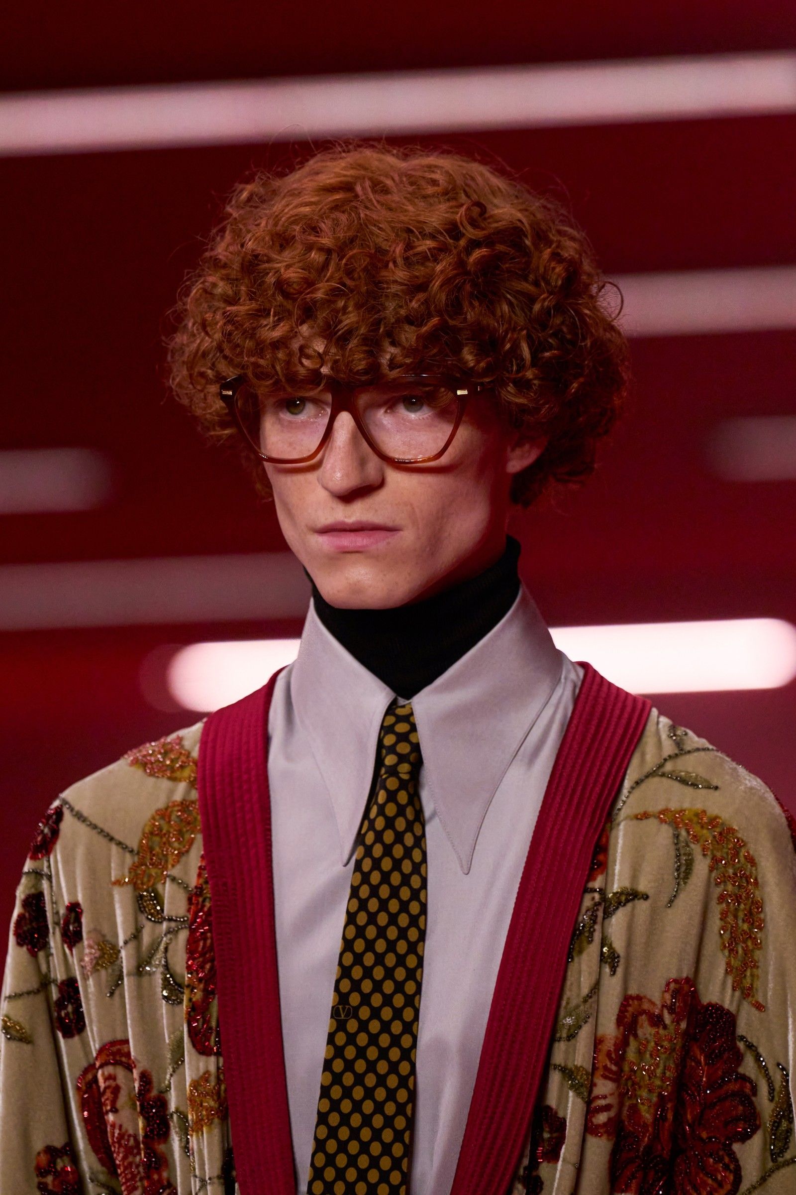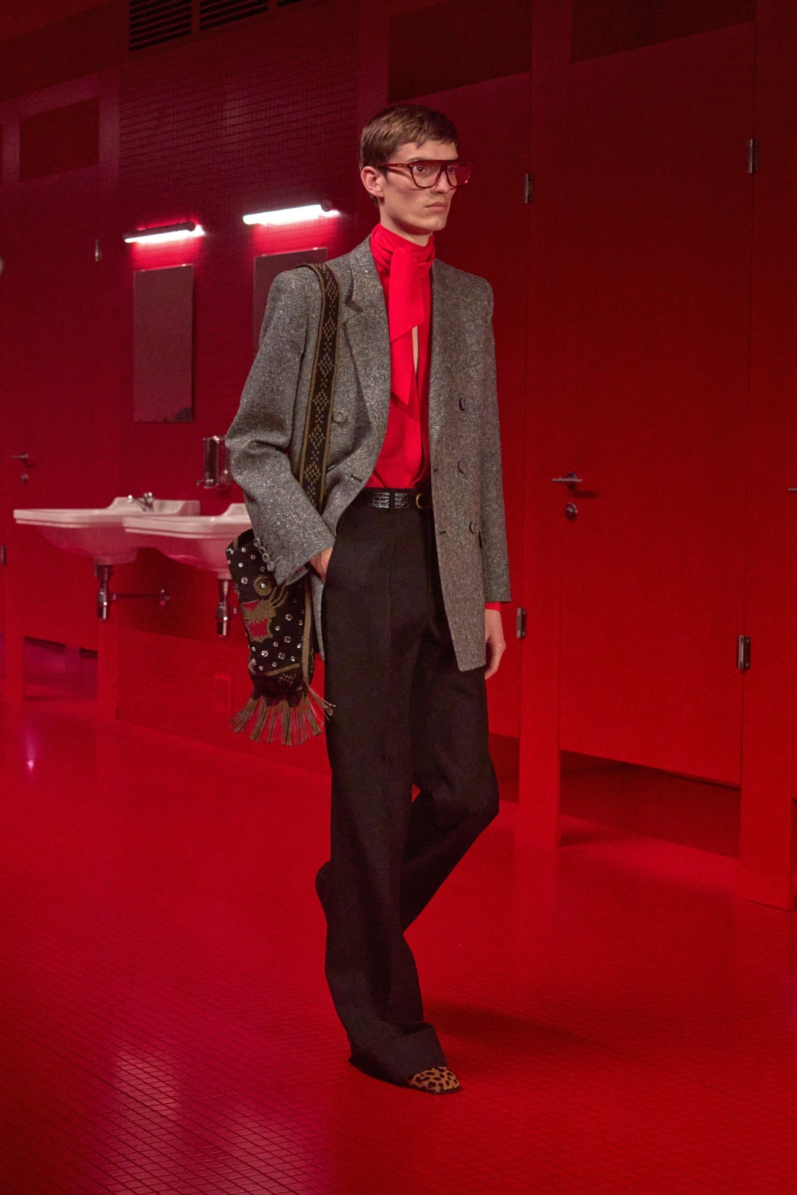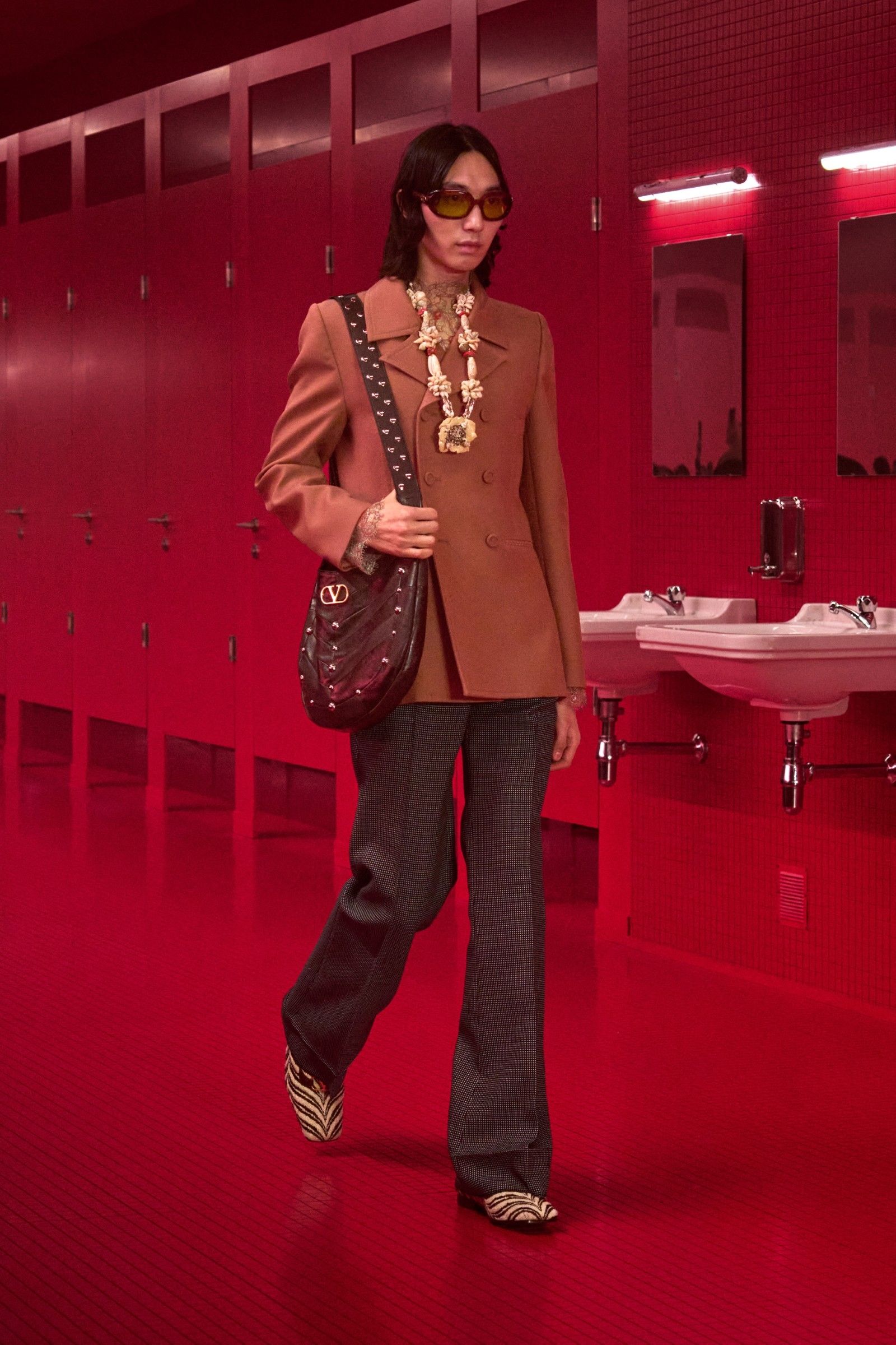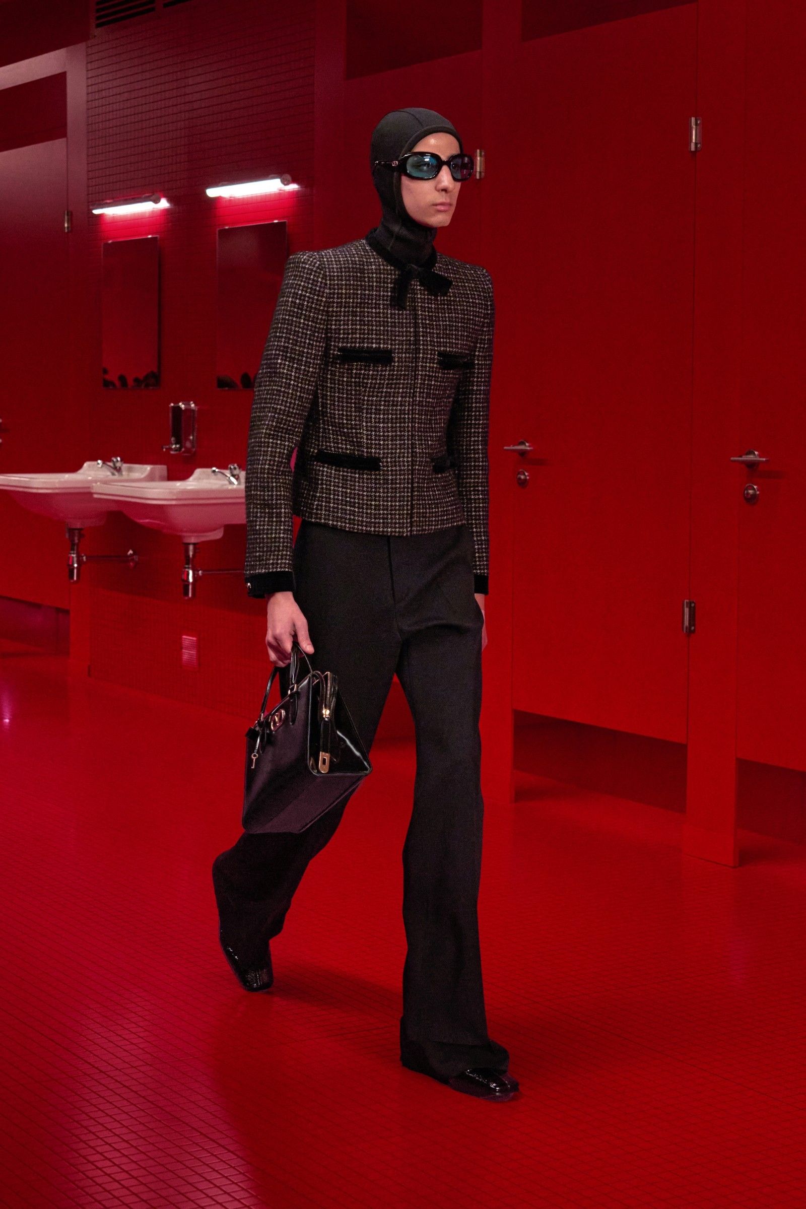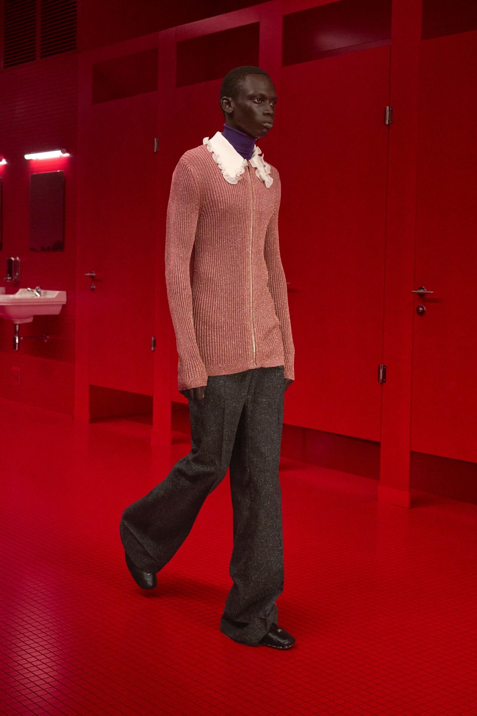 All’estremo opposto dello spettro della “normalità” c’era Alessandro Michele con Valentino. E se, come spesso accade, il concept del bagno pubblico come teatro di intimità performativa, spazio liminale dove ricordi di Lynch e di Kubrick si incrociano, prometteva bene – la collezione-fiume che Michele ha presentato ci ha in effetti dato l’impressione che il tempo fosse un bloccato in una spirale. È stato già ampiamente chiarito da diversi critici online che anche i pezzi più sopra le righe visti ieri allo show erano citazioni dell’enorme archivio di Valentino e che dunque Michele non sta rifacendo Gucci. Non di meno, questa consapevolezza e ogni approfondimento culturale possibile riescono a negare ciò che sta davanti ai nostri occhi? Le show notes firmate da Michele spendono tantissimo fiato sul significato del set dello show per cui, sembra di intendere, gli ottanta look di cui non si parla nemmeno fossero un mero pretesto. Era forse una collezione più misurata per Michele che, a differenza del passato, si è attenuto ai codici altoborghesi senza mescolare incongruamente gli “abiti della contessa” a short da bicicletta color fluo, harness sadomaso, sneaker da running e via dicendo. Il buono non mancava: la collaborazione con Vans era indovinata, i pantaloni con taglio bootcut molto à-la-page, le combo di pelliccia e pantaloni sartoriali, oggi come allora, restituiscono bene lo stile contemporaneo di molti giovani che indossano i nobili vestiti del passato insieme al proprio guardaroba casual. Ma anche a fronte di singoli prodotti e look molto validi (Michele è bravo nel suo lavoro, sa rivitalizzare le vendite e il team di Valentino è da sempre una potenza) non si può onestamente dire che questa collezione sarebbe stata diversa cinque o sette anni fa né che lo sarà la collezione che Michele ci presenterà a un anno o due da oggi.