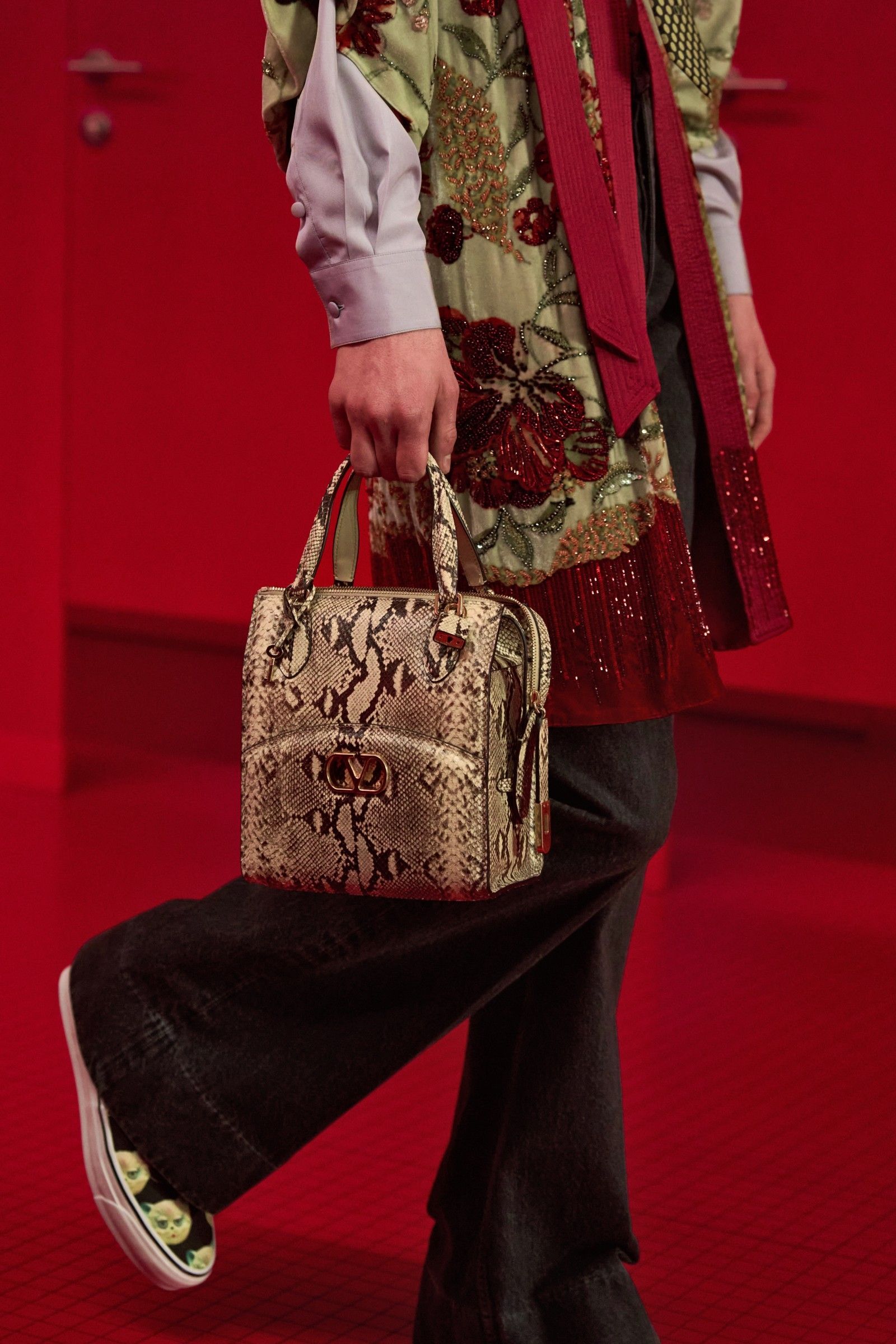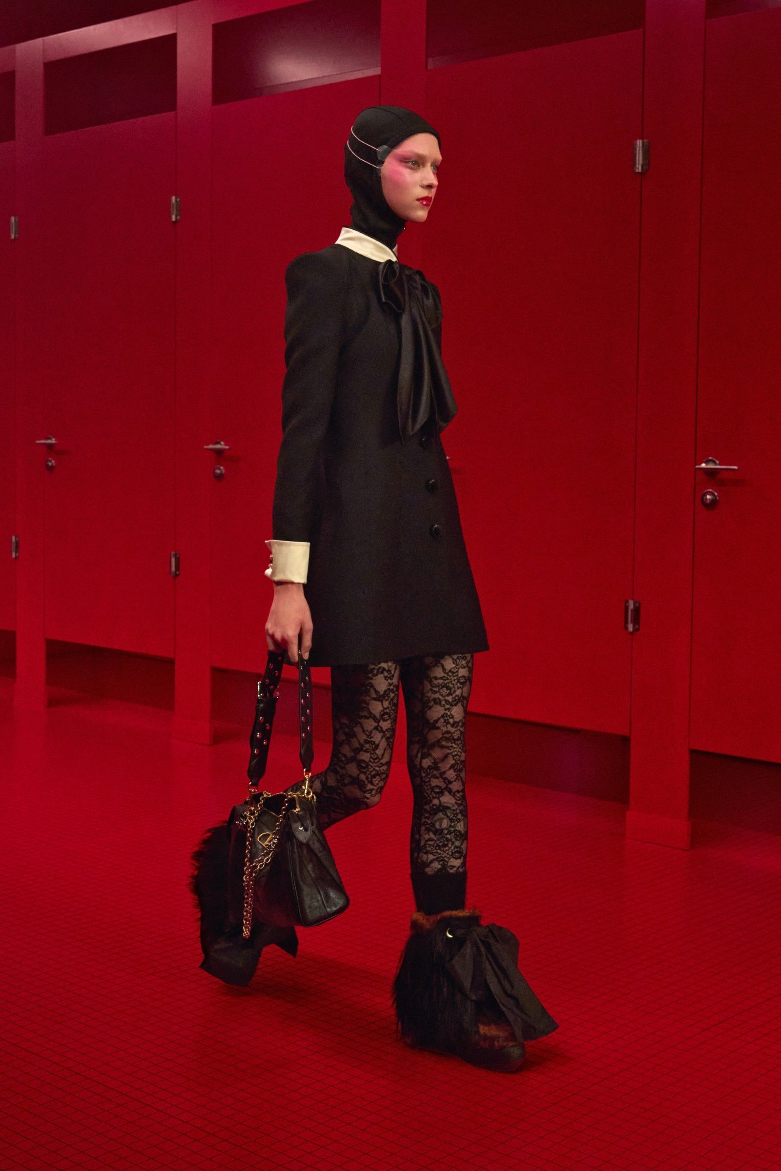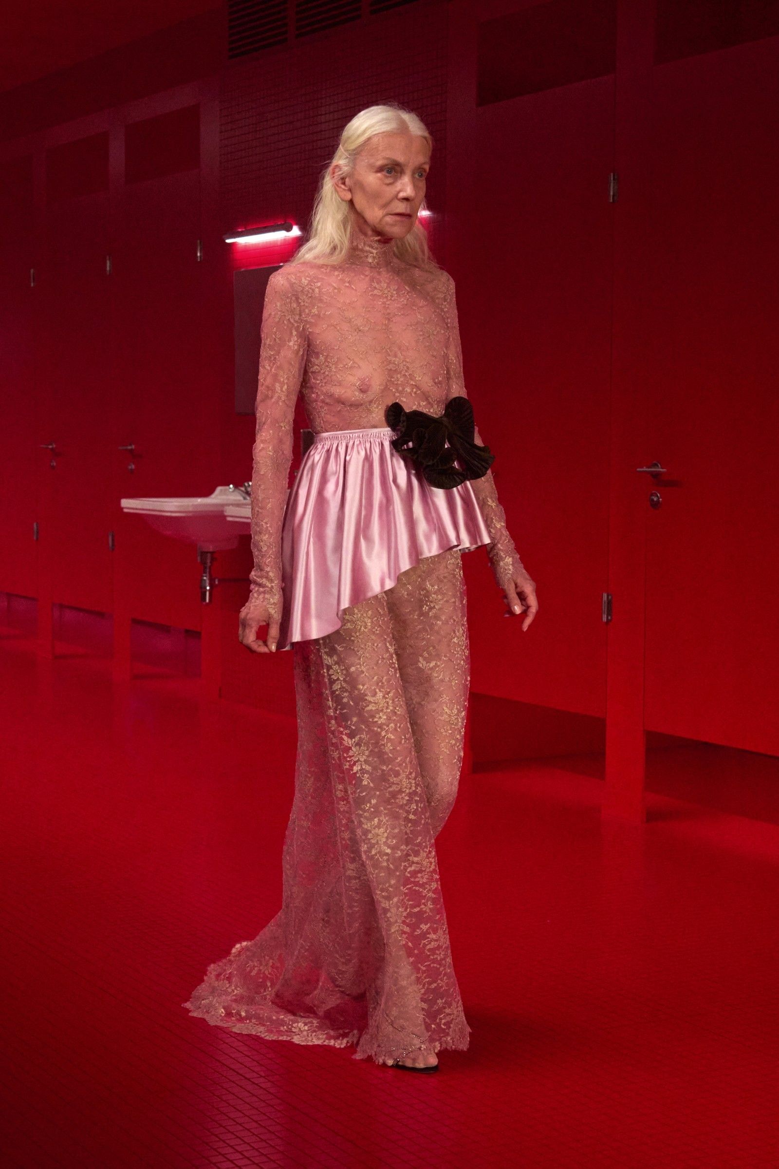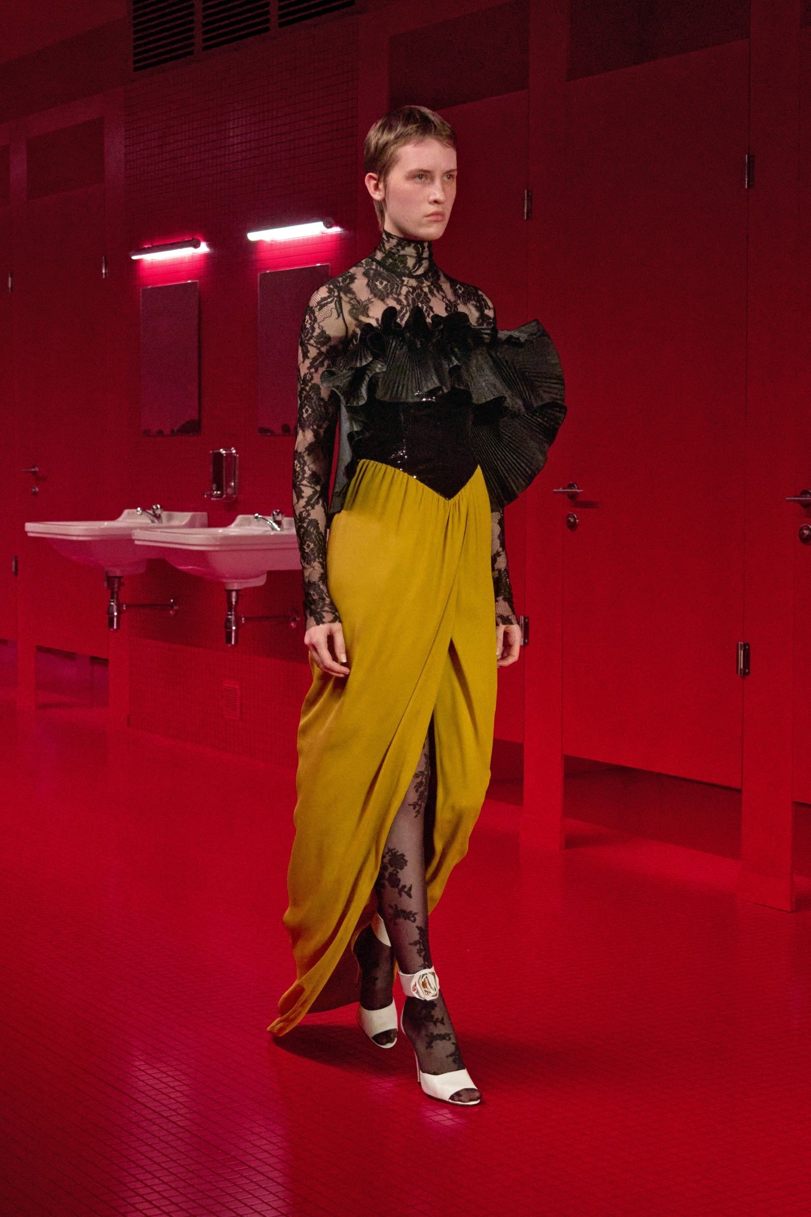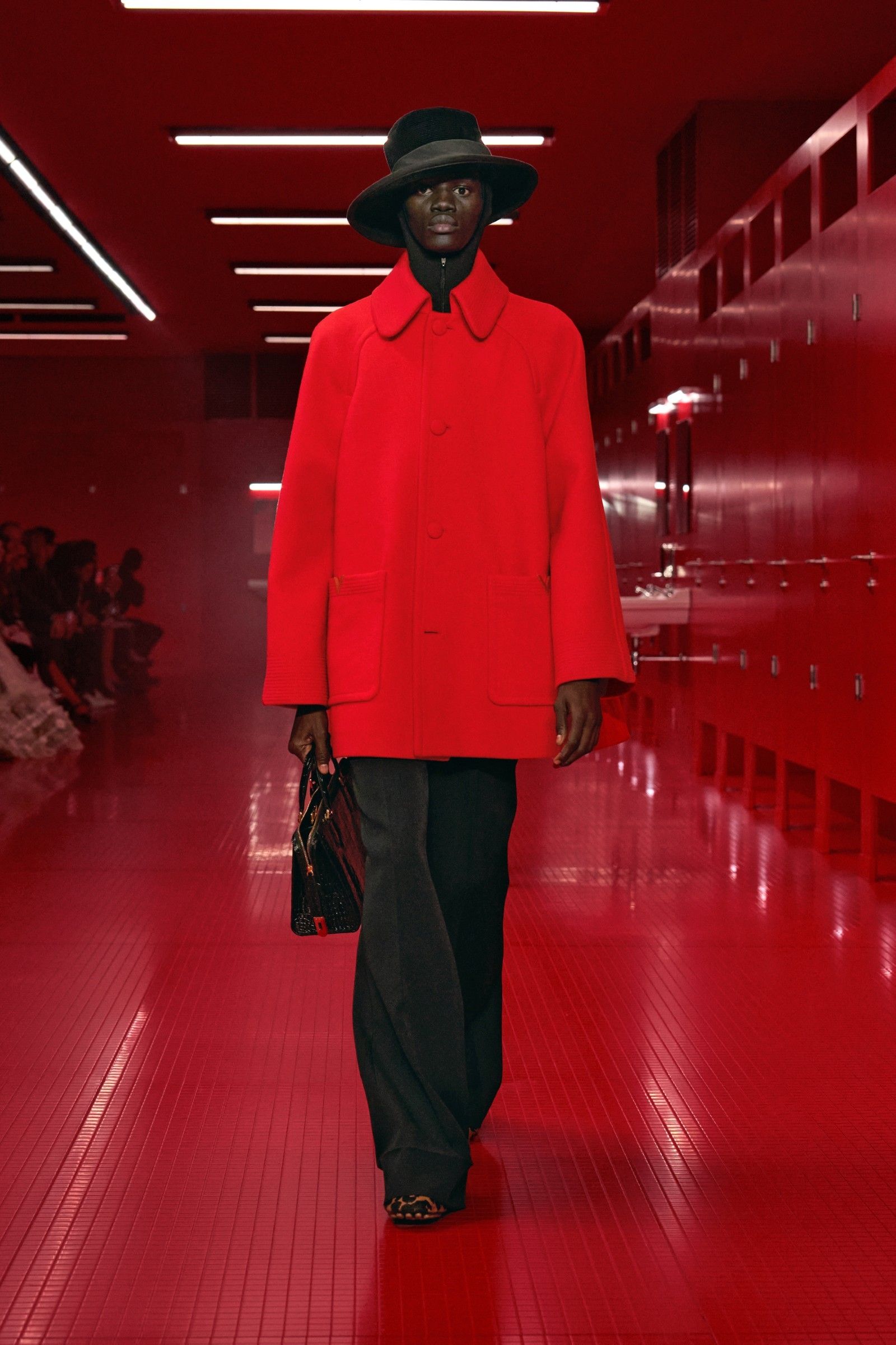 All’estremo opposto dello spettro della “normalità” c’era Alessandro Michele con Valentino. E se, come spesso accade, il concept del bagno pubblico come teatro di intimità performativa, spazio liminale dove ricordi di Lynch e di Kubrick si incrociano, prometteva bene – la collezione-fiume che Michele ha presentato ci ha in effetti dato l’impressione che il tempo fosse un bloccato in una spirale. È stato già ampiamente chiarito da diversi critici online che anche i pezzi più sopra le righe visti ieri allo show erano citazioni dell’enorme archivio di Valentino e che dunque Michele non sta rifacendo Gucci. Non di meno, questa consapevolezza e ogni approfondimento culturale possibile riescono a negare ciò che sta davanti ai nostri occhi? Le show notes firmate da Michele spendono tantissimo fiato sul significato del set dello show per cui, sembra di intendere, gli ottanta look di cui non si parla nemmeno fossero un mero pretesto. Era forse una collezione più misurata per Michele che, a differenza del passato, si è attenuto ai codici altoborghesi senza mescolare incongruamente gli “abiti della contessa” a short da bicicletta color fluo, harness sadomaso, sneaker da running e via dicendo. Il buono non mancava: la collaborazione con Vans era indovinata, i pantaloni con taglio bootcut molto à-la-page, le combo di pelliccia e pantaloni sartoriali, oggi come allora, restituiscono bene lo stile contemporaneo di molti giovani che indossano i nobili vestiti del passato insieme al proprio guardaroba casual. Ma anche a fronte di singoli prodotti e look molto validi (Michele è bravo nel suo lavoro, sa rivitalizzare le vendite e il team di Valentino è da sempre una potenza) non si può onestamente dire che questa collezione sarebbe stata diversa cinque o sette anni fa né che lo sarà la collezione che Michele ci presenterà a un anno o due da oggi.