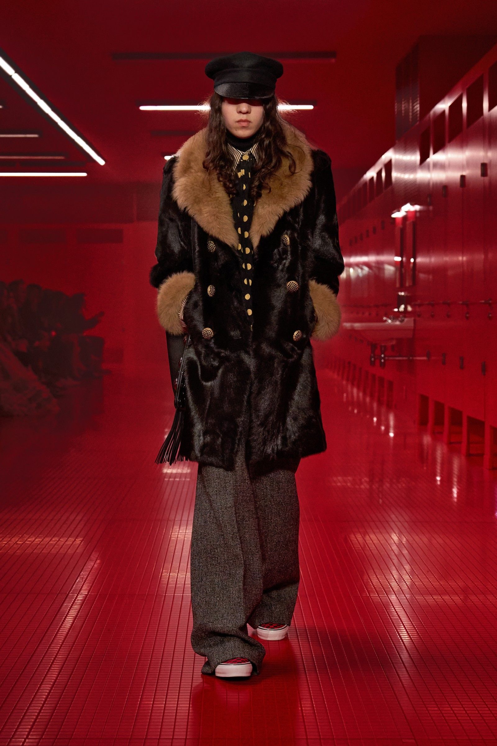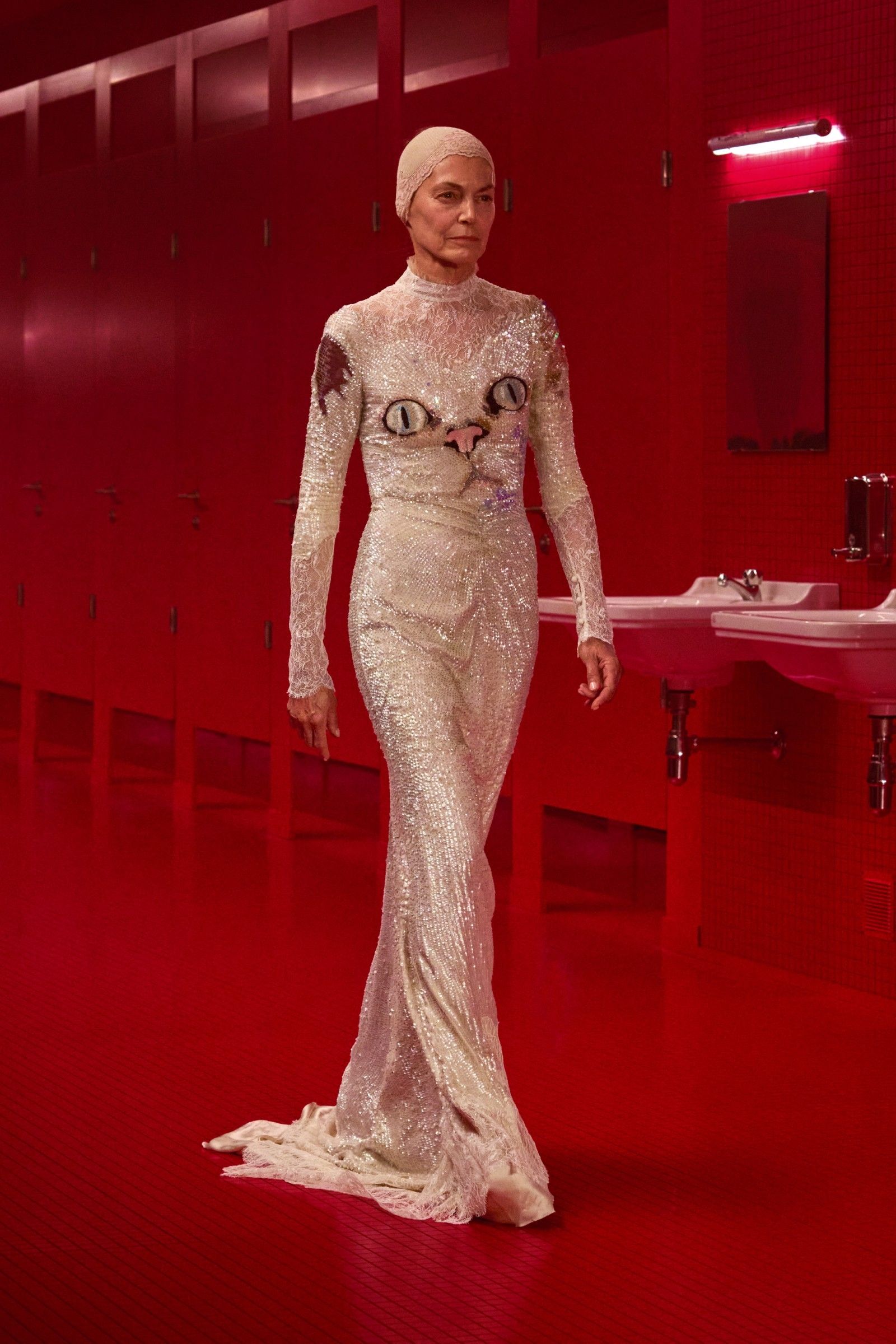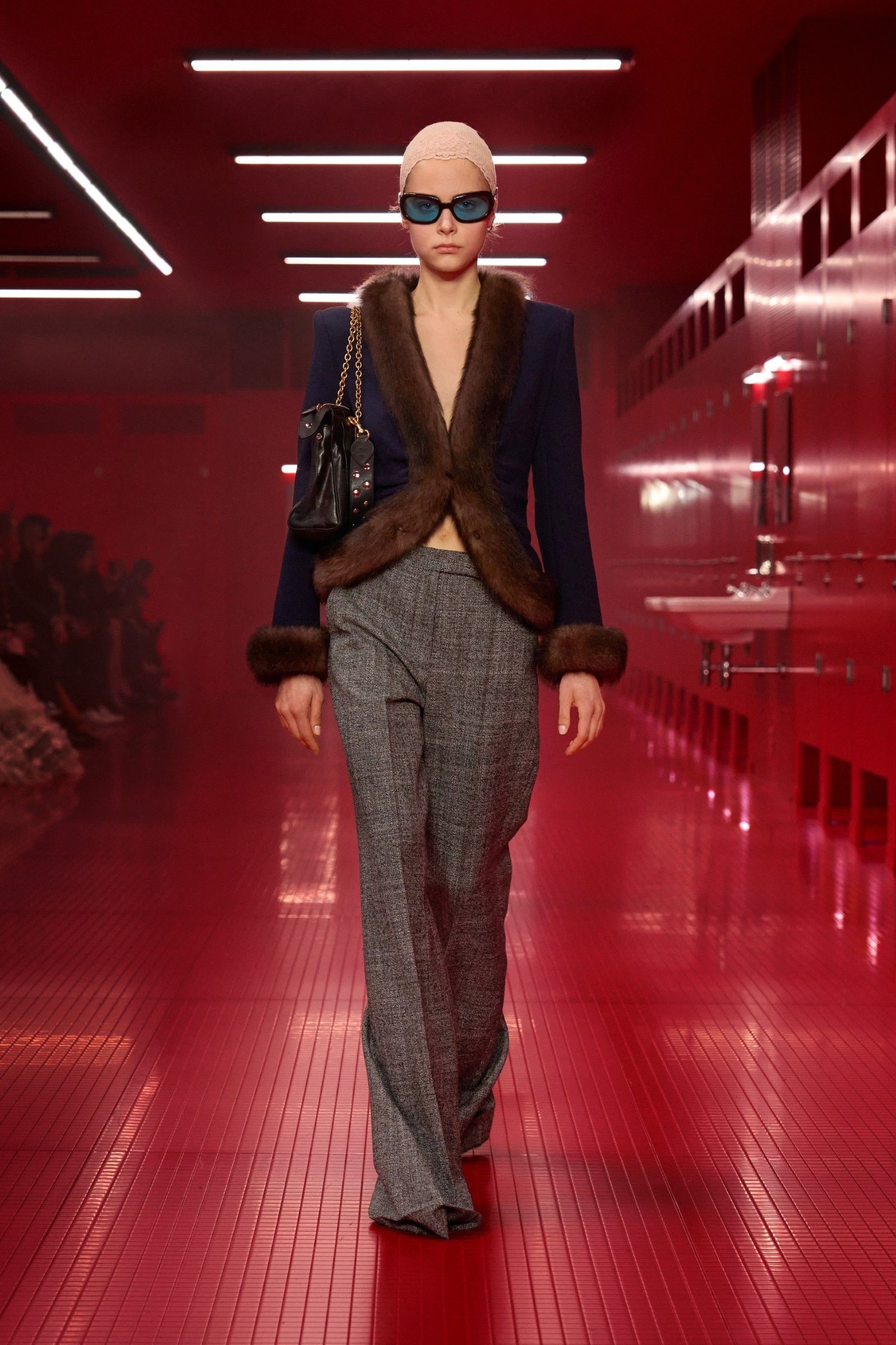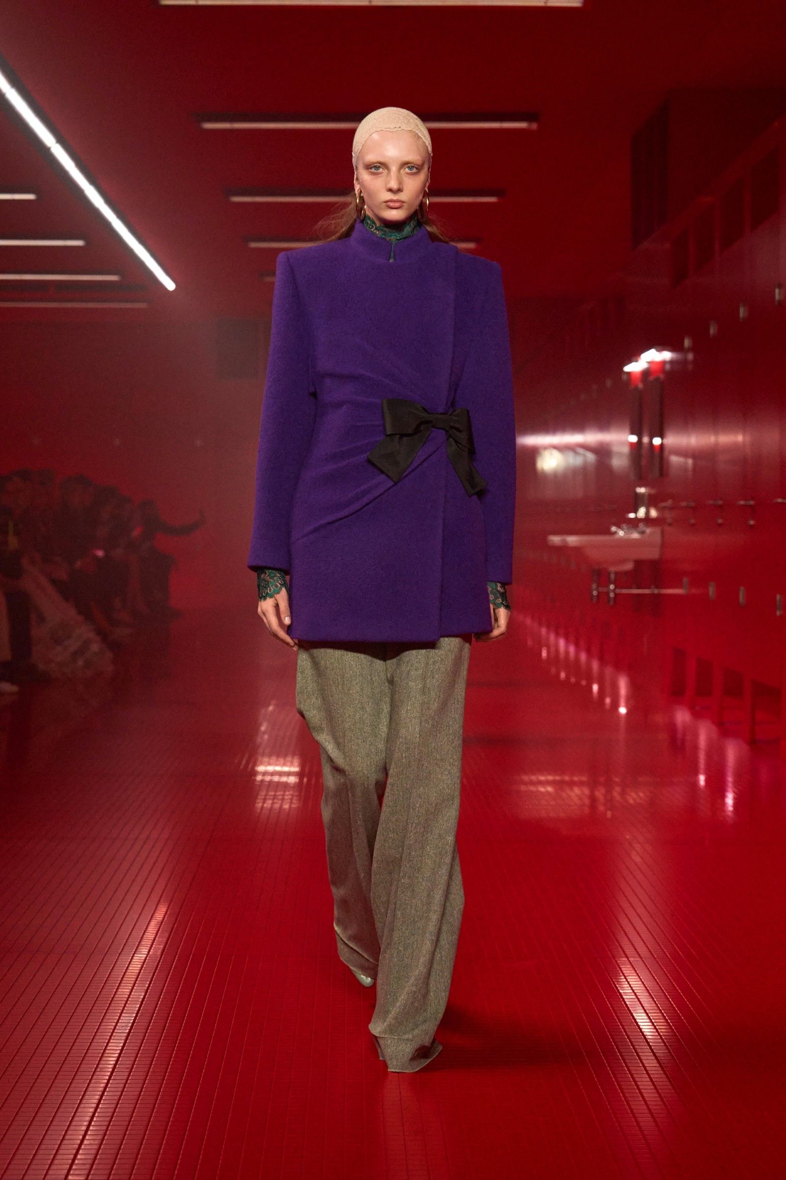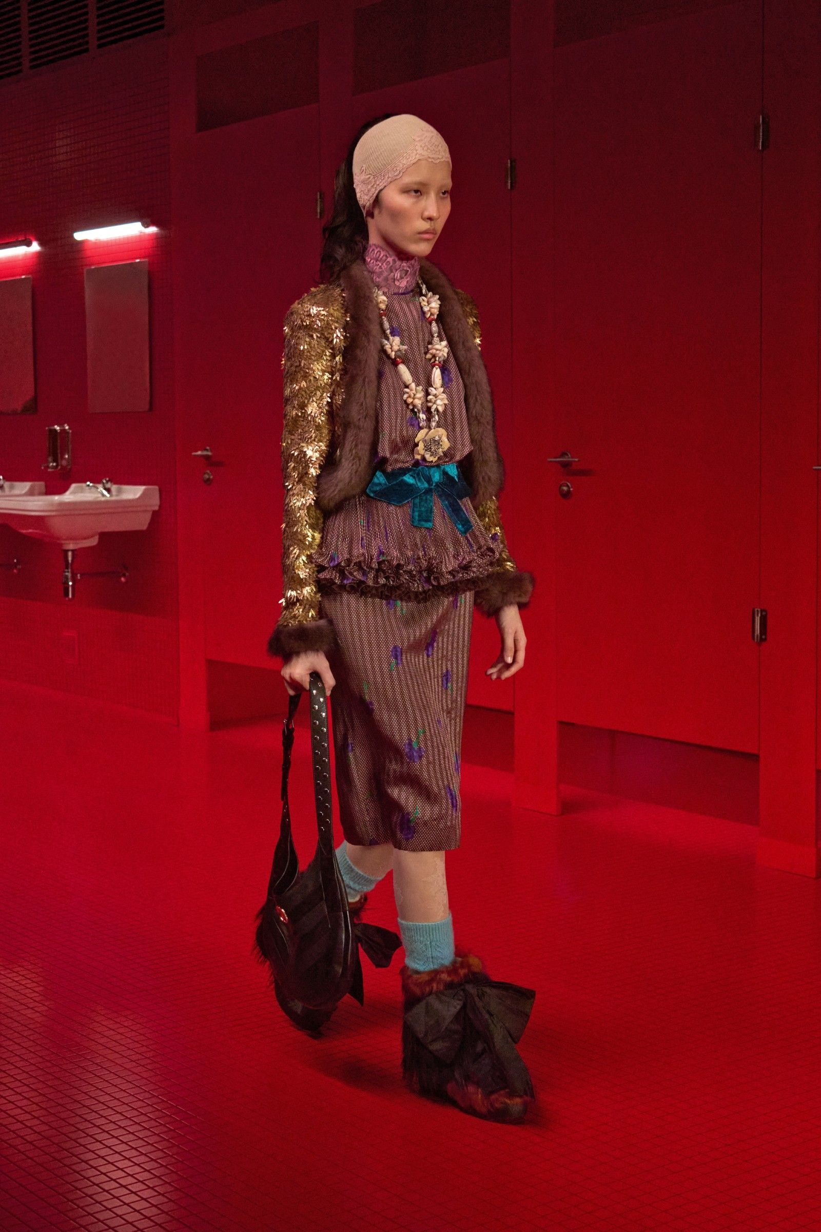 All’estremo opposto dello spettro della “normalità” c’era Alessandro Michele con Valentino. E se, come spesso accade, il concept del bagno pubblico come teatro di intimità performativa, spazio liminale dove ricordi di Lynch e di Kubrick si incrociano, prometteva bene – la collezione-fiume che Michele ha presentato ci ha in effetti dato l’impressione che il tempo fosse un bloccato in una spirale. È stato già ampiamente chiarito da diversi critici online che anche i pezzi più sopra le righe visti ieri allo show erano citazioni dell’enorme archivio di Valentino e che dunque Michele non sta rifacendo Gucci. Non di meno, questa consapevolezza e ogni approfondimento culturale possibile riescono a negare ciò che sta davanti ai nostri occhi? Le show notes firmate da Michele spendono tantissimo fiato sul significato del set dello show per cui, sembra di intendere, gli ottanta look di cui non si parla nemmeno fossero un mero pretesto. Era forse una collezione più misurata per Michele che, a differenza del passato, si è attenuto ai codici altoborghesi senza mescolare incongruamente gli “abiti della contessa” a short da bicicletta color fluo, harness sadomaso, sneaker da running e via dicendo. Il buono non mancava: la collaborazione con Vans era indovinata, i pantaloni con taglio bootcut molto à-la-page, le combo di pelliccia e pantaloni sartoriali, oggi come allora, restituiscono bene lo stile contemporaneo di molti giovani che indossano i nobili vestiti del passato insieme al proprio guardaroba casual. Ma anche a fronte di singoli prodotti e look molto validi (Michele è bravo nel suo lavoro, sa rivitalizzare le vendite e il team di Valentino è da sempre una potenza) non si può onestamente dire che questa collezione sarebbe stata diversa cinque o sette anni fa né che lo sarà la collezione che Michele ci presenterà a un anno o due da oggi.