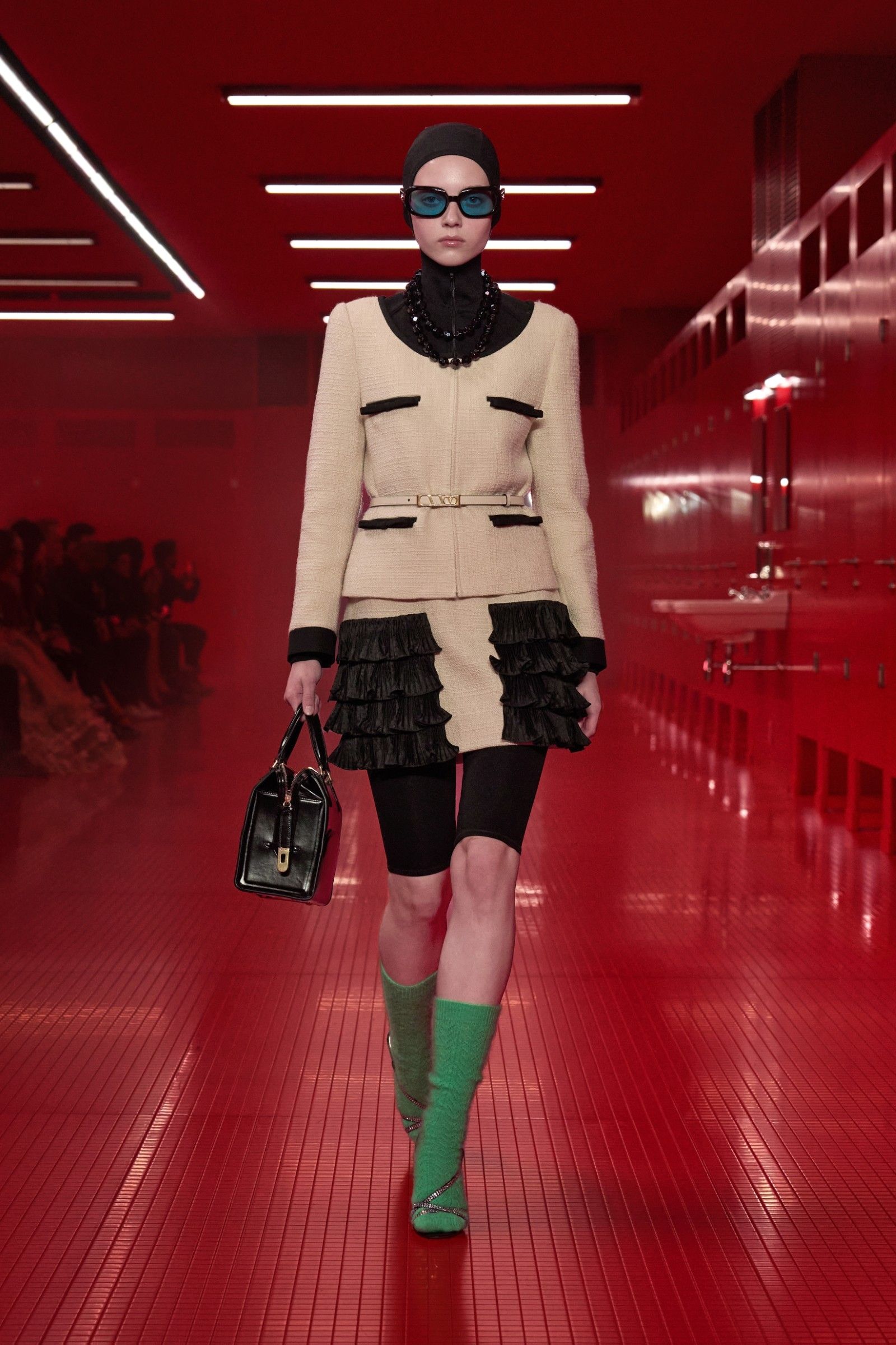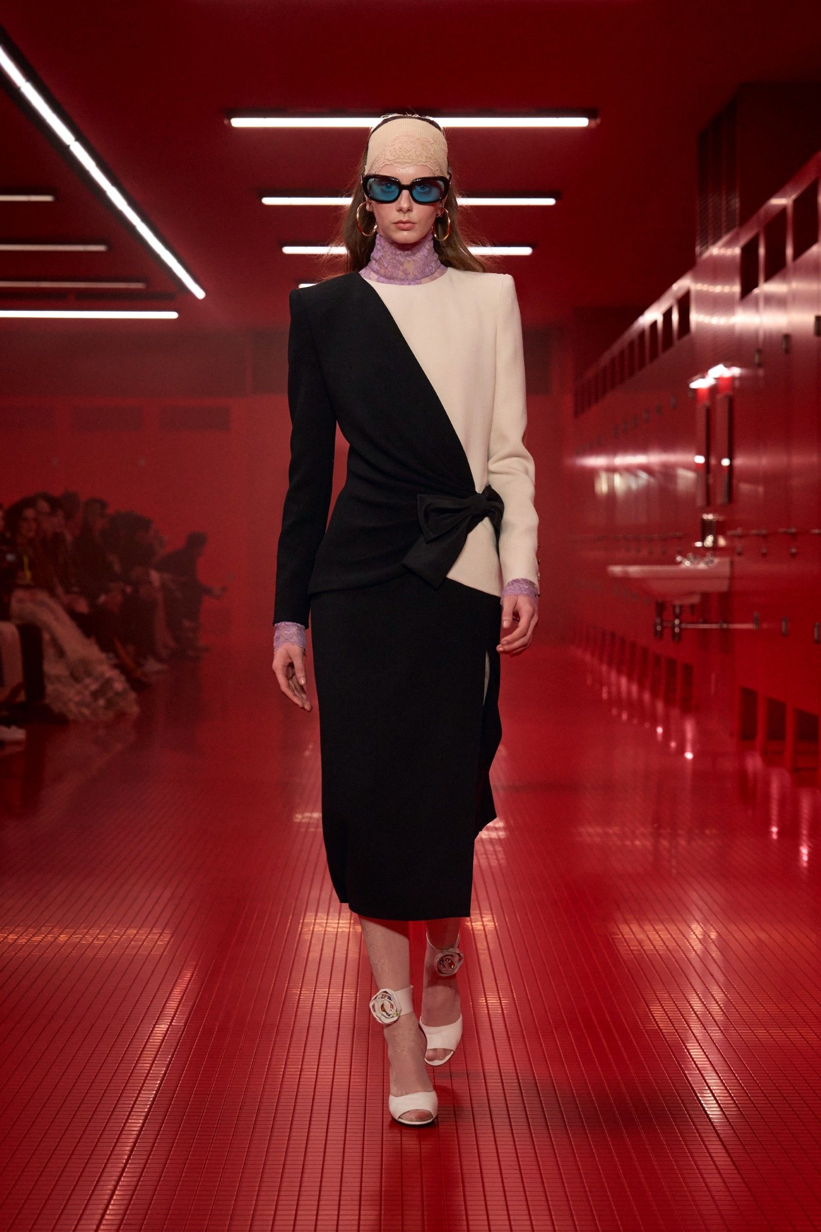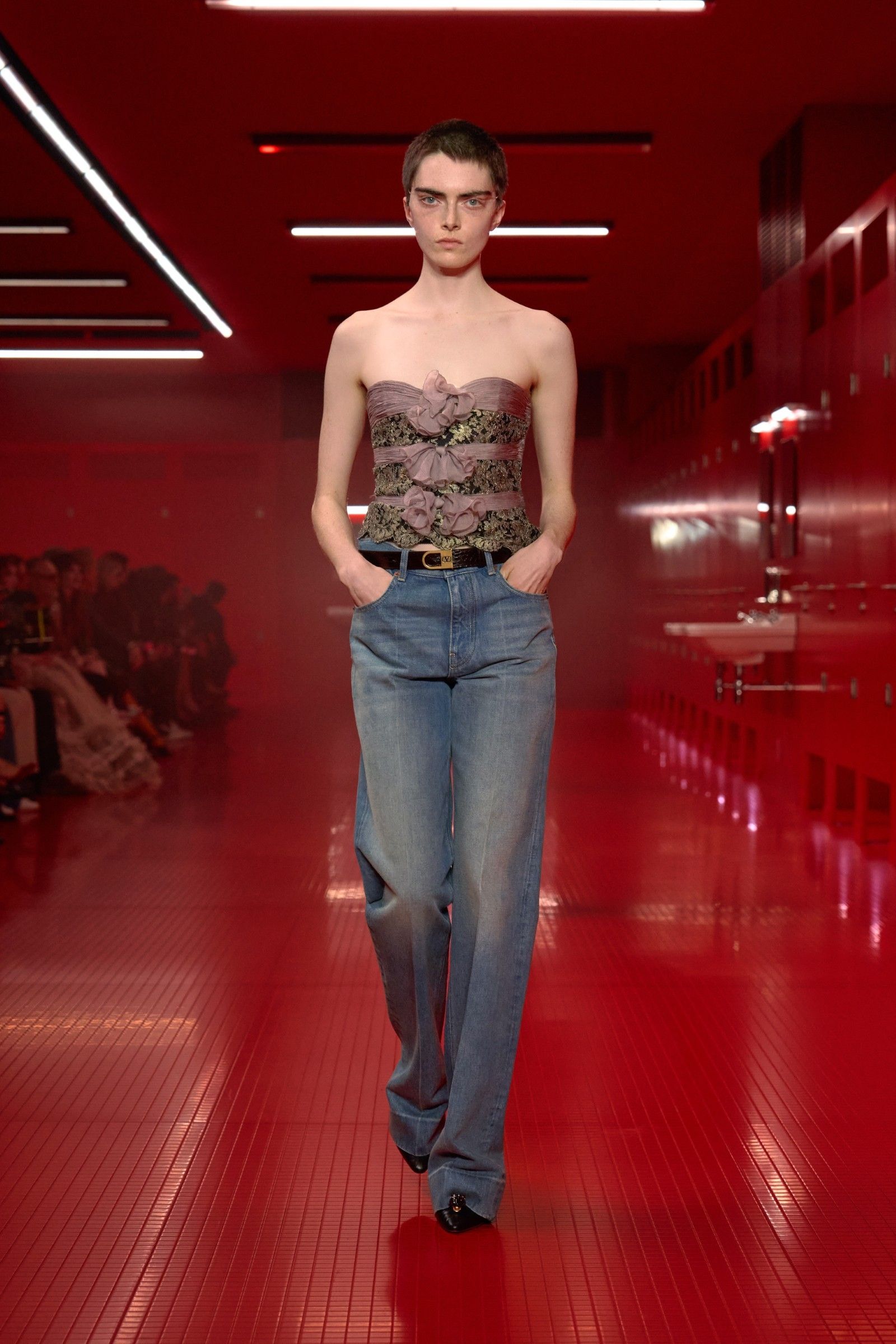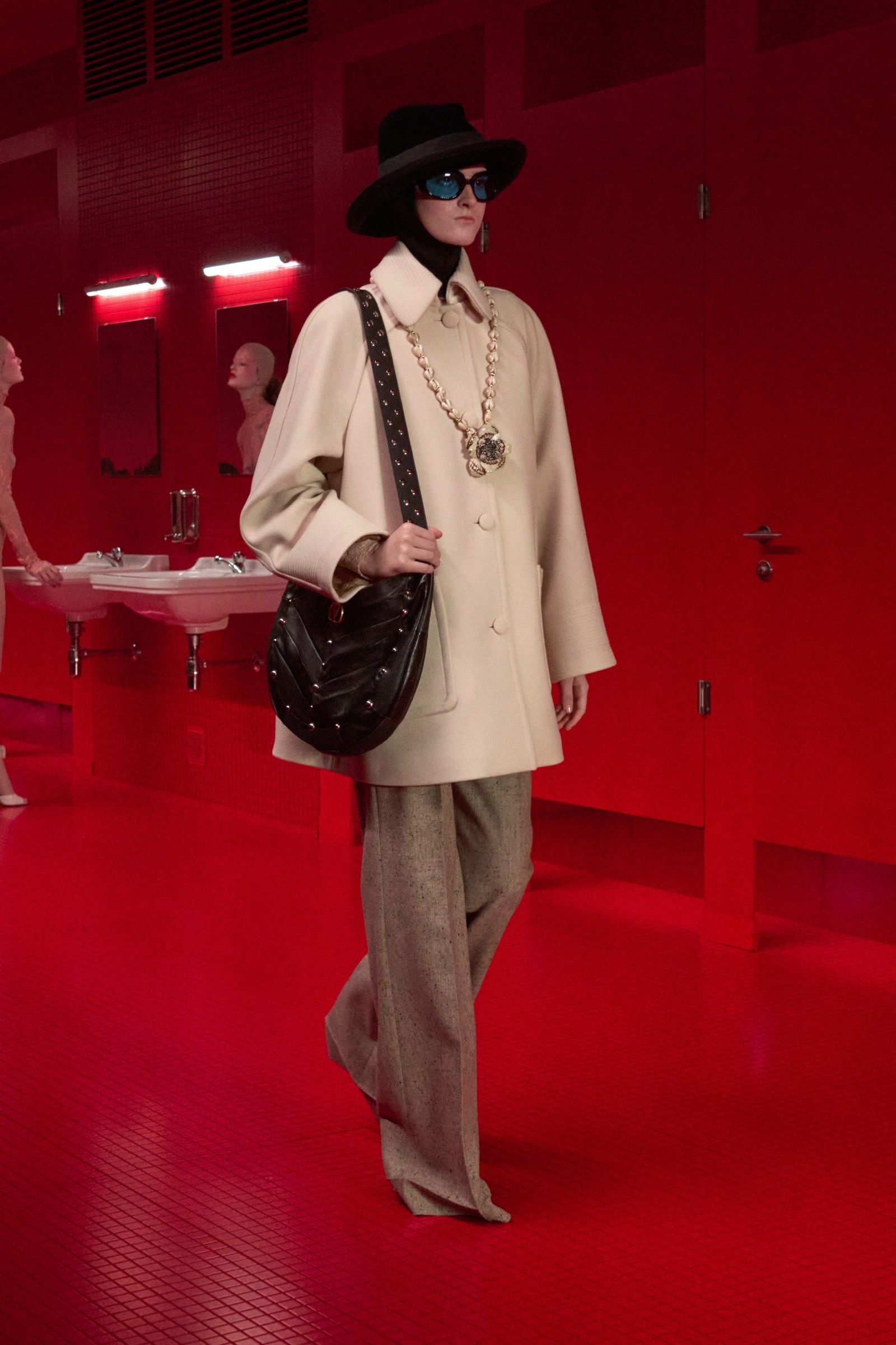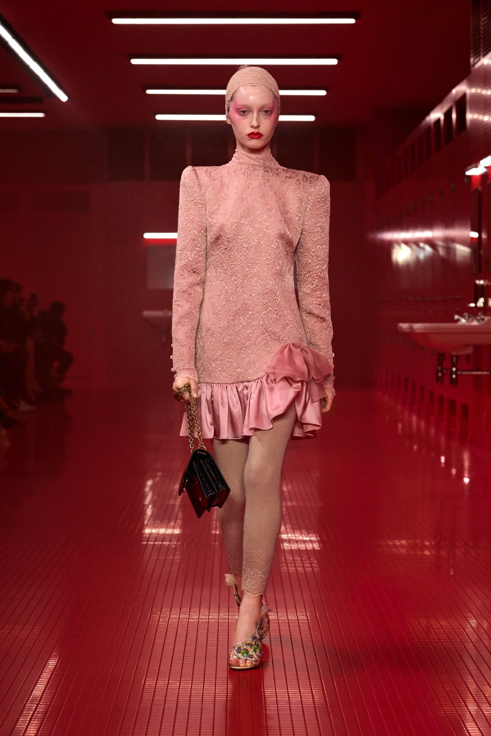 All’estremo opposto dello spettro della “normalità” c’era Alessandro Michele con Valentino. E se, come spesso accade, il concept del bagno pubblico come teatro di intimità performativa, spazio liminale dove ricordi di Lynch e di Kubrick si incrociano, prometteva bene – la collezione-fiume che Michele ha presentato ci ha in effetti dato l’impressione che il tempo fosse un bloccato in una spirale. È stato già ampiamente chiarito da diversi critici online che anche i pezzi più sopra le righe visti ieri allo show erano citazioni dell’enorme archivio di Valentino e che dunque Michele non sta rifacendo Gucci. Non di meno, questa consapevolezza e ogni approfondimento culturale possibile riescono a negare ciò che sta davanti ai nostri occhi? Le show notes firmate da Michele spendono tantissimo fiato sul significato del set dello show per cui, sembra di intendere, gli ottanta look di cui non si parla nemmeno fossero un mero pretesto. Era forse una collezione più misurata per Michele che, a differenza del passato, si è attenuto ai codici altoborghesi senza mescolare incongruamente gli “abiti della contessa” a short da bicicletta color fluo, harness sadomaso, sneaker da running e via dicendo. Il buono non mancava: la collaborazione con Vans era indovinata, i pantaloni con taglio bootcut molto à-la-page, le combo di pelliccia e pantaloni sartoriali, oggi come allora, restituiscono bene lo stile contemporaneo di molti giovani che indossano i nobili vestiti del passato insieme al proprio guardaroba casual. Ma anche a fronte di singoli prodotti e look molto validi (Michele è bravo nel suo lavoro, sa rivitalizzare le vendite e il team di Valentino è da sempre una potenza) non si può onestamente dire che questa collezione sarebbe stata diversa cinque o sette anni fa né che lo sarà la collezione che Michele ci presenterà a un anno o due da oggi.