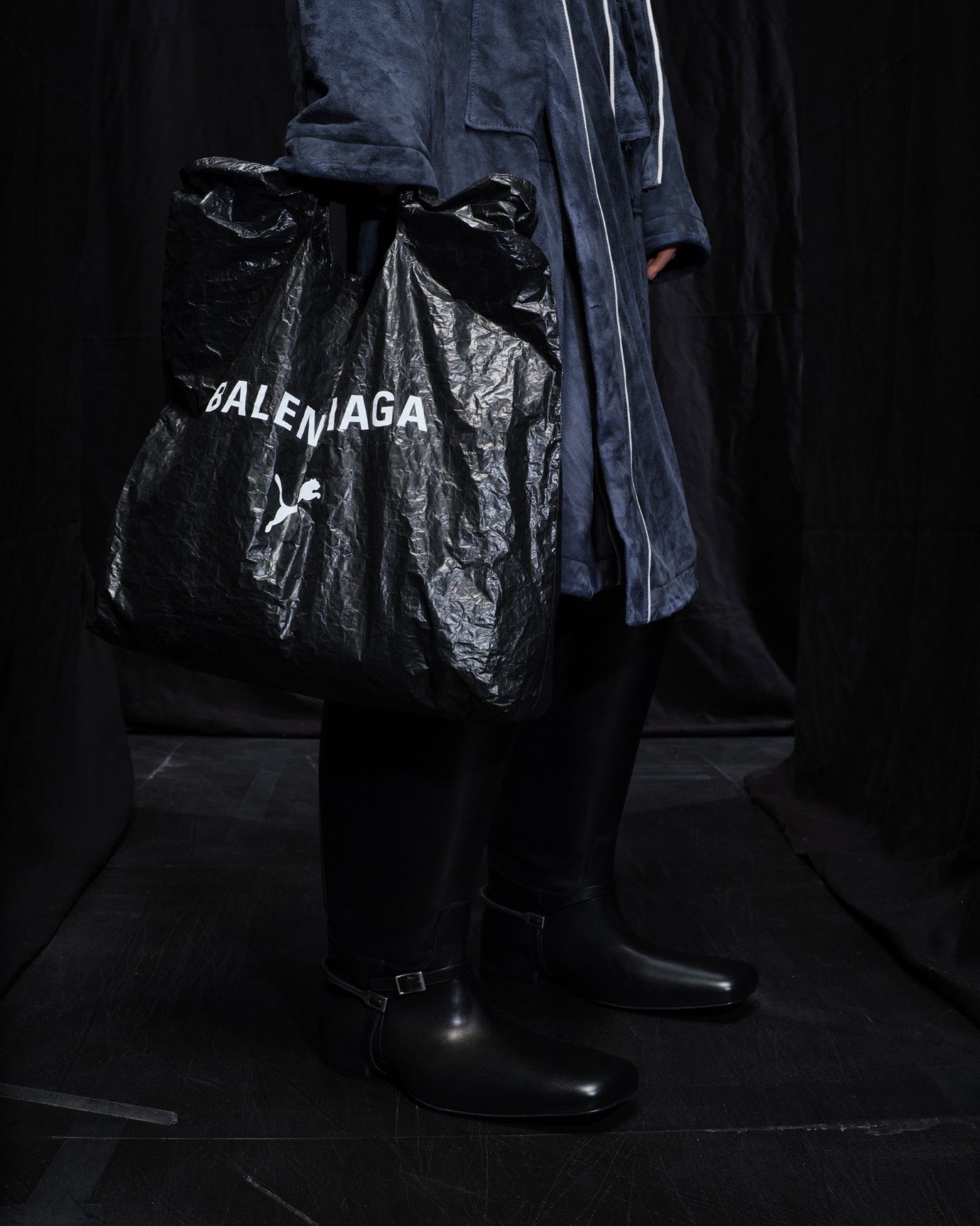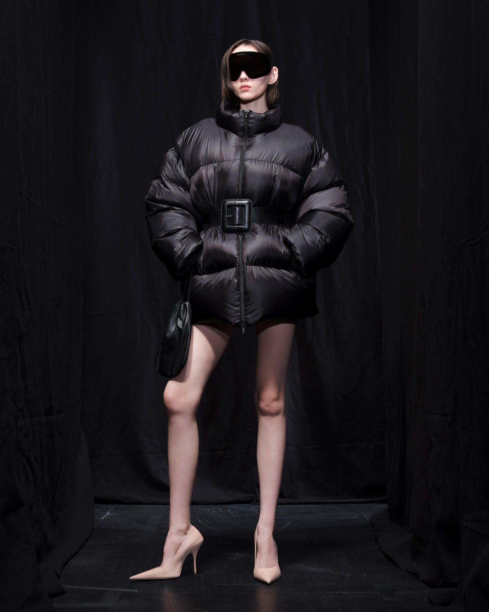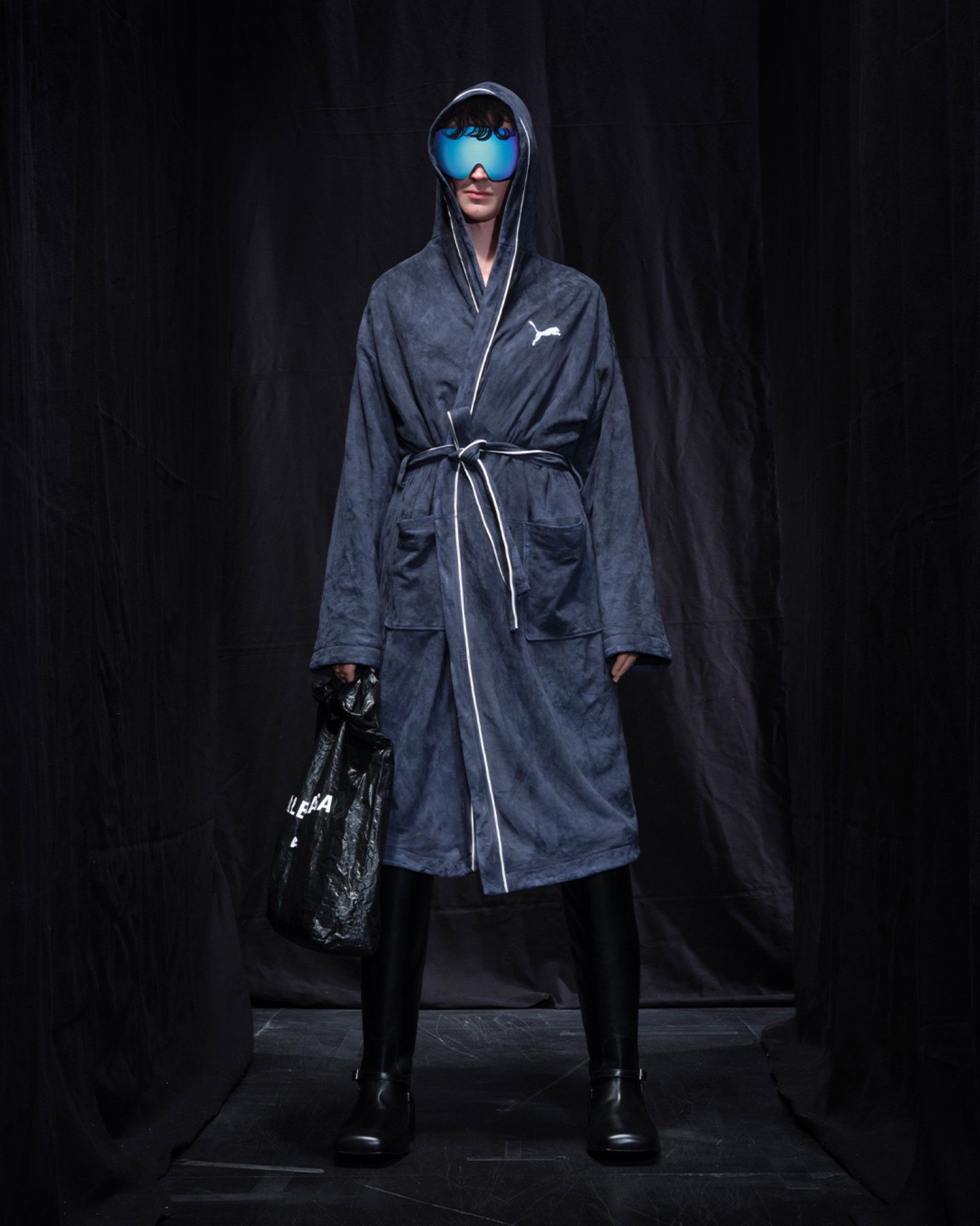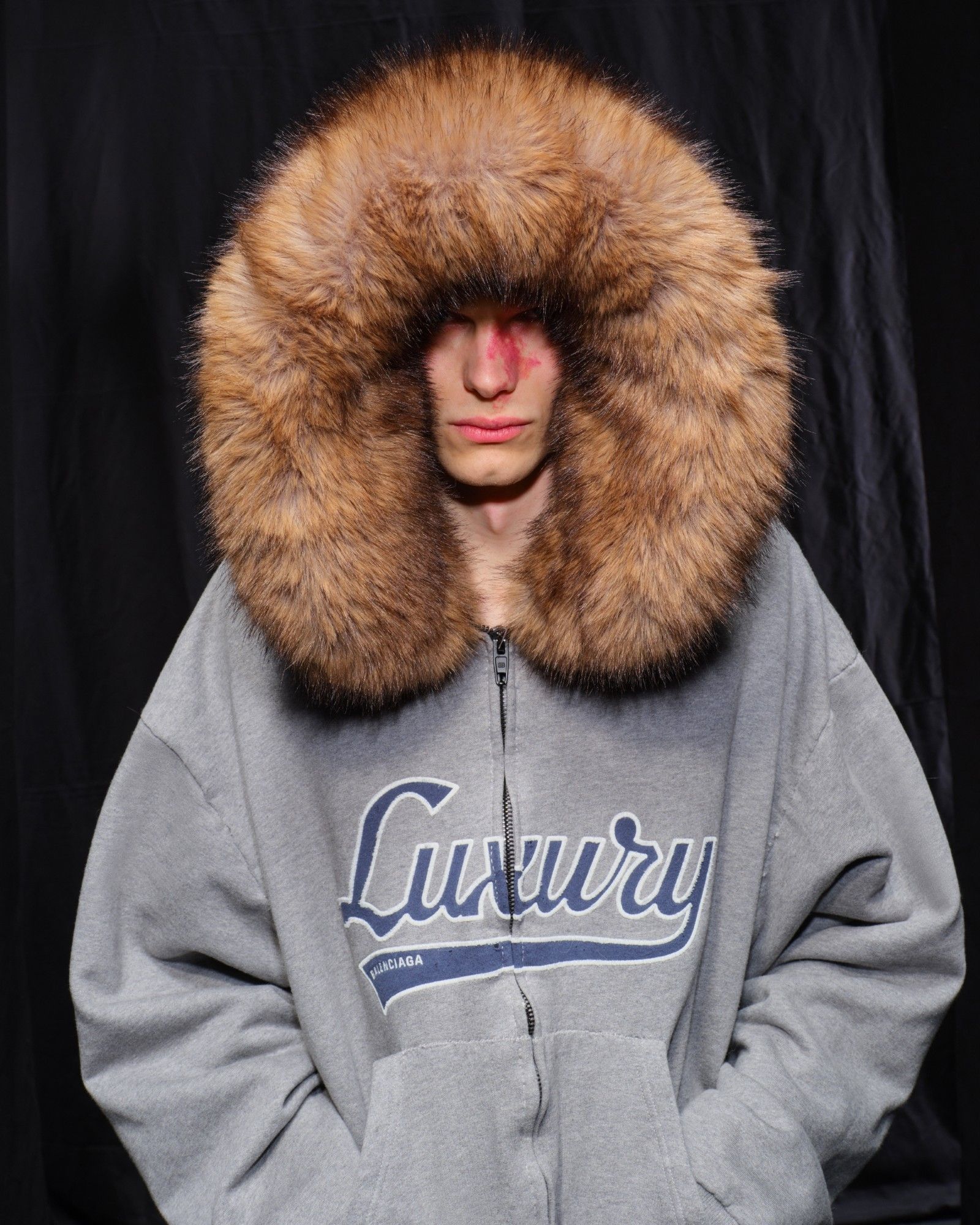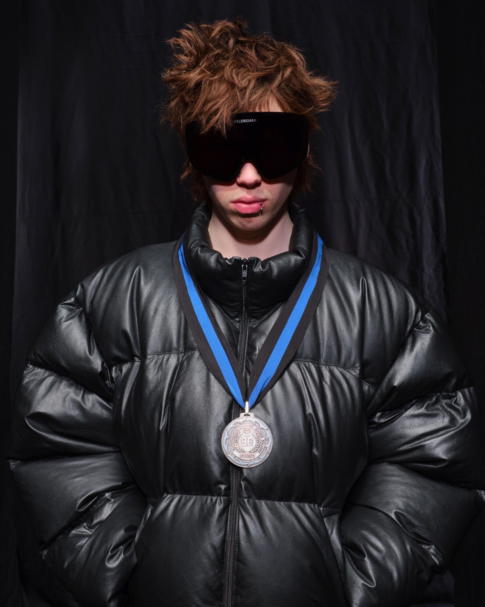 Le implicazioni estreme di quella che è parsa una sorta di indagine o esplorazione non ha solo scandagliato il mondo dell’anonimo business casual che fa parte dell’universo di Demna ma ha anche fotografato, portandolo in passerella, uno degli outfit più politicamente controversi e “carichi” dell’Europa contemporanea: la divisa dei maranza – che sarebbero, forse generalizzando, l’equivalente italiano dei “roadmen” inglesi e dei “caillera” francesi. Secondo le show notes questo oufit (che fa parte della collaborazione del brand con Puma) rappresenta «la moderna incarnazione dello streetwear» e in parte è, considerato anche come la divisa dei maranza, con le sue tute aderenti e persino il piumino smanicato, è diventata nel tempo un sinonimo di pericolo sociale (oggi come oggi a Milano, chi vede un gruppo di giovani vestito così nasconde i propri preziosi e affretta il passo) ma anche dell’esclusione e del pregiudizio che la società ha verso i giovani delle periferie e i cittadini di seconda generazione. Proprio questi outfit, pur non innovando un look già così consolidato, facevano riflettere su come, in fondo, i maranza/caillera di oggi non siano che una moderna versione dei punk anni ’80 – subcultura che oggi non percepiamo come pericolosa perché assimilata nel mondo mainstream ma che quarant’anni fa rappresentava per i buoni borghesi precisamente ciò che le moderne baby gang rappresentano oggi. In tal senso, gli show di Demna continuano a offrire materiale di riflessione su cosa sia la moda oggi oltre a proseguire nella perversa parodia del lusso e dei suoi significanti che ha reso Balenciaga il brand che è oggi.