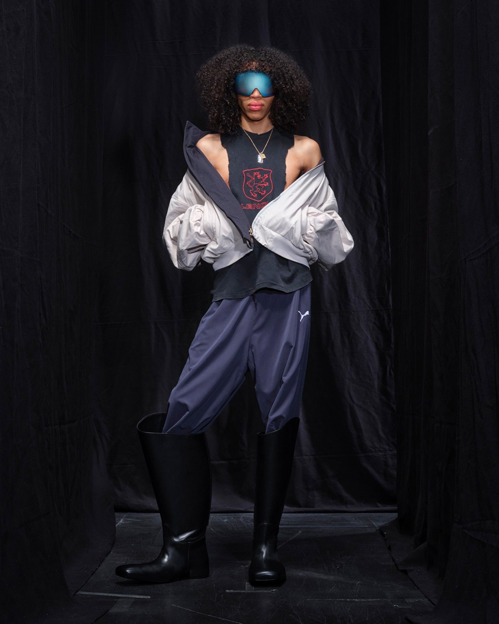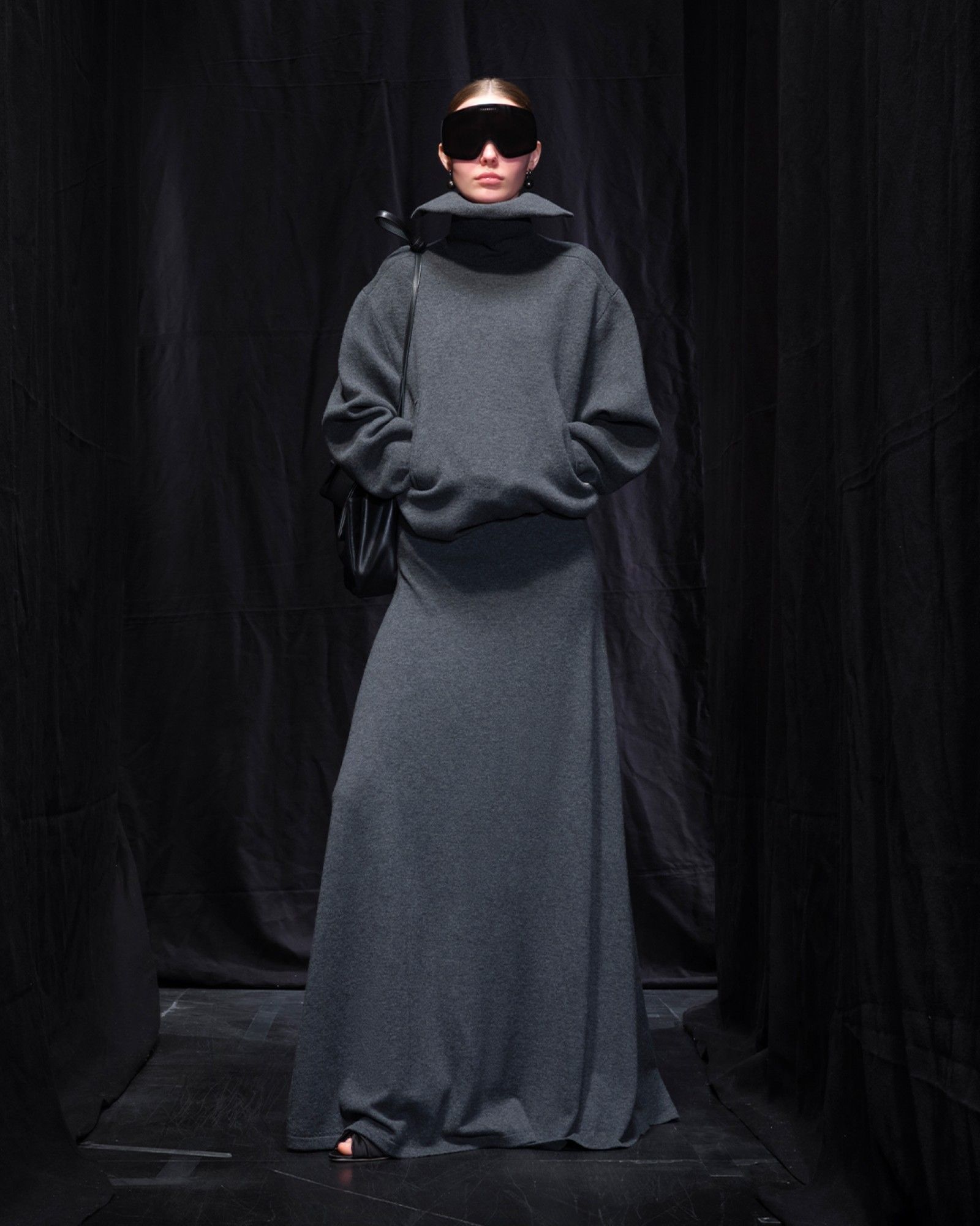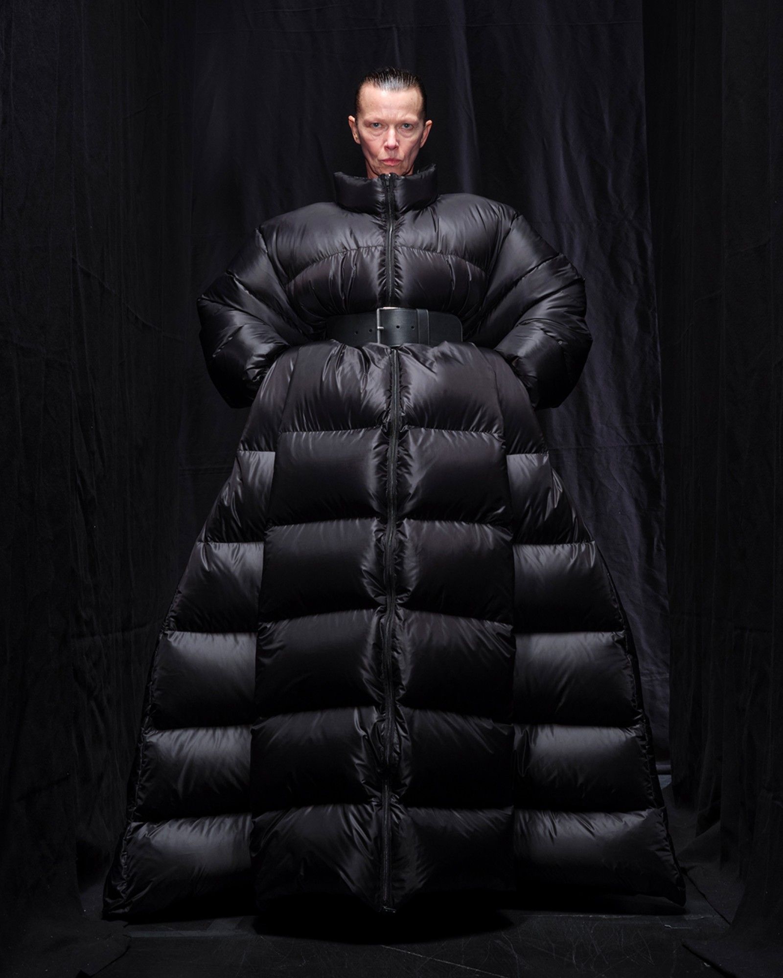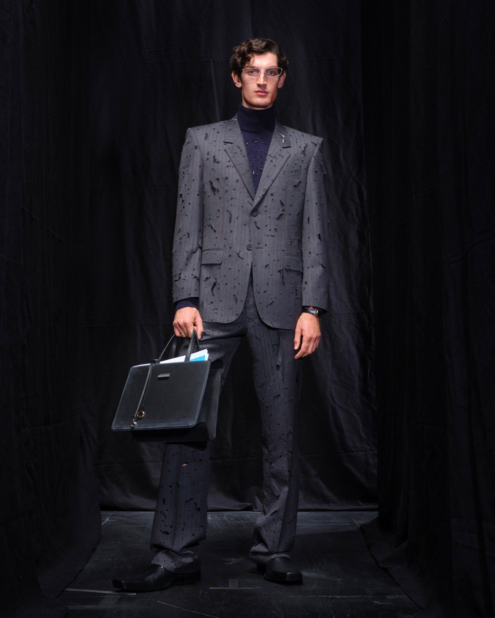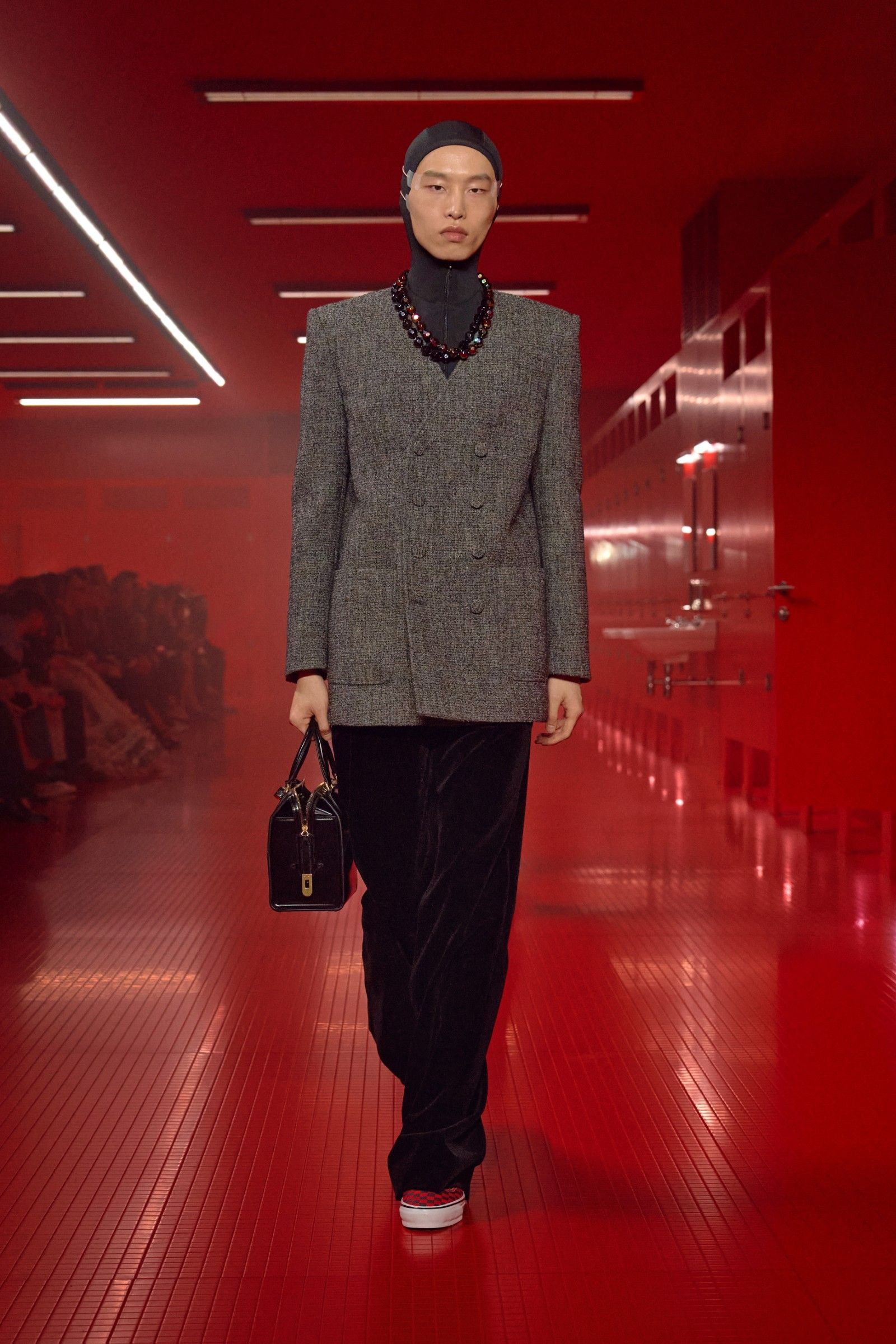 Le implicazioni estreme di quella che è parsa una sorta di indagine o esplorazione non ha solo scandagliato il mondo dell’anonimo business casual che fa parte dell’universo di Demna ma ha anche fotografato, portandolo in passerella, uno degli outfit più politicamente controversi e “carichi” dell’Europa contemporanea: la divisa dei maranza – che sarebbero, forse generalizzando, l’equivalente italiano dei “roadmen” inglesi e dei “caillera” francesi. Secondo le show notes questo oufit (che fa parte della collaborazione del brand con Puma) rappresenta «la moderna incarnazione dello streetwear» e in parte è, considerato anche come la divisa dei maranza, con le sue tute aderenti e persino il piumino smanicato, è diventata nel tempo un sinonimo di pericolo sociale (oggi come oggi a Milano, chi vede un gruppo di giovani vestito così nasconde i propri preziosi e affretta il passo) ma anche dell’esclusione e del pregiudizio che la società ha verso i giovani delle periferie e i cittadini di seconda generazione. Proprio questi outfit, pur non innovando un look già così consolidato, facevano riflettere su come, in fondo, i maranza/caillera di oggi non siano che una moderna versione dei punk anni ’80 – subcultura che oggi non percepiamo come pericolosa perché assimilata nel mondo mainstream ma che quarant’anni fa rappresentava per i buoni borghesi precisamente ciò che le moderne baby gang rappresentano oggi. In tal senso, gli show di Demna continuano a offrire materiale di riflessione su cosa sia la moda oggi oltre a proseguire nella perversa parodia del lusso e dei suoi significanti che ha reso Balenciaga il brand che è oggi.