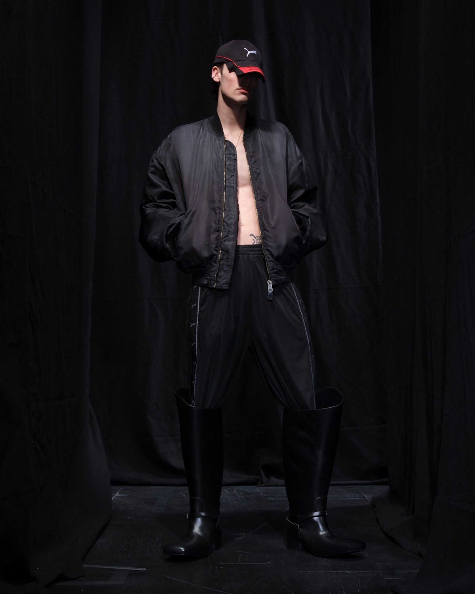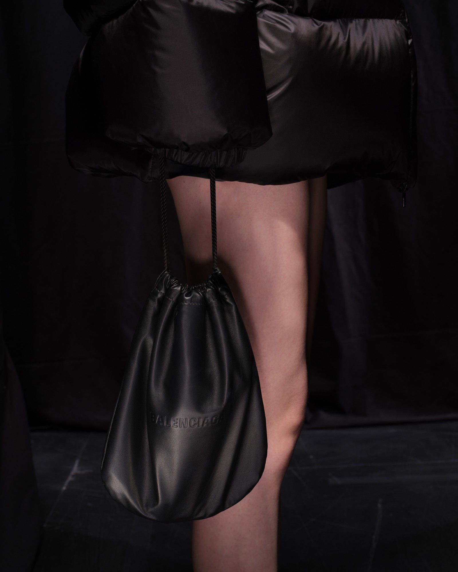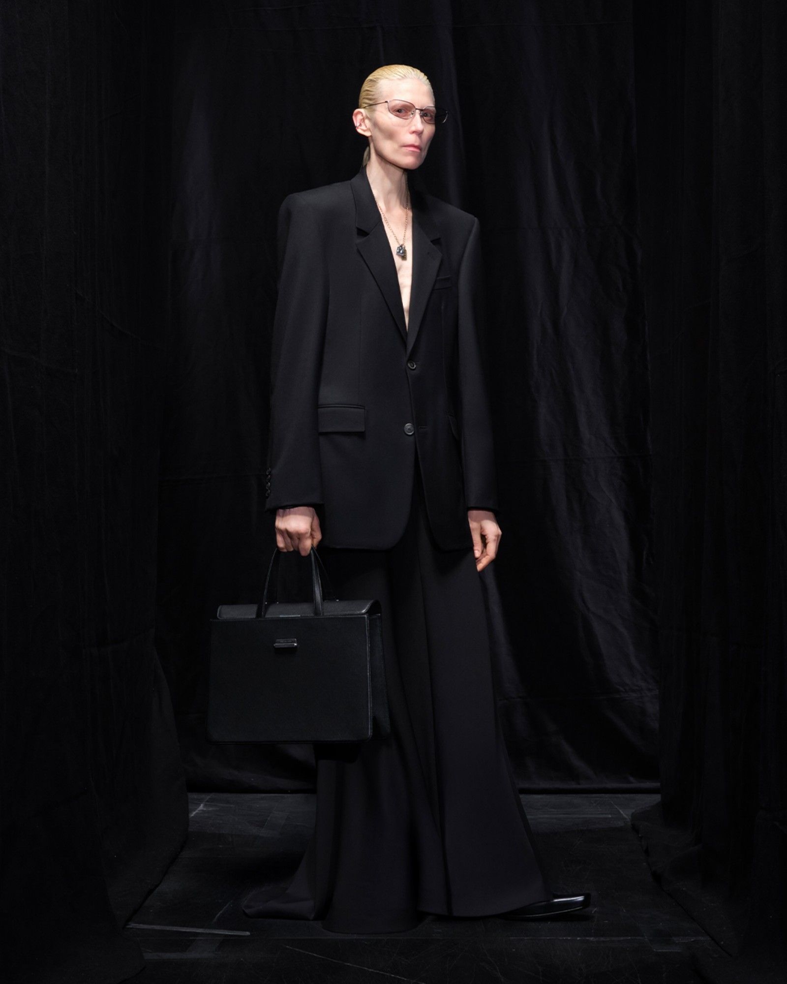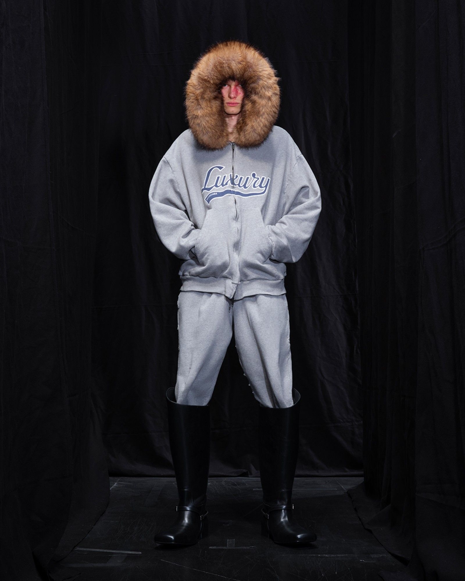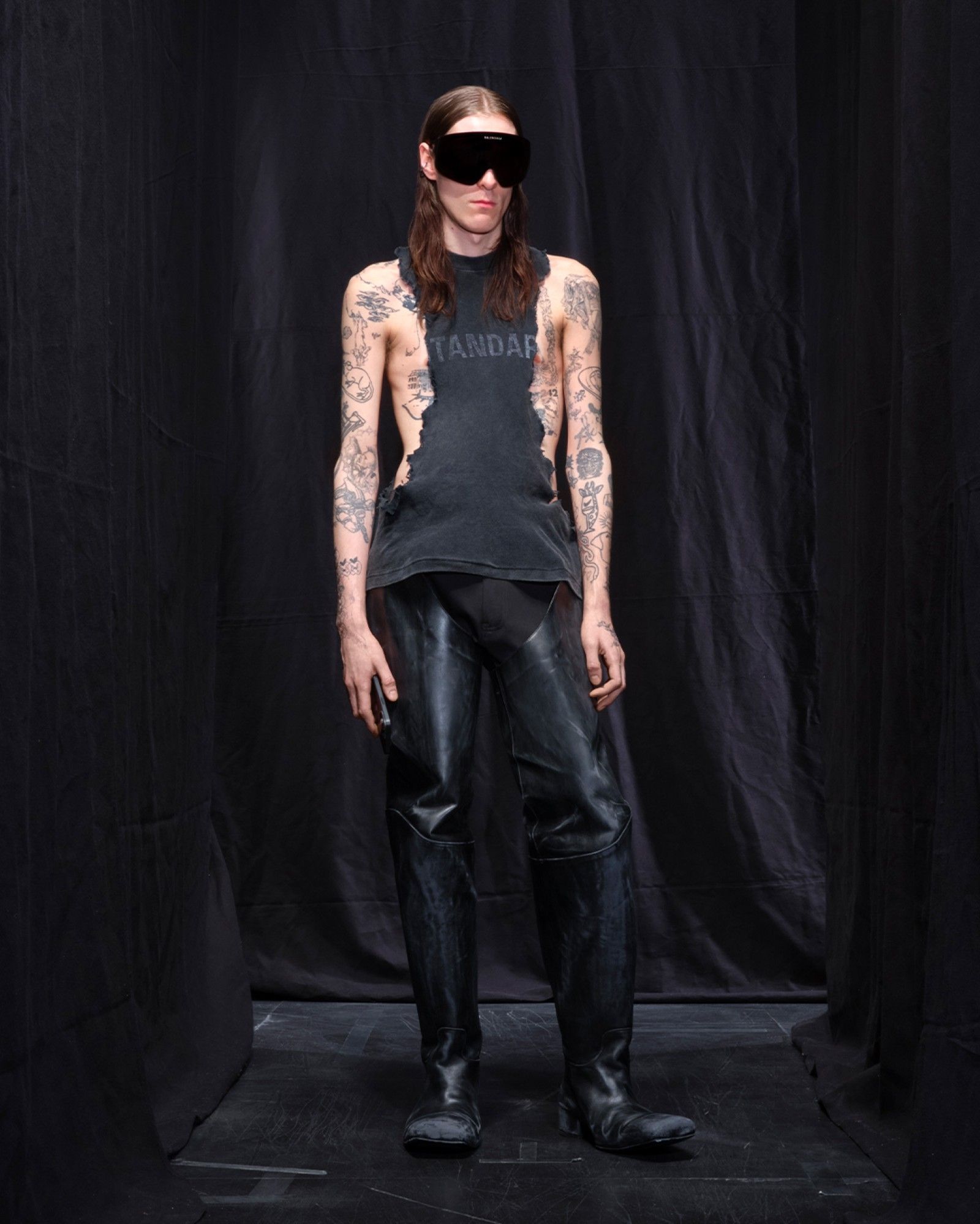 Le implicazioni estreme di quella che è parsa una sorta di indagine o esplorazione non ha solo scandagliato il mondo dell’anonimo business casual che fa parte dell’universo di Demna ma ha anche fotografato, portandolo in passerella, uno degli outfit più politicamente controversi e “carichi” dell’Europa contemporanea: la divisa dei maranza – che sarebbero, forse generalizzando, l’equivalente italiano dei “roadmen” inglesi e dei “caillera” francesi. Secondo le show notes questo oufit (che fa parte della collaborazione del brand con Puma) rappresenta «la moderna incarnazione dello streetwear» e in parte è, considerato anche come la divisa dei maranza, con le sue tute aderenti e persino il piumino smanicato, è diventata nel tempo un sinonimo di pericolo sociale (oggi come oggi a Milano, chi vede un gruppo di giovani vestito così nasconde i propri preziosi e affretta il passo) ma anche dell’esclusione e del pregiudizio che la società ha verso i giovani delle periferie e i cittadini di seconda generazione. Proprio questi outfit, pur non innovando un look già così consolidato, facevano riflettere su come, in fondo, i maranza/caillera di oggi non siano che una moderna versione dei punk anni ’80 – subcultura che oggi non percepiamo come pericolosa perché assimilata nel mondo mainstream ma che quarant’anni fa rappresentava per i buoni borghesi precisamente ciò che le moderne baby gang rappresentano oggi. In tal senso, gli show di Demna continuano a offrire materiale di riflessione su cosa sia la moda oggi oltre a proseguire nella perversa parodia del lusso e dei suoi significanti che ha reso Balenciaga il brand che è oggi.