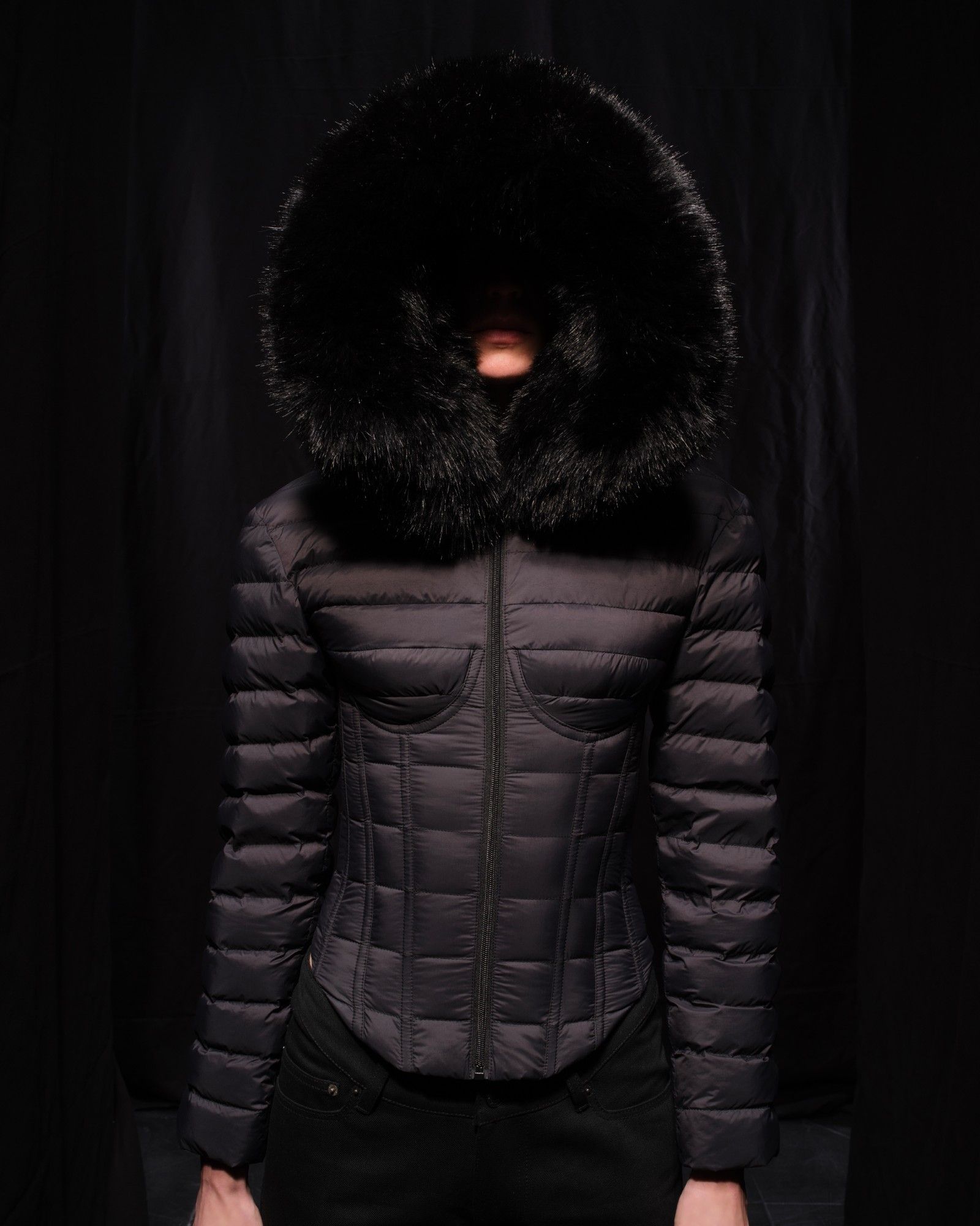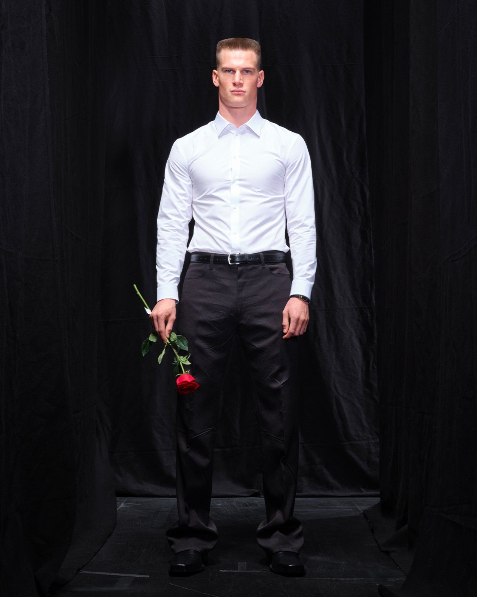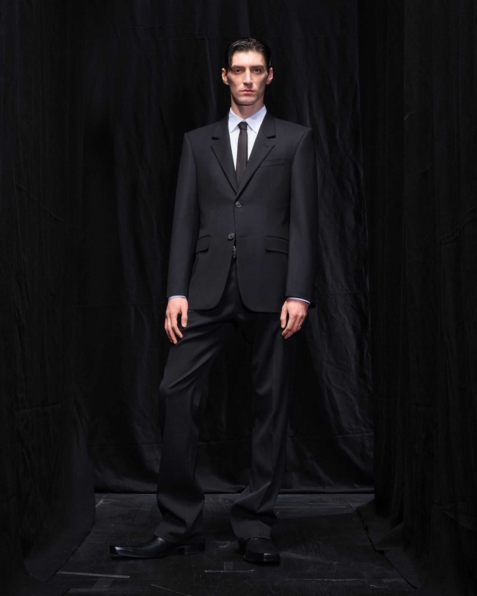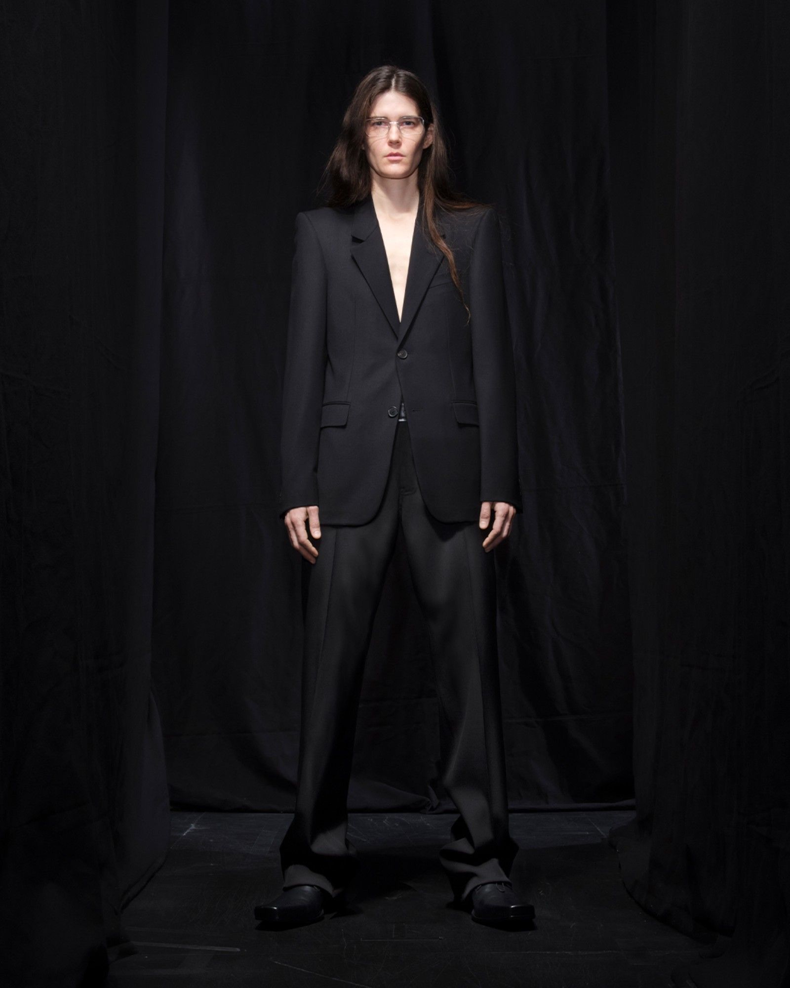 Concettualmente parlando, il più irriverente dei due è stato Balenciaga. Lo show di ieri ruotava intorno all’idea di “standard” e rappresentava forse una risposta di Demna al mondo del normcore, al guardaroba standardizzato e infinitamente replicabile di Uniqlo ma anche al moderno concetto di standard del vestire quotidiano. Sì, c’erano completi da uomo “divorati” da immaginarie tarme e piumini con cappuccio impellicciato trasformati in corsetti – c’era persino una felpa zip-up con collo di pelliccia (un tipo di abito molto “da grande distribuzione” per usare un delicato eufemismo) con la parola “luxury” ricamata sopra e una hoodie trasformata in abito da sera che erano parecchio tipiche di Demna. In generale una sorta di riflesso del tipo di vestiario che un ragazzo di provincia nei primi 2000 avrebbe trovato nel centro commerciale locale. Ma, oltre al business casual, si trovavano divertenti trasposizioni moda dell’outfit tipico del culturista locale in una di quelle canotte che lasciano nudo l’intero fianco coprendo di base solo l’ombelico che però formavano una silhouette stranamente anarchica. Ma anche un abito-camicia chiuso da una mega-cintura nera che chiunque abbia vissuto attraverso l’era d’oro del business casual, sempre nei primi 2000, ricorderà e che sembrava una citazione al famoso outfit indossato da Kim Kardashian al party di US Weekly nel 2006, privato però del maglioncino grigio.