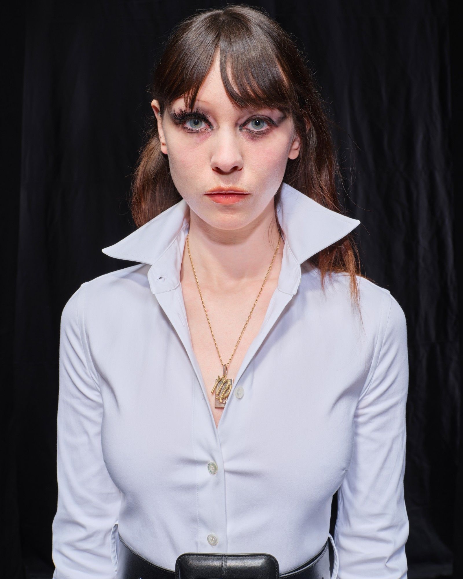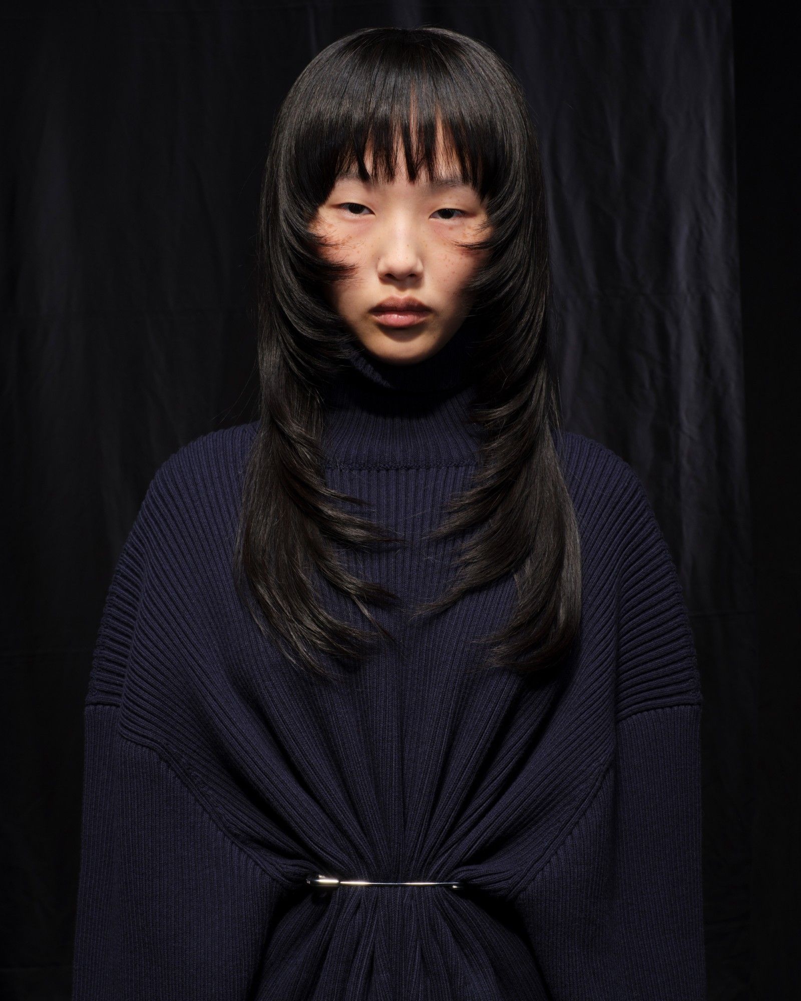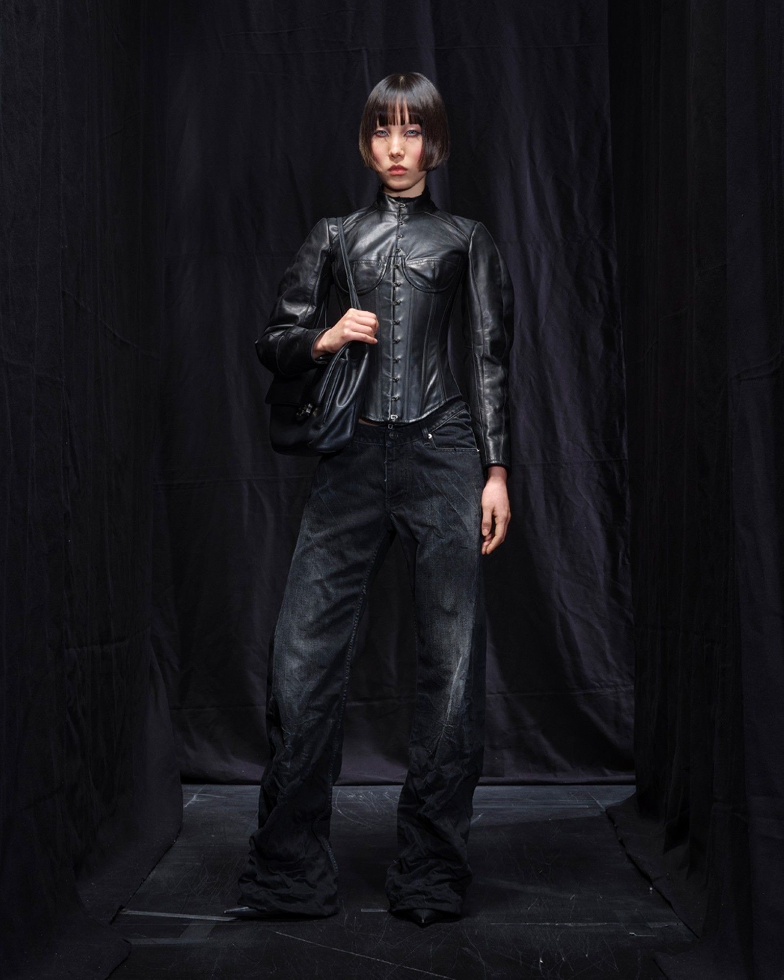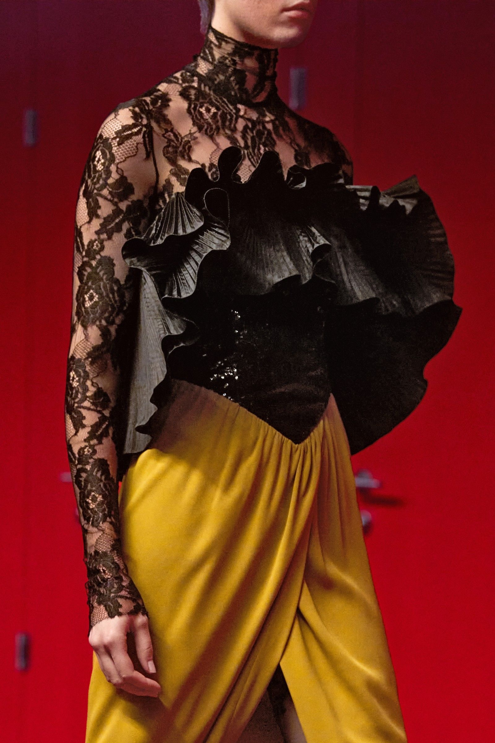 Concettualmente parlando, il più irriverente dei due è stato Balenciaga. Lo show di ieri ruotava intorno all’idea di “standard” e rappresentava forse una risposta di Demna al mondo del normcore, al guardaroba standardizzato e infinitamente replicabile di Uniqlo ma anche al moderno concetto di standard del vestire quotidiano. Sì, c’erano completi da uomo “divorati” da immaginarie tarme e piumini con cappuccio impellicciato trasformati in corsetti – c’era persino una felpa zip-up con collo di pelliccia (un tipo di abito molto “da grande distribuzione” per usare un delicato eufemismo) con la parola “luxury” ricamata sopra e una hoodie trasformata in abito da sera che erano parecchio tipiche di Demna. In generale una sorta di riflesso del tipo di vestiario che un ragazzo di provincia nei primi 2000 avrebbe trovato nel centro commerciale locale. Ma, oltre al business casual, si trovavano divertenti trasposizioni moda dell’outfit tipico del culturista locale in una di quelle canotte che lasciano nudo l’intero fianco coprendo di base solo l’ombelico che però formavano una silhouette stranamente anarchica. Ma anche un abito-camicia chiuso da una mega-cintura nera che chiunque abbia vissuto attraverso l’era d’oro del business casual, sempre nei primi 2000, ricorderà e che sembrava una citazione al famoso outfit indossato da Kim Kardashian al party di US Weekly nel 2006, privato però del maglioncino grigio.